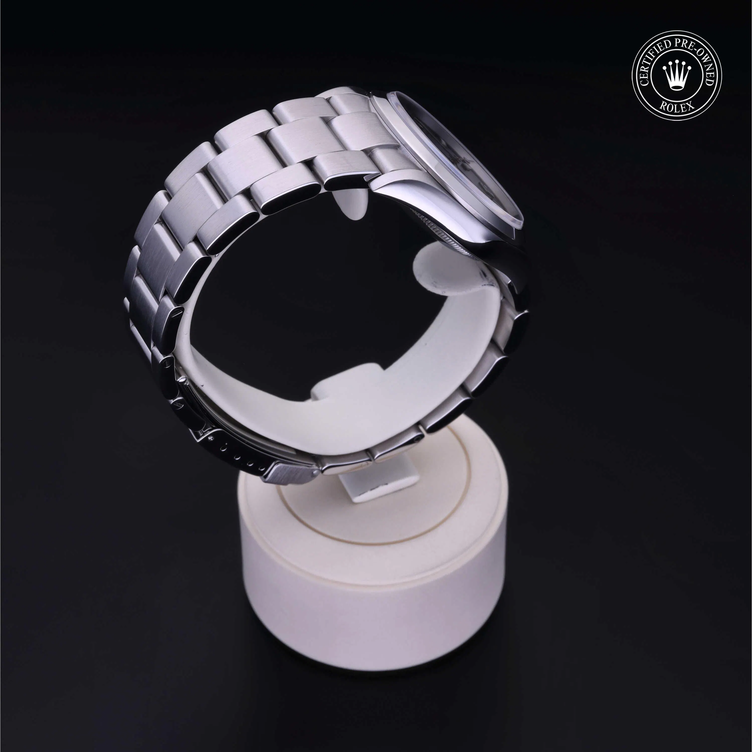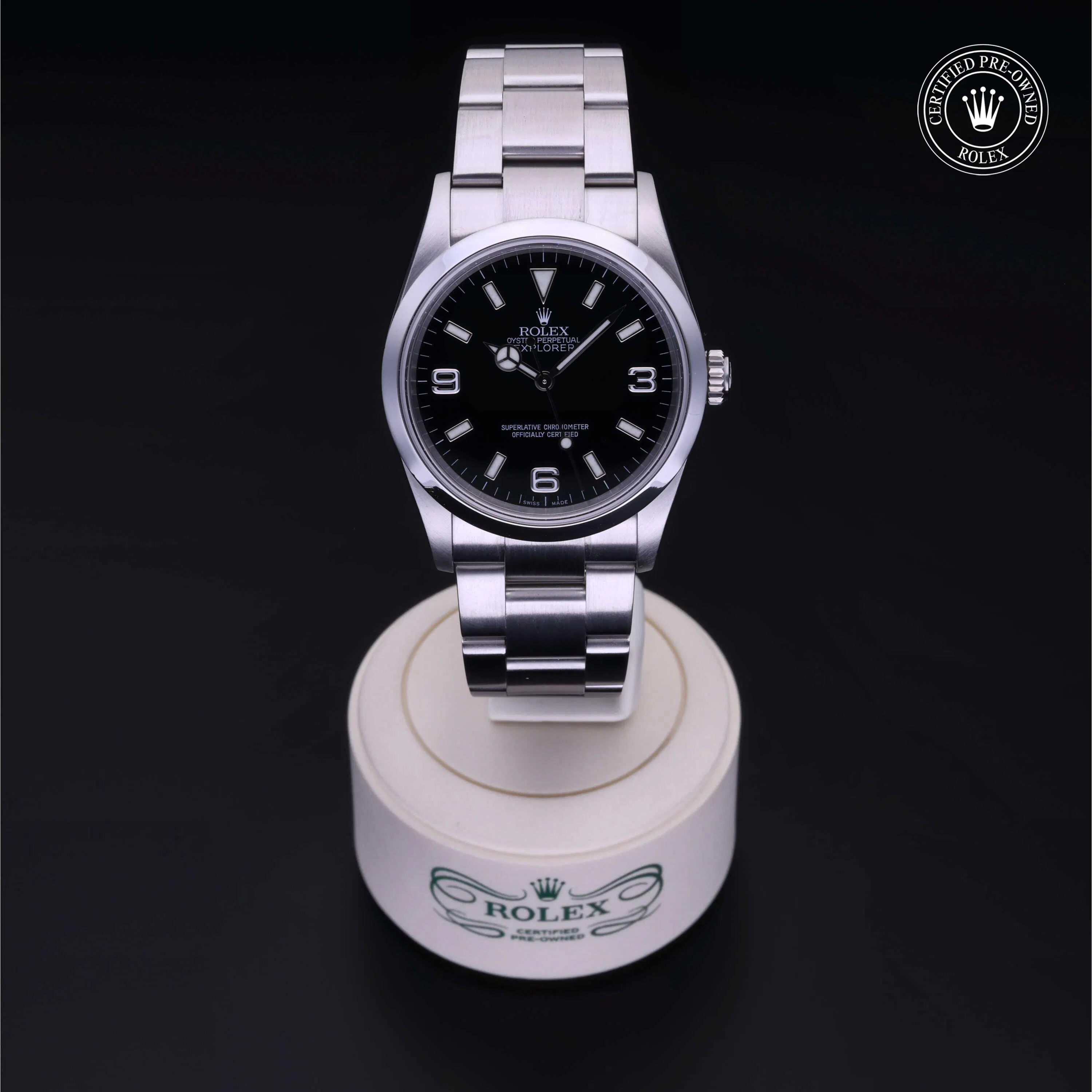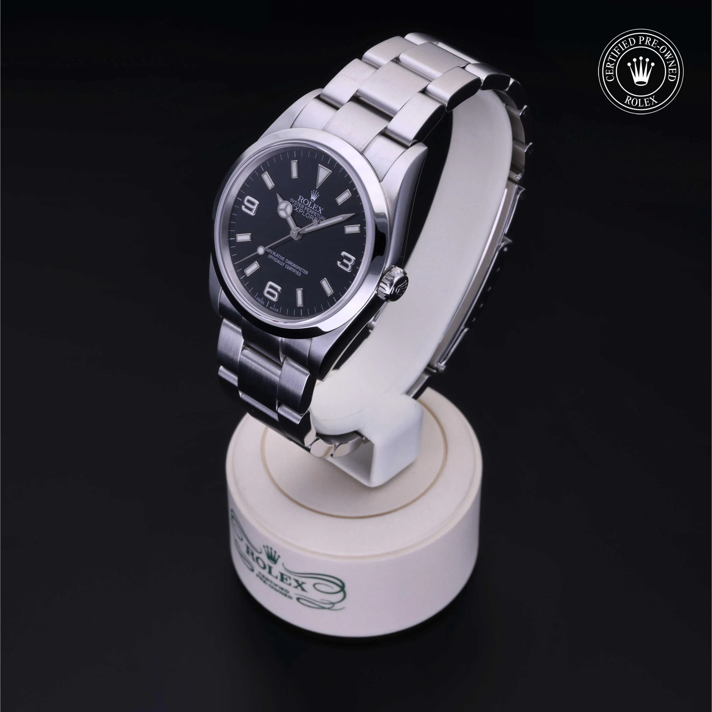 Rolex Certified Pre-Owned Explorer (114270) self - winding automatic watch, features a 36mm stainless steel case and smooth bezel surrounding a black dial on a stainless steel oyster bracelet. Functions include hours, minutes and seconds. This watch has received Rolex-authorized service and certification. It does not come with the original box or papers, but includes a custom Rolex Certified Pre-Owned hang tag, travel pouch and RCPO international warranty card.