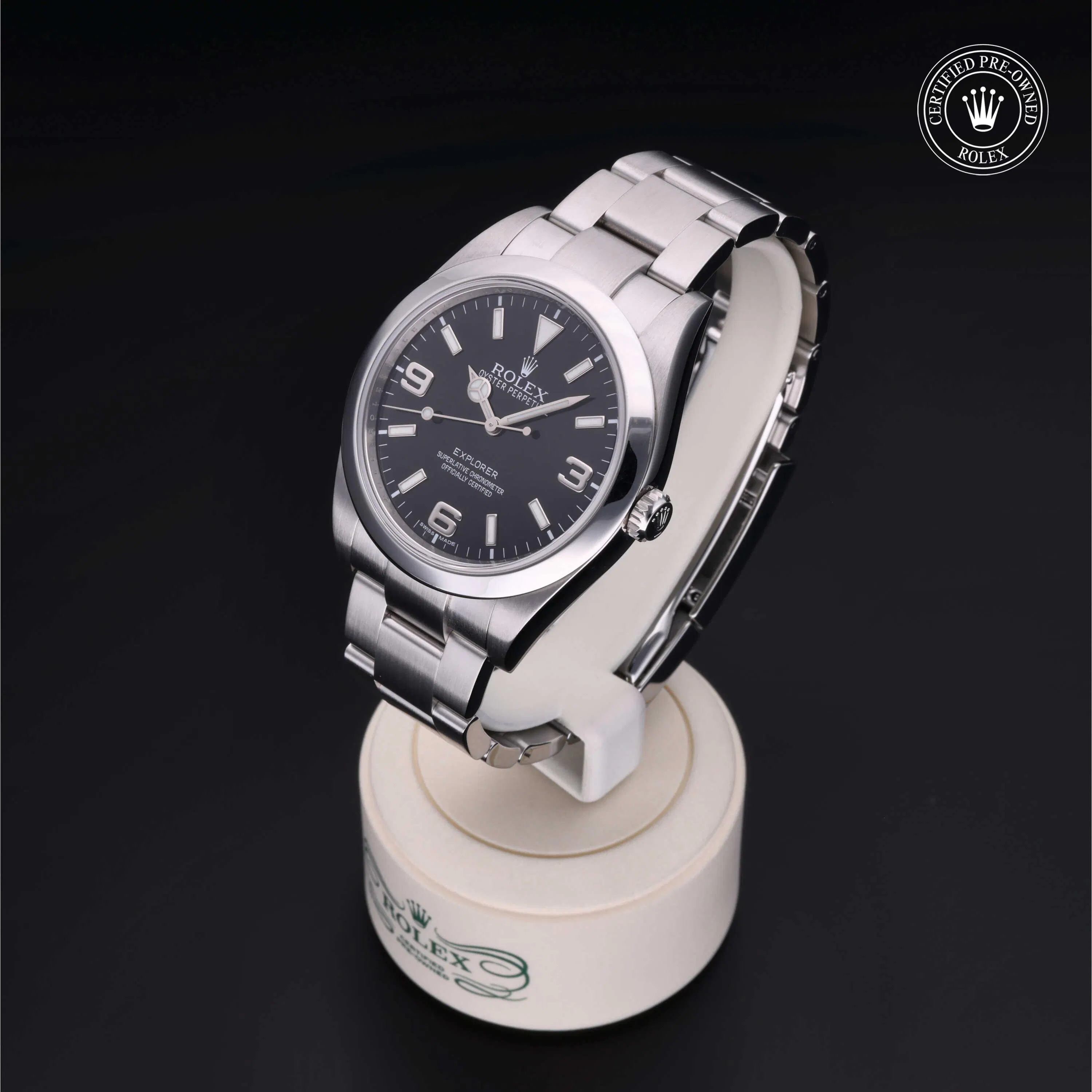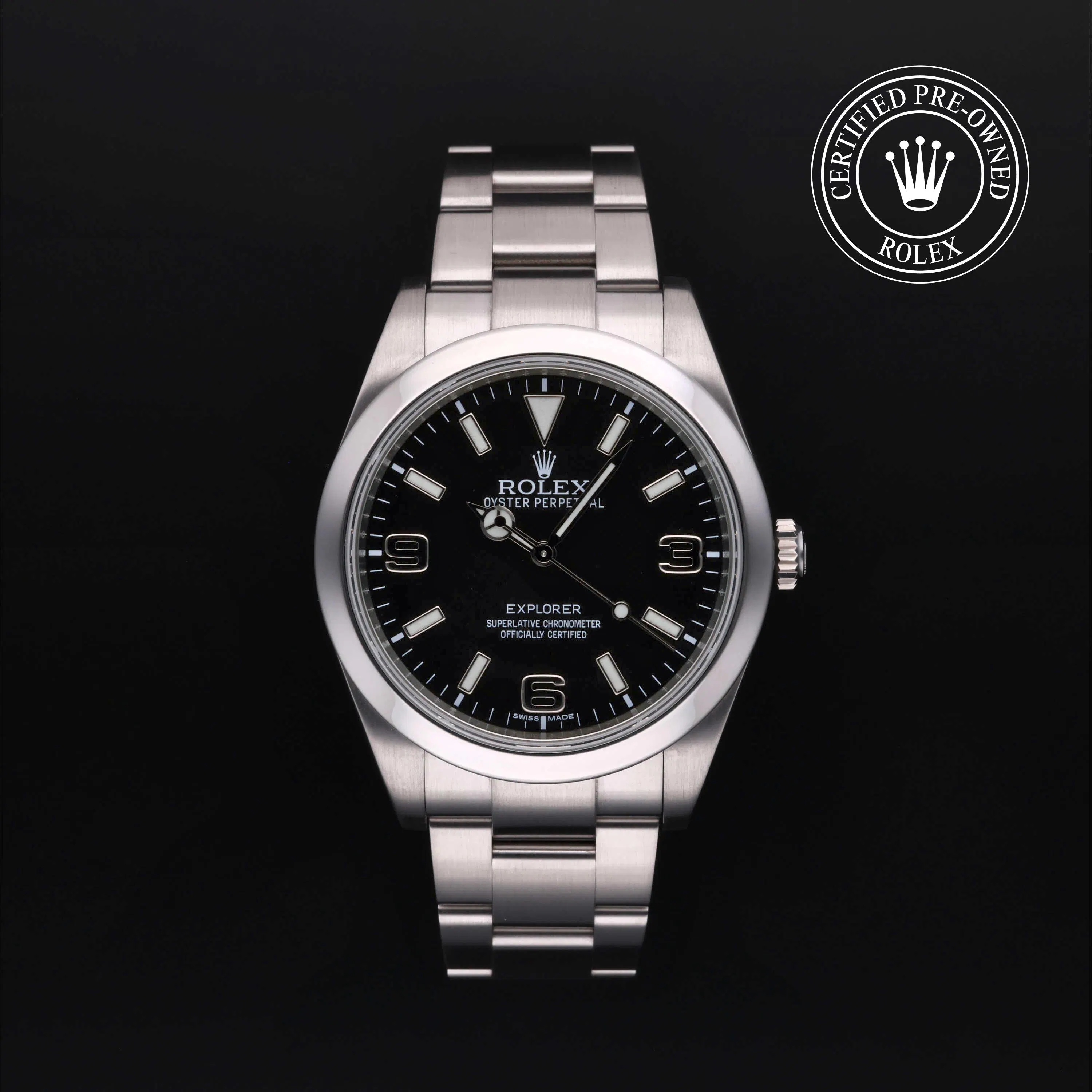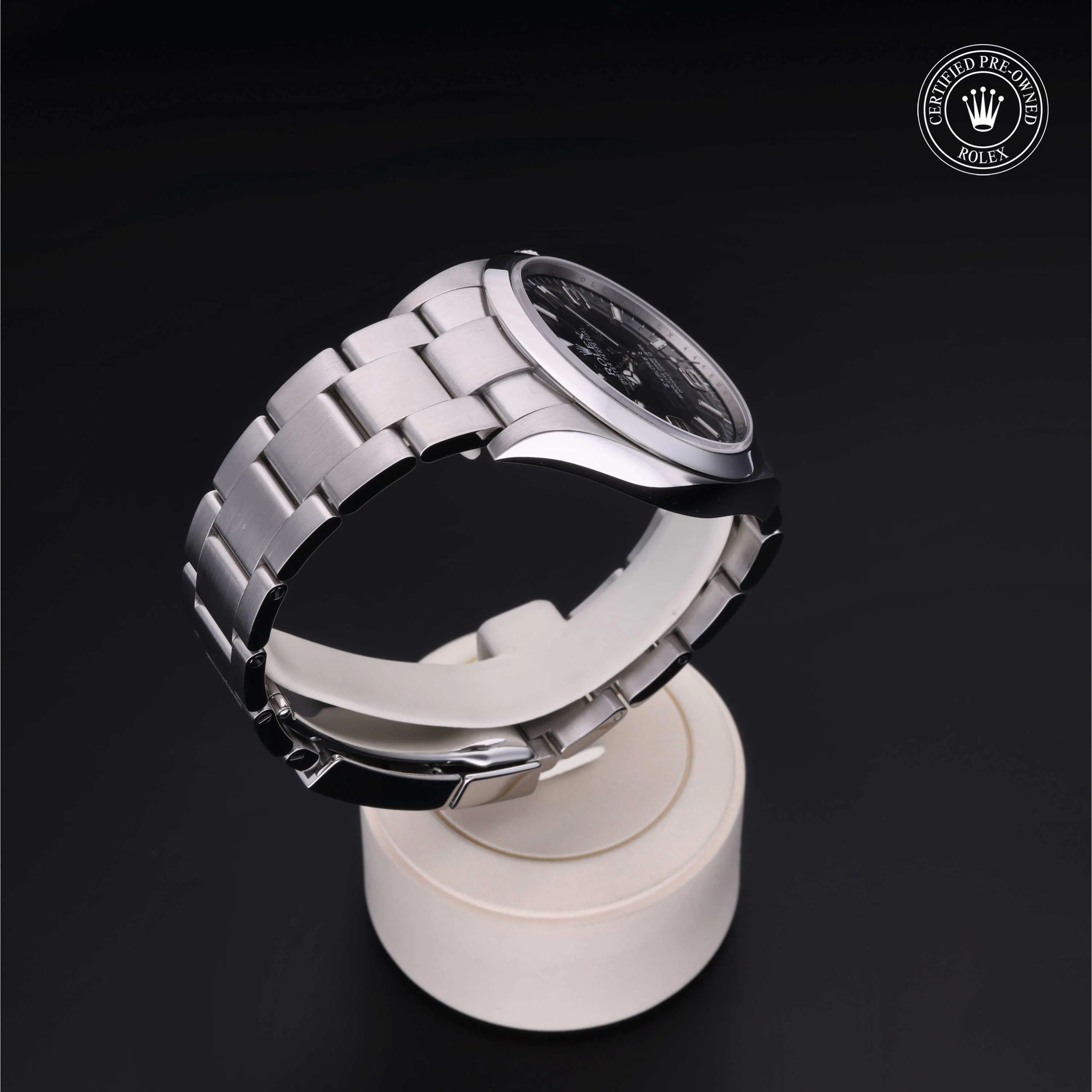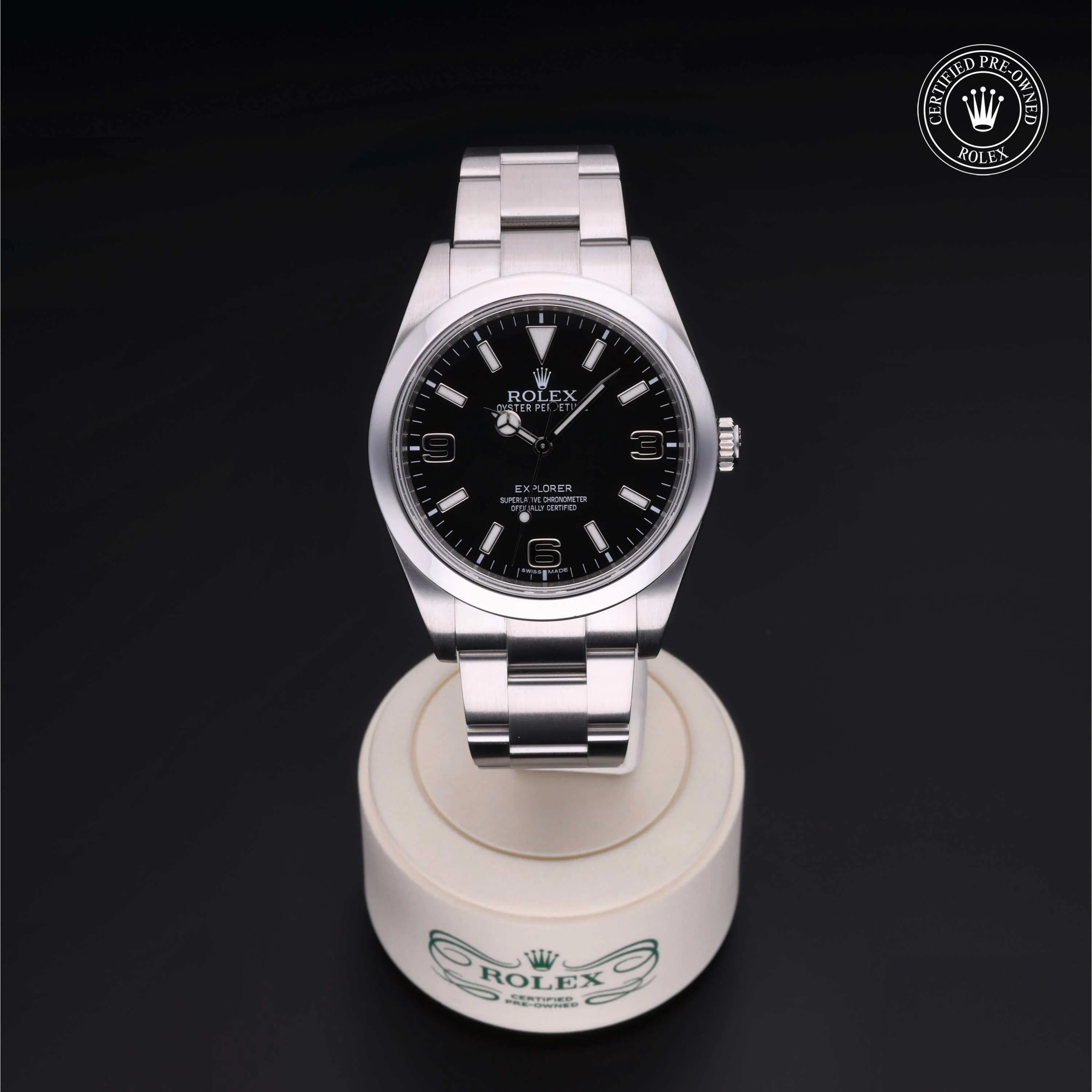 Rolex Certified Pre-Owned Explorer (214270) self - winding automatic watch, features a 39mm stainless steel case and smooth bezel surrounding a black dial. The watch is secured on a stainless steel Oyster bracelet complete with a folding buckle. Functions include hours, minutes and seconds. This watch has received Rolex-authorized service and certification. It does not come with the original box or papers, but includes a custom Rolex Certified Pre-Owned hang tag, travel pouch and RCPO international warranty card.
