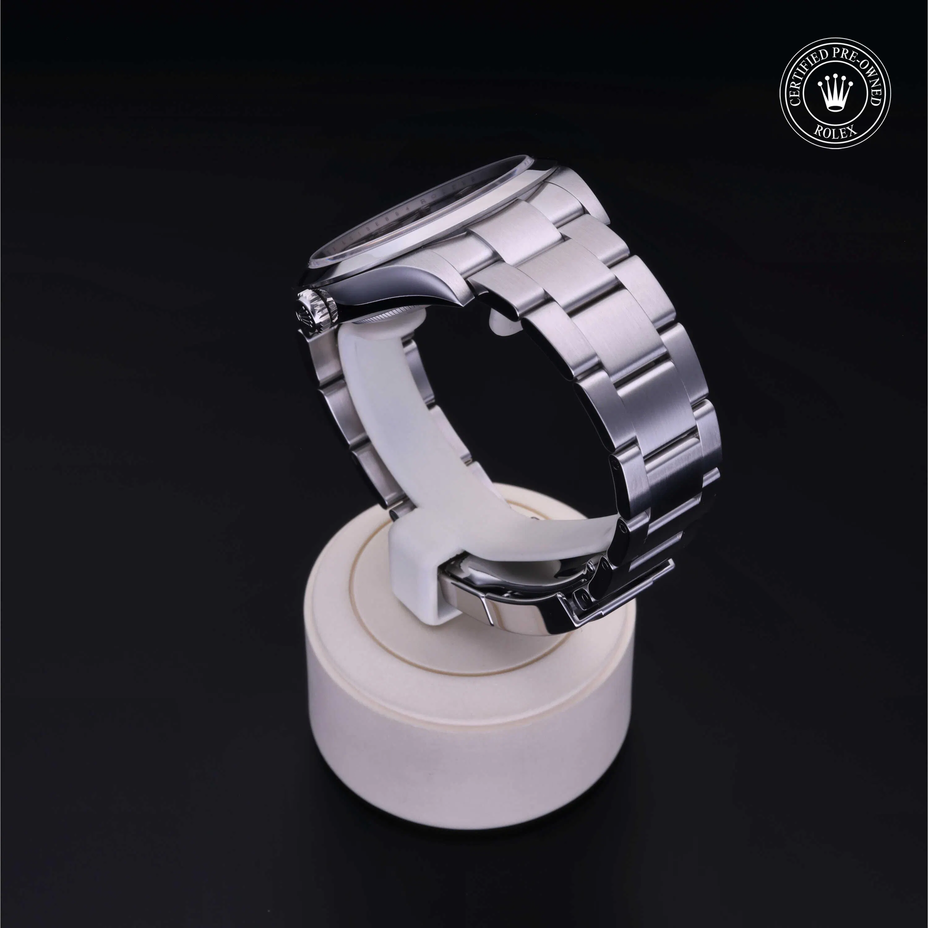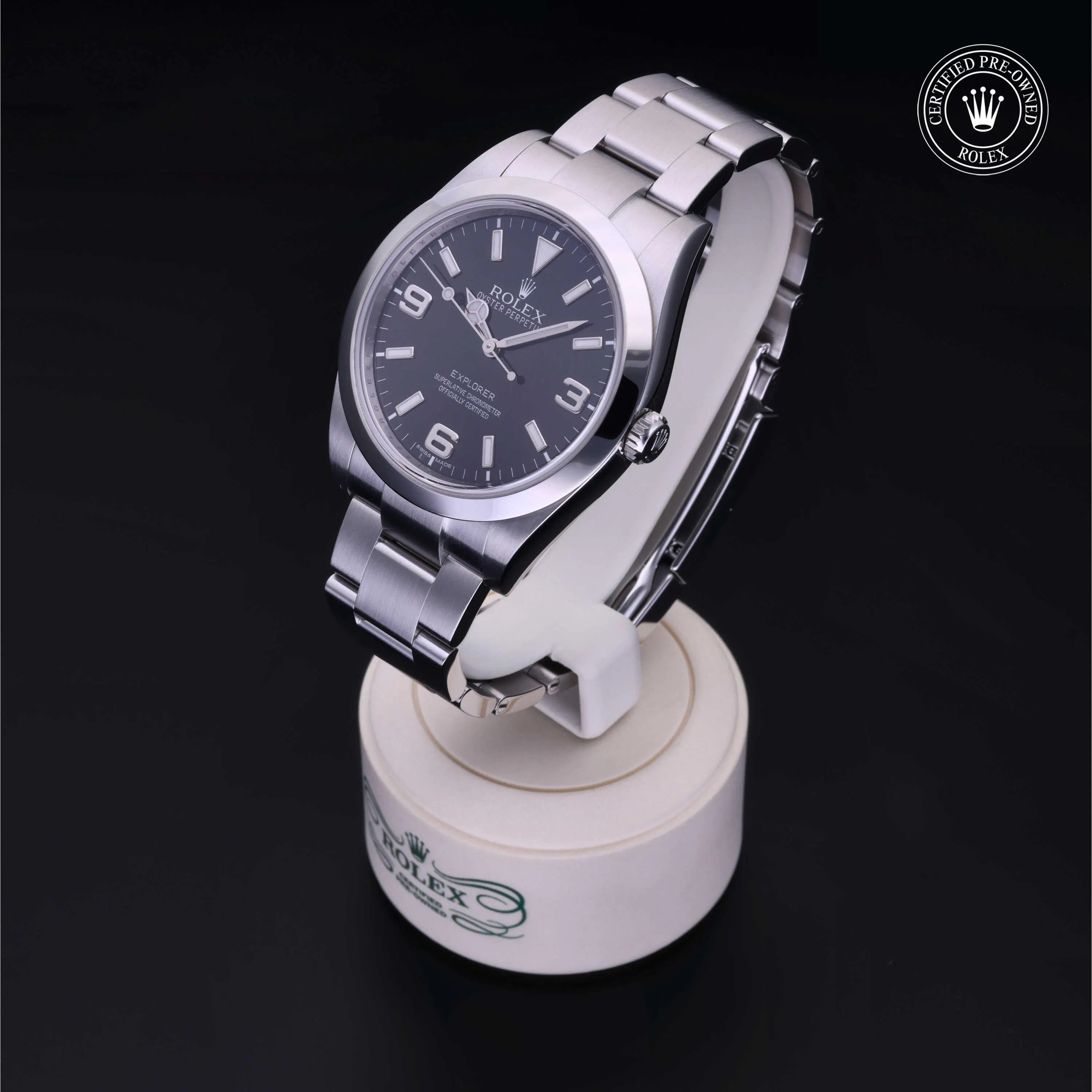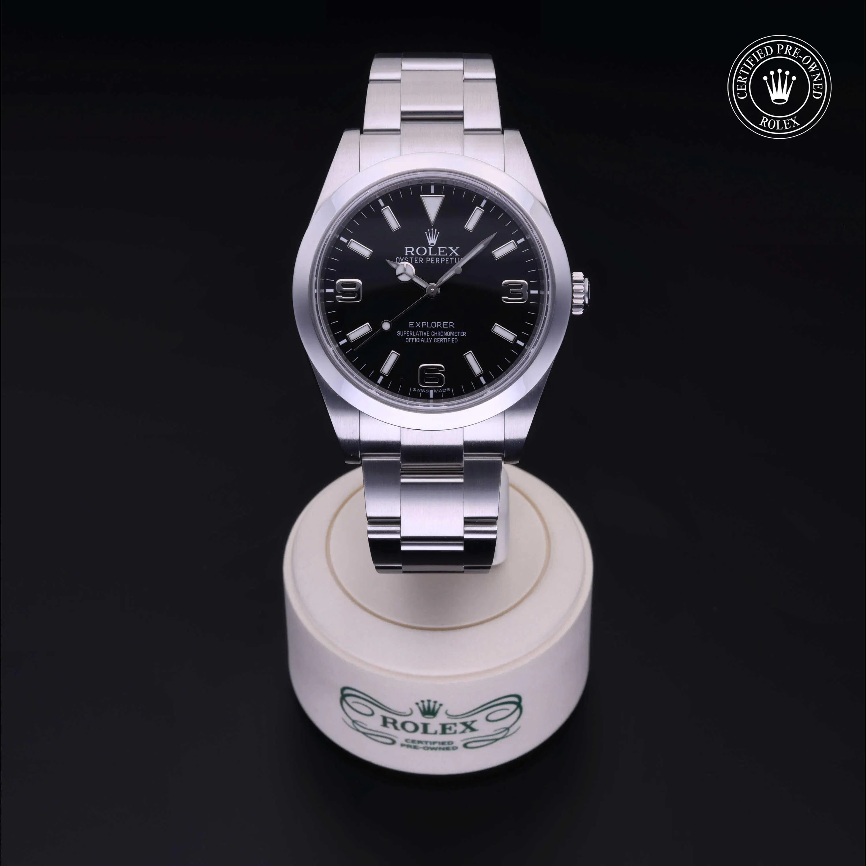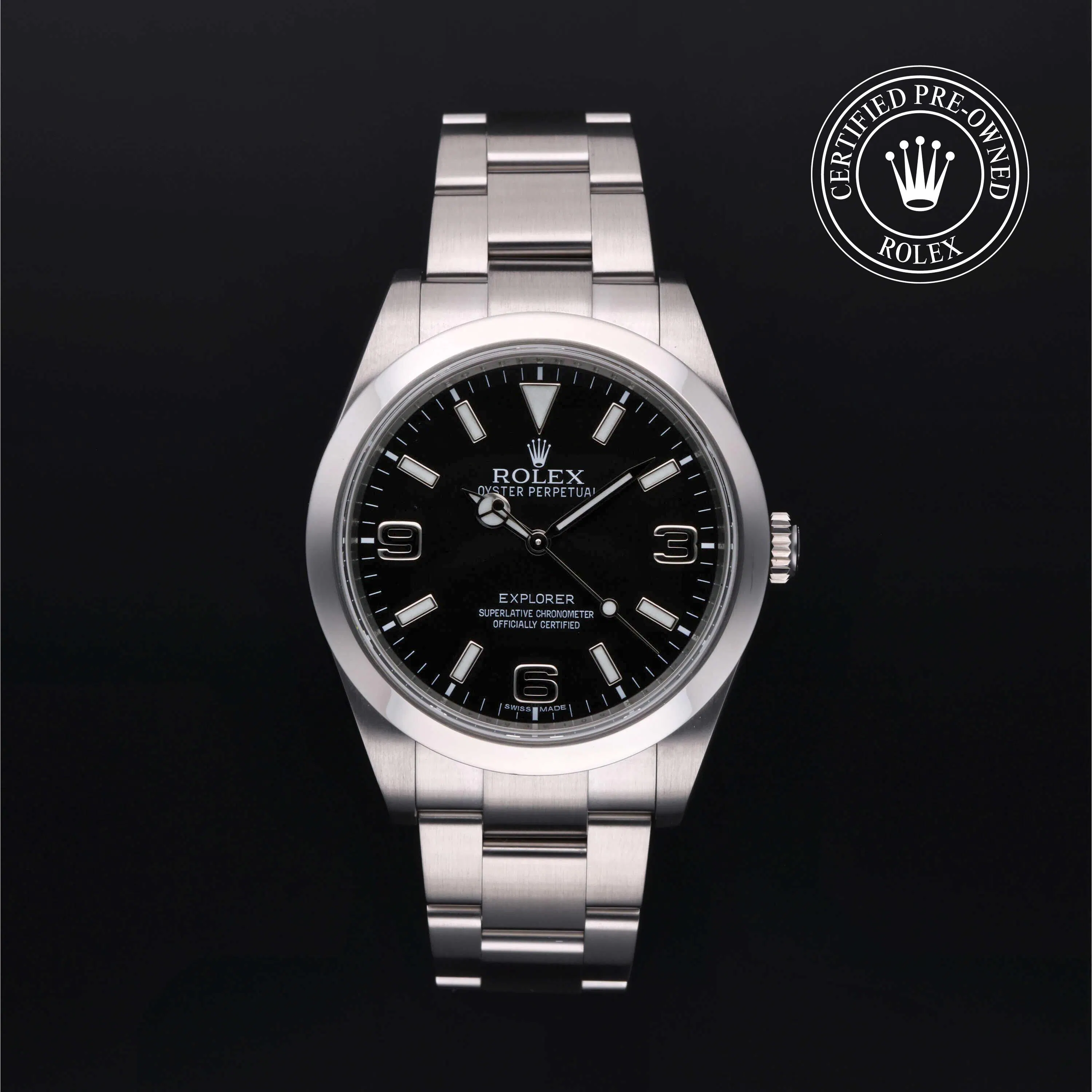 Rolex Pre-Owned Explorer (214270) self - winding automatic watch, features a 39mm stainless steel case and smooth bezel surrounding a black dial on a stainless steel oyster bracelet. Functions include hours, minutes and seconds. This watch has received Rolex-authorized service and certification. It does not come with the original box or papers, but includes a custom Rolex Certified Pre-Owned hang tag, travel pouch and RCPO international warranty card.