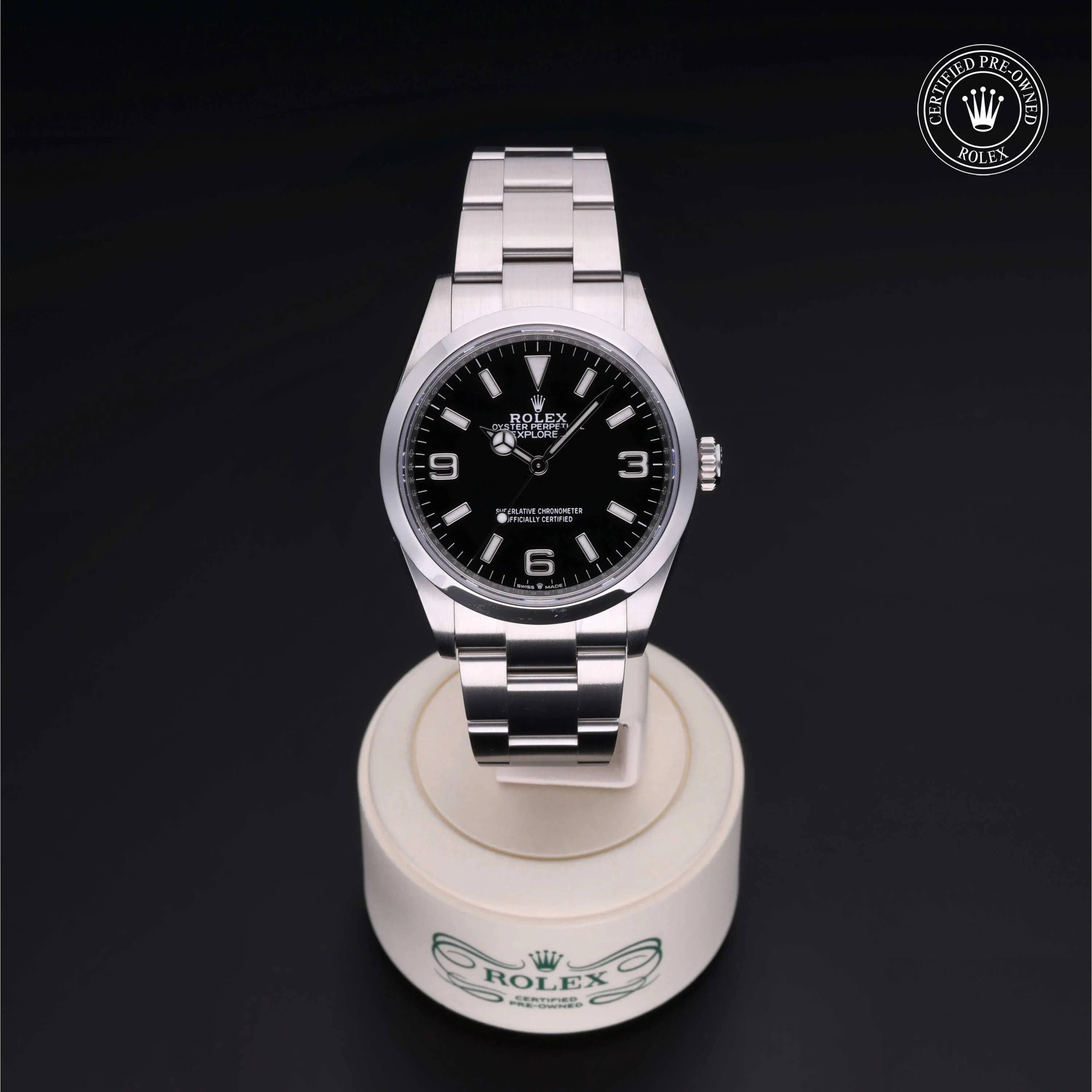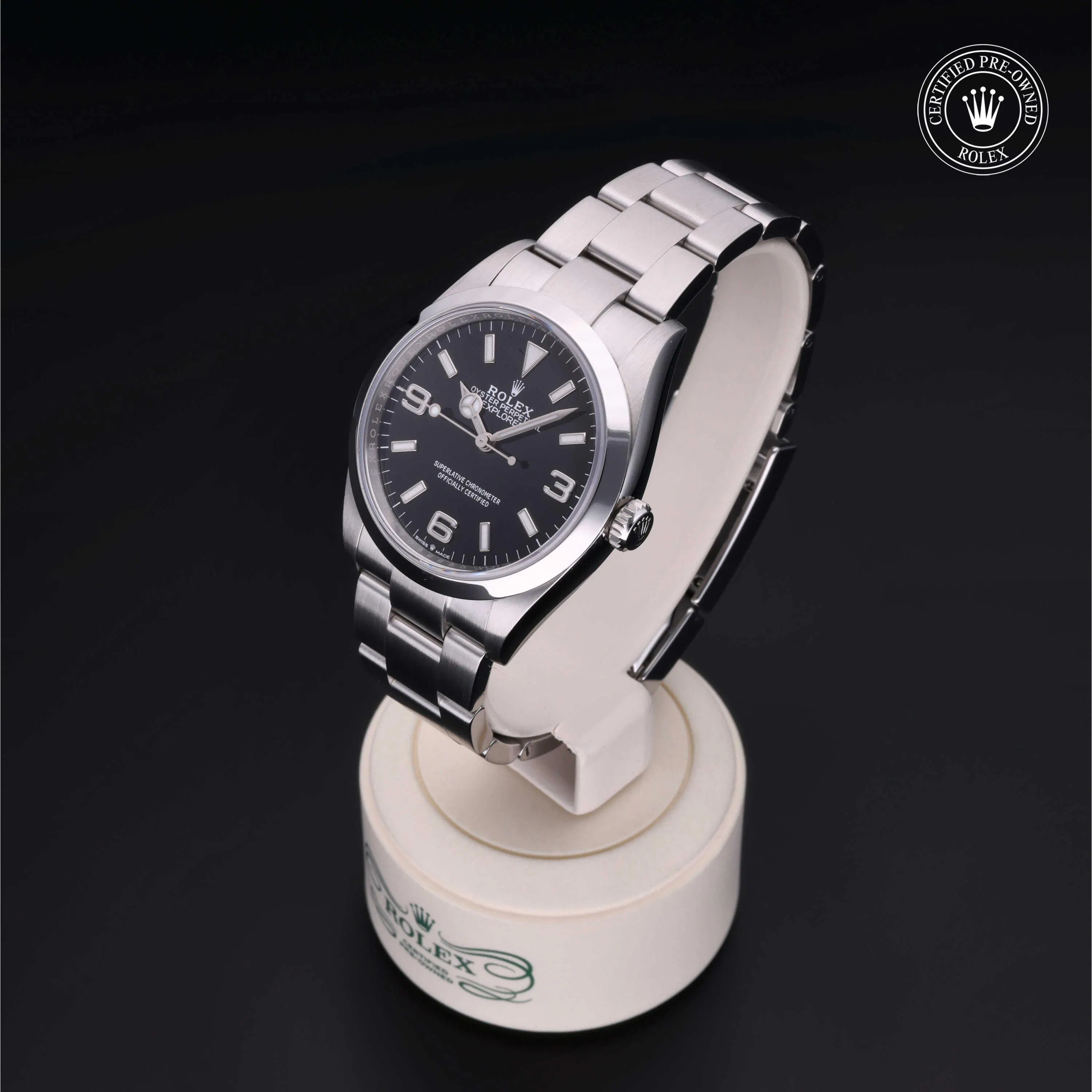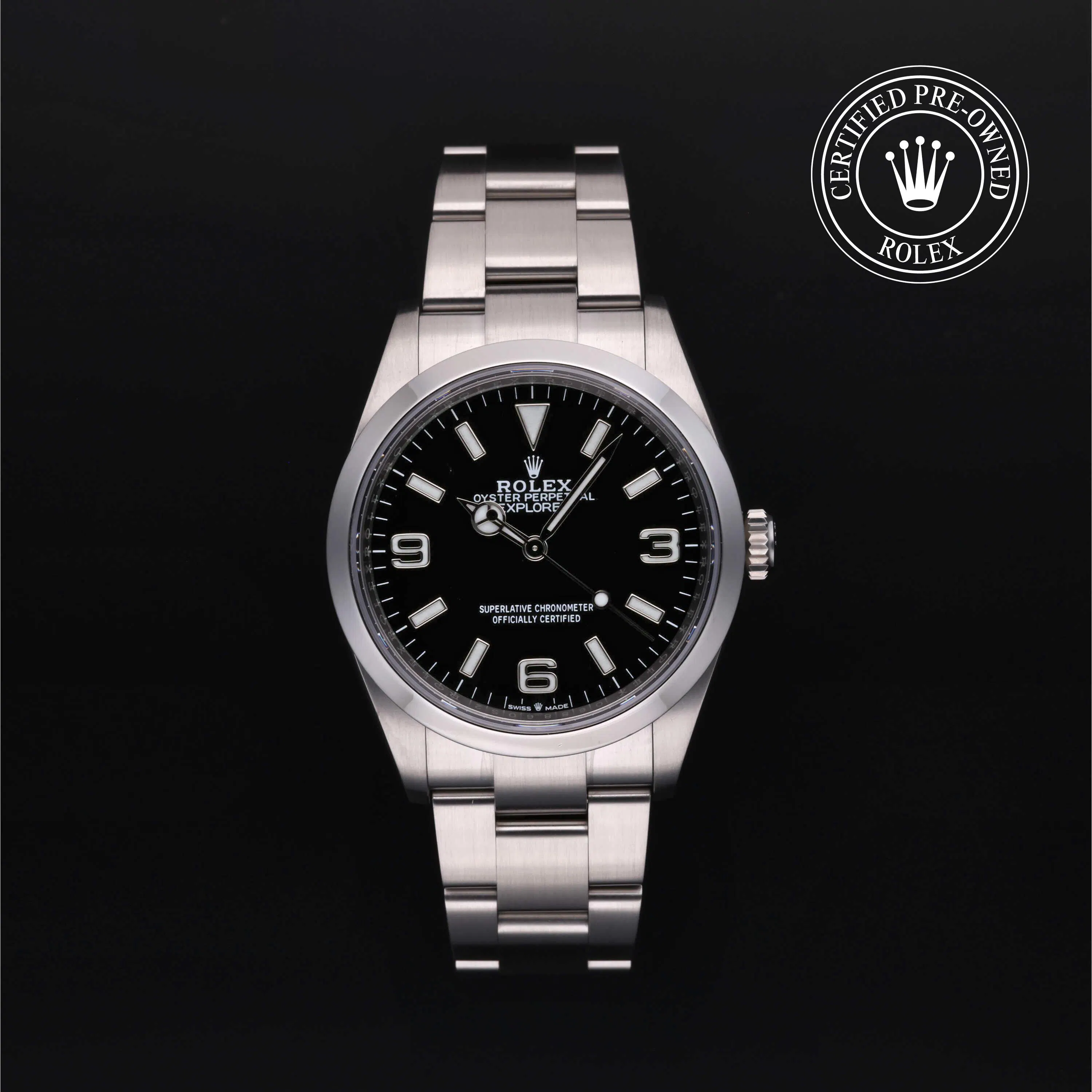 Rolex Certified Pre-Owned Explorer (124270) self - winding automatic watch, features a 36mm stainless steel case and smooth bezel surrounding a black dial on a stainless steel Oyster bracelet. Functions include hours, minutes and seconds. This watch has received Rolex-authorized service and certification. It comes with the original box and papers, and includes a custom Rolex Certified Pre-Owned hang tag, travel pouch and RCPO international warranty card.