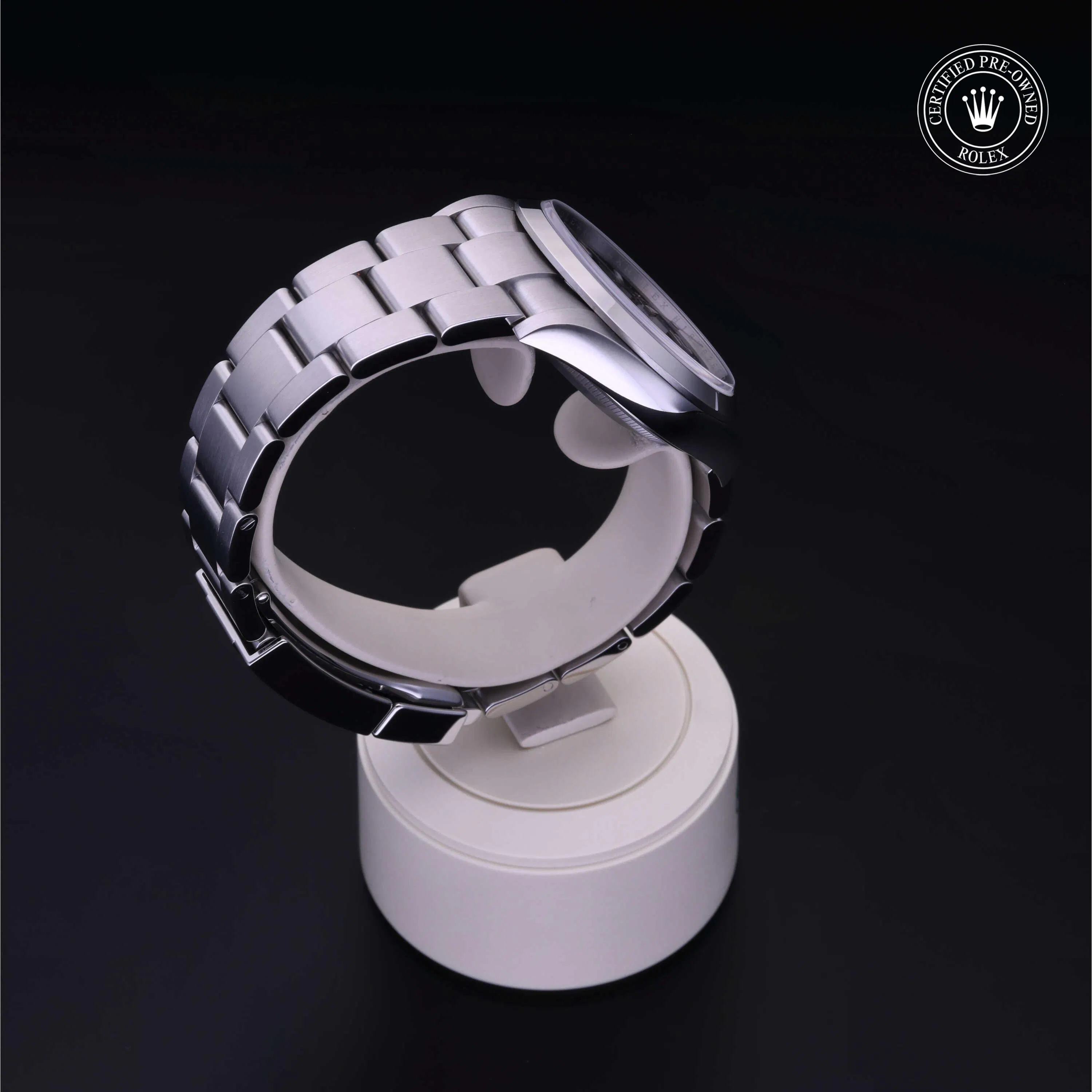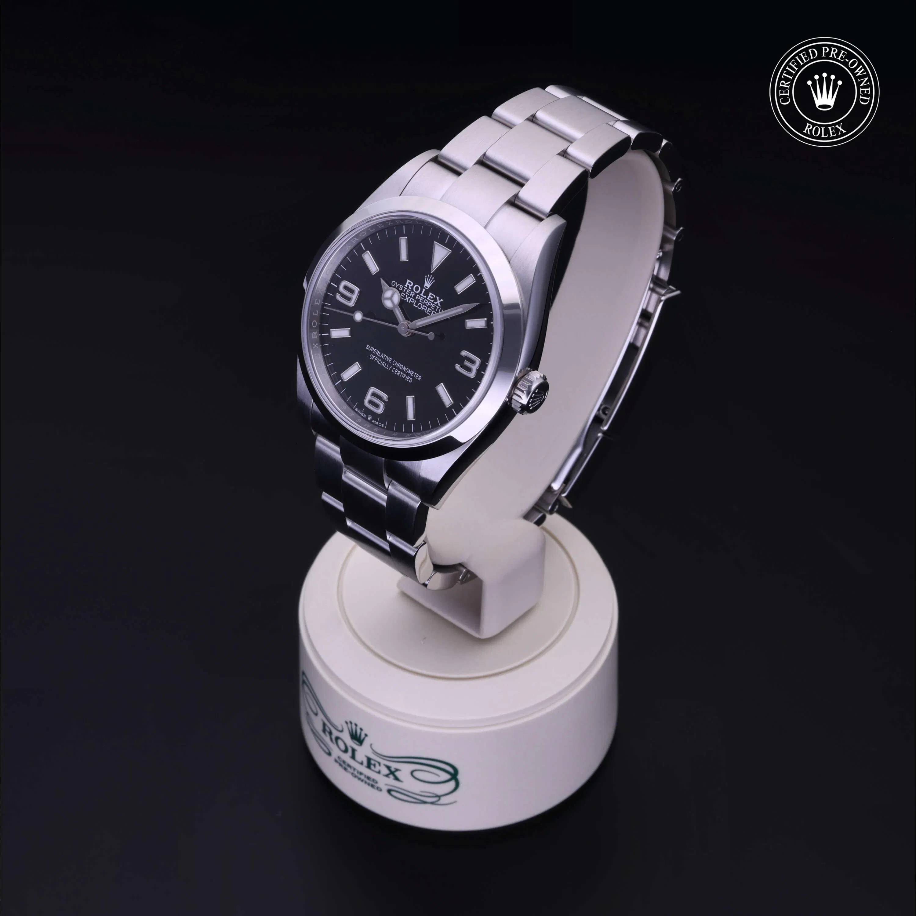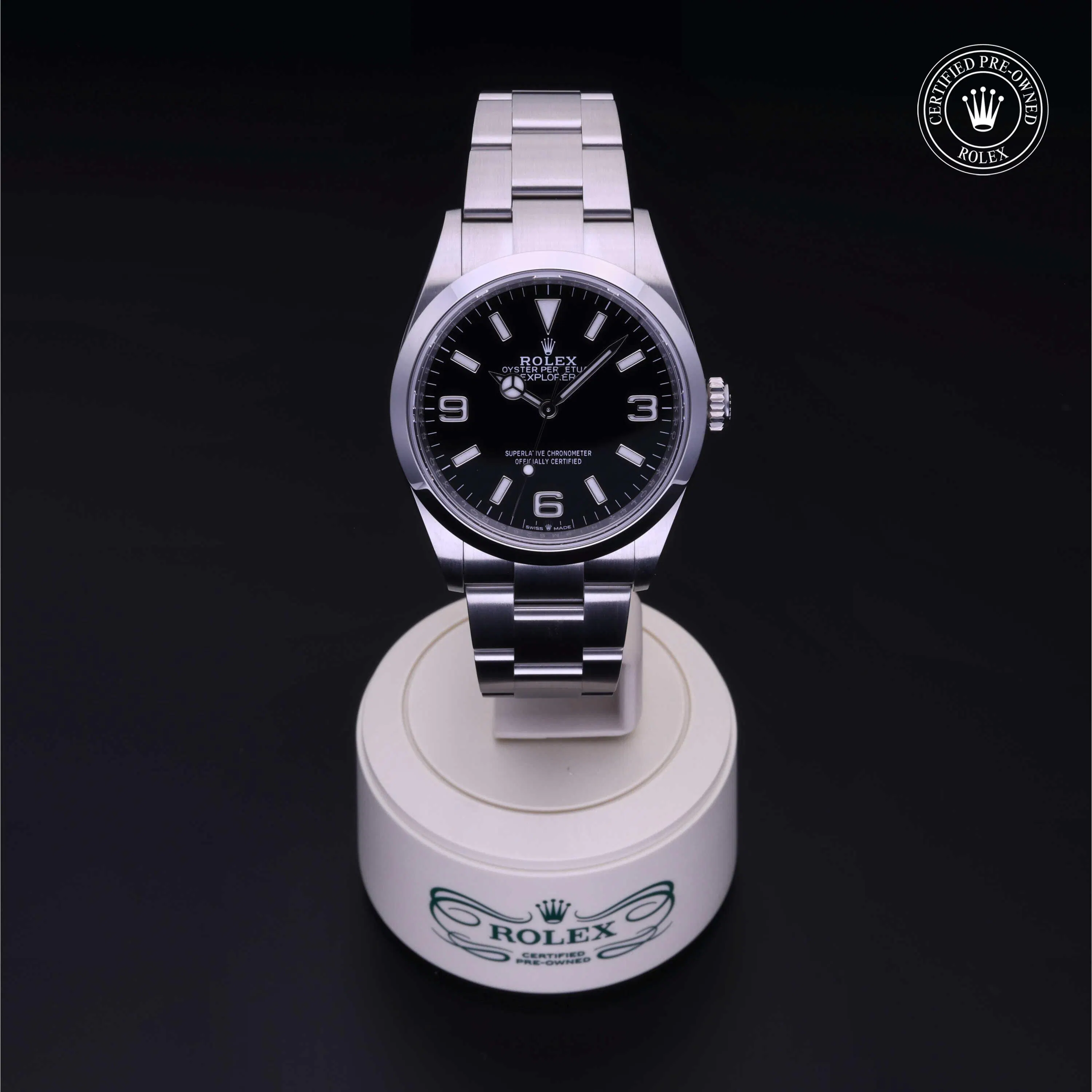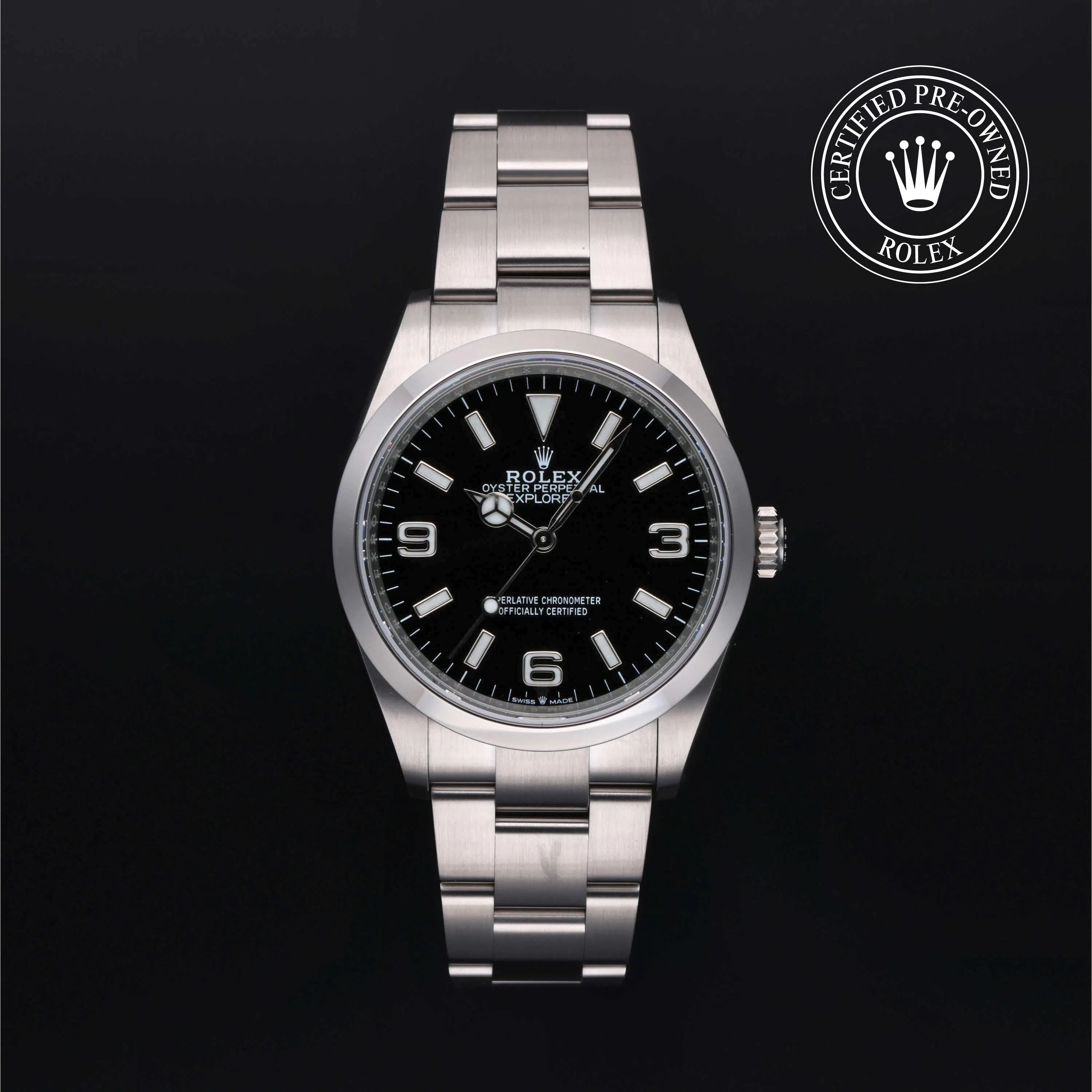 Rolex Certified Pre-Owned Explorer (124270) self - winding automatic watch, features a 36mm stainless steel case and smooth bezel surrounding a black dial on a stainless steel Oyster bracelet. Functions include hours, minutes and seconds. This watch has received Rolex-authorized service and certification. It comes with the original box and papers, and includes a custom Rolex Certified Pre-Owned hang tag, travel pouch and RCPO international warranty card.