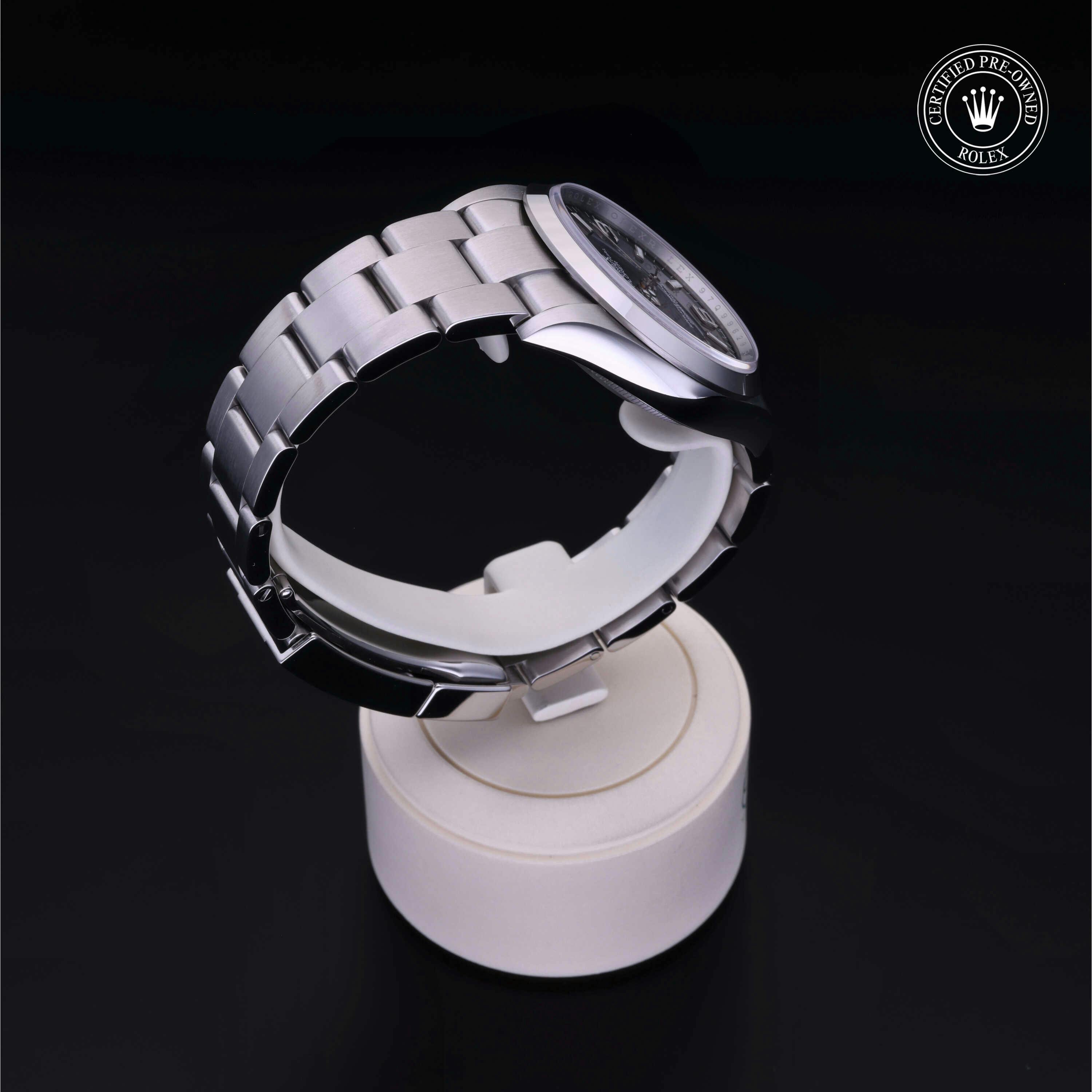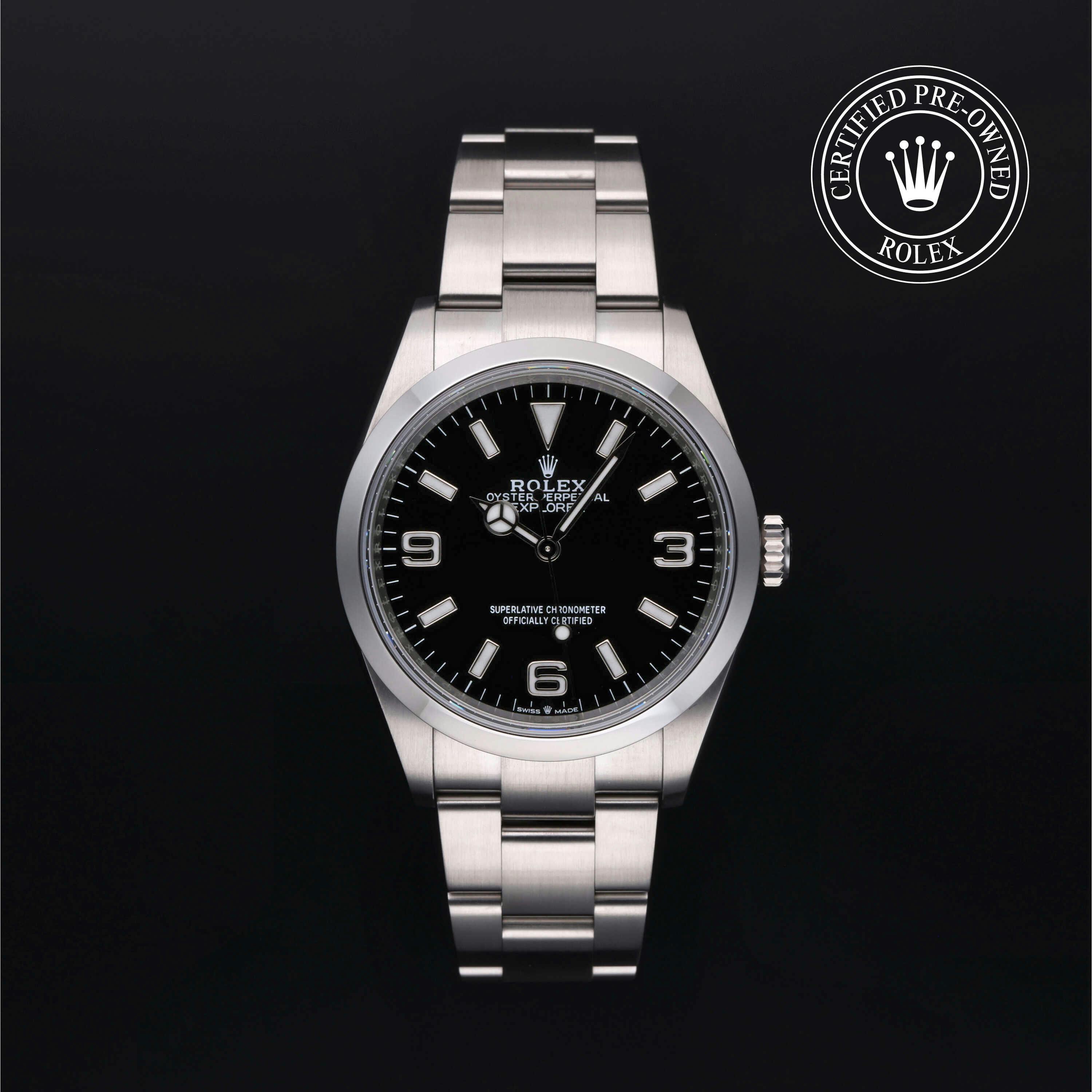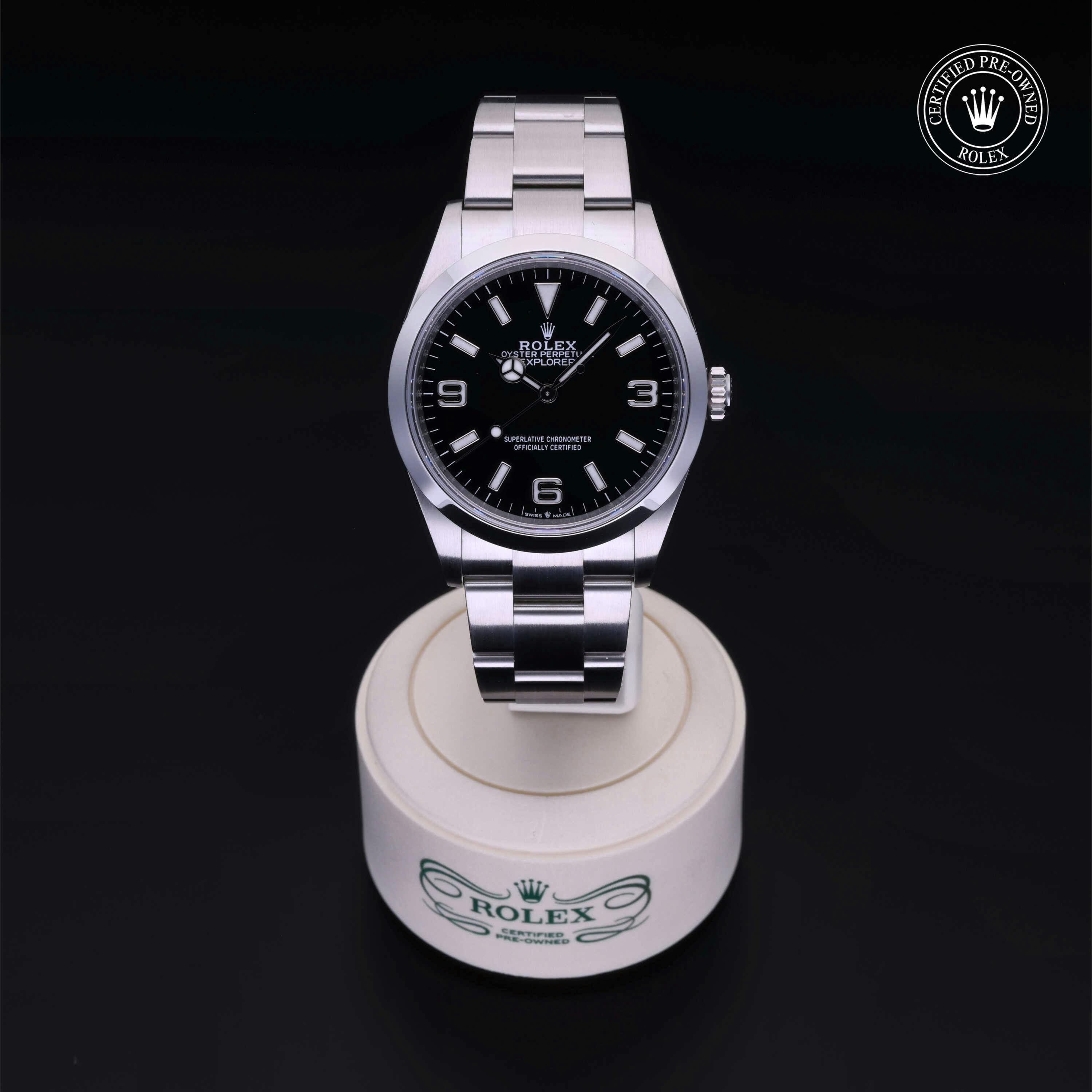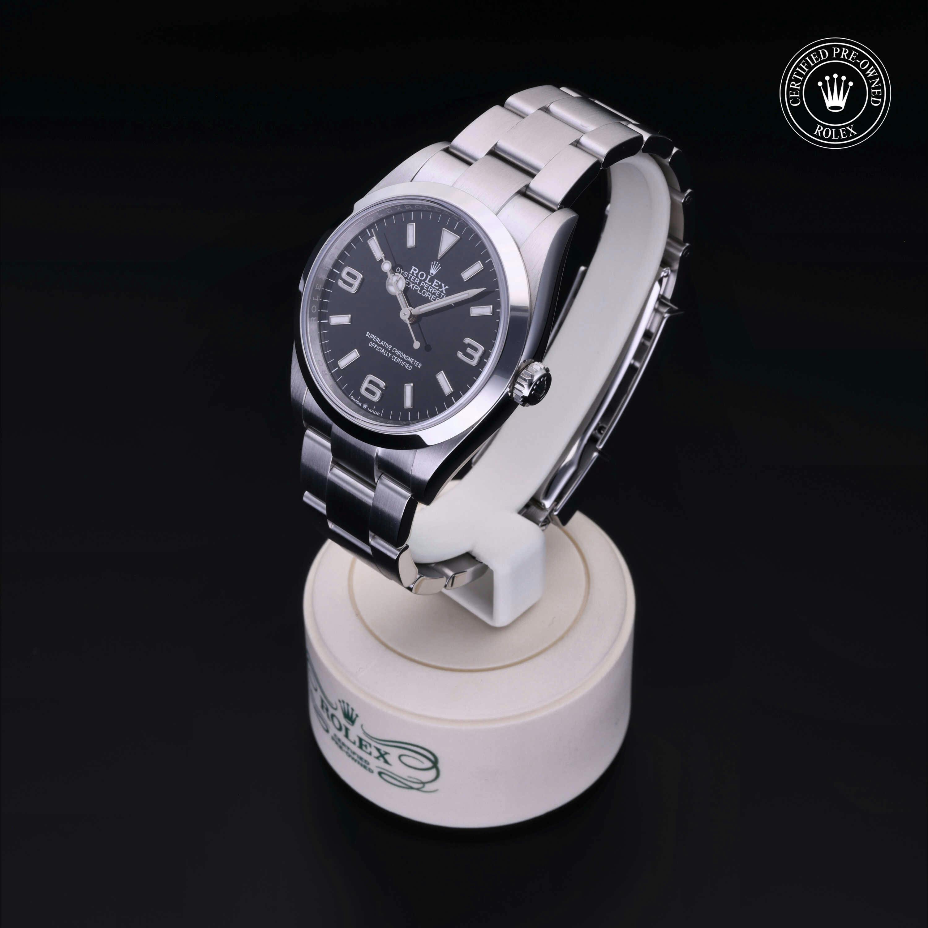 Rolex Certified Pre-Owned Explorer (124270) self - winding automatic watch, features a 36mm stainless steel case and smooth bezel surrounding a black dial on a stainless steel oyster bracelet. Functions include hours, minutes and seconds. This watch has received Rolex-authorized service and certification. It comes with the original box and papers, and includes a custom Rolex Certified Pre-Owned hang tag, travel pouch and RCPO international warranty card.
