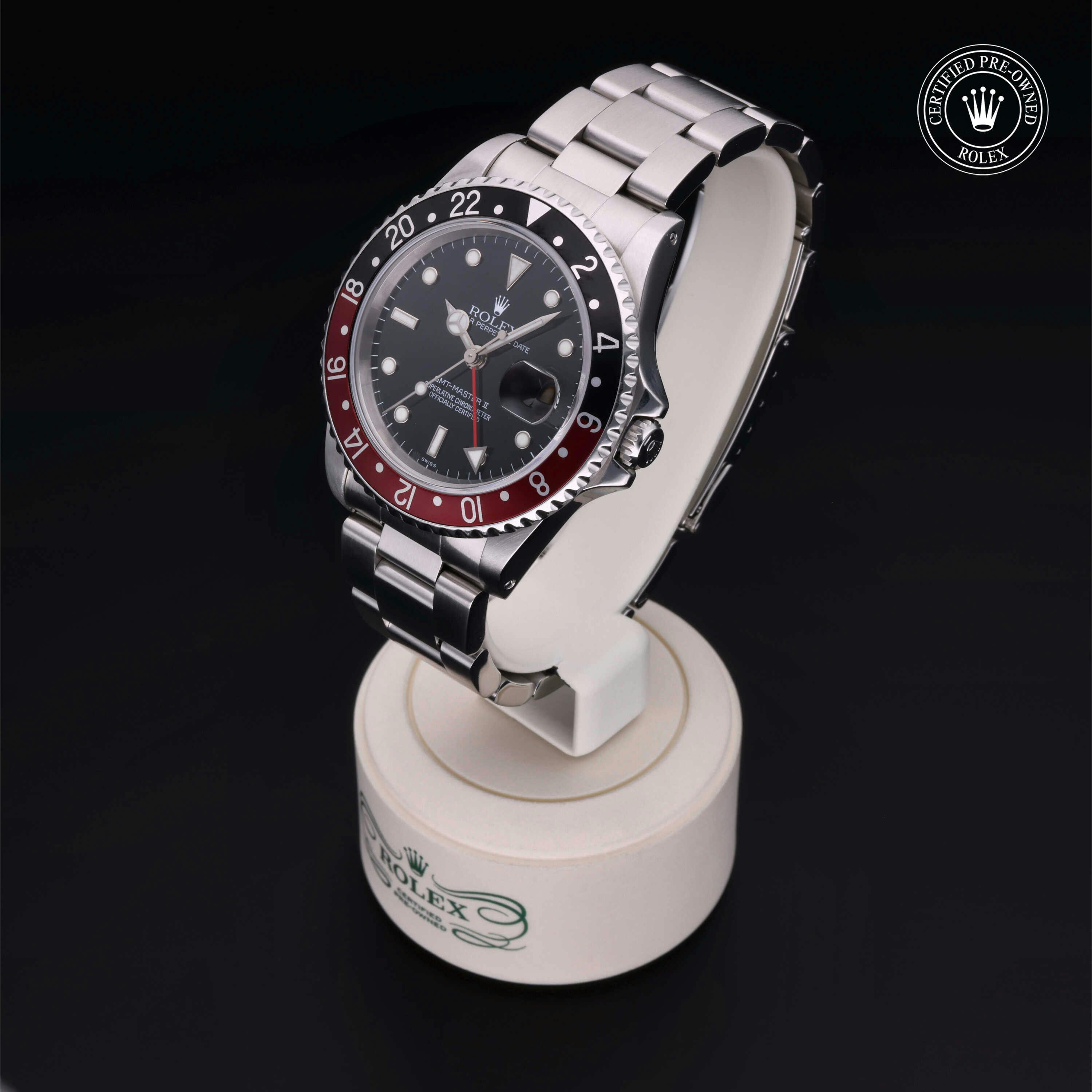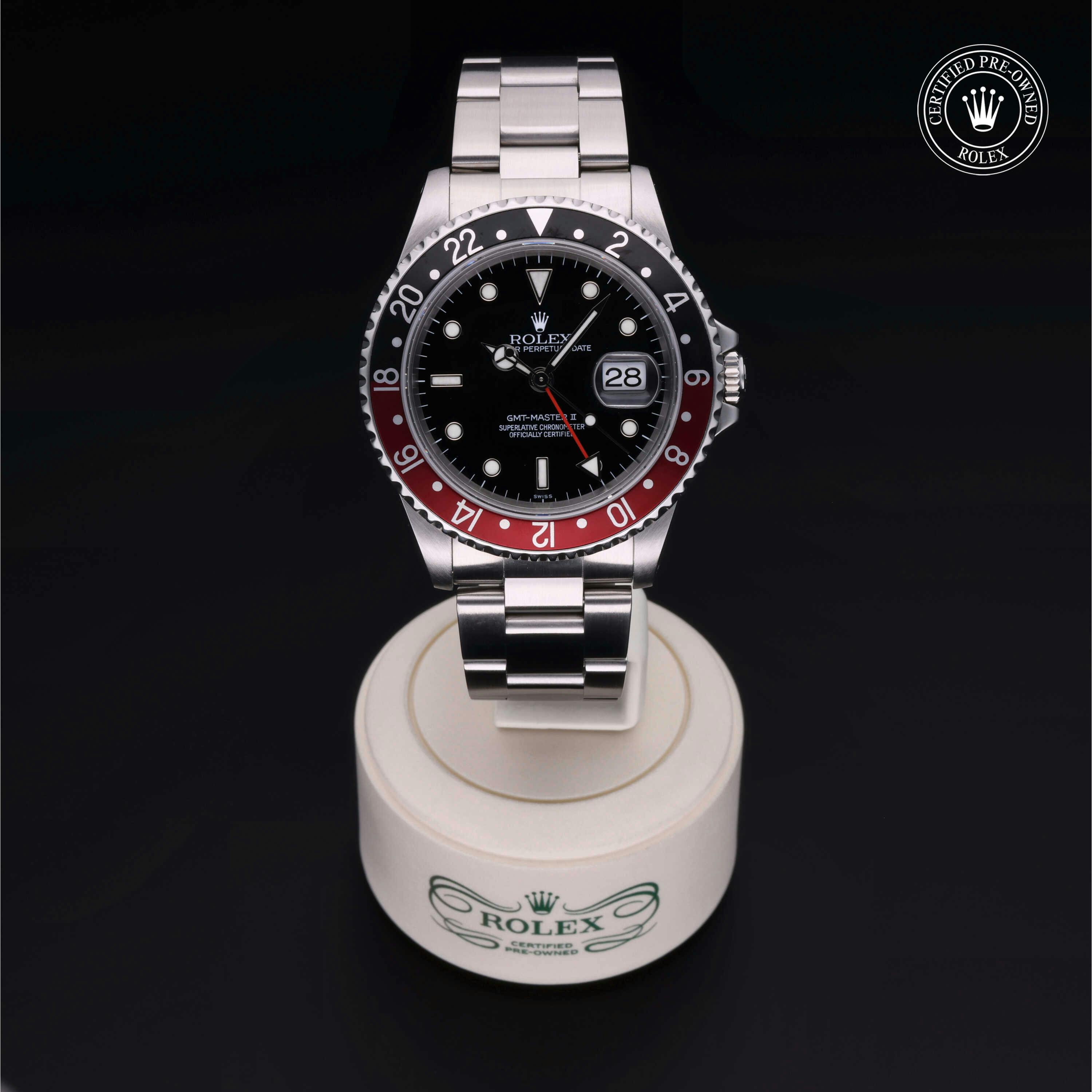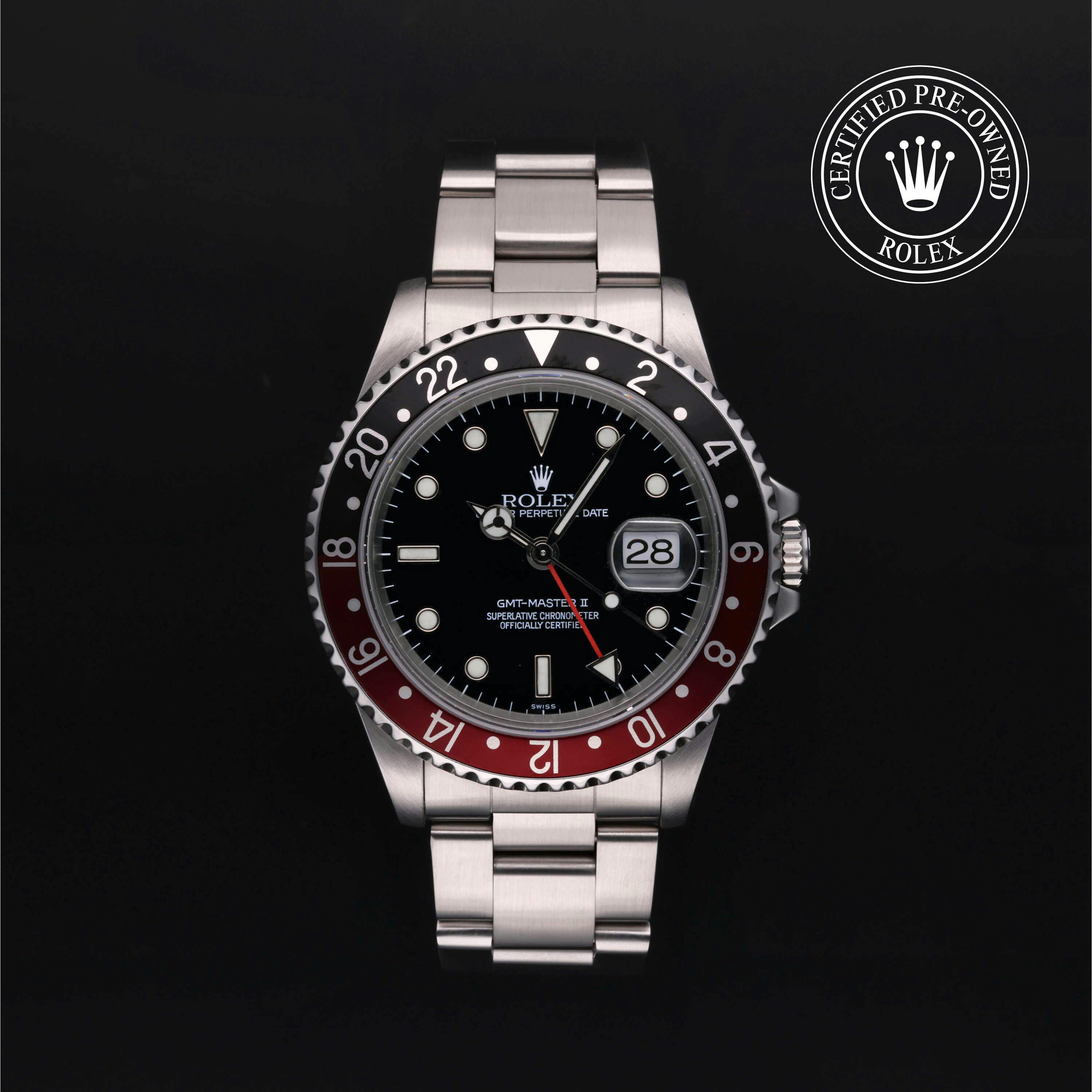 Rolex Certified Pre-Owned GMT-Master II (16710) self - winding automatic watch, features a 40mm stainless steel case with a black and red aluminum bezel surrounding a black dial on a stainless steel oyster bracelet. Functions include hours, minutes, seconds, date and gmt. This watch has received Rolex-authorized service and certification. It does not come with the original box or papers, but includes a custom Rolex Certified Pre-Owned hang tag, travel pouch and RCPO international warranty card.