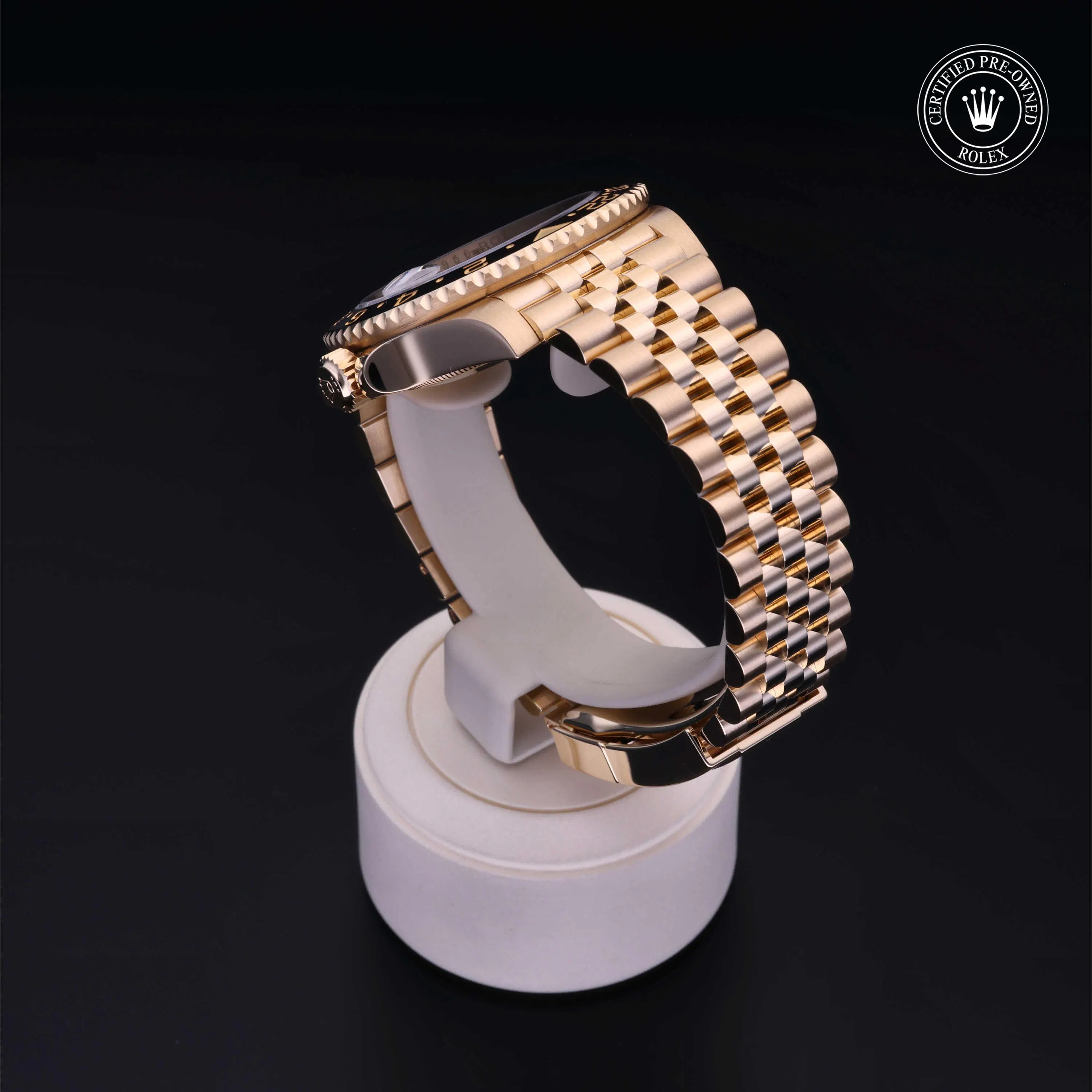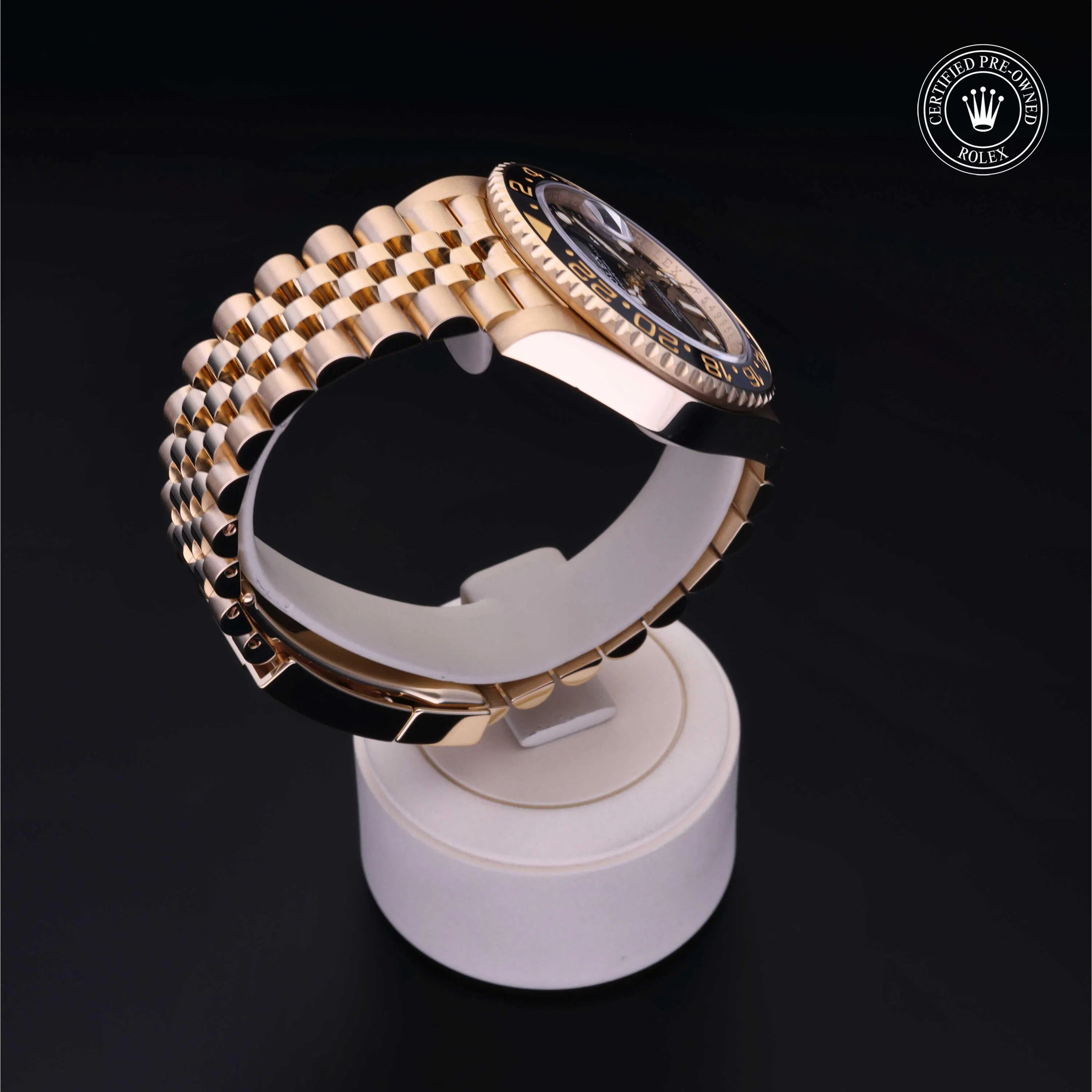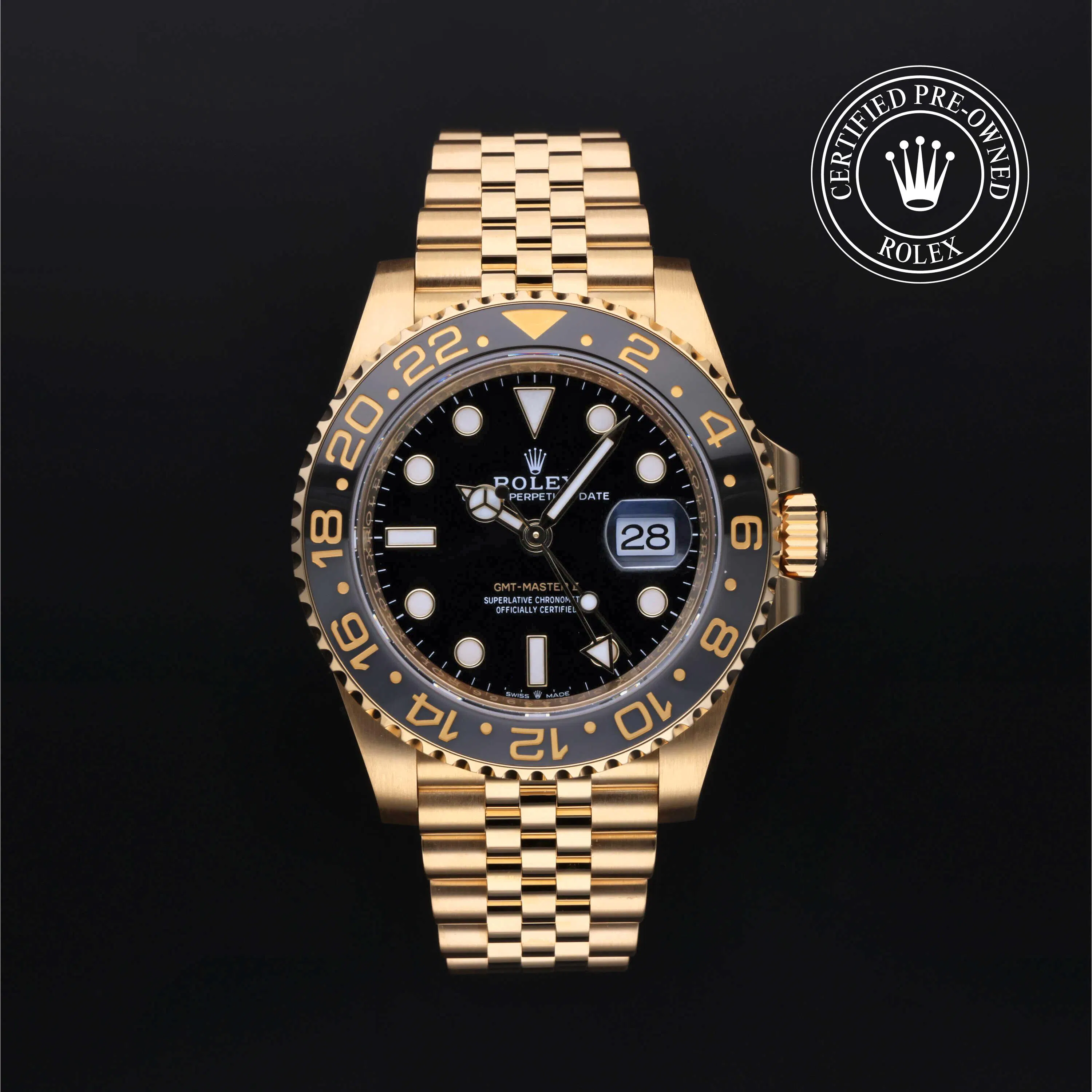 Rolex Certified Pre-Owned GMT-Master II (126718GRNR) self - winding automatic watch, features a 40mm 18k yellow gold case and rotating bezel with a black cerachrom insert surrounding a black dial on an 18k yellow gold Jubilee bracelet. Functions include hours, minutes, seconds, date and gmt/world time. This watch has received Rolex-authorized service and certification. It comes with the original box and papers, and includes a custom Rolex Certified Pre-Owned hang tag, travel pouch and RCPO international warranty card.