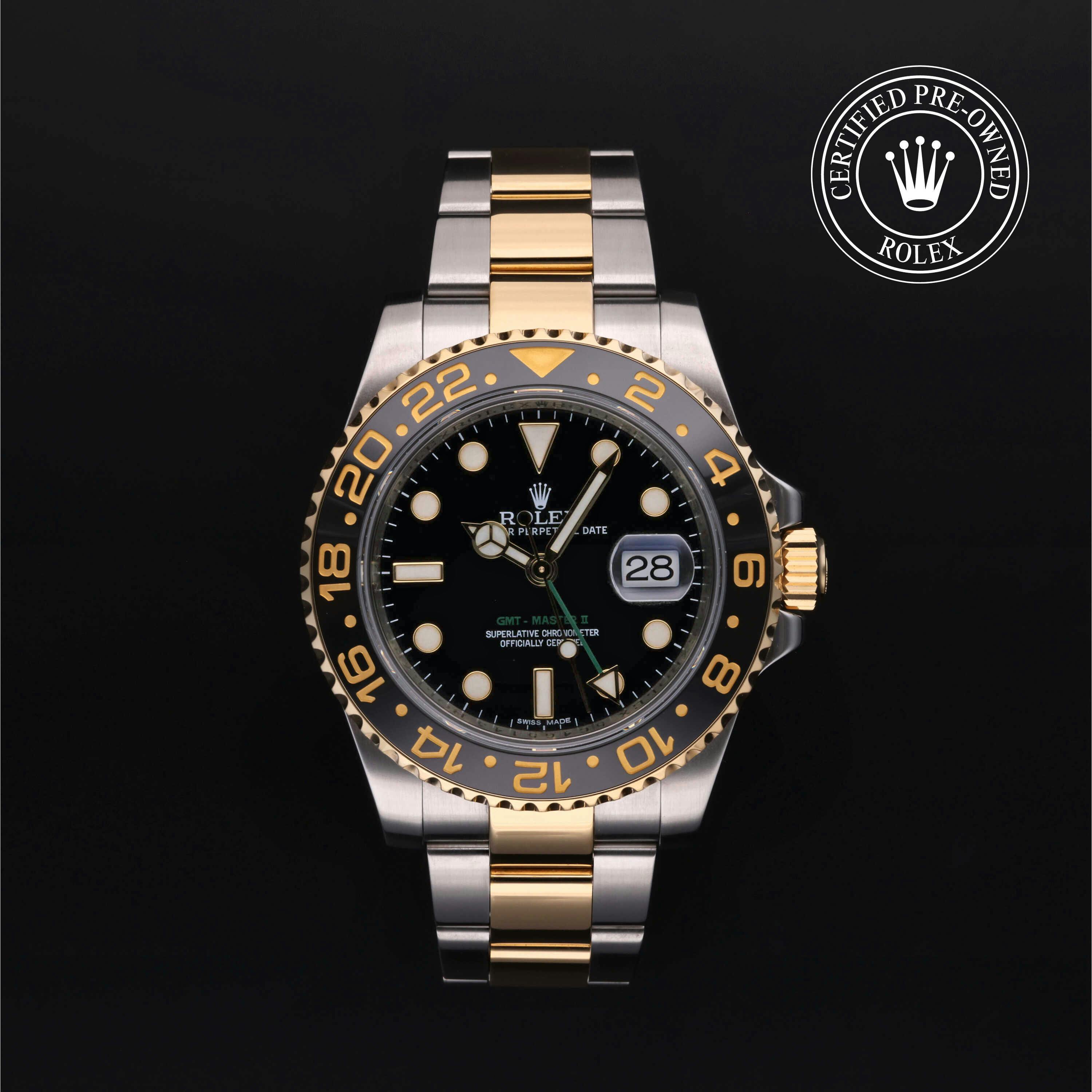 Rolex Certified Pre-Owned GMT-Master II (116713LN) self - winding automatic watch, features a 40mm stainless steel case with an 18k yellow gold and black cerachrom bezel surrounding a black dial on a stainless steel and 18k yellow gold oyster bracelet. Functions include hours, minutes, seconds, date and gmt/world time. This watch has received Rolex-authorized service and certification. It comes with the original box and papers, and includes a custom Rolex Certified Pre-Owned hang tag, travel pouch and RCPO international warranty card.
