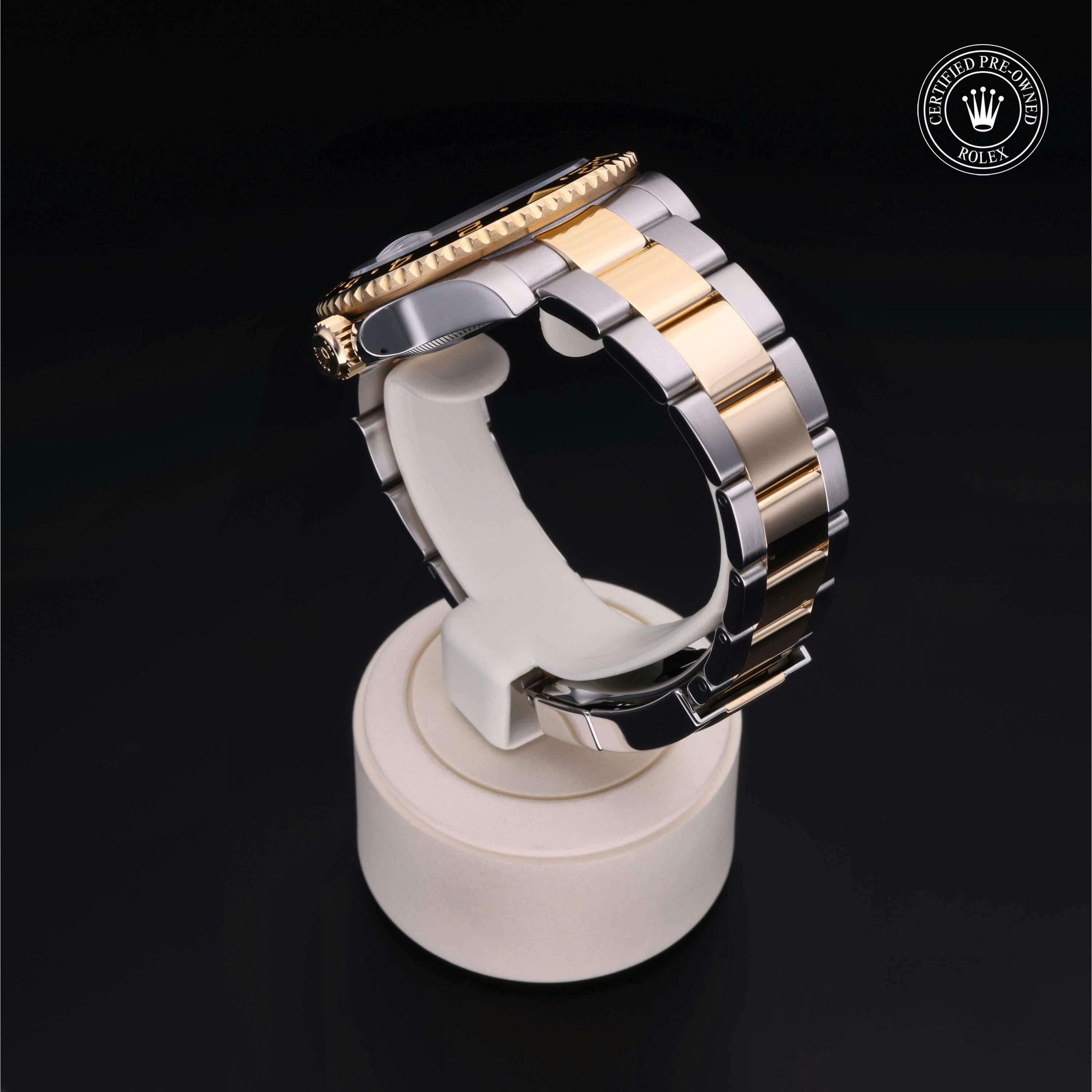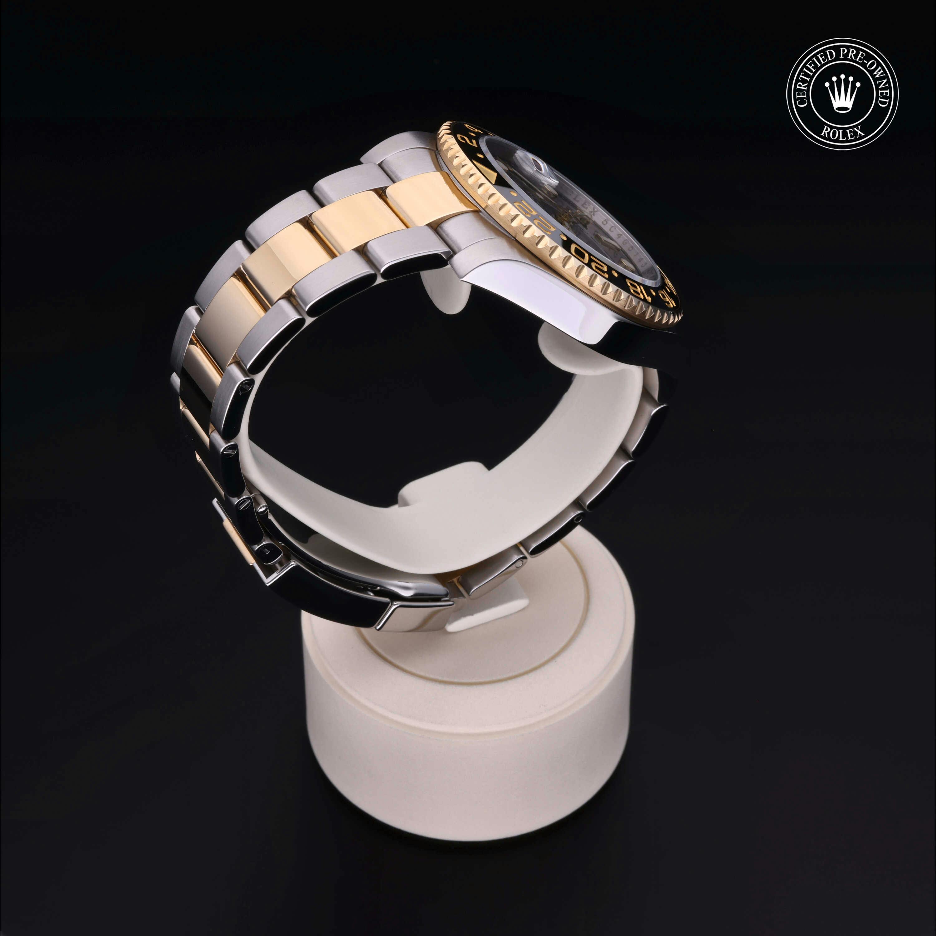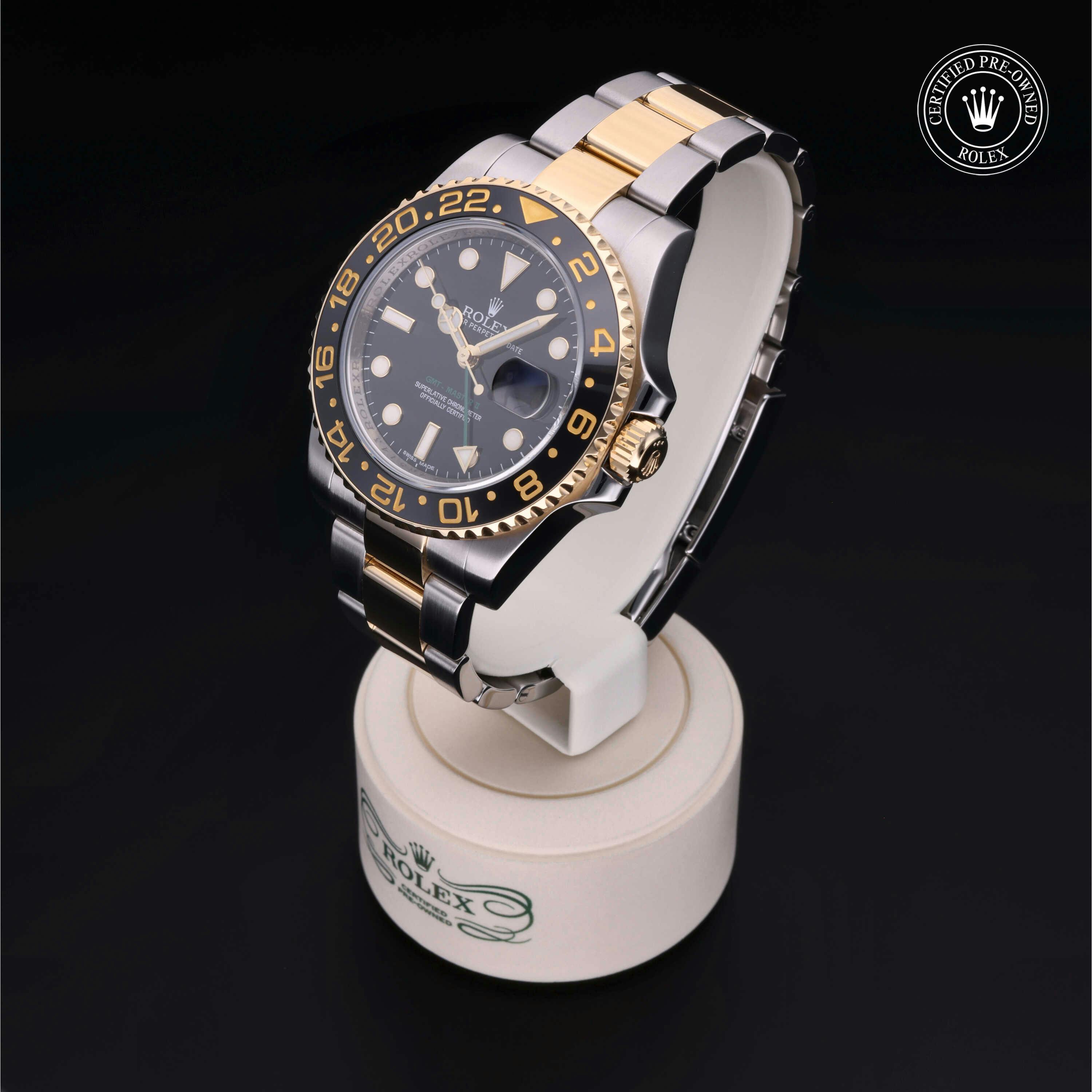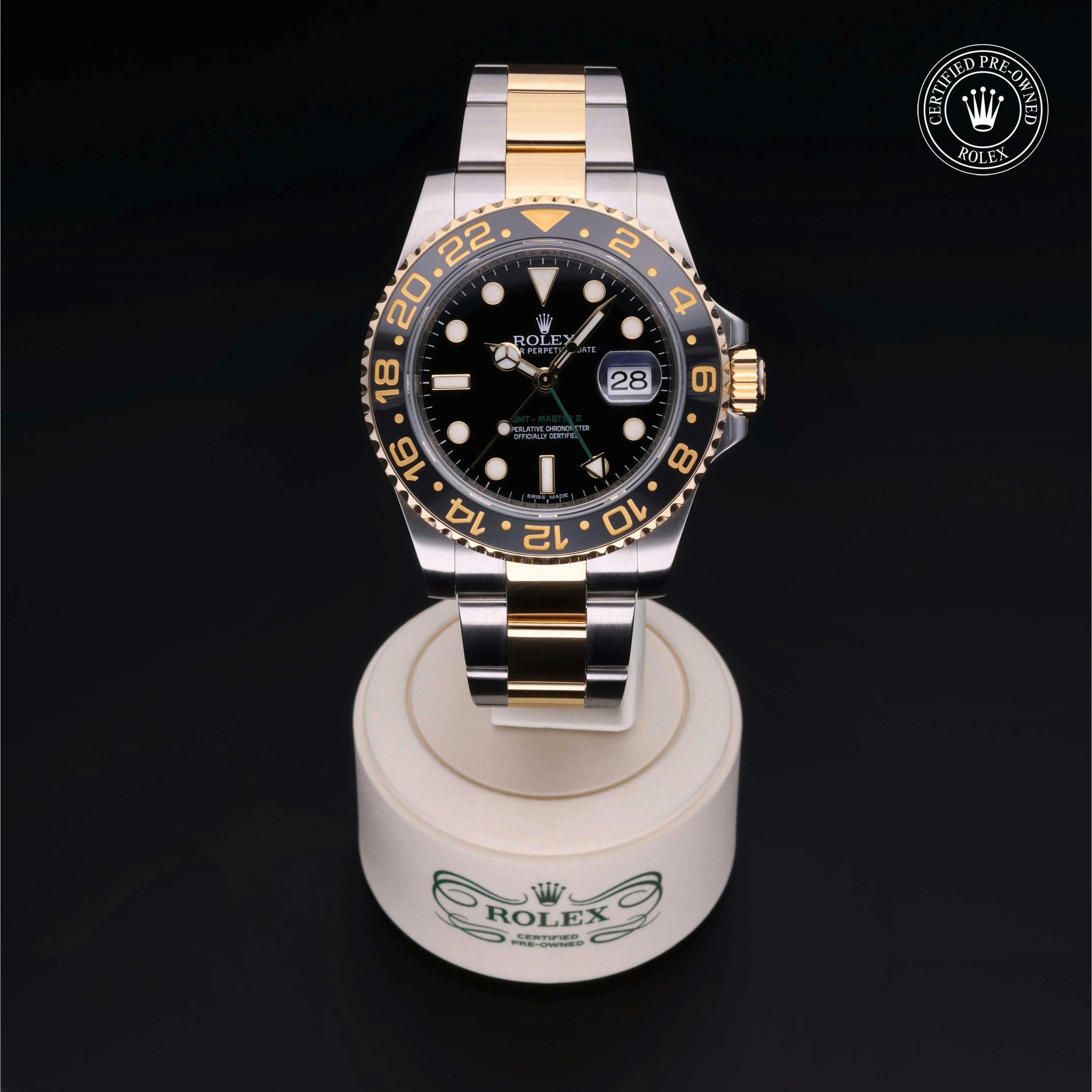 Rolex Certified Pre-Owned GMT-Master II (116713LN) self - winding automatic watch, features a 40mm stainless steel case with an 18k yellow gold and black cerachrom bezel surrounding a black dial on a stainless steel and 18k yellow gold oyster bracelet. Functions include hours, minutes, seconds, date and gmt/world time. This watch has received Rolex-authorized service and certification. It comes with the original box and papers, and includes a custom Rolex Certified Pre-Owned hang tag, travel pouch and RCPO international warranty card.