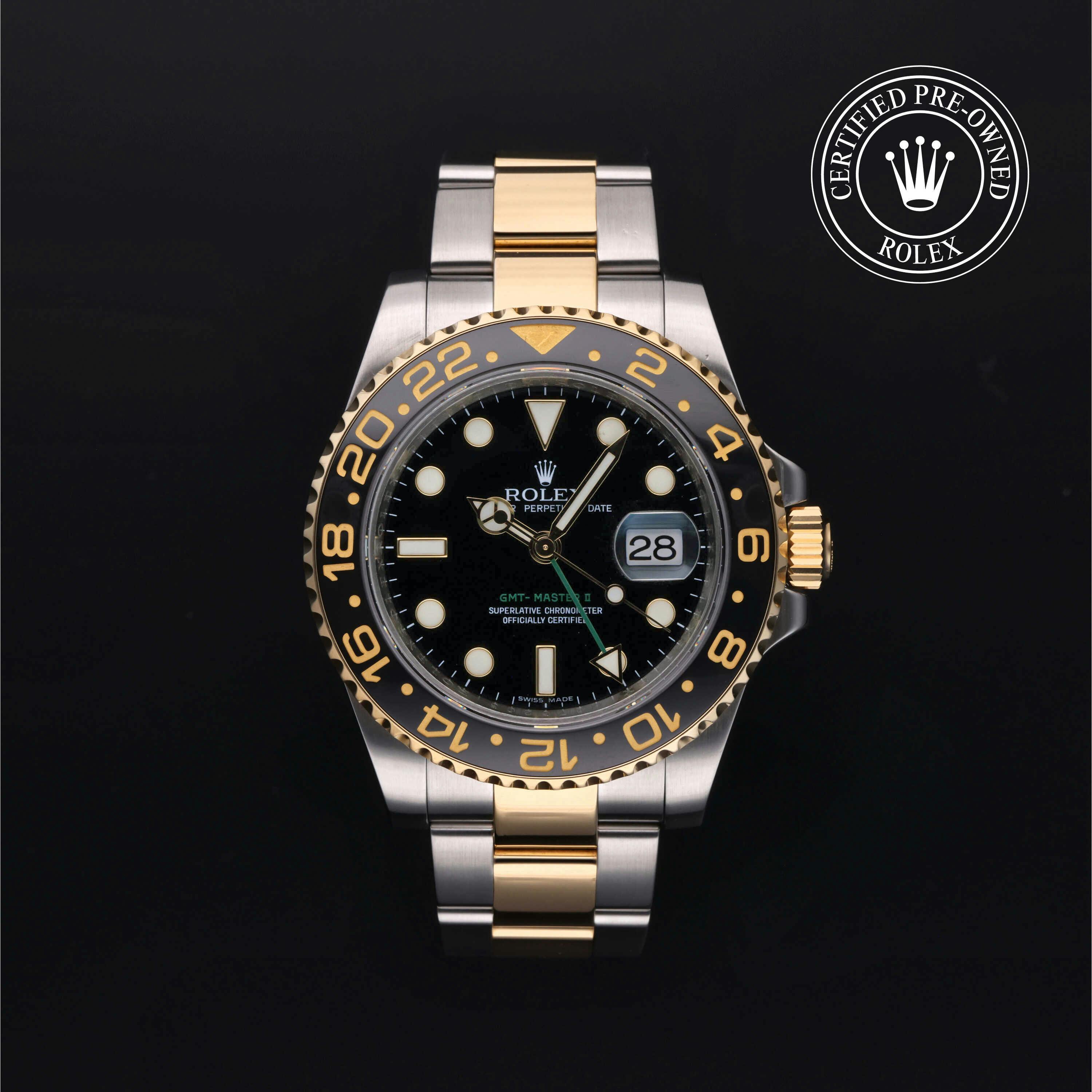 Rolex Certified Pre-Owned GMT-Master II (116713LN) self - winding automatic watch, features a 40mm stainless steel case with an 18k yellow gold and black cerachrom bidirectional rotating bezel surrounding a black dial. Watch is secured on a stainless steel and 18k yellow gold oyster bracelet complete with a folding buckle. Functions include hours, minutes, seconds, date and gmt/world time. This watch has received Rolex-authorized service and certified by Rolex. It comes with the original box and papers, and includes a custom Rolex Certified Pre-Owned hang tag, travel pouch and international warranty card.