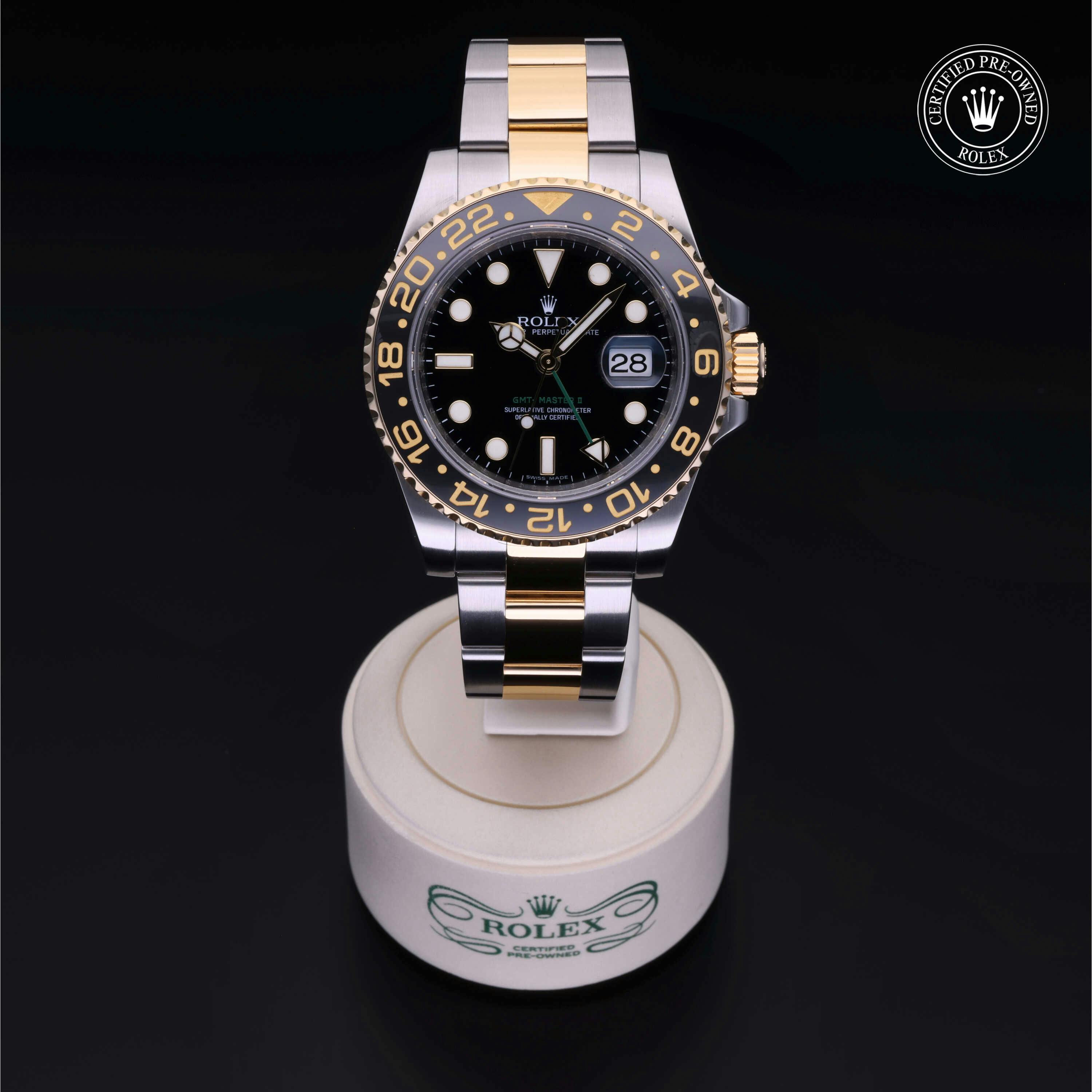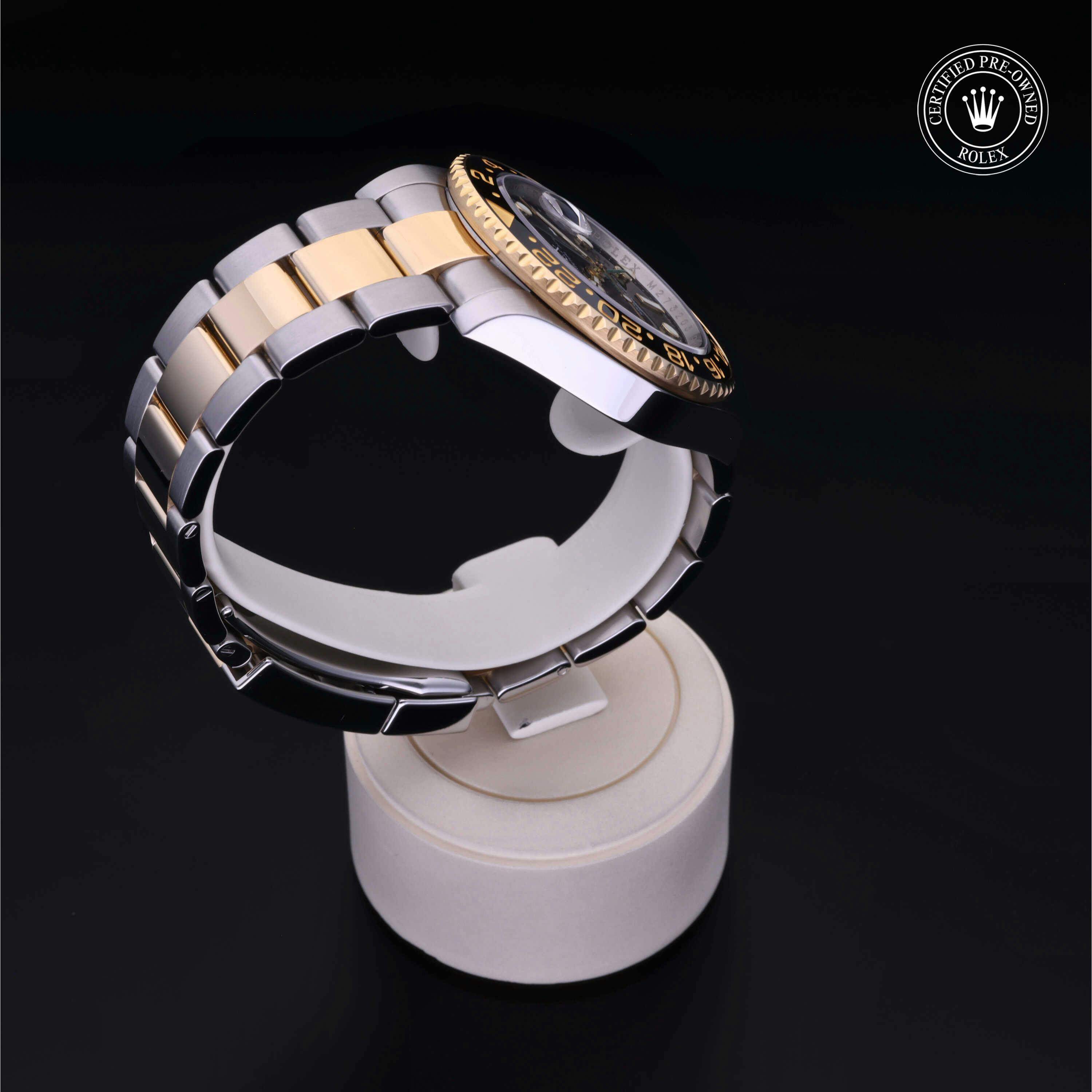 Rolex Certified Pre-Owned GMT-Master II (116713LN) self - winding automatic watch, features a 40mm stainless steel case with an 18k yellow gold and black cerachrom bidirectional rotating bezel surrounding a black dial. Watch is secured on a stainless steel and 18k yellow gold oyster bracelet complete with a folding buckle. Functions include hours, minutes, seconds, date and gmt/world time. This watch has received Rolex-authorized service and certified by Rolex. It comes with the original box and papers, and includes a custom Rolex Certified Pre-Owned hang tag, travel pouch and international warranty card.