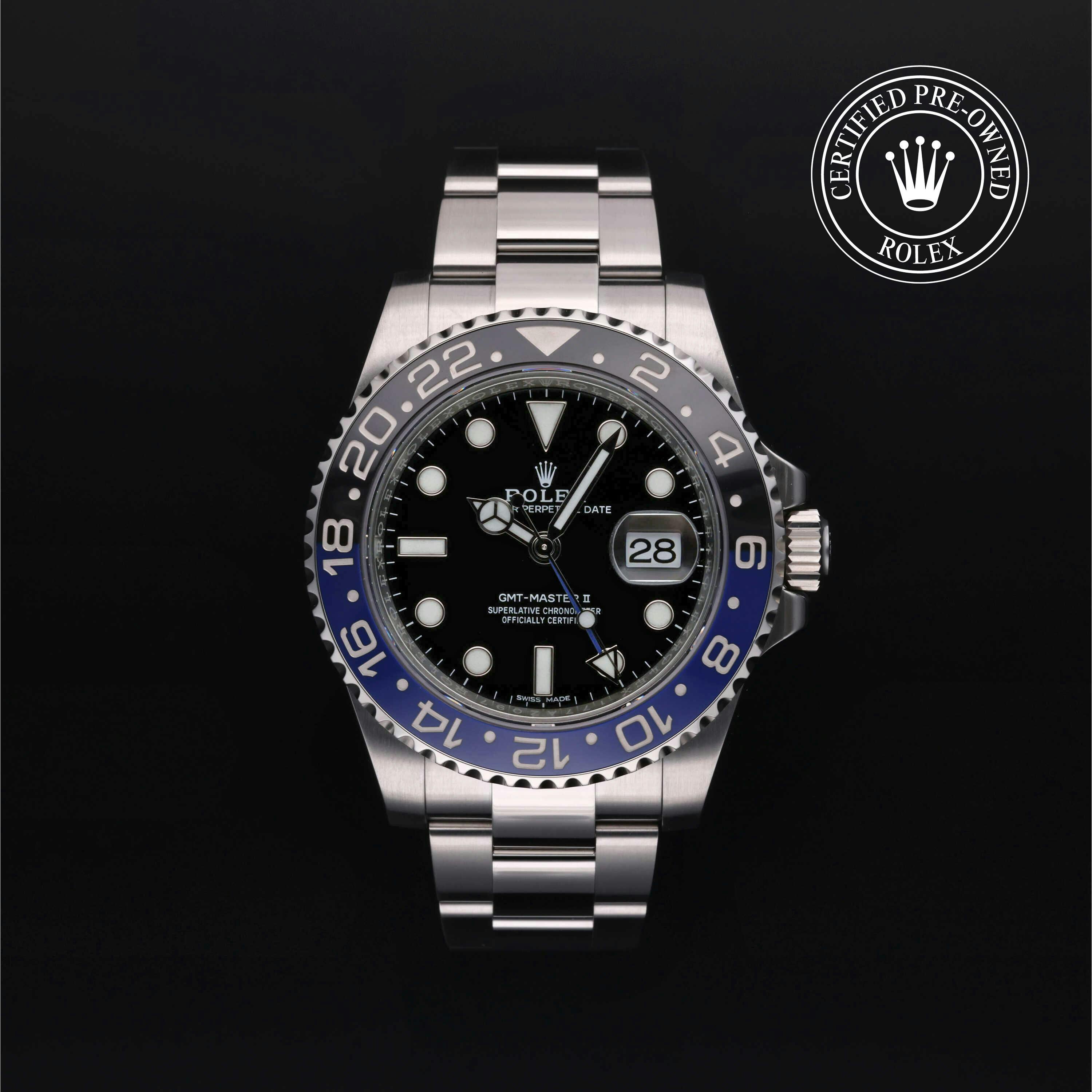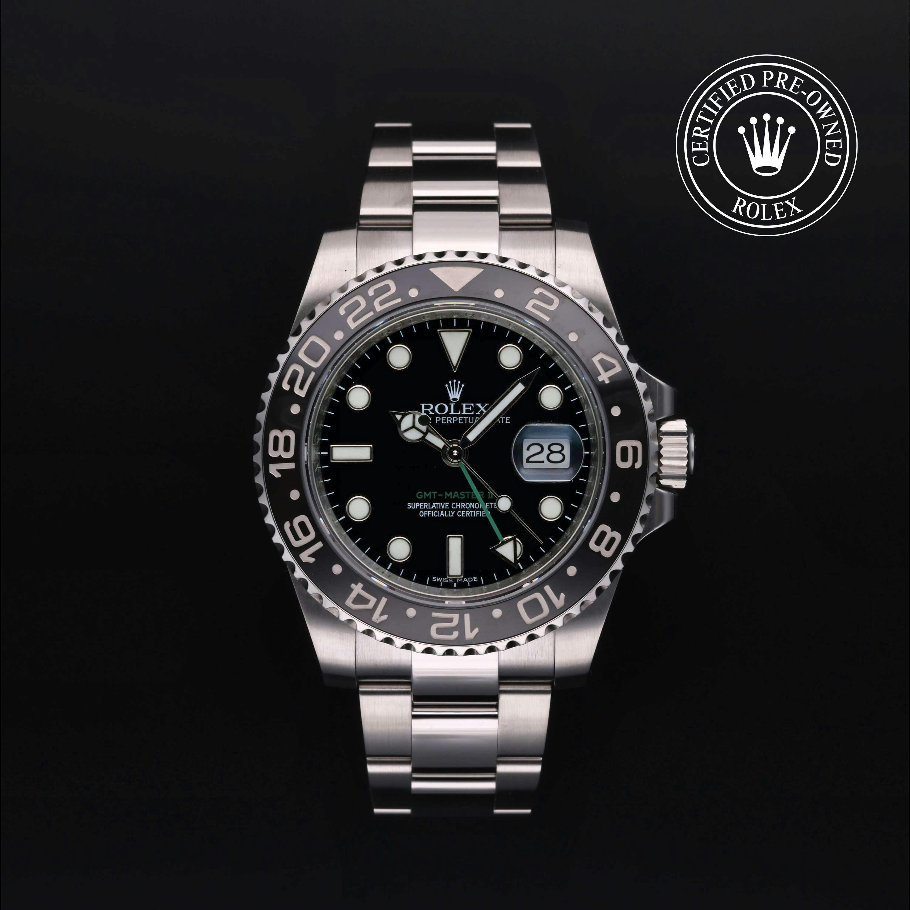 Rolex Certified Pre-Owned GMT-Master II (16710) self - winding automatic watch, features a 40mm stainless steel case with a black and red aluminum bezel surrounding a black dial on a stainless steel oyster bracelet. Functions include hours, minutes, seconds, date and gmt/world time. This watch has received Rolex-authorized service and certification. It does not come with the original box or papers, but includes a custom Rolex Certified Pre-Owned hang tag, travel pouch and RCPO international warranty card.