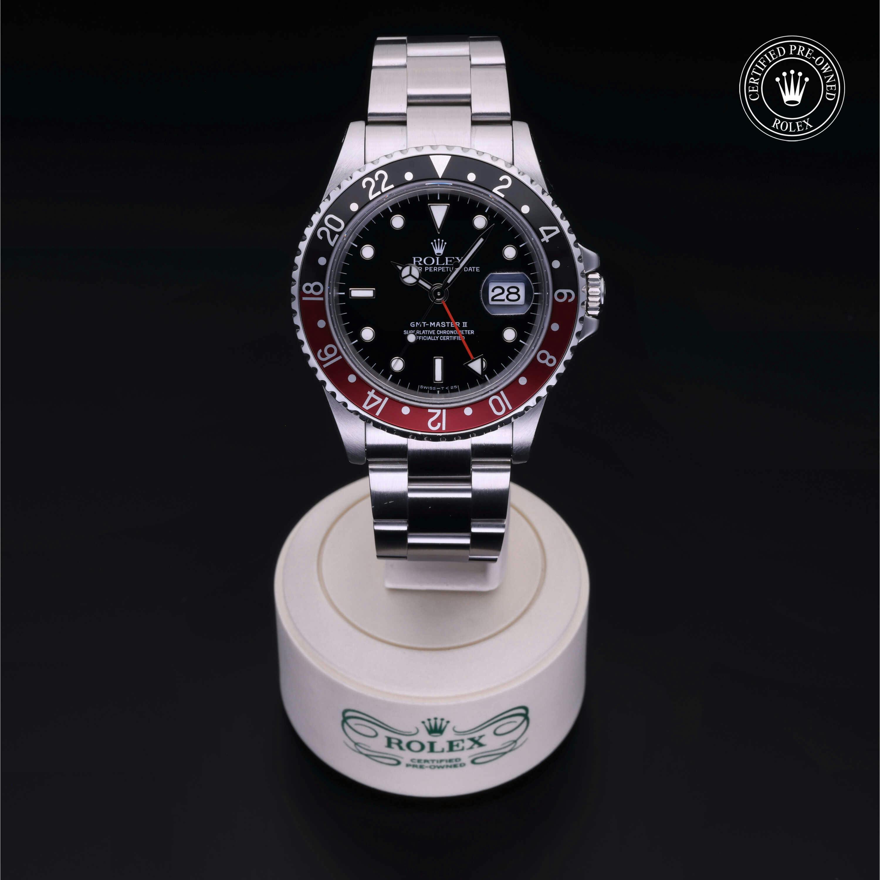 Rolex Certified Pre-Owned GMT-Master II (16710) self - winding automatic watch, features a 40mm stainless steel case with a black and red aluminum bezel surrounding a black dial on a stainless steel oyster bracelet. Functions include hours, minutes, seconds, date and gmt/world time. This watch has received Rolex-authorized service and certification. It does not come with the original box or papers, but includes a custom Rolex Certified Pre-Owned hang tag, travel pouch and RCPO international warranty card.