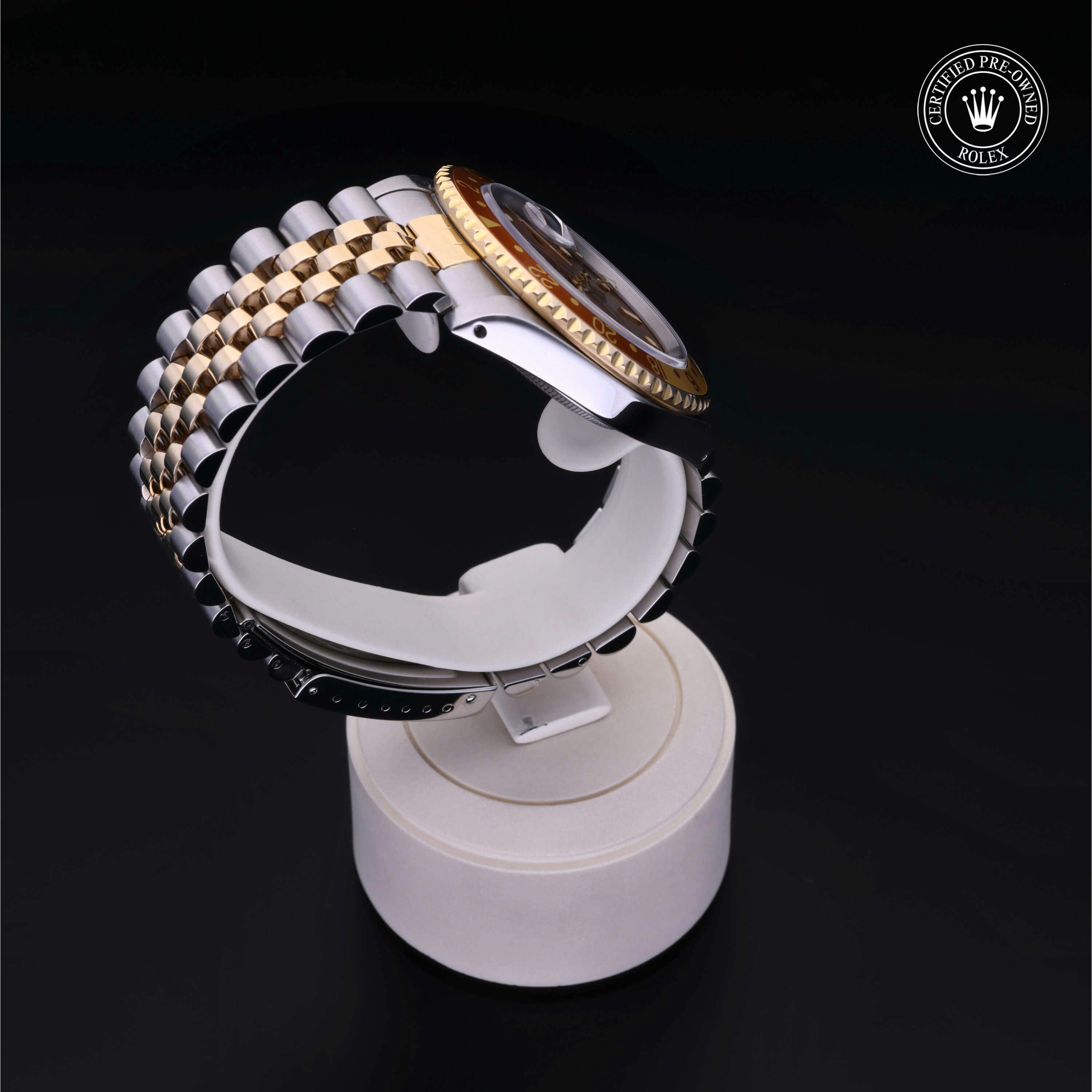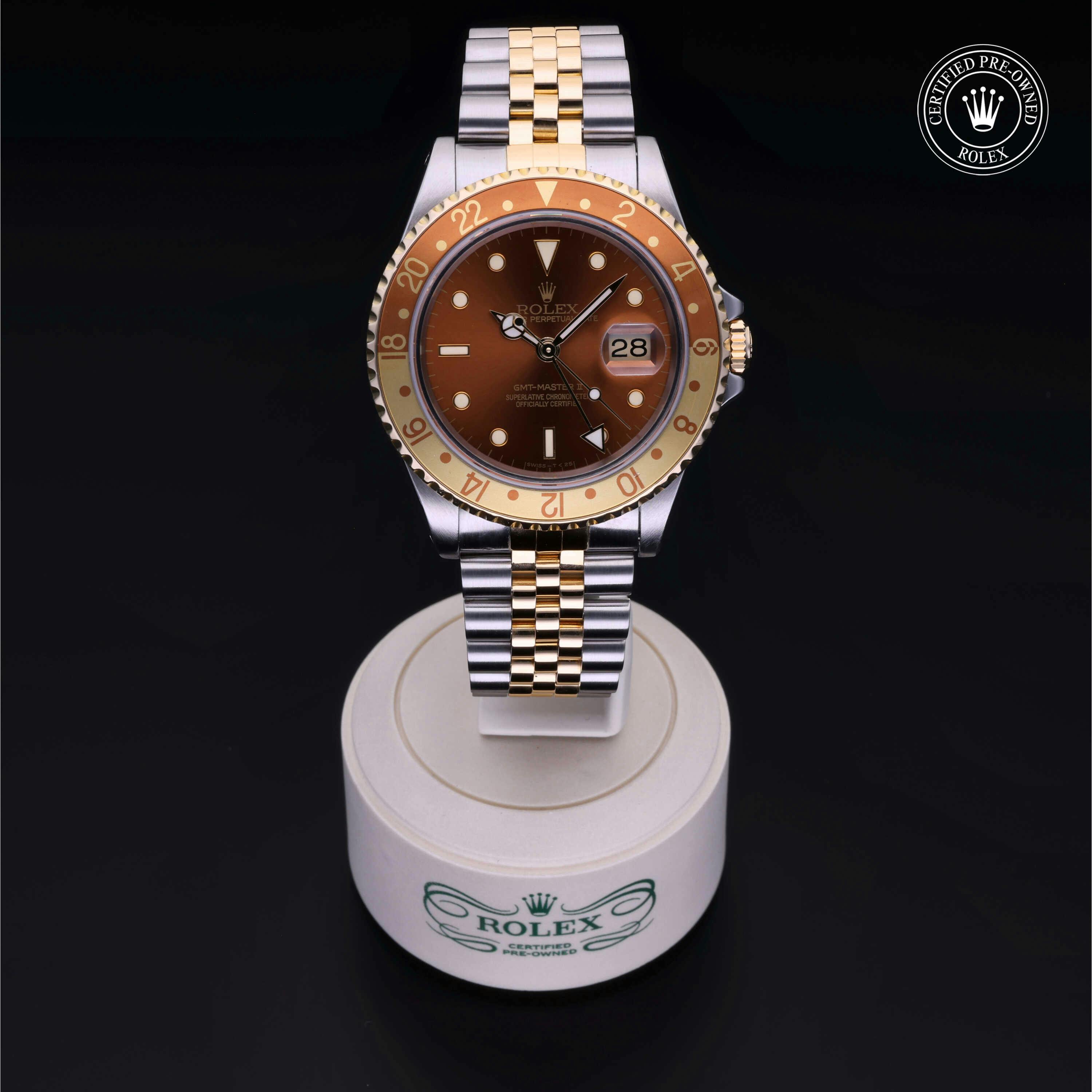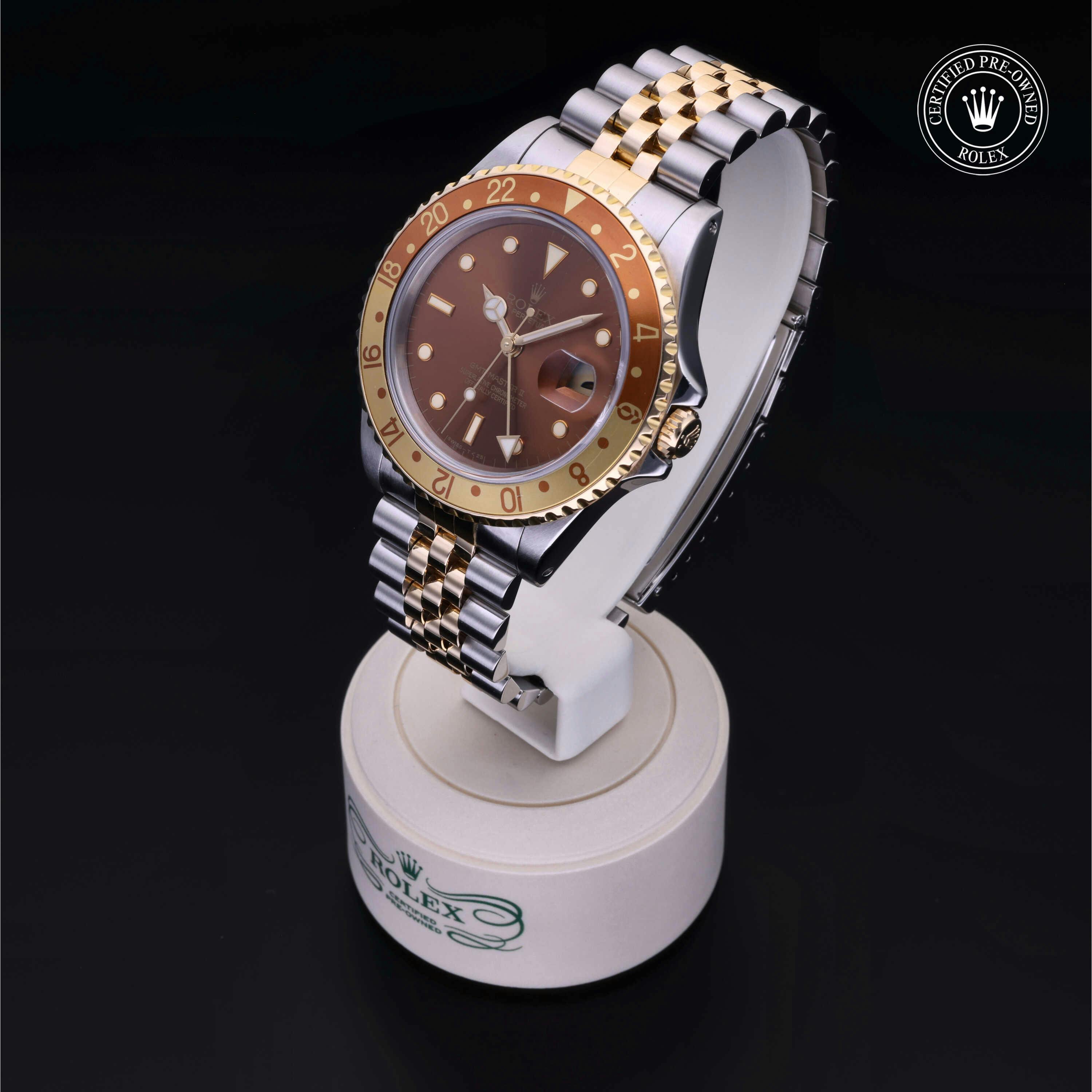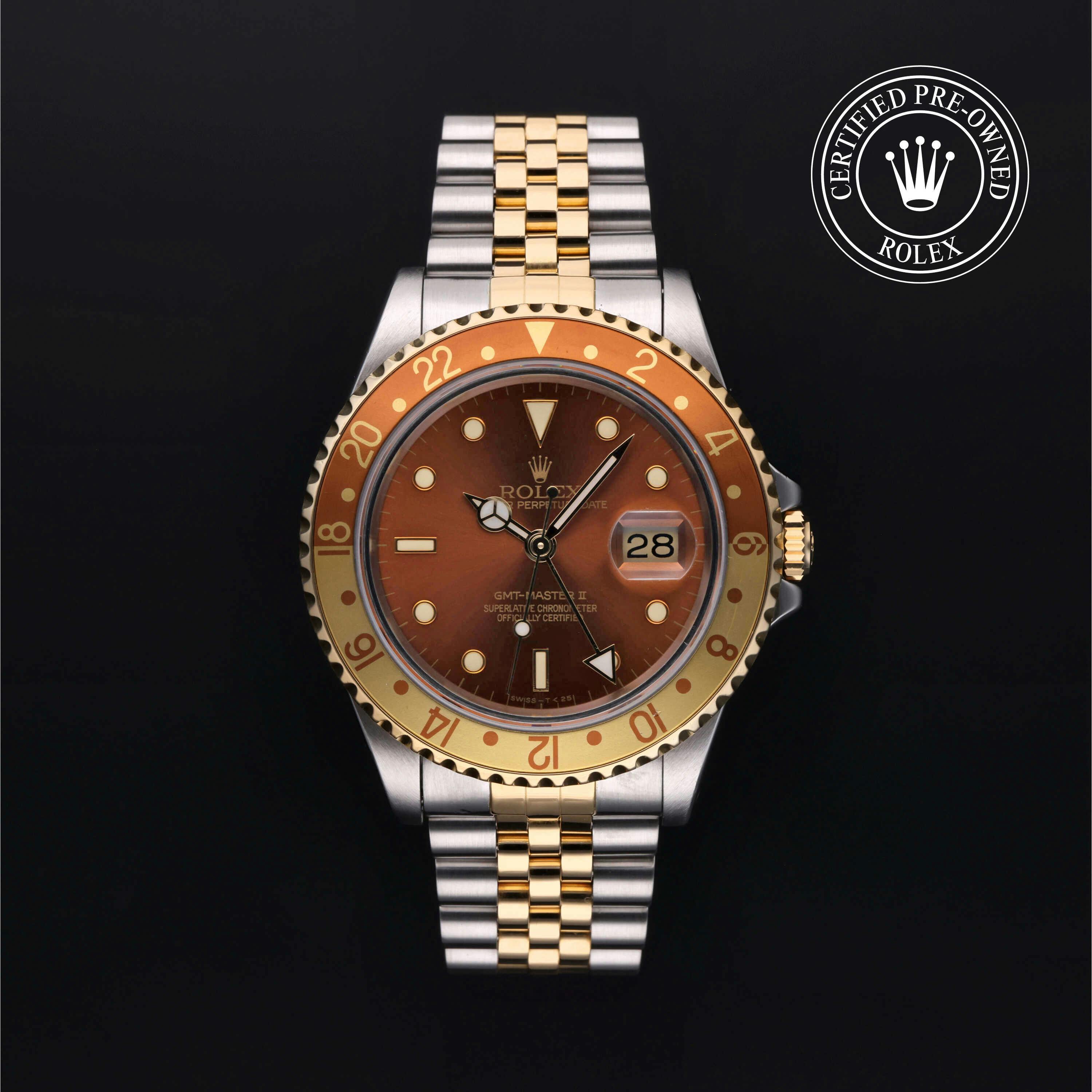 Rolex Certified Pre-Owned GMT-Master II (16713) self - winding automatic watch, features a 40mm stainless steel case with an 18k yellow gold, brown and cream aluminum bezel surrounding a brown dial on a stainless and 18k yellow gold jubilee bracelet. Functions include hours, minutes, seconds, date and gmt/world time. This watch has received Rolex-authorized service and certification. It does not come with the original box or papers, but includes a custom Rolex Certified Pre-Owned hang tag, travel pouch and RCPO international warranty card.
