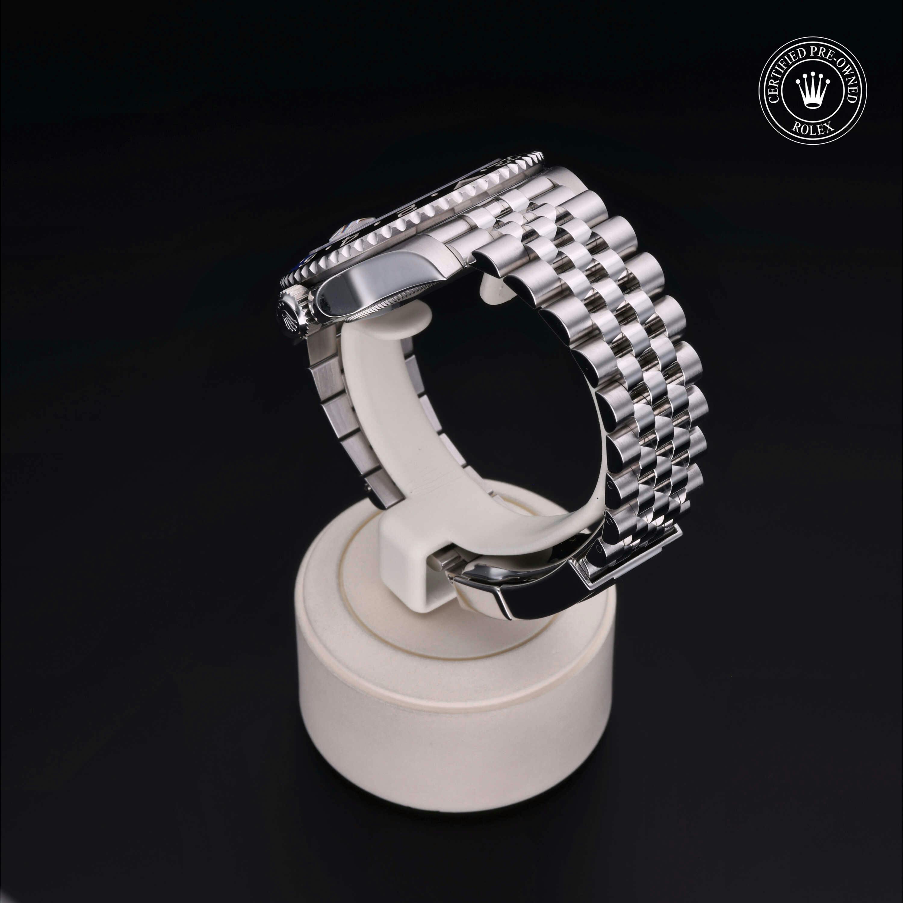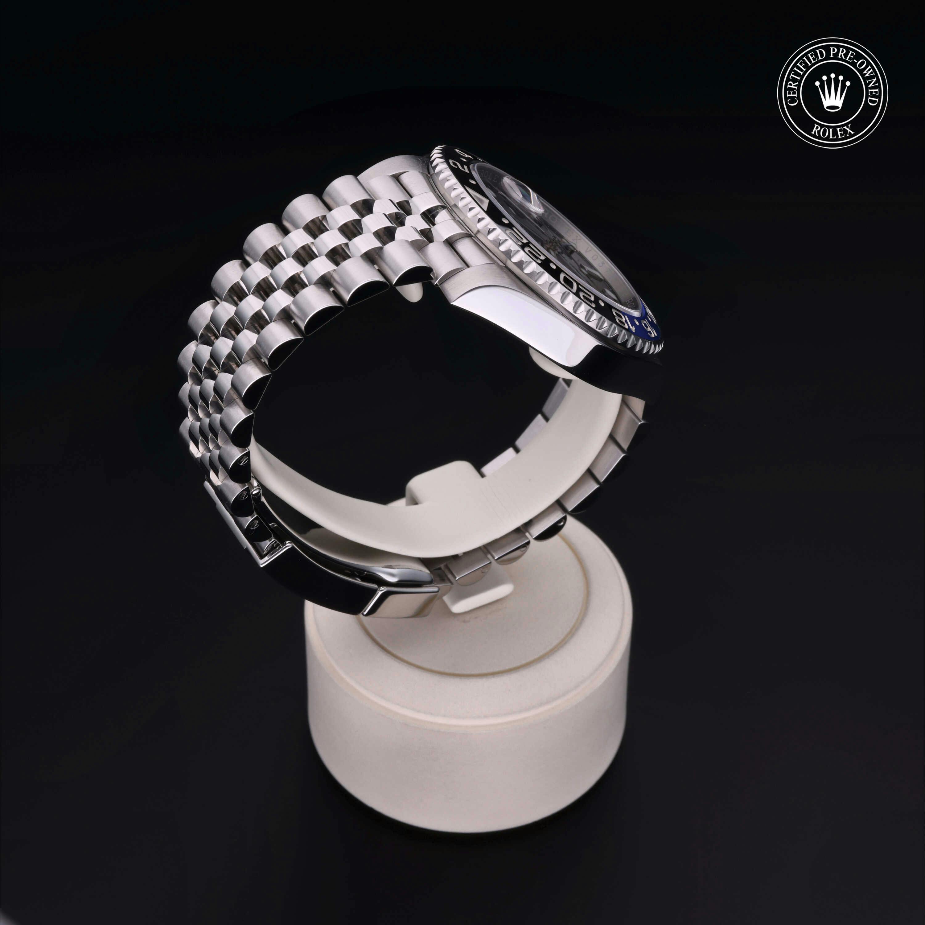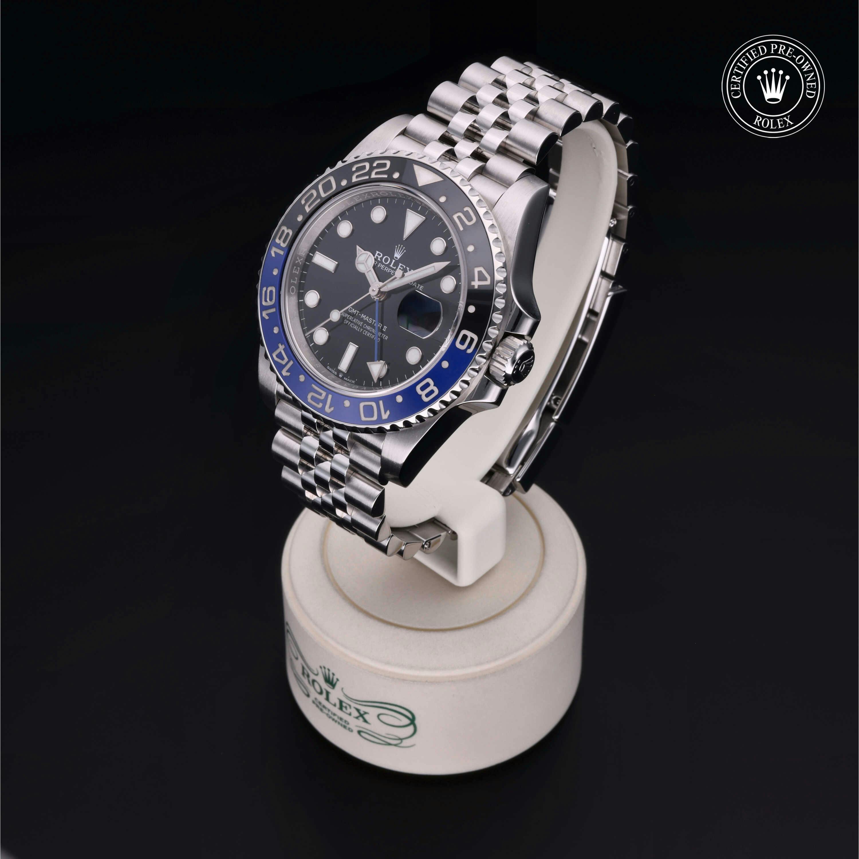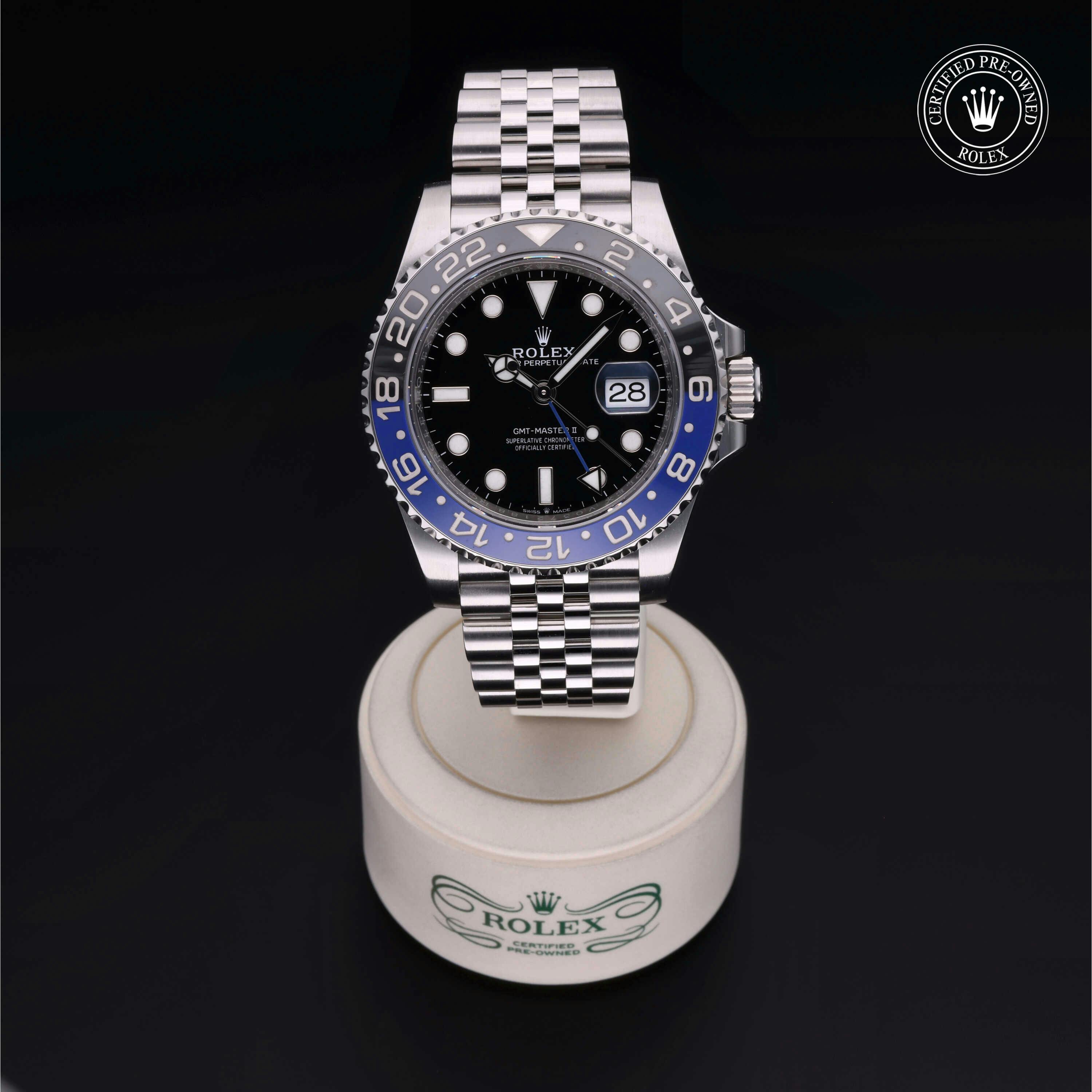 Rolex Certified Pre-Owned GMT-Master II (126710BLNR) self - winding automatic watch, features a 40mm stainless steel case with a black and blue cerachrom bezel surrounding a black dial on a stainless steel jubilee bracelet. Functions include hours, minutes, seconds, date and gmt/world time. This watch has received Rolex-authorized service and certification. It comes with the original box and papers, and includes a custom Rolex Certified Pre-Owned hang tag, travel pouch and RCPO international warranty card.