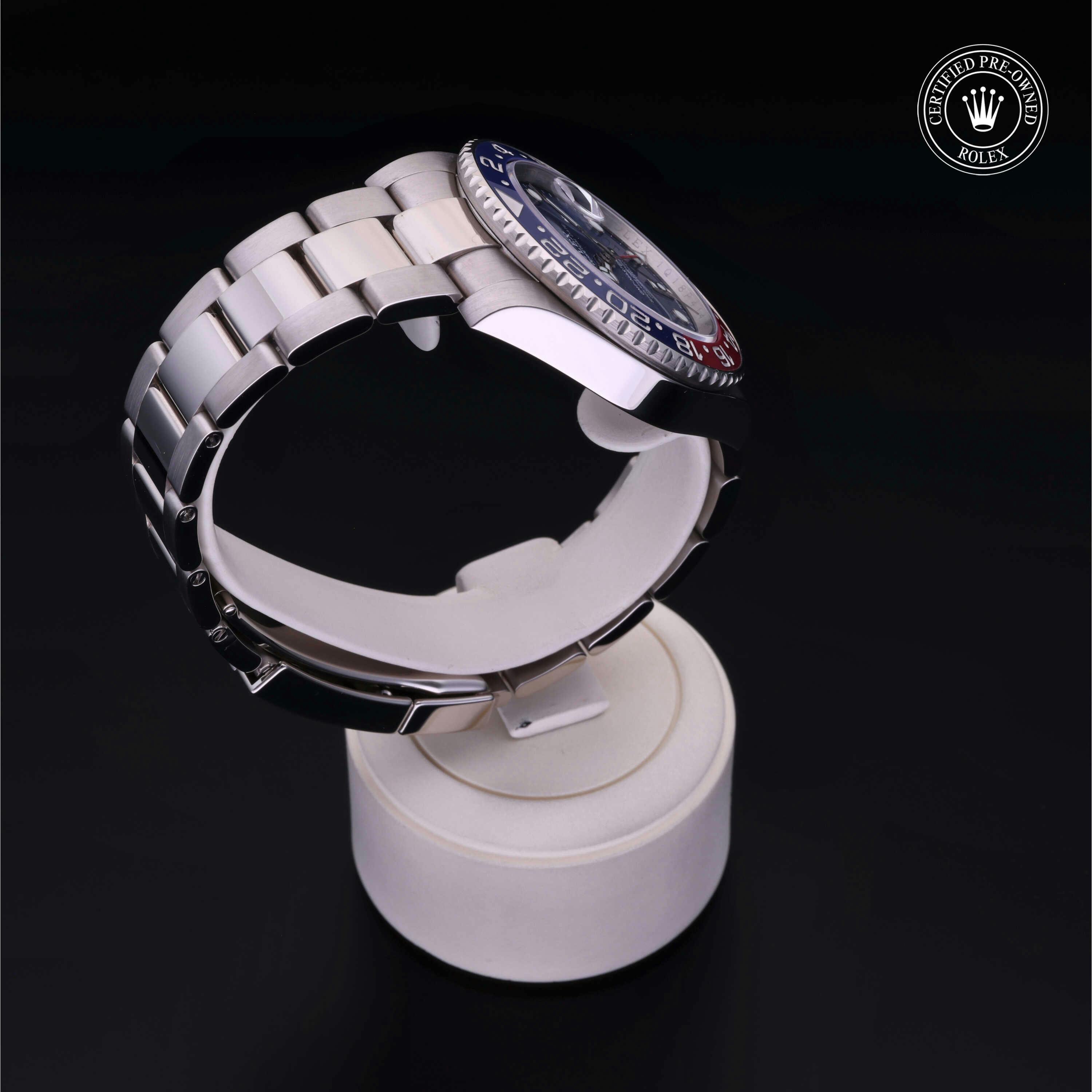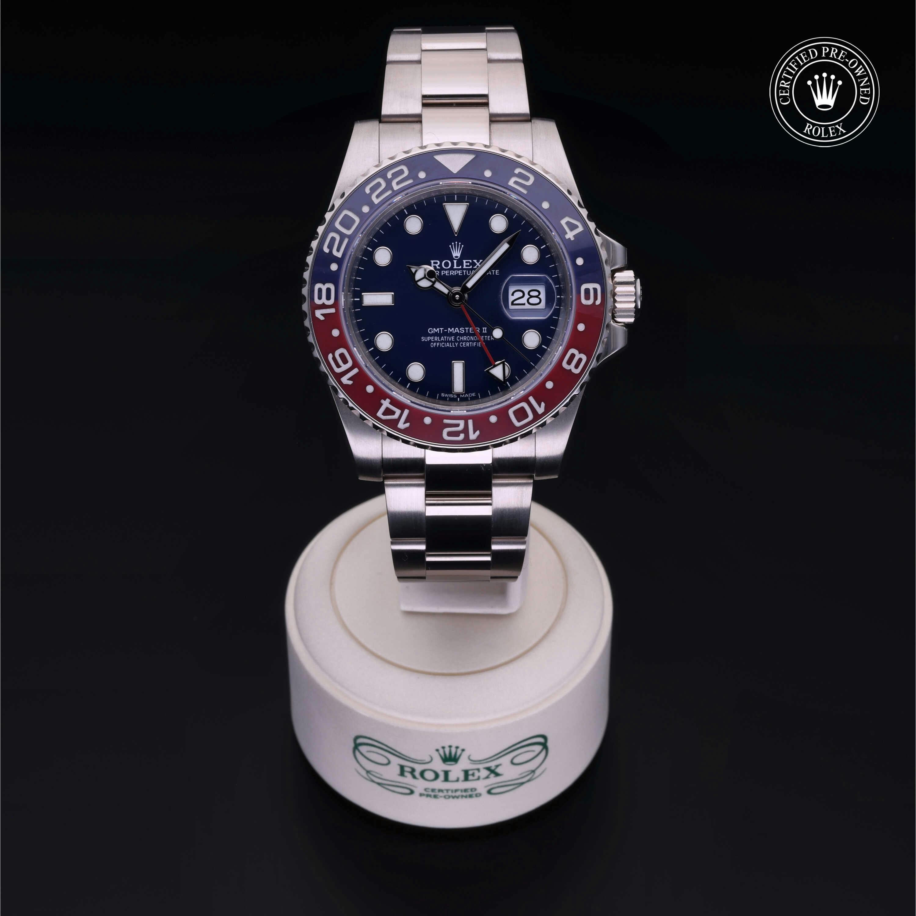 Rolex Certified Pre-Owned GMT-Master II (116719BLRO) self - winding automatic watch, features a 40mm 18k white gold case with a blue and red cerachrom bezel surrounding a blue dial on an 18k white gold oyster bracelet. Functions include hours, minutes, seconds, date and gmt/world time. This watch has received Rolex-authorized service and certification. It comes with the original papers, and includes a custom Rolex Certified Pre-Owned hang tag, travel pouch and RCPO international warranty card.