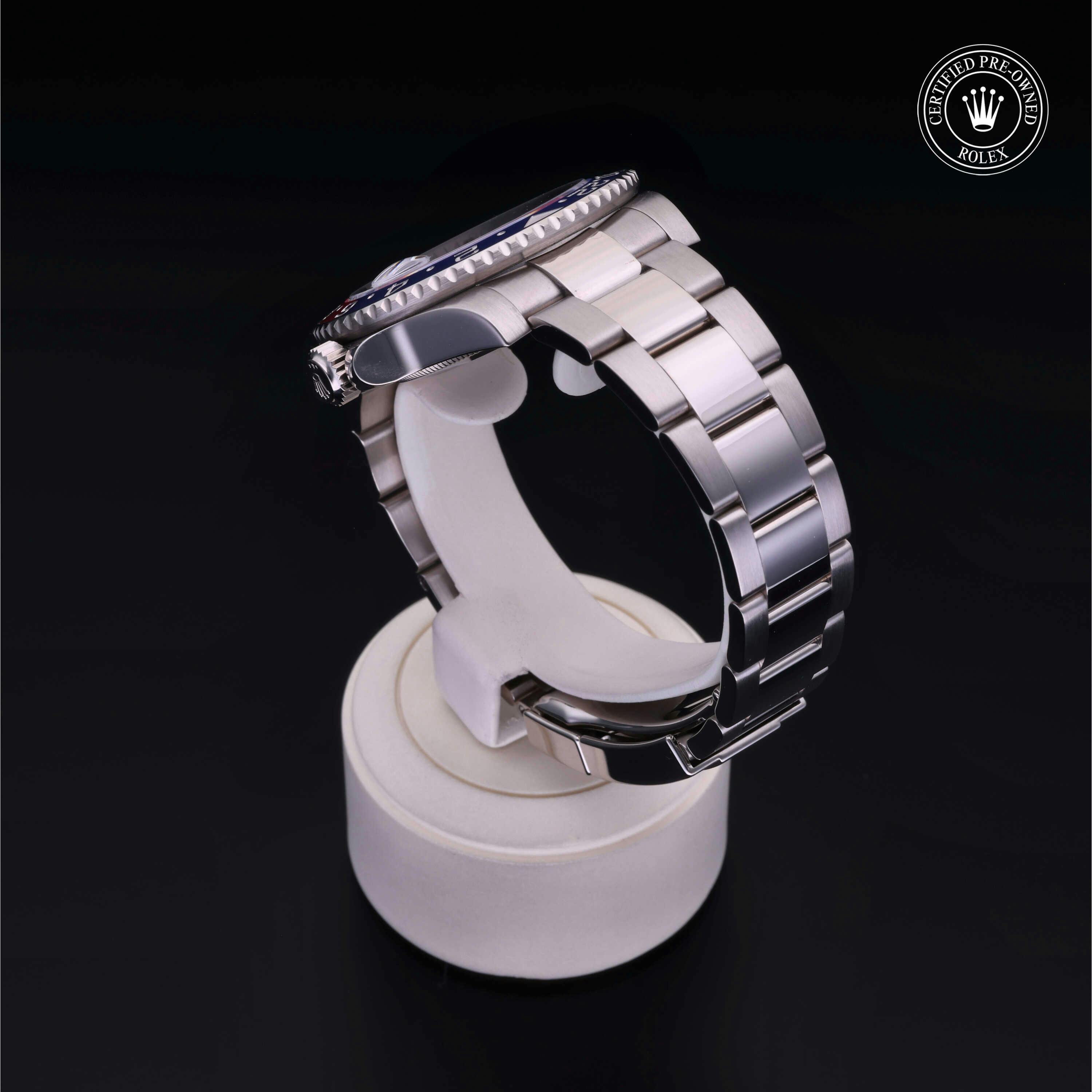 Rolex Certified Pre-Owned GMT-Master II (116719BLRO) self - winding automatic watch, features a 40mm 18k white gold case with a blue and red cerachrom bezel surrounding a blue dial on an 18k white gold oyster bracelet. Functions include hours, minutes, seconds, date and gmt/world time. This watch has received Rolex-authorized service and certification. It comes with the original papers, and includes a custom Rolex Certified Pre-Owned hang tag, travel pouch and RCPO international warranty card.