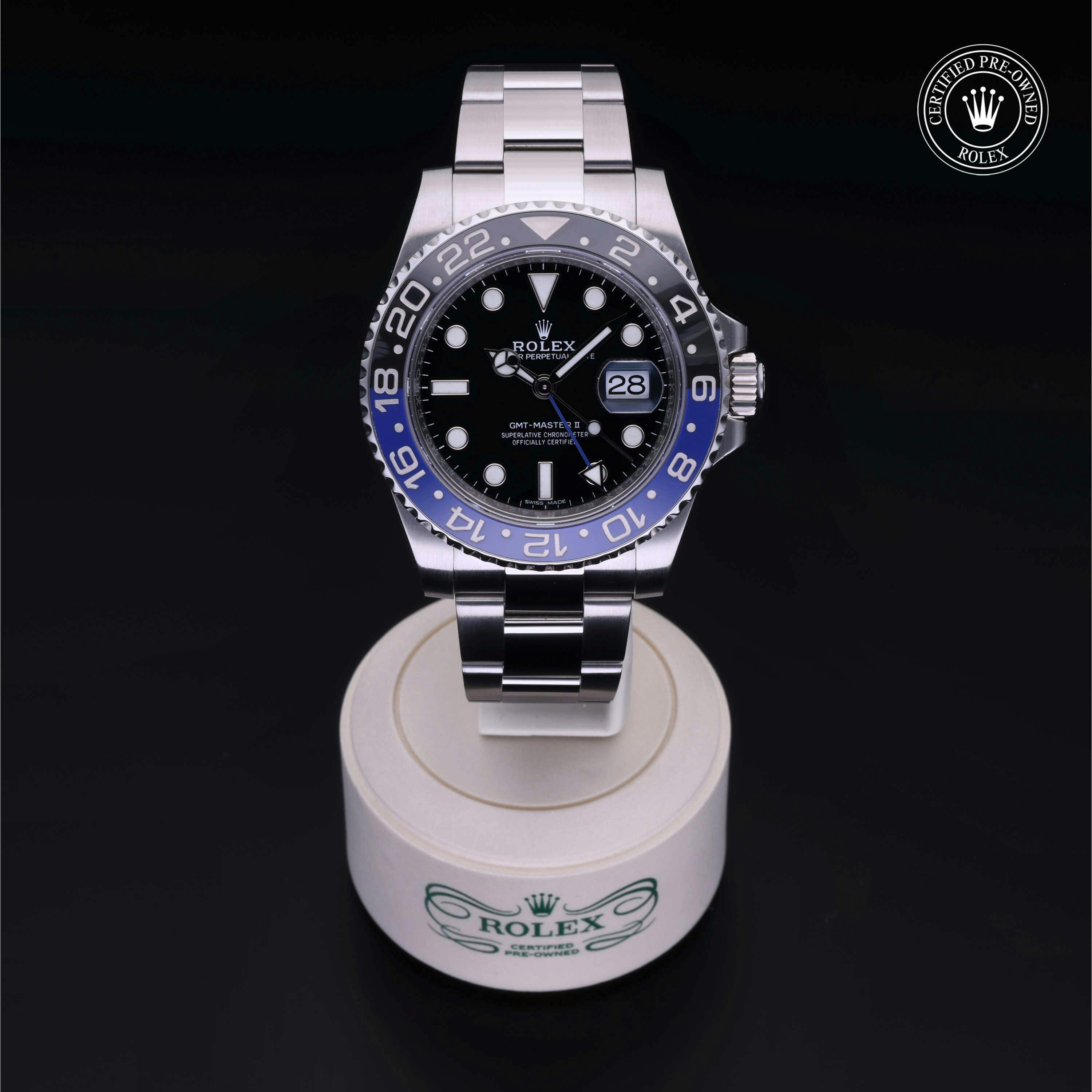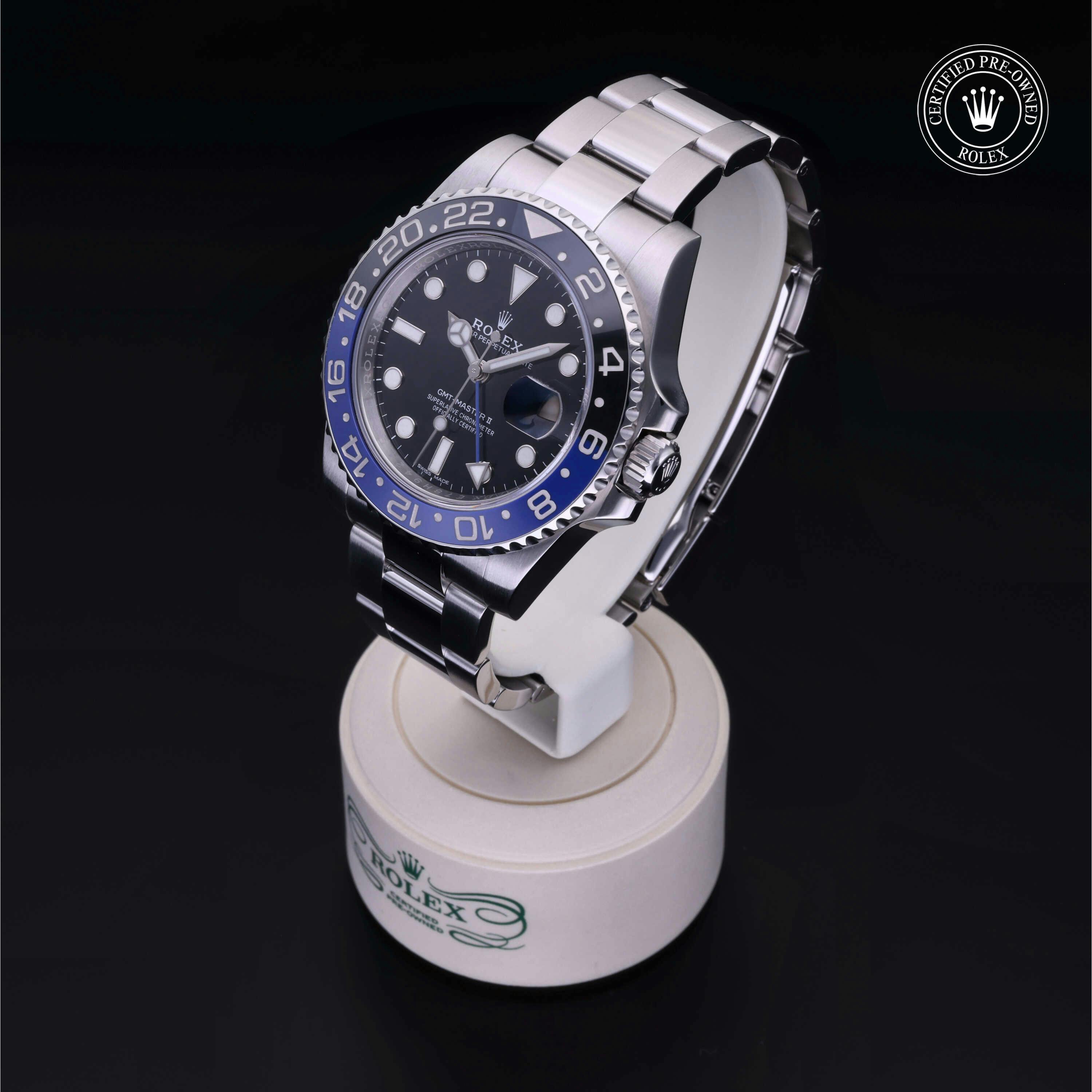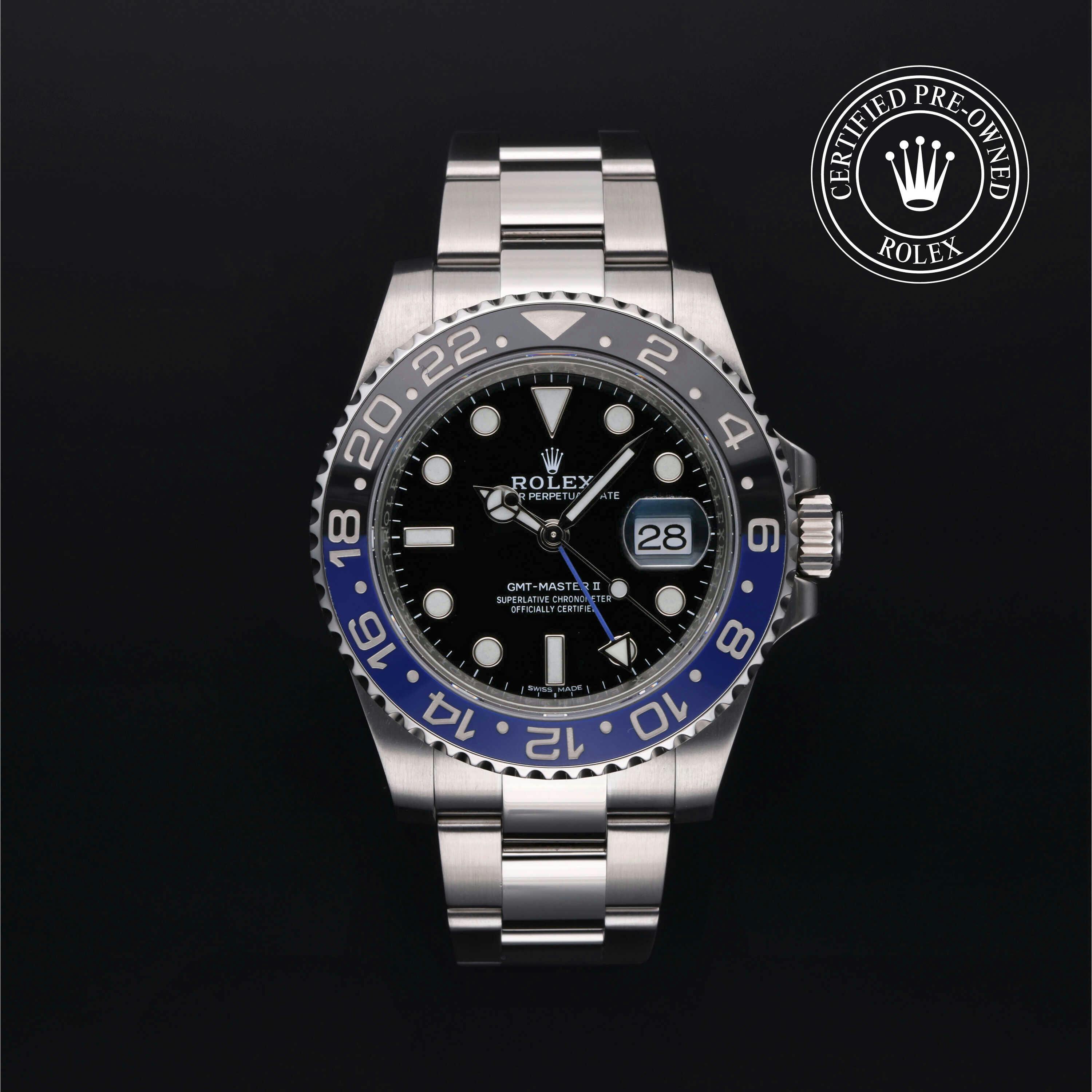 Rolex Certified Pre-Owned GMT-Master II (116710BLNR) self - winding automatic watch, features a 40mm stainless steel case with a black and blue cerachrom bezel surrounding a black dial on a stainless steel oyster bracelet. Functions include hours, minutes, seconds, date and gmt/world time. This watch has received Rolex-authorized service and certification. It does not come with the original box or papers, but includes a custom Rolex Certified Pre-Owned hang tag, travel pouch and RCPO international warranty card.