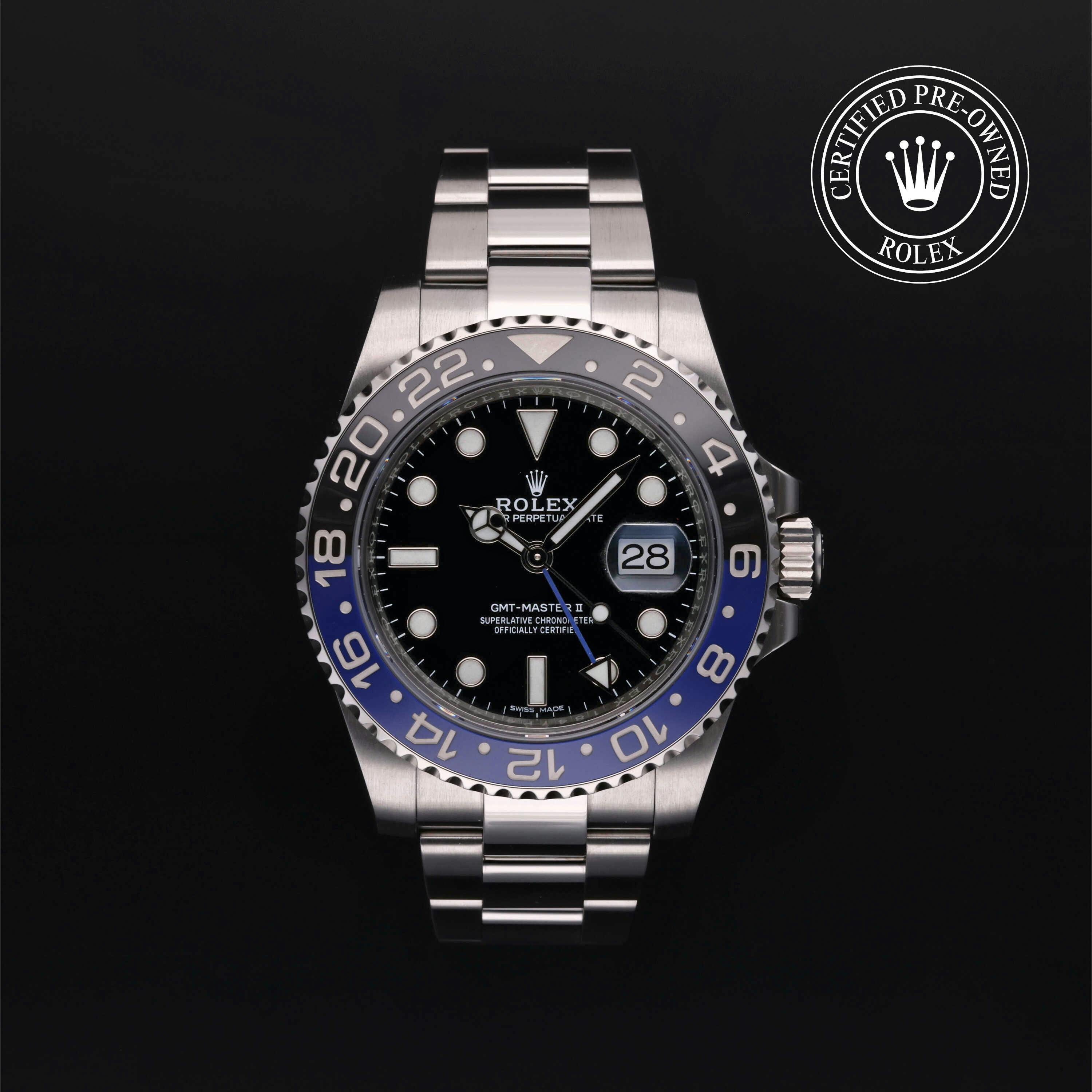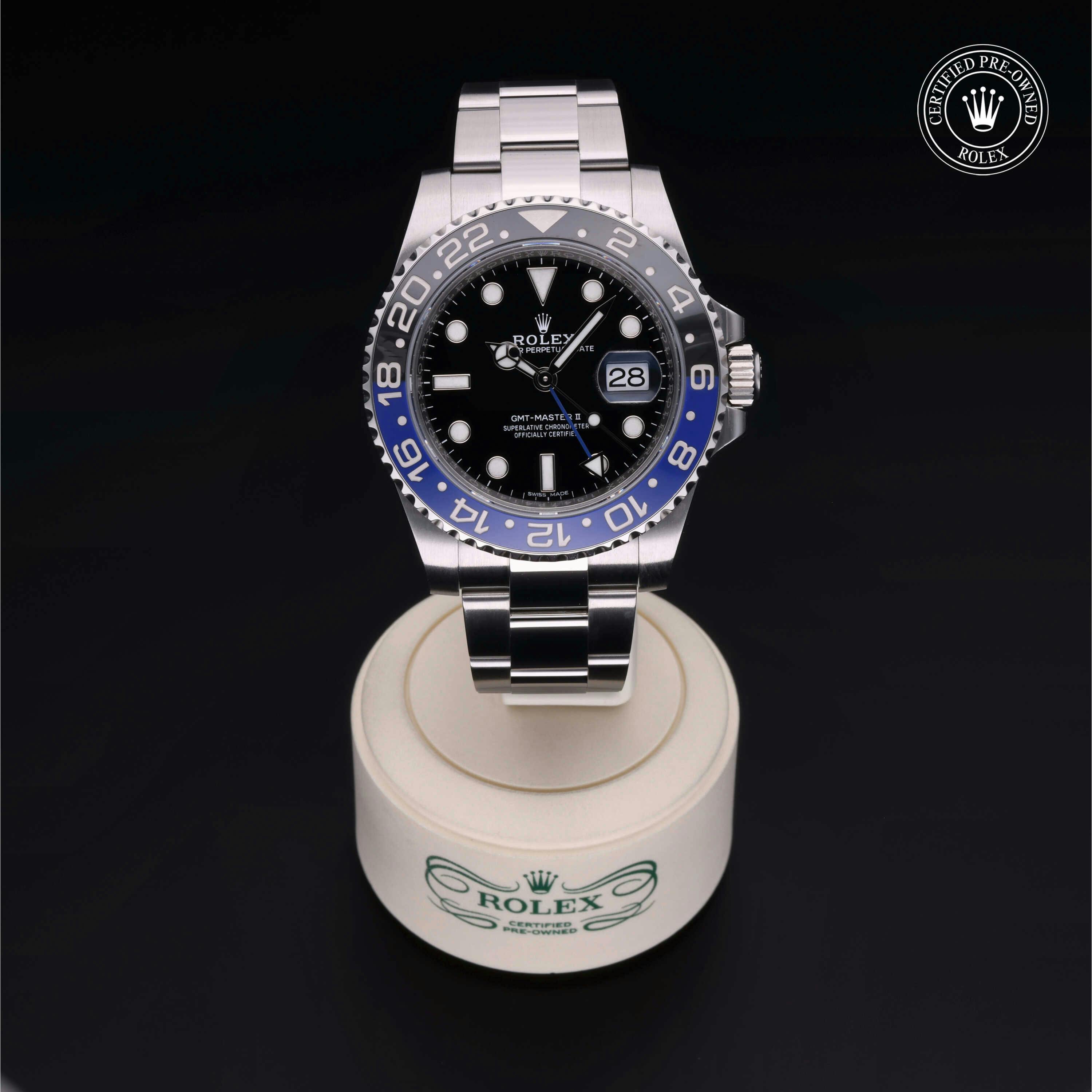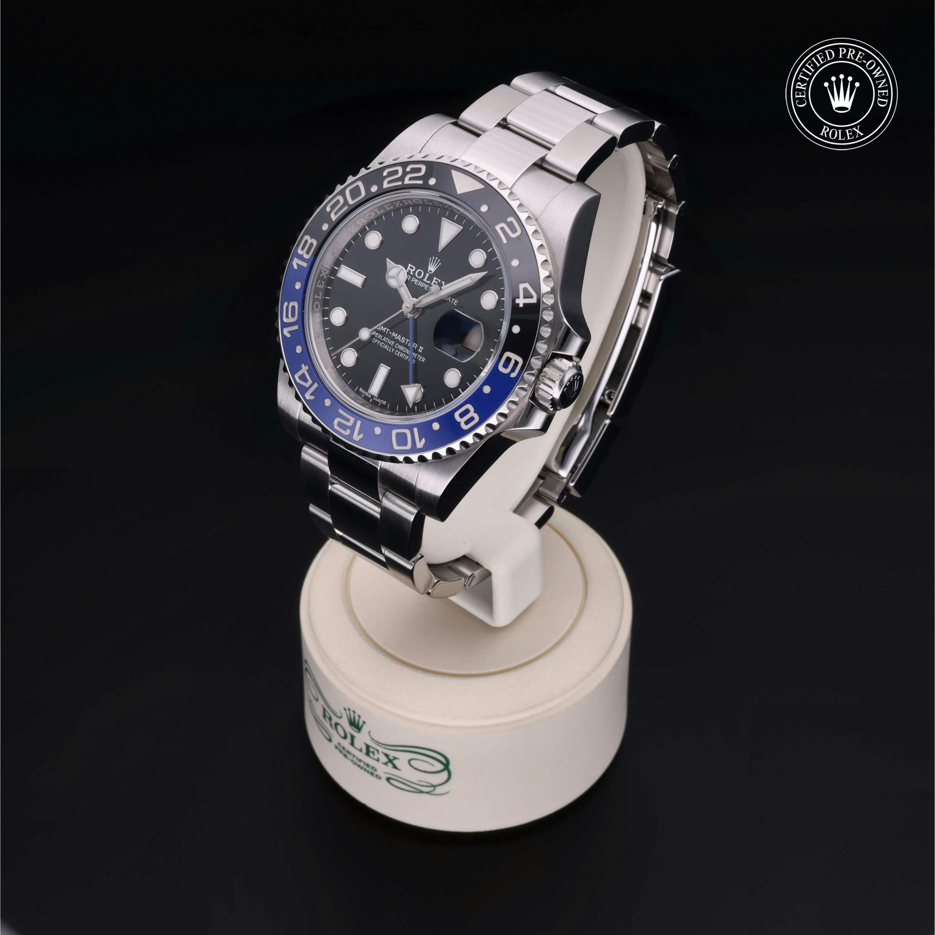 Rolex Certified Pre-Owned GMT-Master II (116710BLNR) self - winding automatic watch, features a 40mm stainless steel case with a black and blue cerachrom bezel surrounding a black dial on a stainless steel oyster bracelet. Functions include hours, minutes, seconds, date and gmt/world time. This watch has received Rolex-authorized service and certification. It comes with the original box and papers, and includes a custom Rolex Certified Pre-Owned hang tag, travel pouch and RCPO international warranty card.