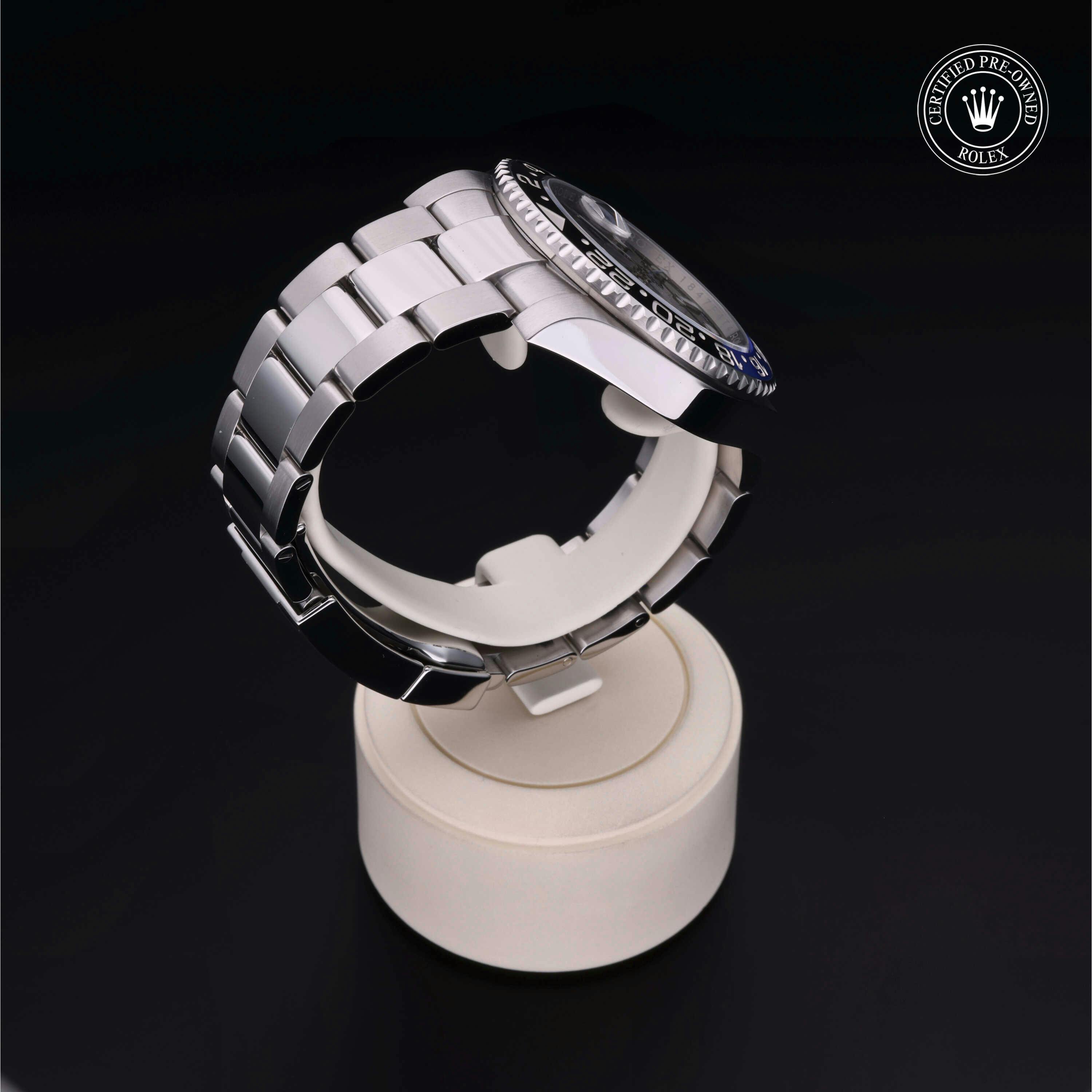 Rolex Certified Pre-Owned GMT-Master II (116710BLNR) self - winding automatic watch, features a 40mm stainless steel case with a black and blue cerachrom bezel surrounding a black dial on a stainless steel oyster bracelet. Functions include hours, minutes, seconds, date and gmt/world time. This watch has received Rolex-authorized service and certification. It comes with the original box and papers, and includes a custom Rolex Certified Pre-Owned hang tag, travel pouch and RCPO international warranty card.