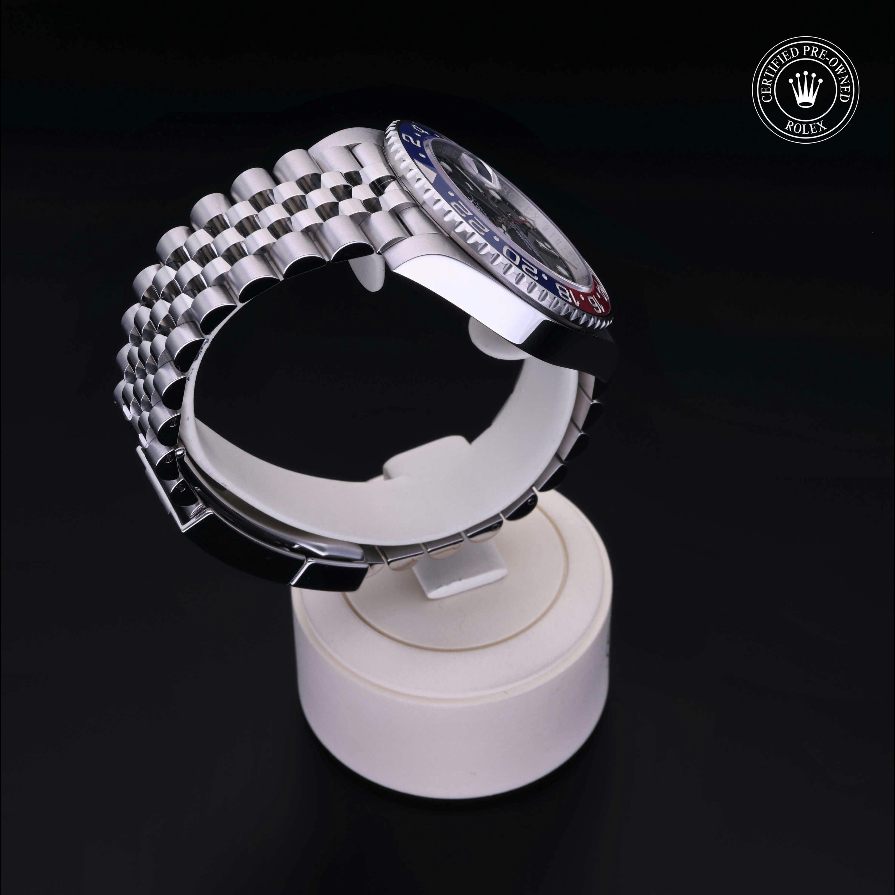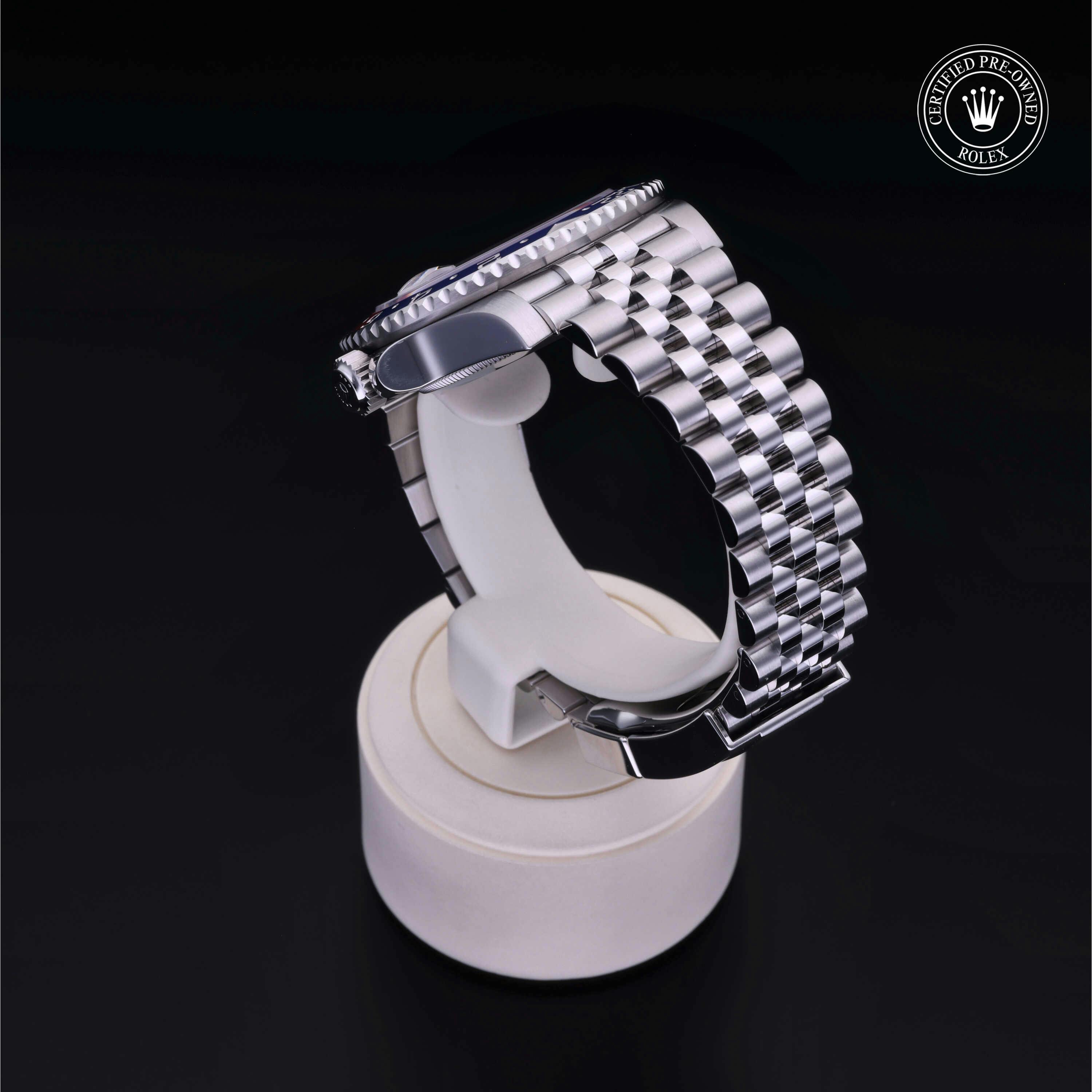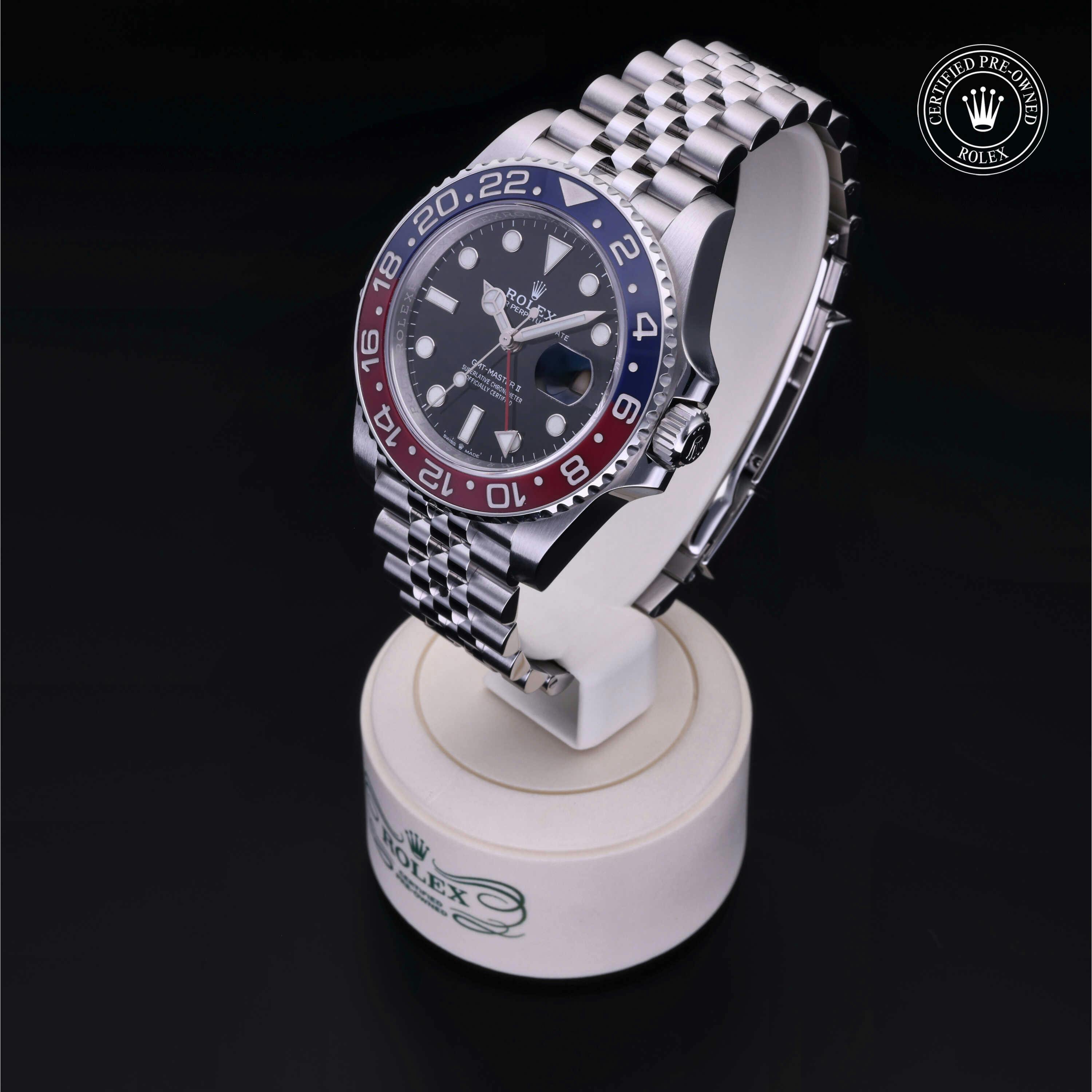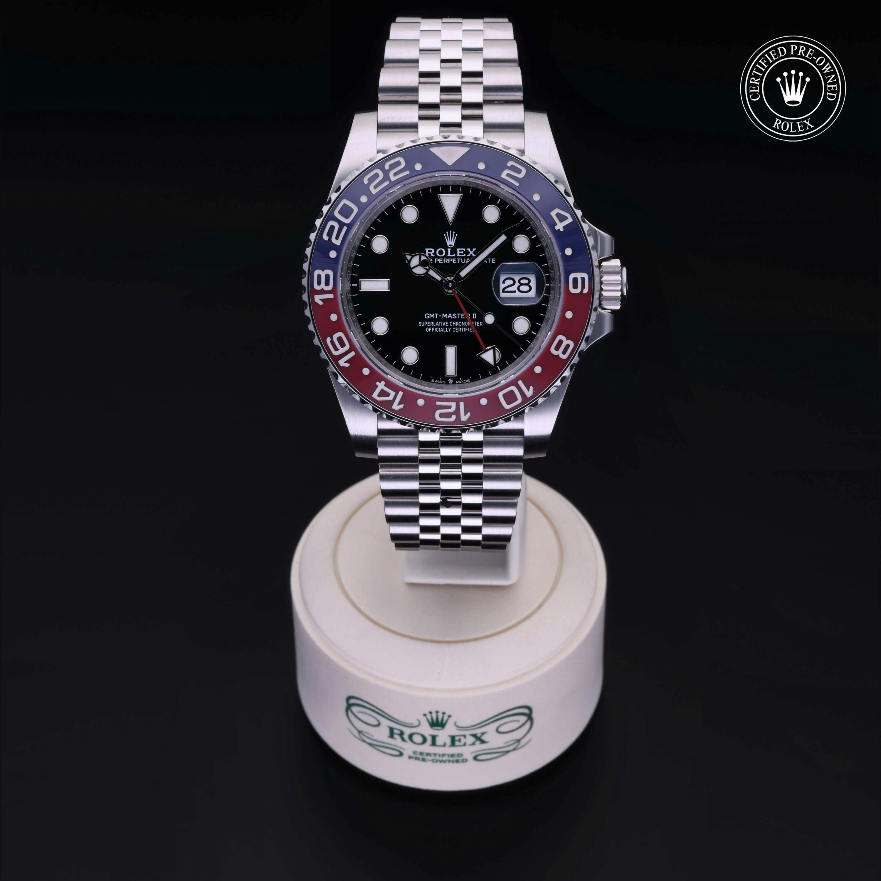 Rolex Certified Pre-Owned GMT-Master II (126710BLRO) self - winding automatic watch, features a 40mm stainless steel case with a blue and red cerachrom bezel insert surrounding a black dial on a stainless steel jubilee bracelet. Functions include hours, minutes, seconds, date and gmt/world time. This watch has received Rolex-authorized service and certification. It comes with the original box and papers, and includes a custom Rolex Certified Pre-Owned hang tag, travel pouch and RCPO international warranty card.