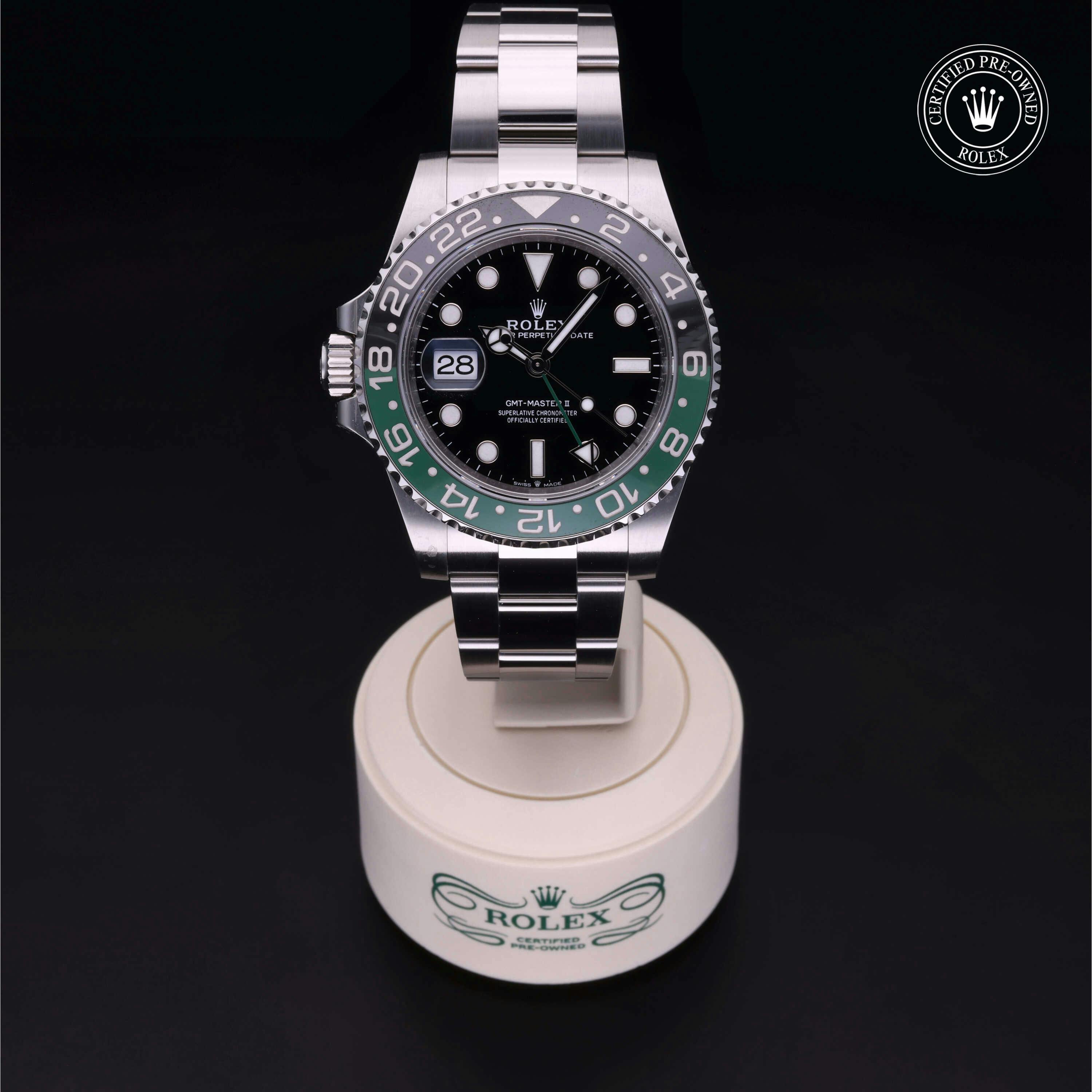 Rolex Certified Pre-Owned GMT-Master II Left Hand Crown (126720VTNR) self - winding automatic watch, features a 40mm stainless steel case with a black and green cerachrom bezel surrounding a black dial on a stainless steel oyster bracelet. Functions include hours, minutes, seconds, date and gmt/world time. This watch has received Rolex-authorized service and certification. It comes with the original box and papers, and includes a custom Rolex Certified Pre-Owned hang tag, travel pouch and RCPO international warranty card.