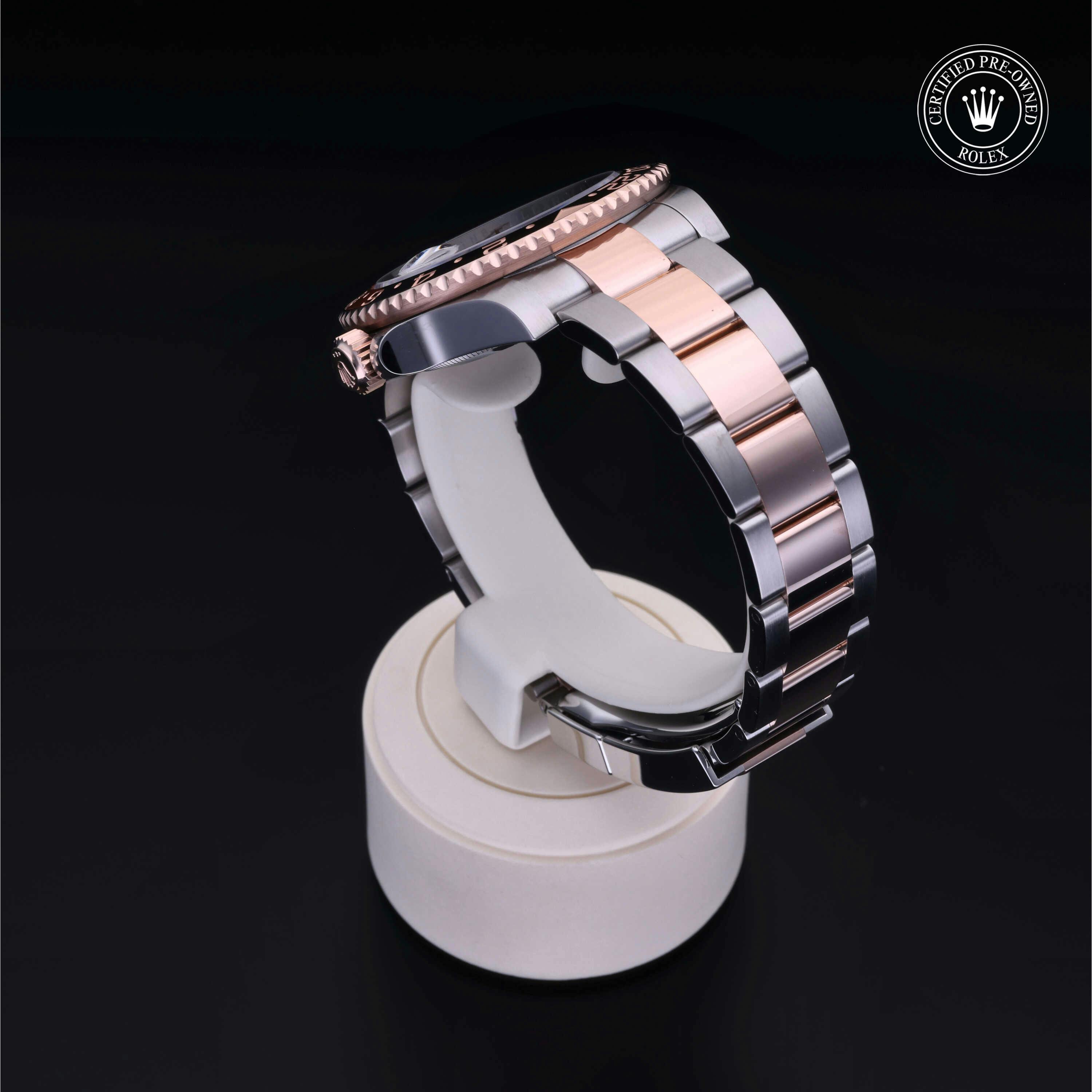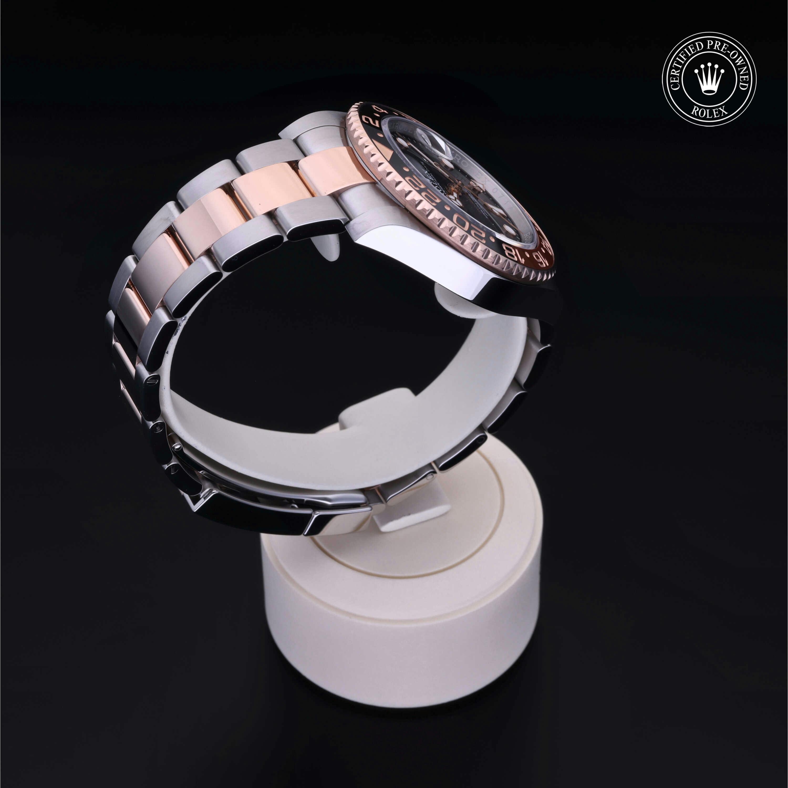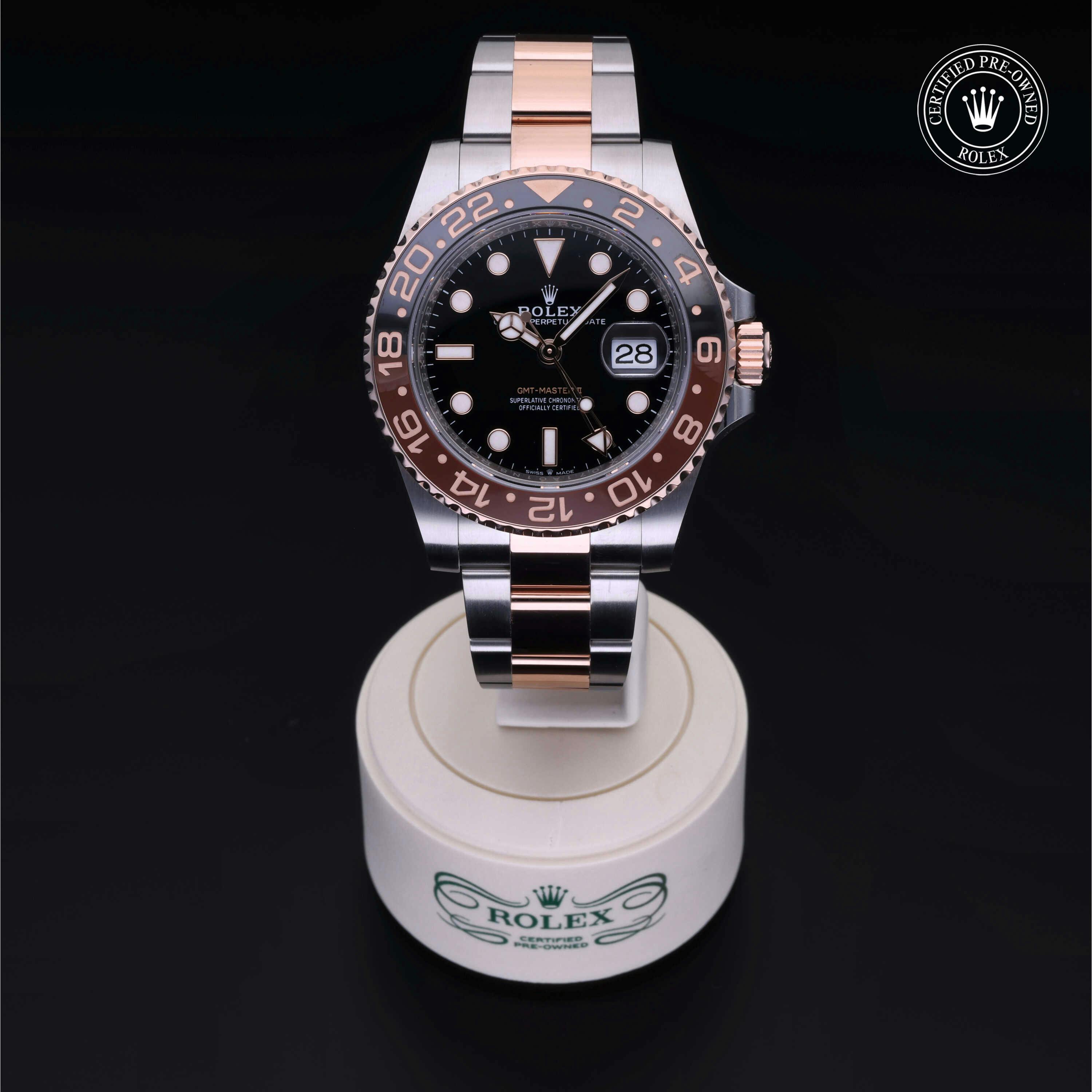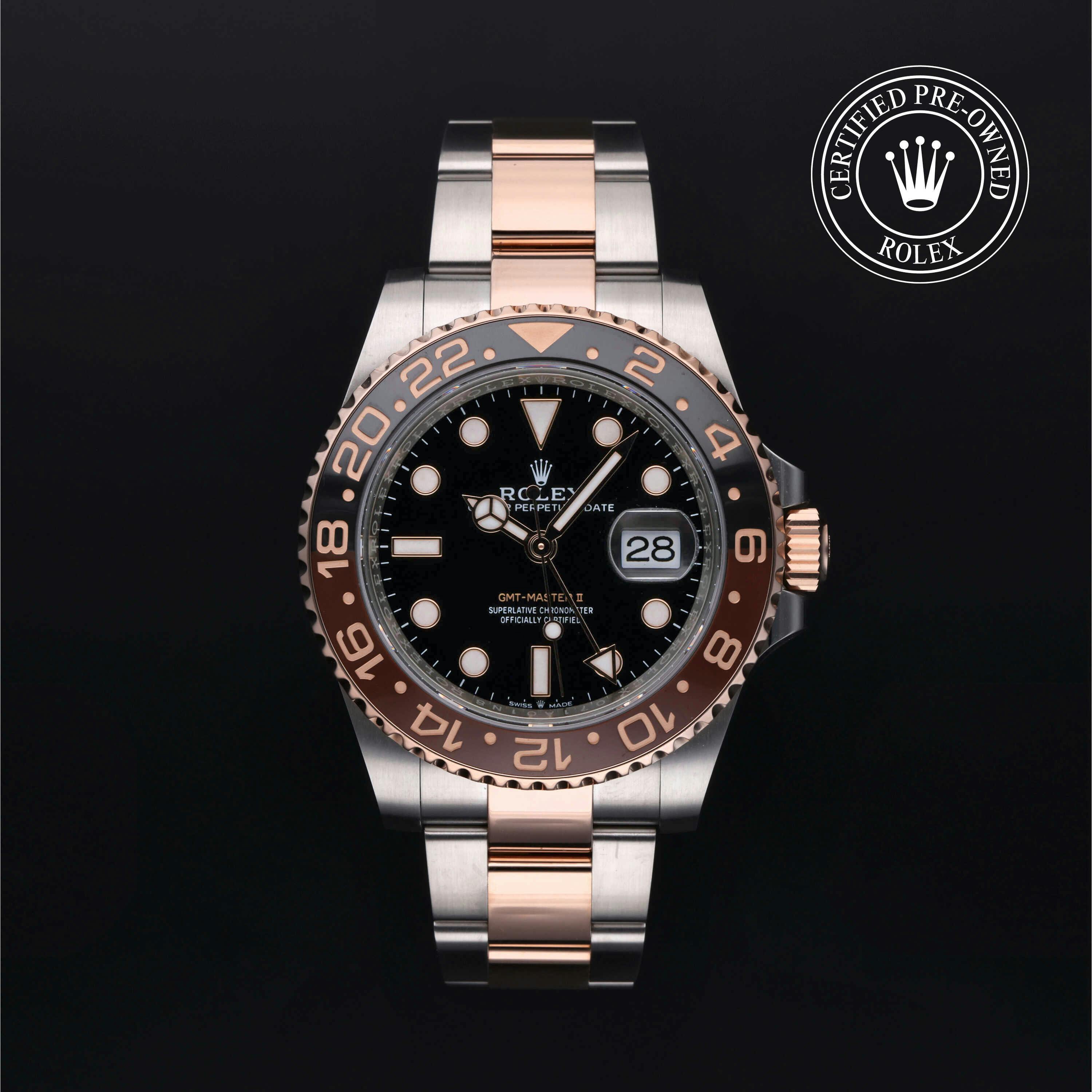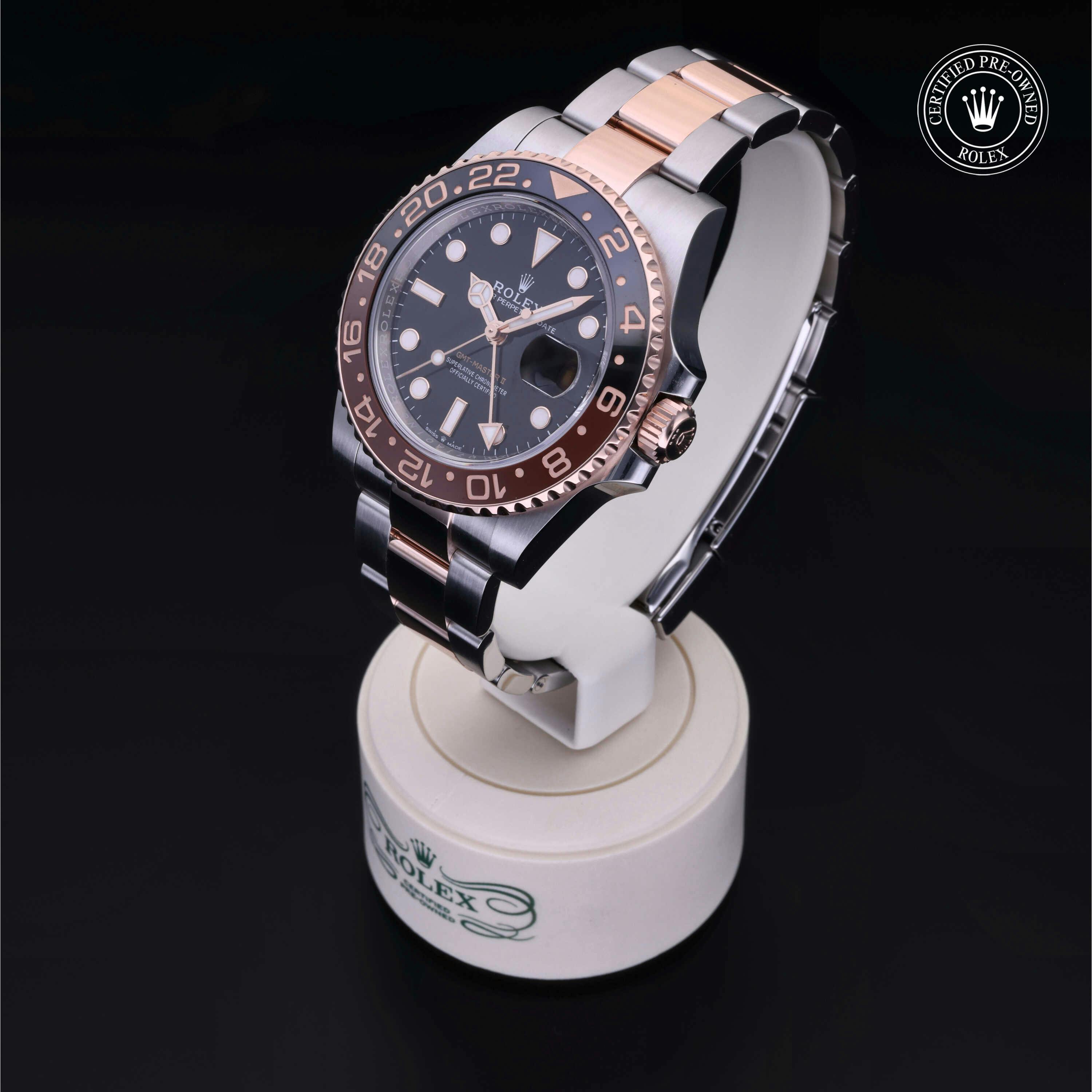 Rolex Certified Pre-Owned GMT-Master II (126711CHNR) self - winding automatic watch, features a 40mm stainless steel case with an 18k rose gold and black and brown cerachrom bezel surrounding a black dial on a stainless steel and 18k rose gold oyster bracelet. Functions include hours, minutes, seconds, date and GMT/world time. This watch has received Rolex-authorized service and certification. It comes with the original box and papers, and includes a custom Rolex Certified Pre-Owned hang tag, travel pouch and RCPO international warranty card.