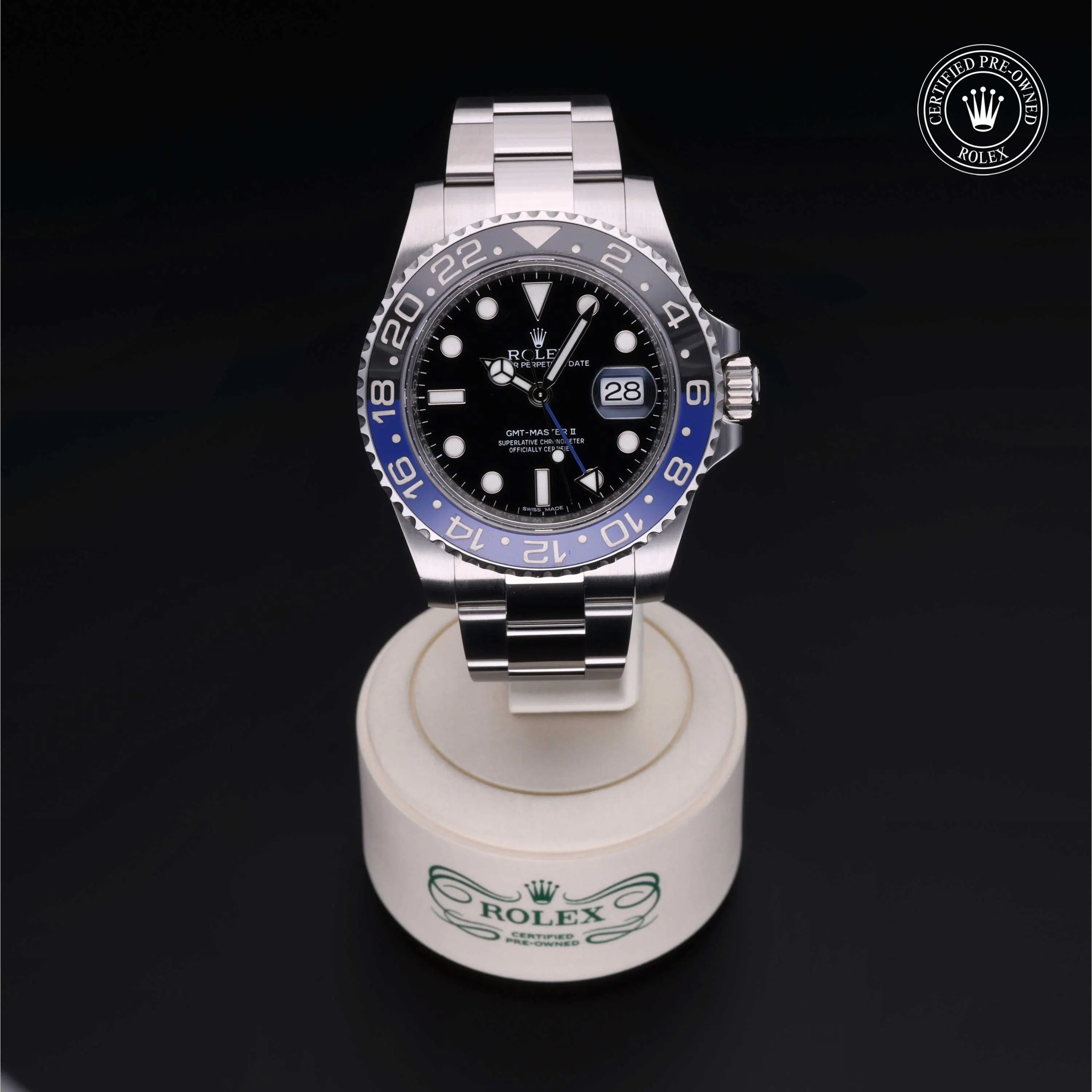 Rolex Certified Pre-Owned GMT-Master II (116710BLNR) self - winding automatic watch, features a 40mm stainless steel case and bidirectional rotating bezel with a black and blue cerachrom 24-hour insert, surrounding a black dial. The watch is secured on a stainless steel Oyster bracelet complete with a folding buckle. Functions include hours, minutes, seconds, date and gmt/world time. This watch has received Rolex-authorized service and certification. It does not come with the original box or papers, but includes a custom Rolex Certified Pre-Owned hang tag, travel pouch and RCPO international warranty card.