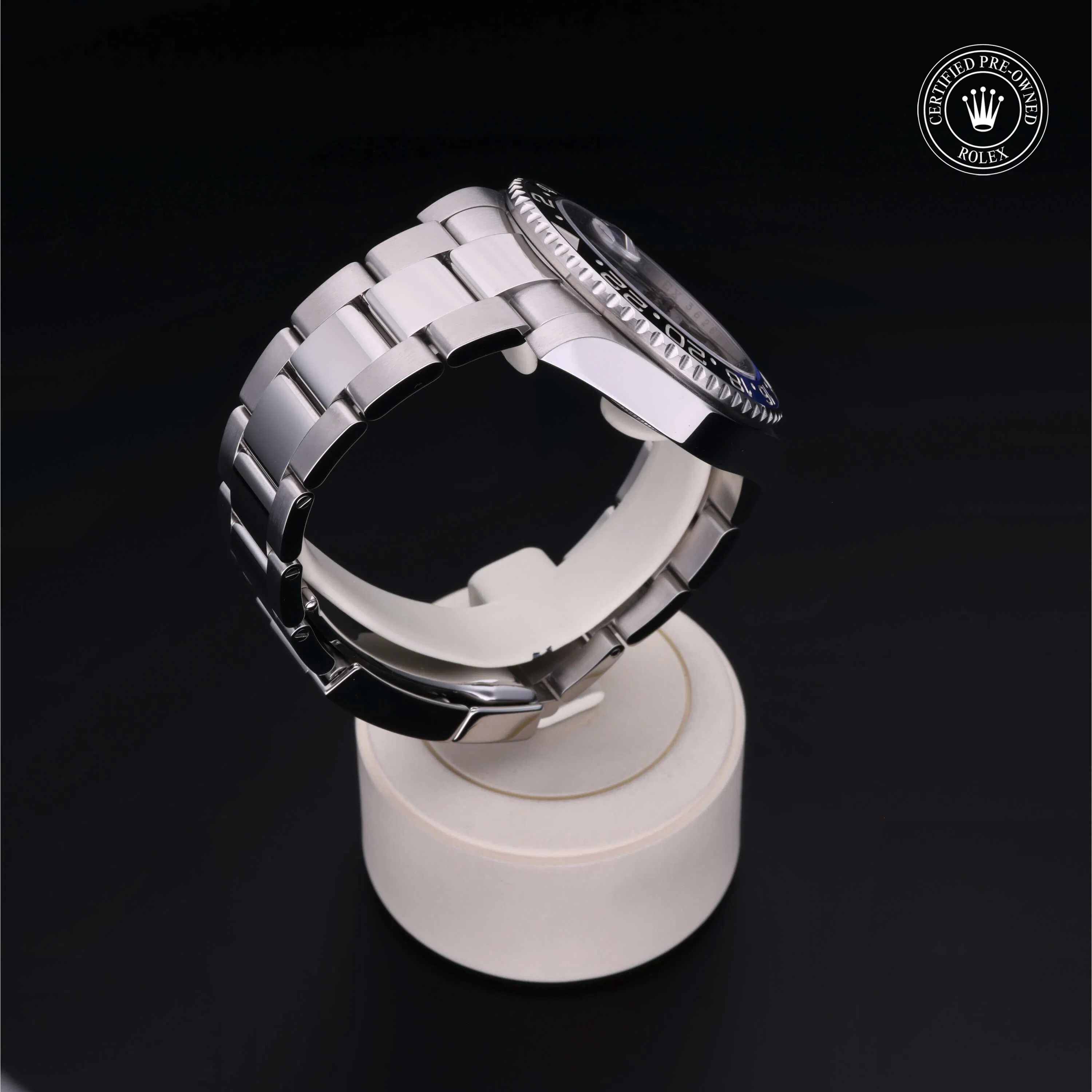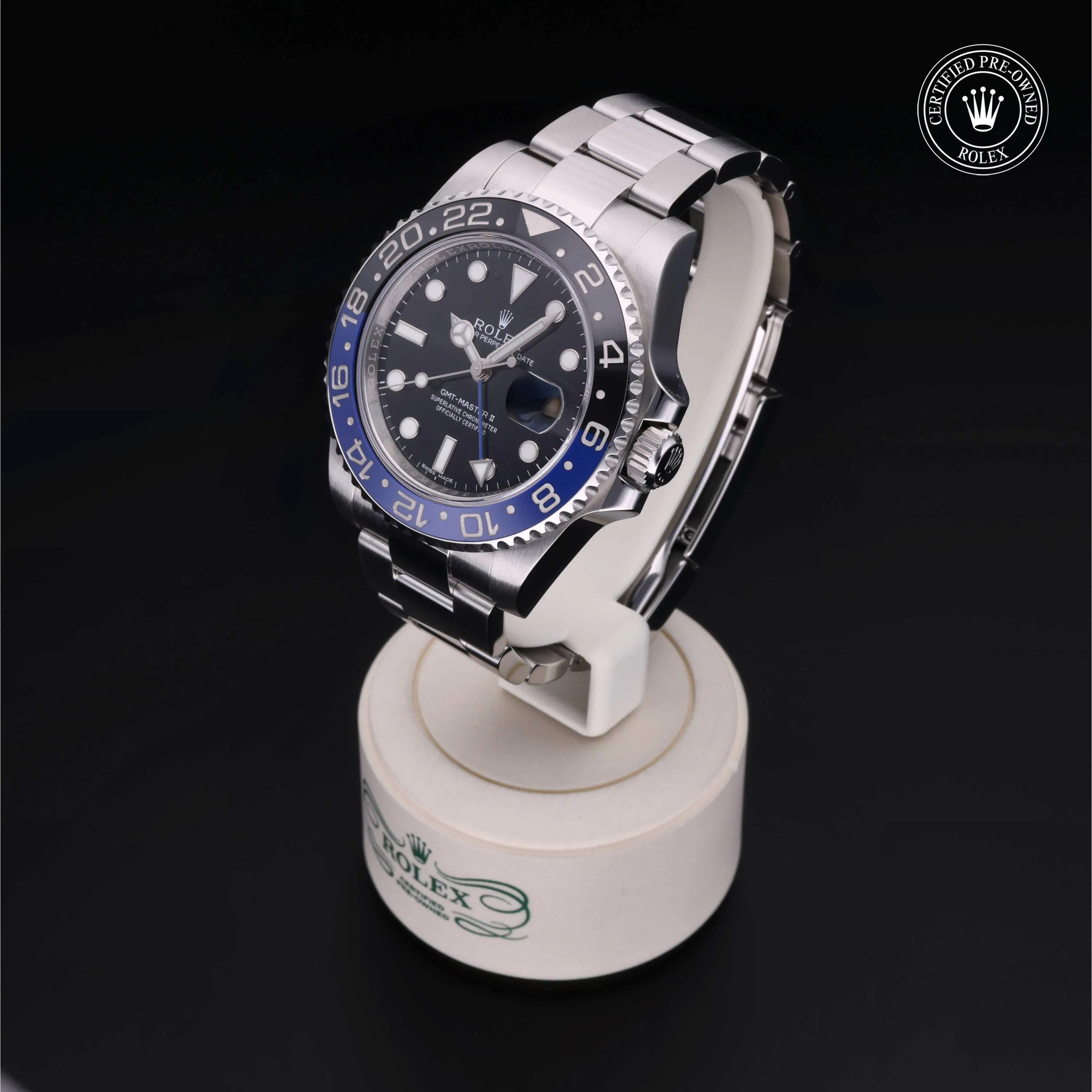 Rolex Certified Pre-Owned GMT-Master II (116710BLNR) self - winding automatic watch, features a 40mm stainless steel case and bidirectional rotating bezel with a black and blue cerachrom 24-hour insert, surrounding a black dial. The watch is secured on a stainless steel Oyster bracelet complete with a folding buckle. Functions include hours, minutes, seconds, date and gmt/world time. This watch has received Rolex-authorized service and certification. It does not come with the original box or papers, but includes a custom Rolex Certified Pre-Owned hang tag, travel pouch and RCPO international warranty card.