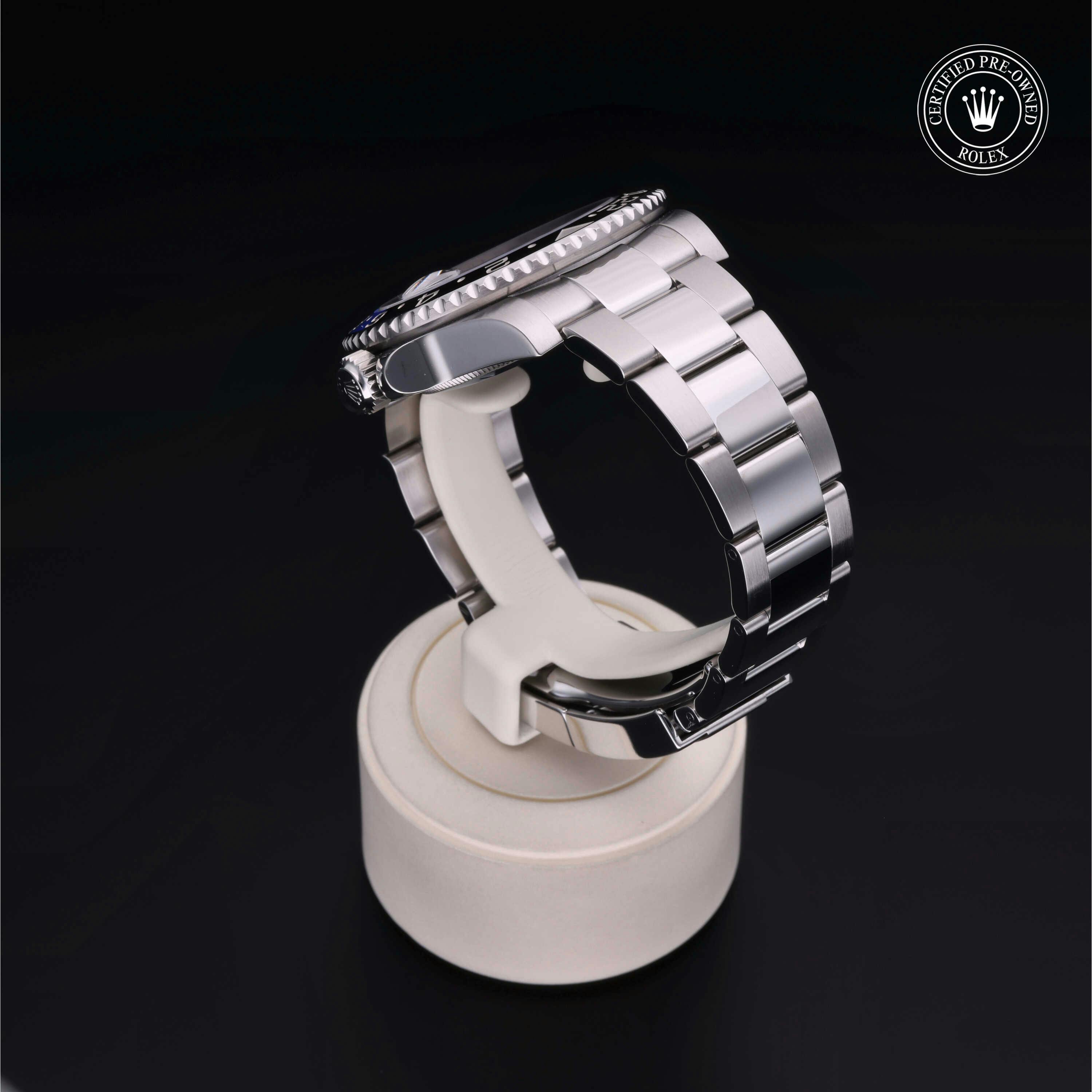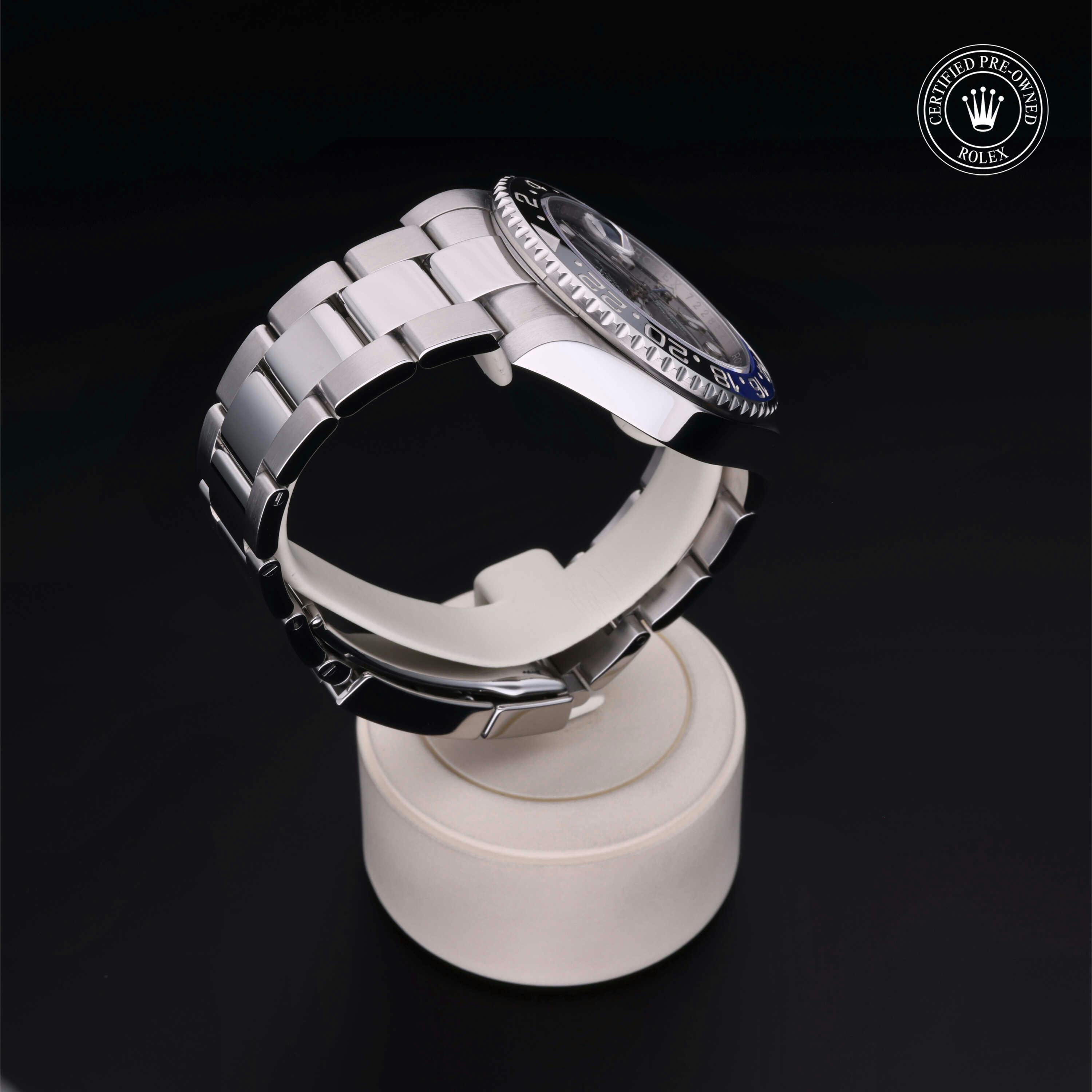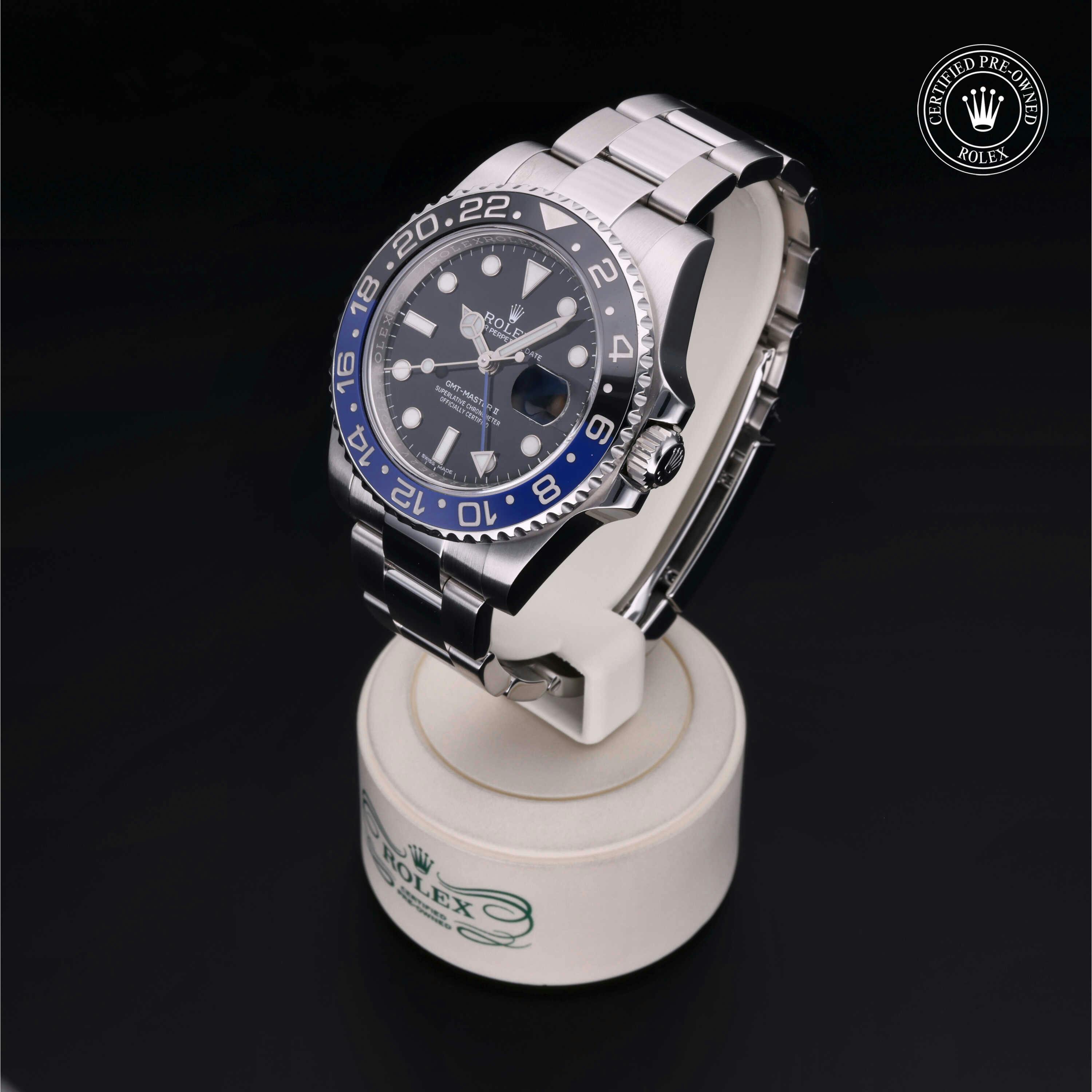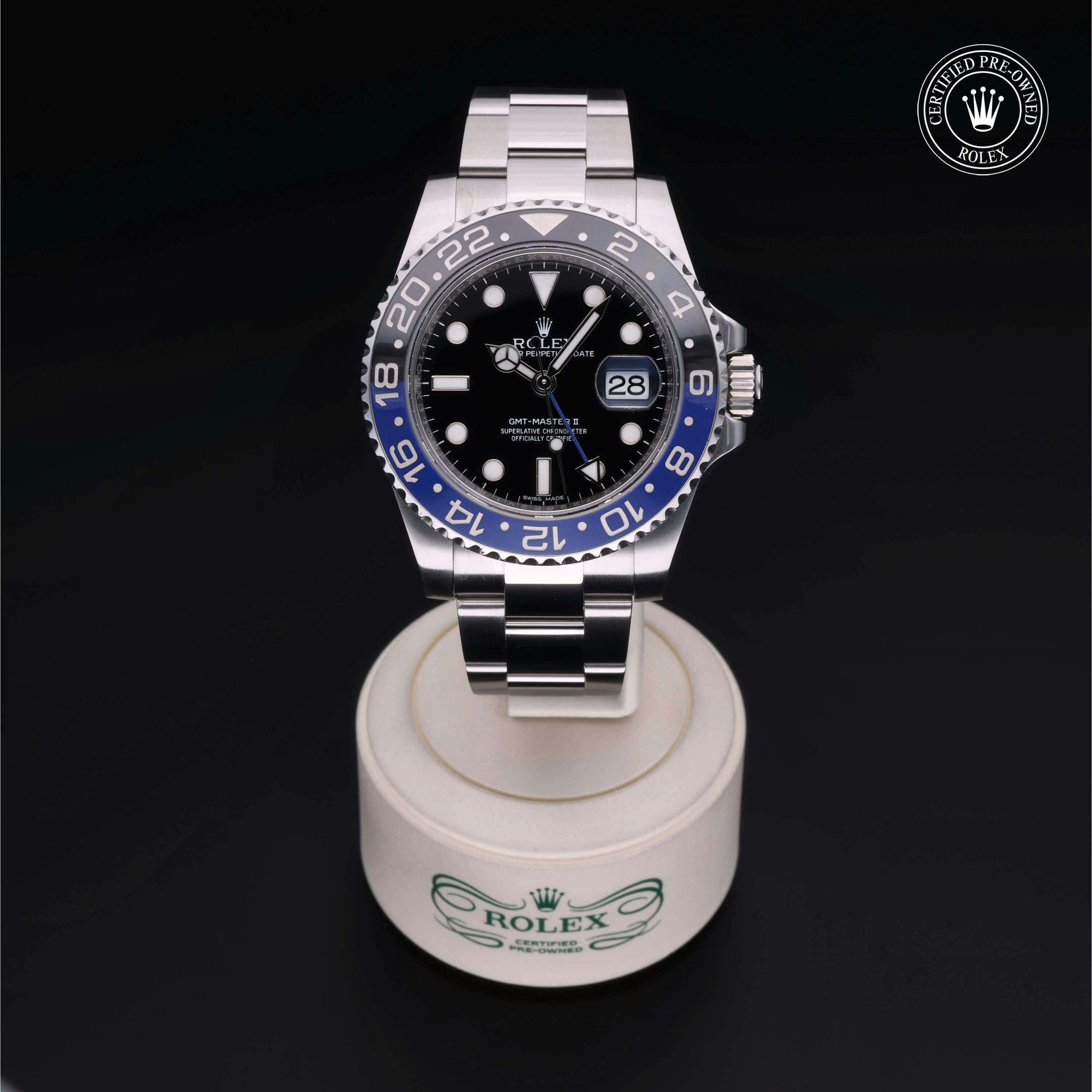 Rolex Certified Pre-Owned GMT-Master II (116710BLNR) self - winding automatic watch, features a 40mm stainless steel case with a bidirectional rotating bezel featuring black and blue cerachrom 24-hour insert, surrounding a black dial. The watch is secured on a stainless steel Oyster bracelet complete with a folding buckle. Functions include hours, minutes, seconds, date and gmt/world time. This watch has received Rolex-authorized service and certification. It comes with the original papers, and includes a custom Rolex Certified Pre-Owned hang tag, travel pouch and RCPO international warranty card.