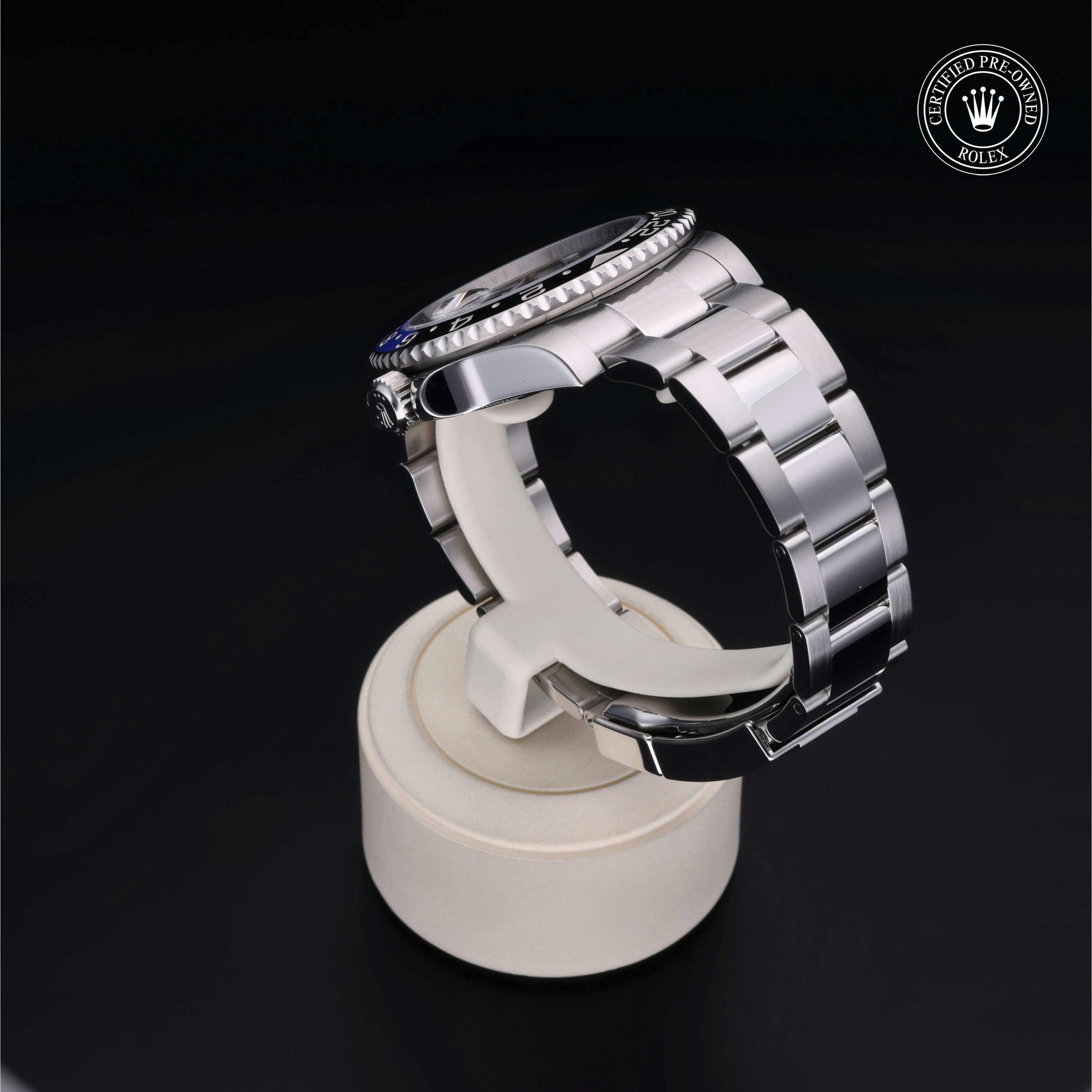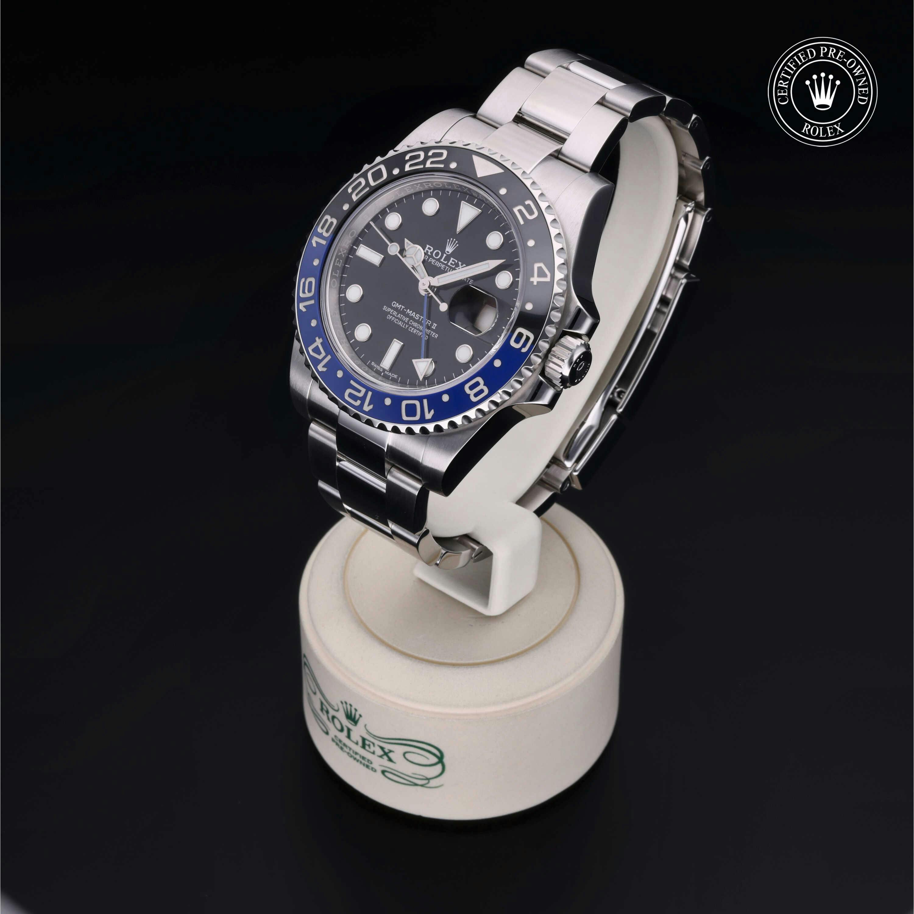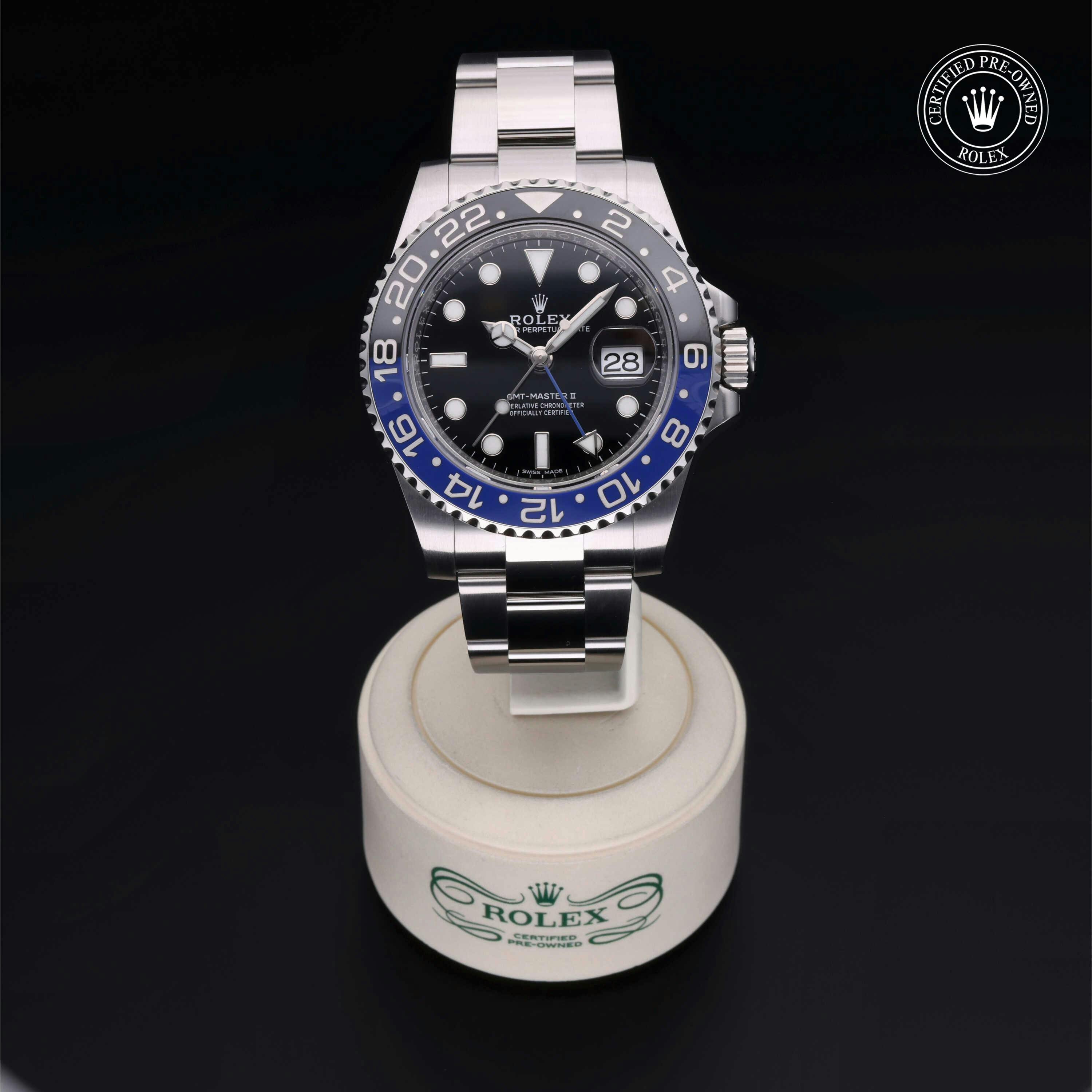Rolex Certified Pre-Owned GMT-Master II (116710BLNR) self - winding automatic watch, features a 40mm stainless steel case with a bidirectional rotating bezel featuring black and blue cerachrom 24-hour insert, surrounding a black dial. The watch is secured on a stainless steel Oyster bracelet complete with a folding buckle. Functions include hours, minutes, seconds, date and gmt/world time. This watch has received Rolex-authorized service and certification. It does not come with the original box or papers, but includes a custom Rolex Certified Pre-Owned hang tag, travel pouch and RCPO international warranty card.