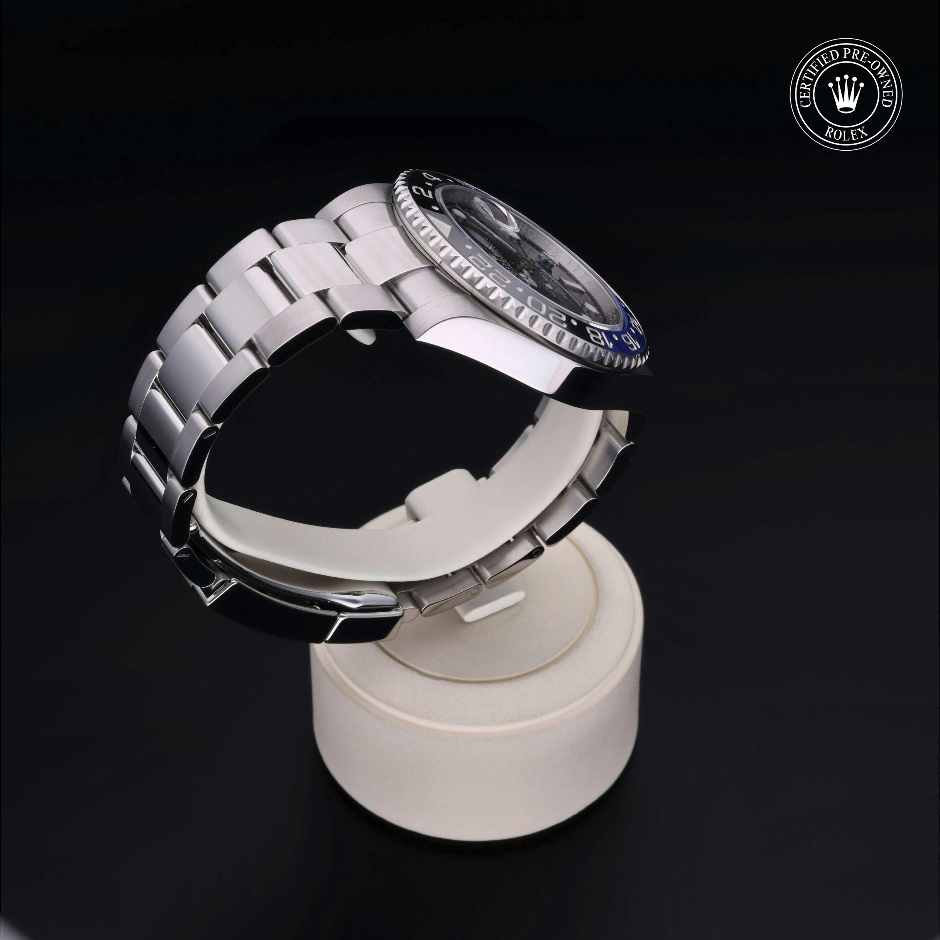 Rolex Certified Pre-Owned GMT-Master II (116710BLNR) self - winding automatic watch, features a 40mm stainless steel case with a bidirectional rotating bezel featuring black and blue cerachrom 24-hour insert, surrounding a black dial. The watch is secured on a stainless steel Oyster bracelet complete with a folding buckle. Functions include hours, minutes, seconds, date and gmt/world time. This watch has received Rolex-authorized service and certification. It does not come with the original box or papers, but includes a custom Rolex Certified Pre-Owned hang tag, travel pouch and RCPO international warranty card.