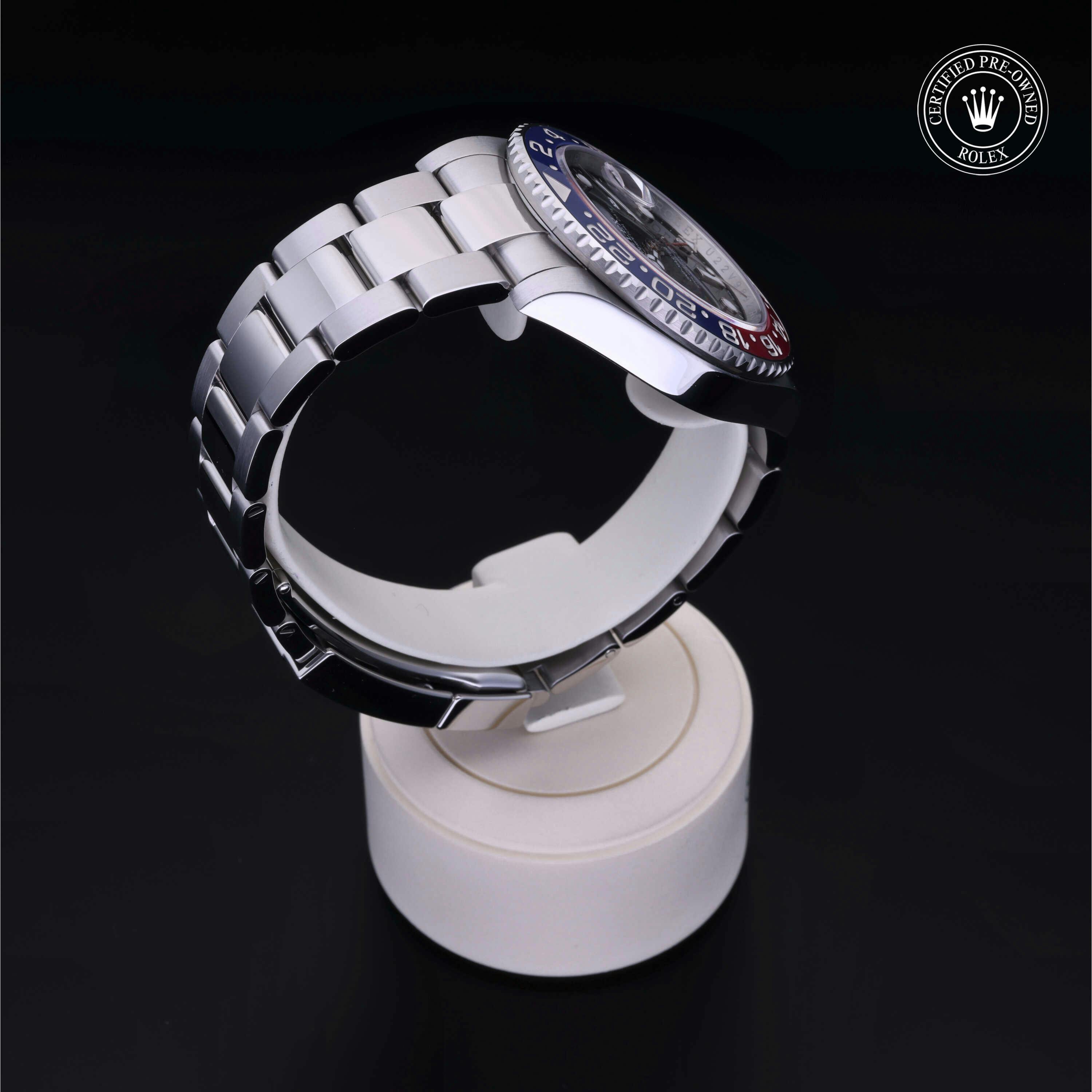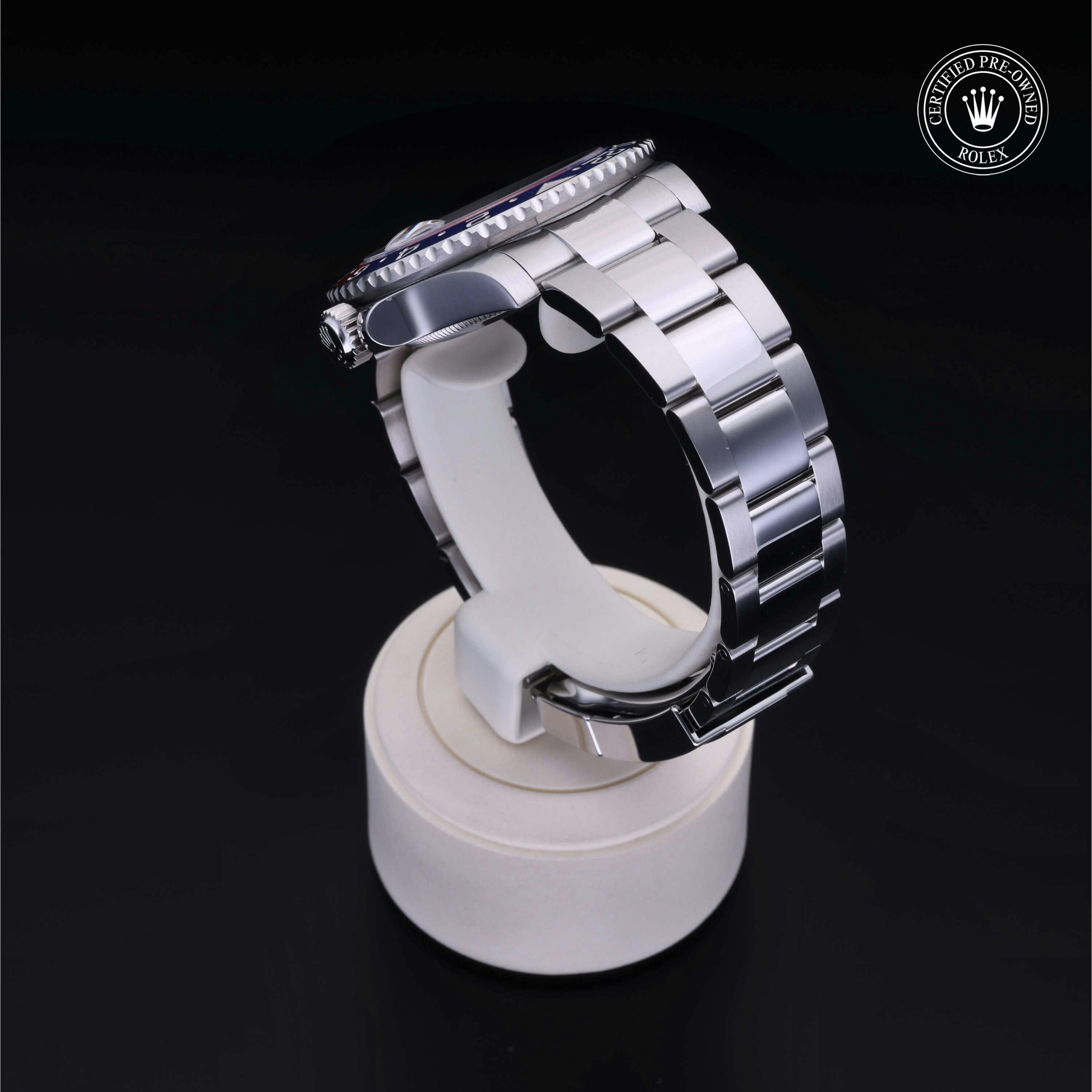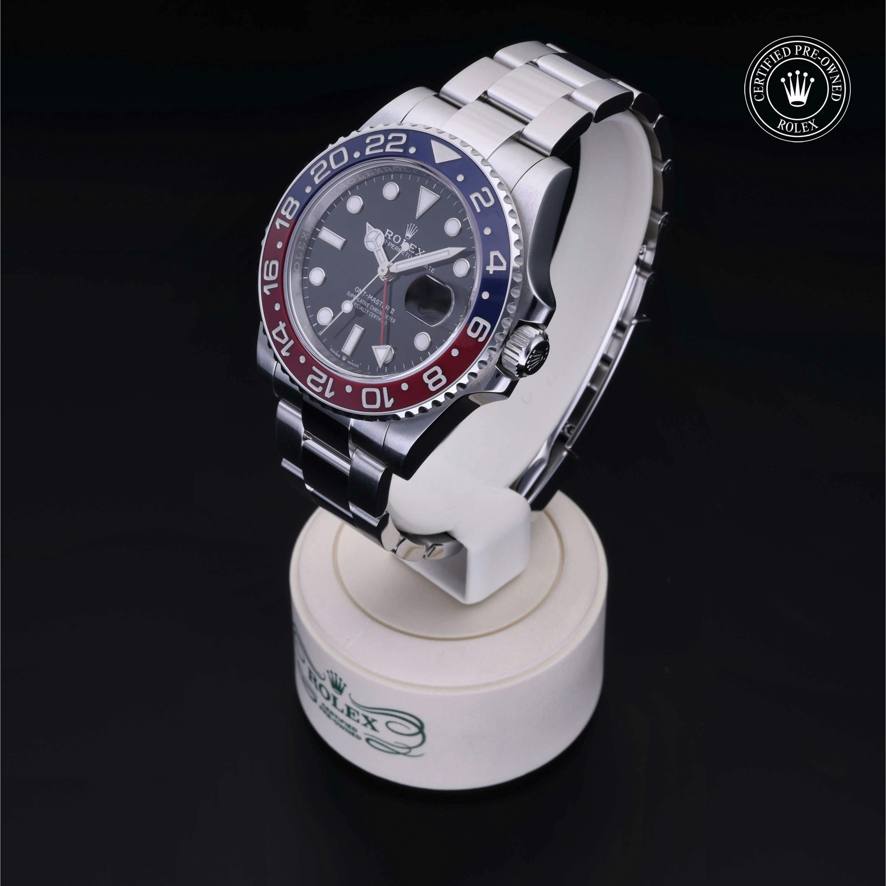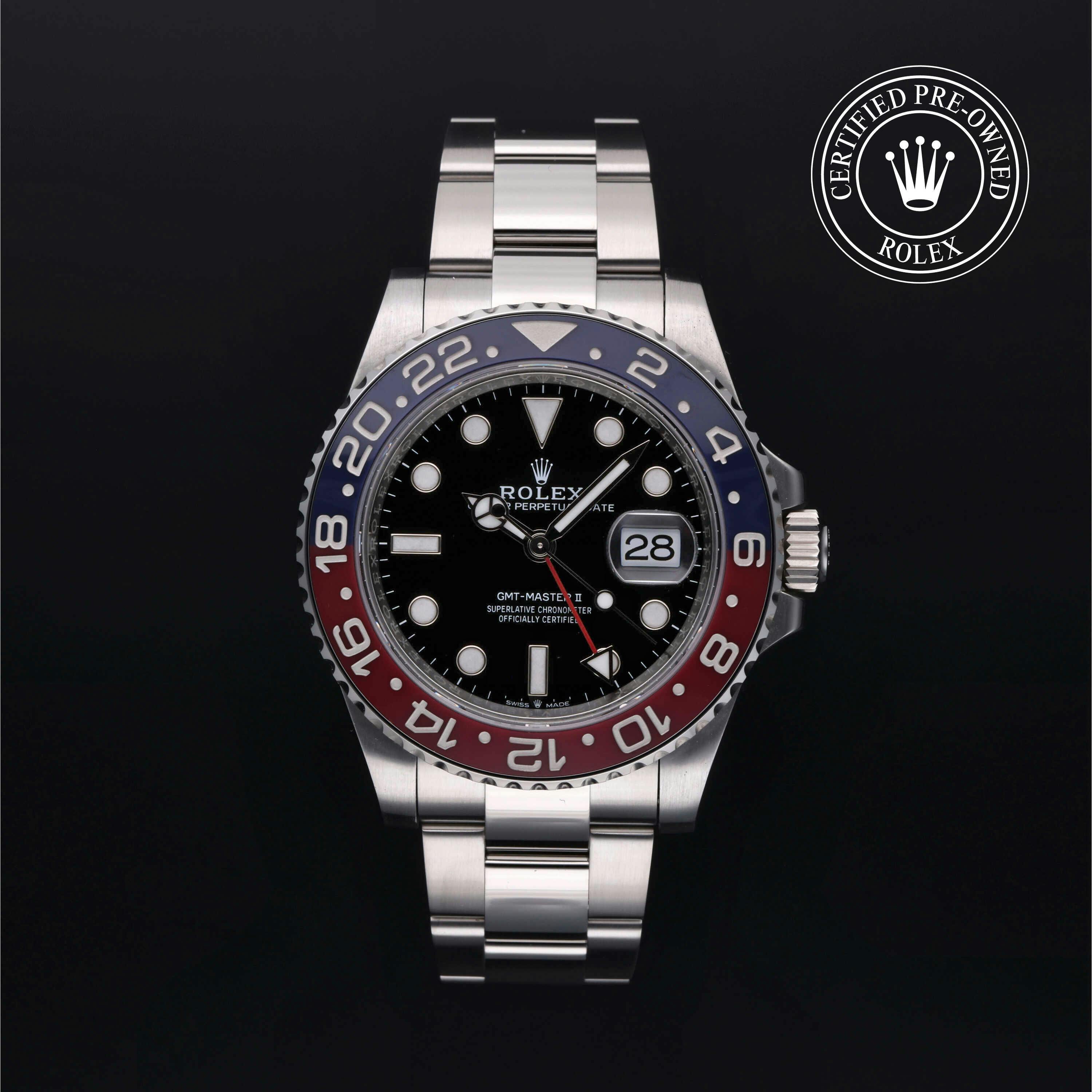 Rolex Certified Pre-Owned GMT-Master II (126710BLRO) self - winding automatic watch, features a 40mm stainless steel case with a blue and red cerachrom bezel surrounding a black dial on a stainless steel oyster bracelet. Functions include hours, minutes, seconds, date and gmt/world time. This watch has received Rolex-authorized service and certification. It does not come with the original box or papers, but includes a custom Rolex Certified Pre-Owned hang tag, travel pouch and RCPO international warranty card.