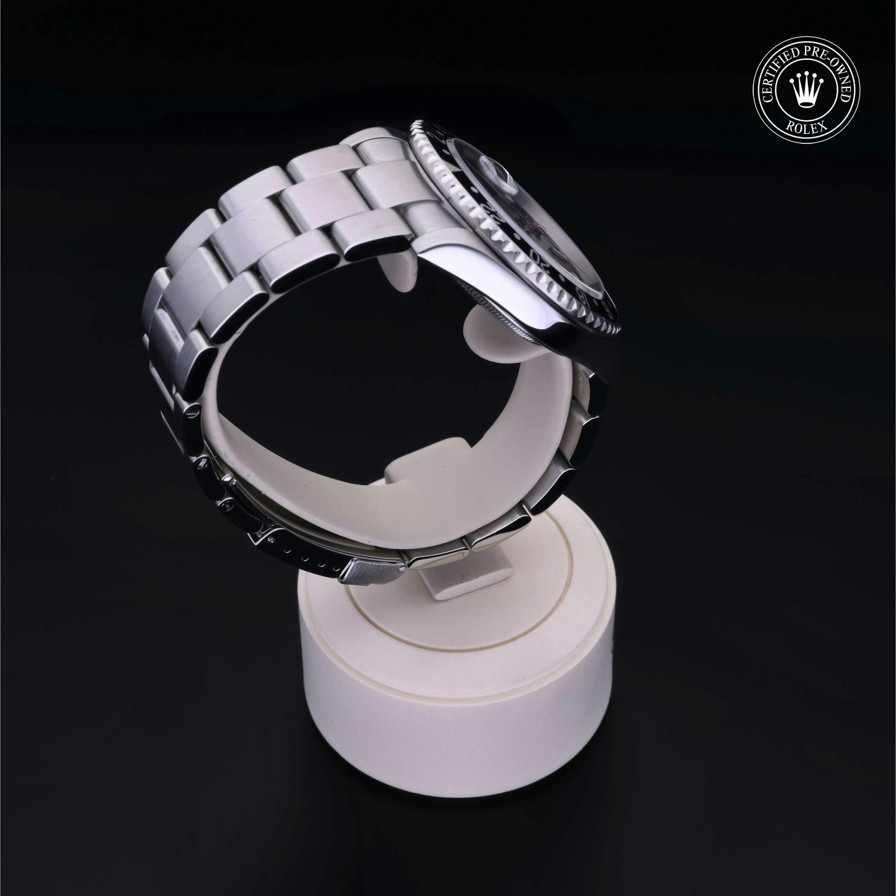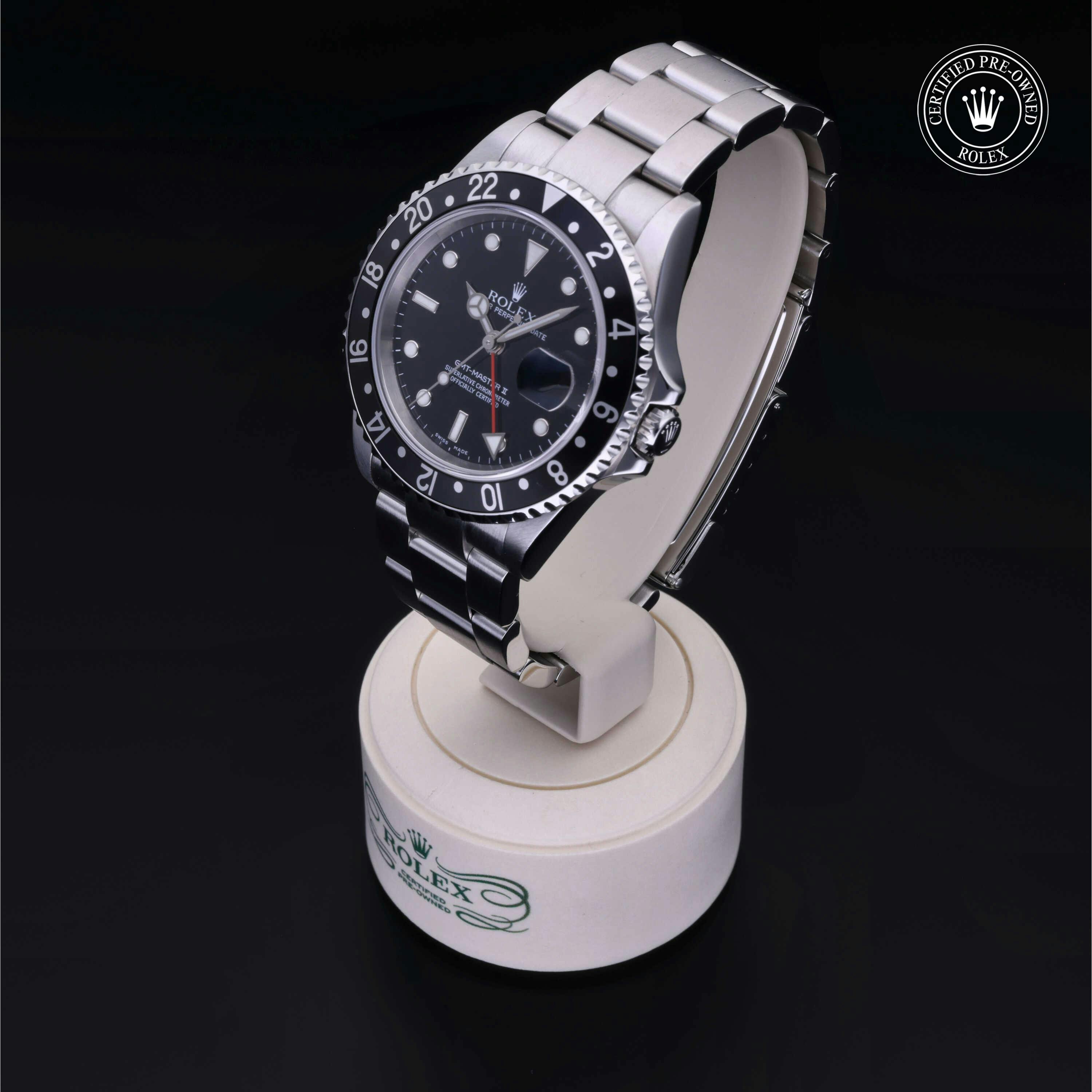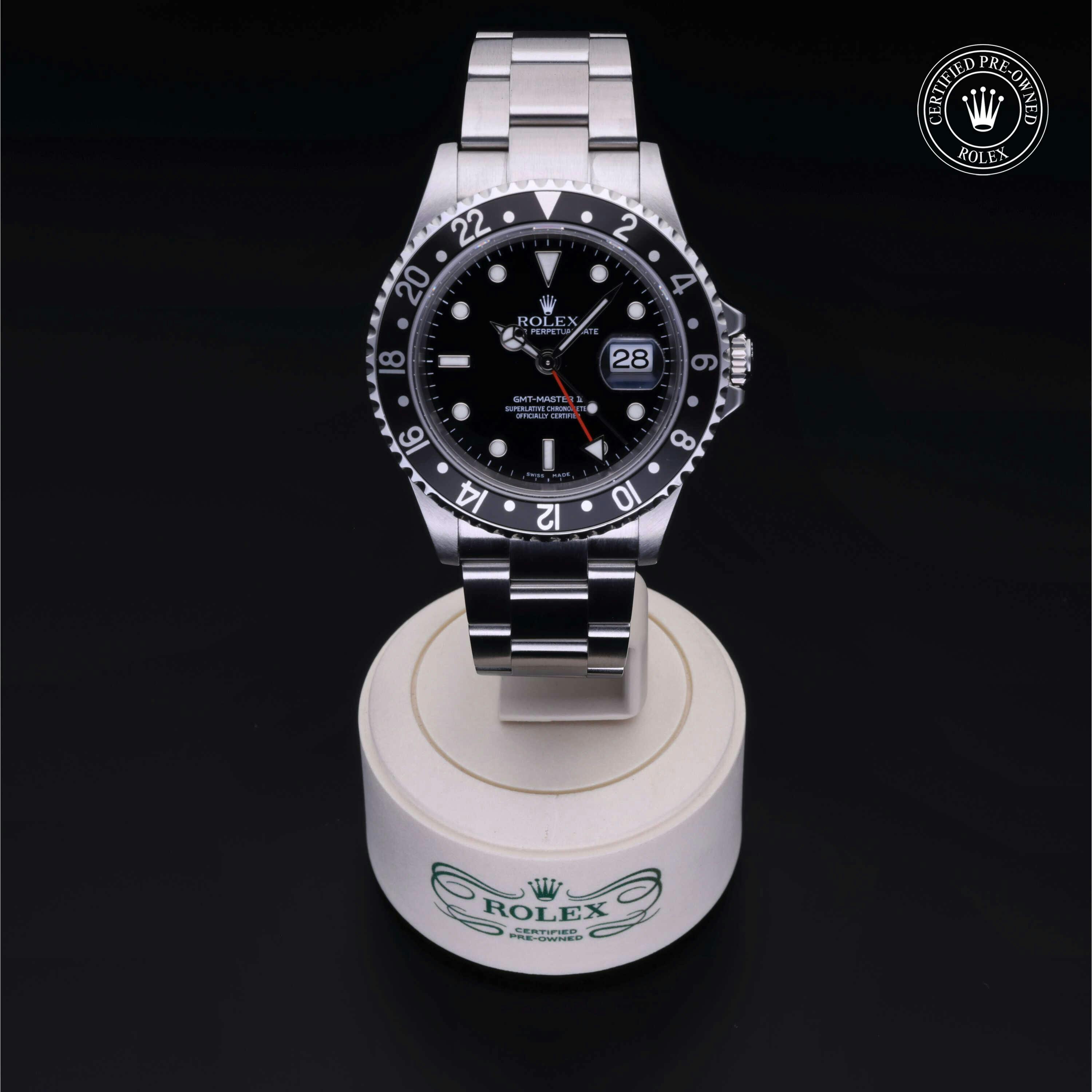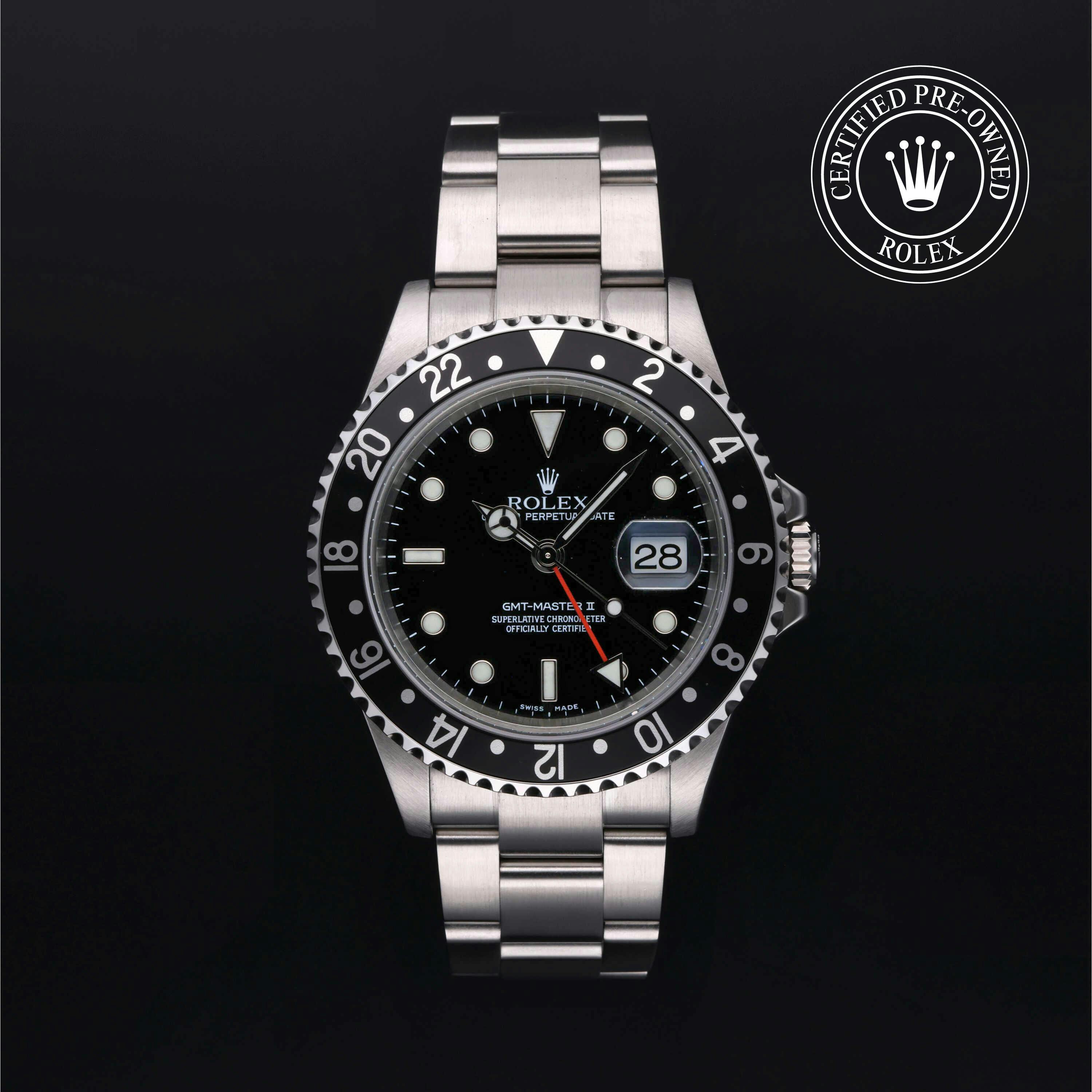 Rolex Certified Pre-Owned GMT-Master II (16710LN) self - winding automatic watch, features a 40mm stainless steel case with a black aluminum bezel insert surrounding a black dial on a stainless steel oyster bracelet. Functions include hours, minutes, seconds, date and gmt/world time. This watch has received Rolex-authorized service and certification. It does not come with the original box or papers, but includes a custom Rolex Certified Pre-Owned hang tag, travel pouch and RCPO international warranty card.