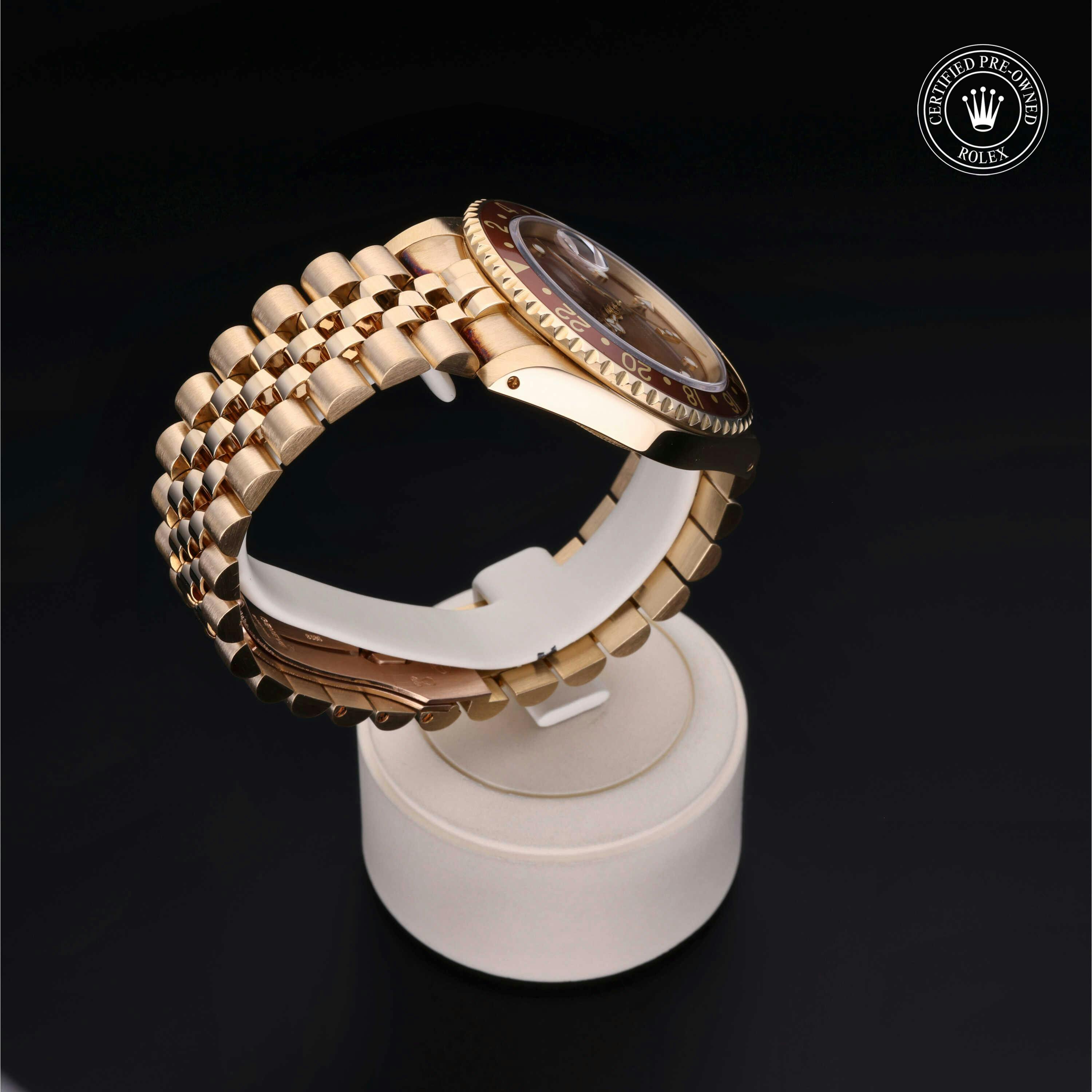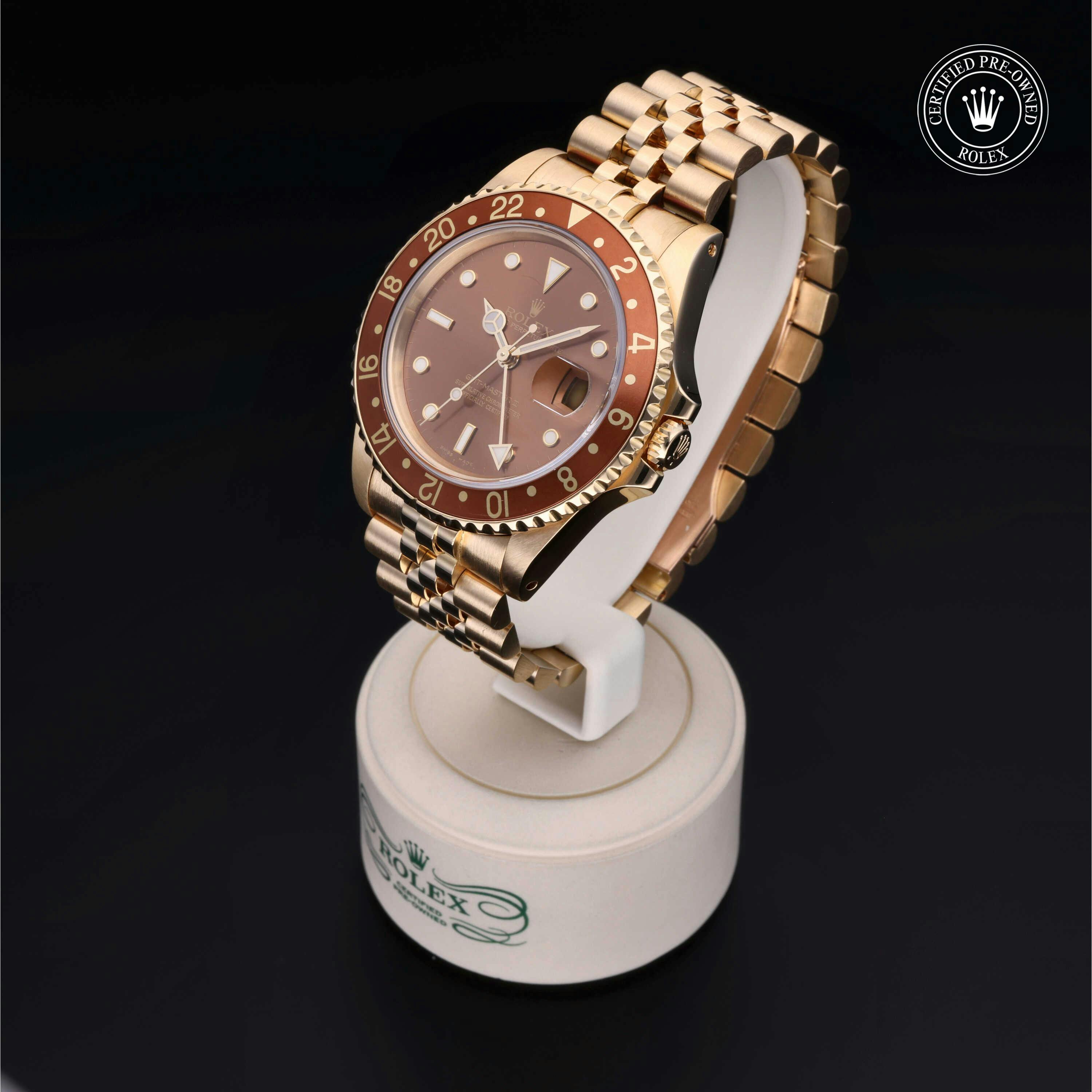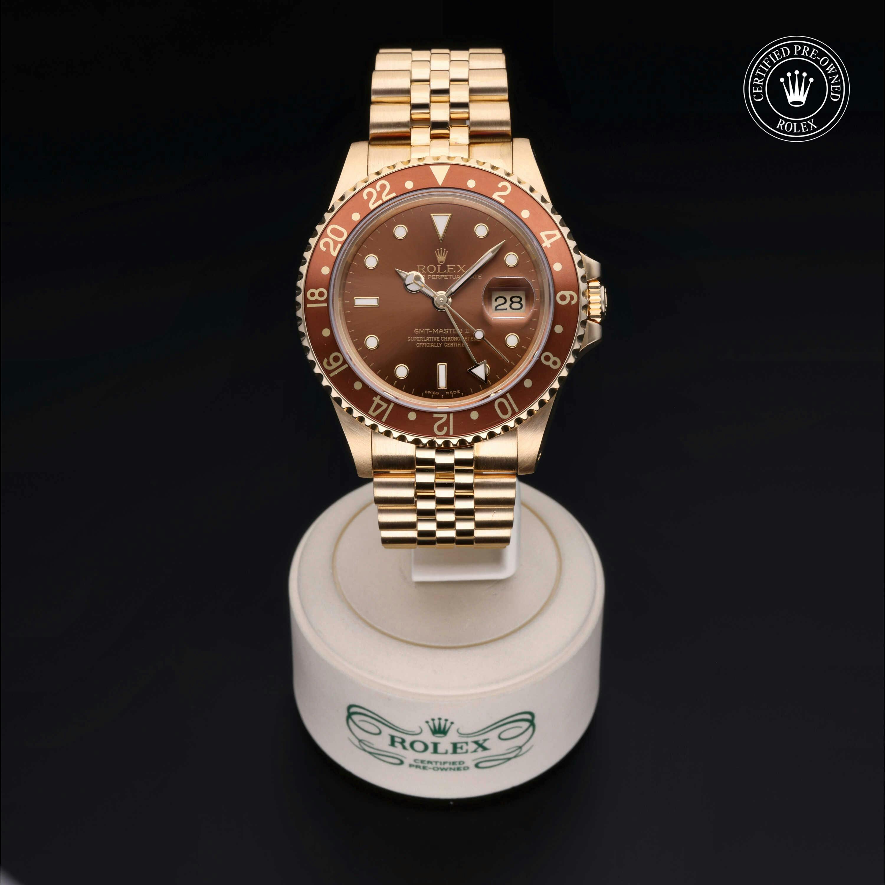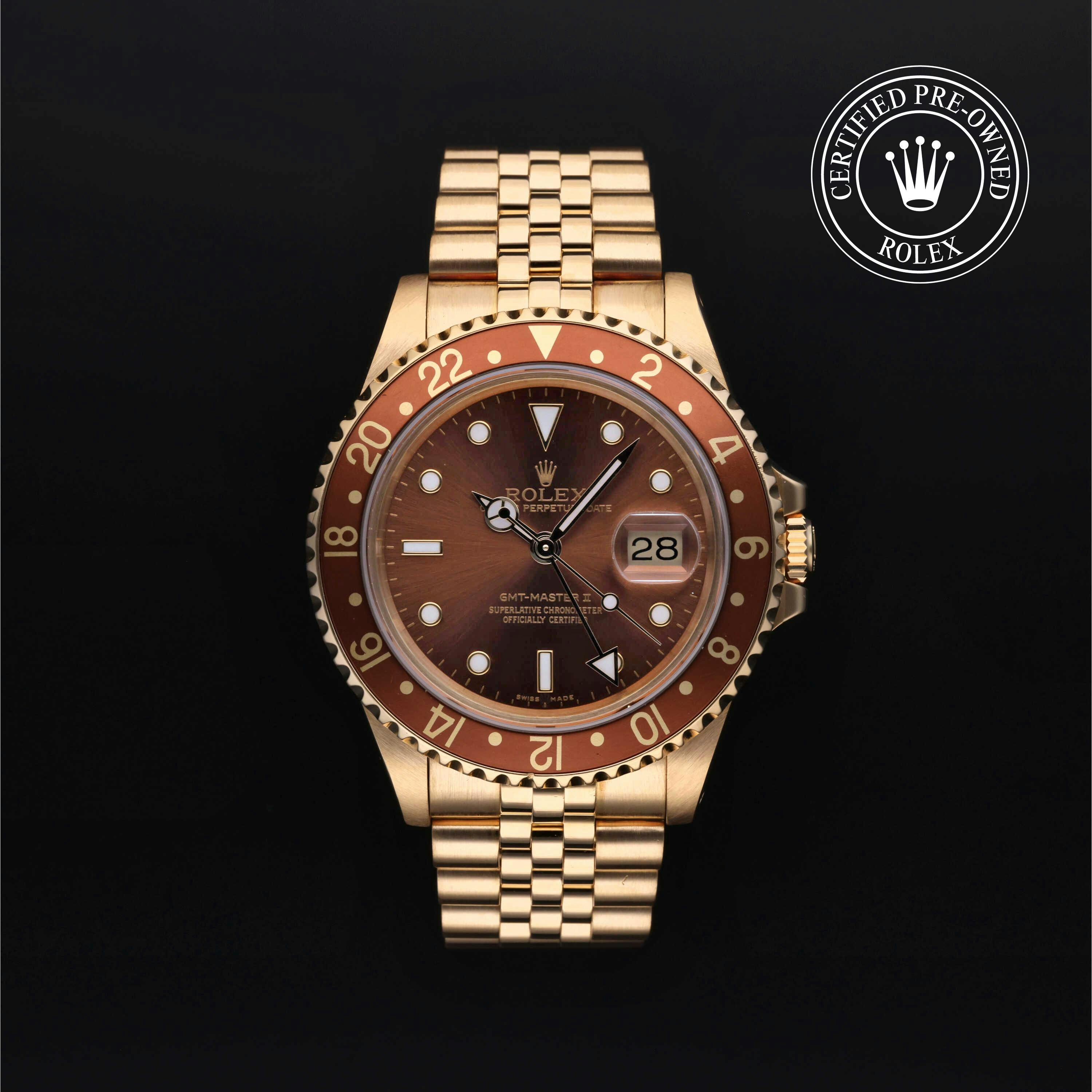 Rolex Certified Pre-Owned GMT-Master II (16718) self - winding automatic watch, features a 40mm 18k yellow gold case with a brown aluminum bezel insert surrounding a brown dial on an 18k yellow gold jubilee bracelet. Functions include hours, minutes, seconds, date and gmt/world time. This watch has received Rolex-authorized service and certification. It comes with the original box and papers, and includes a custom Rolex Certified Pre-Owned hang tag, travel pouch and RCPO international warranty card.