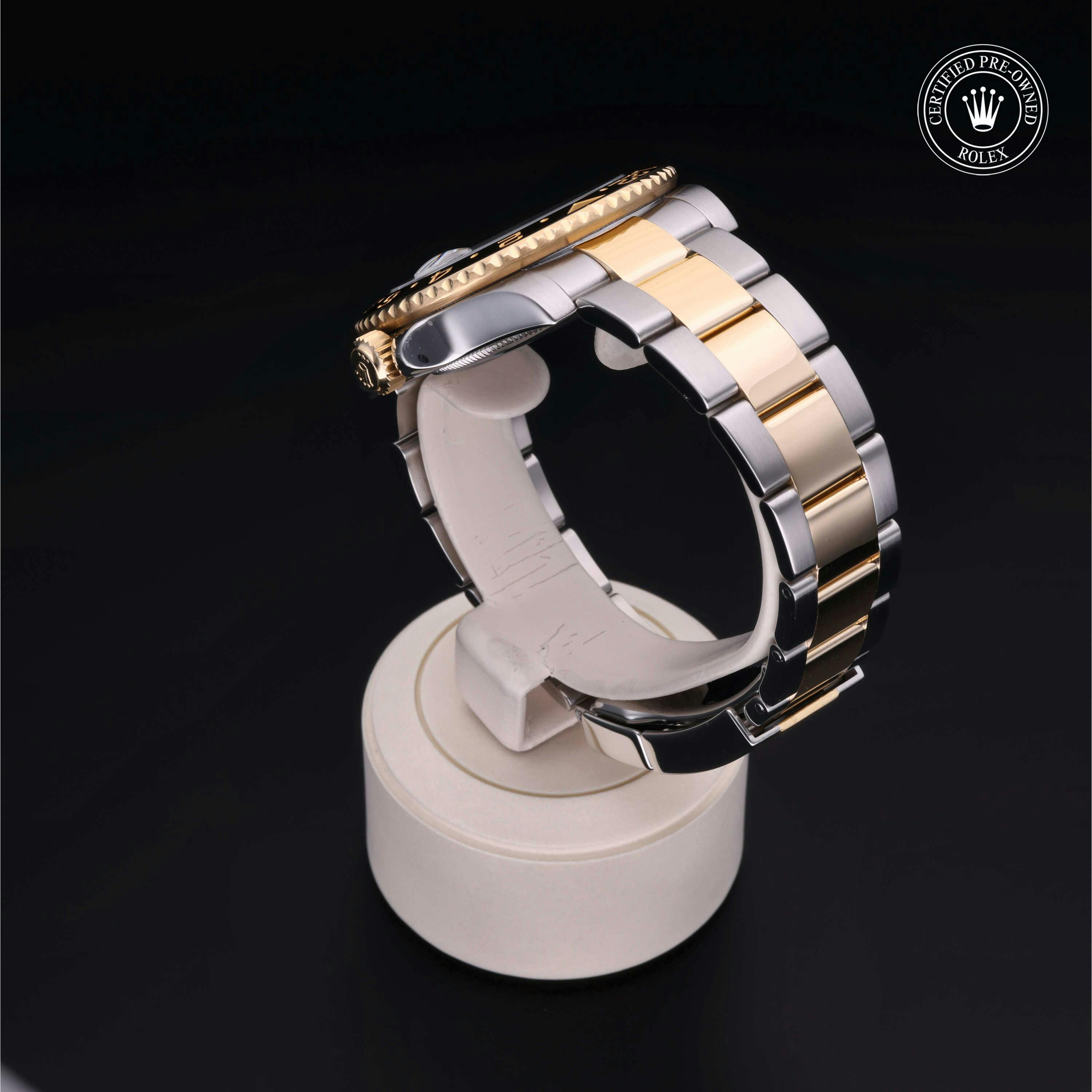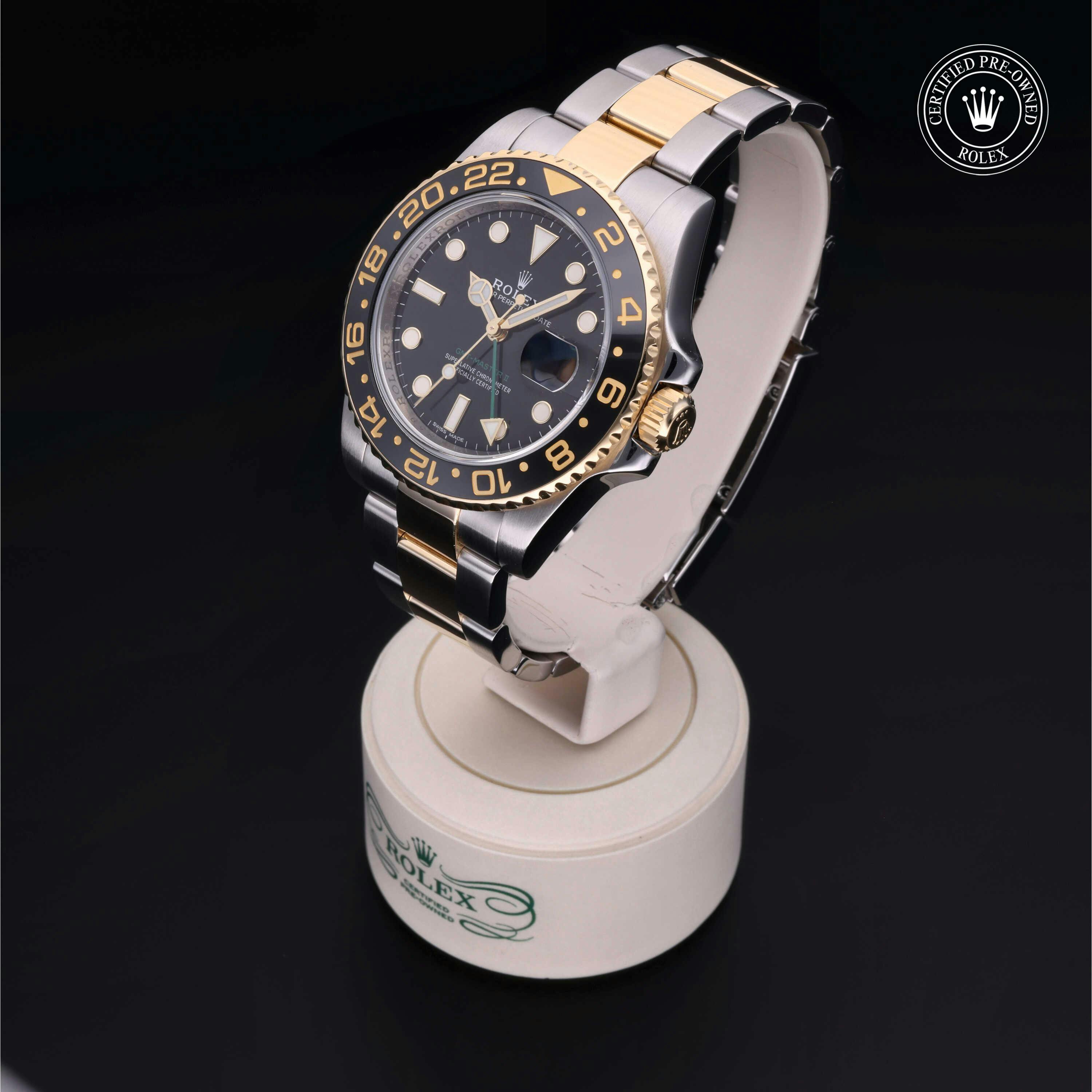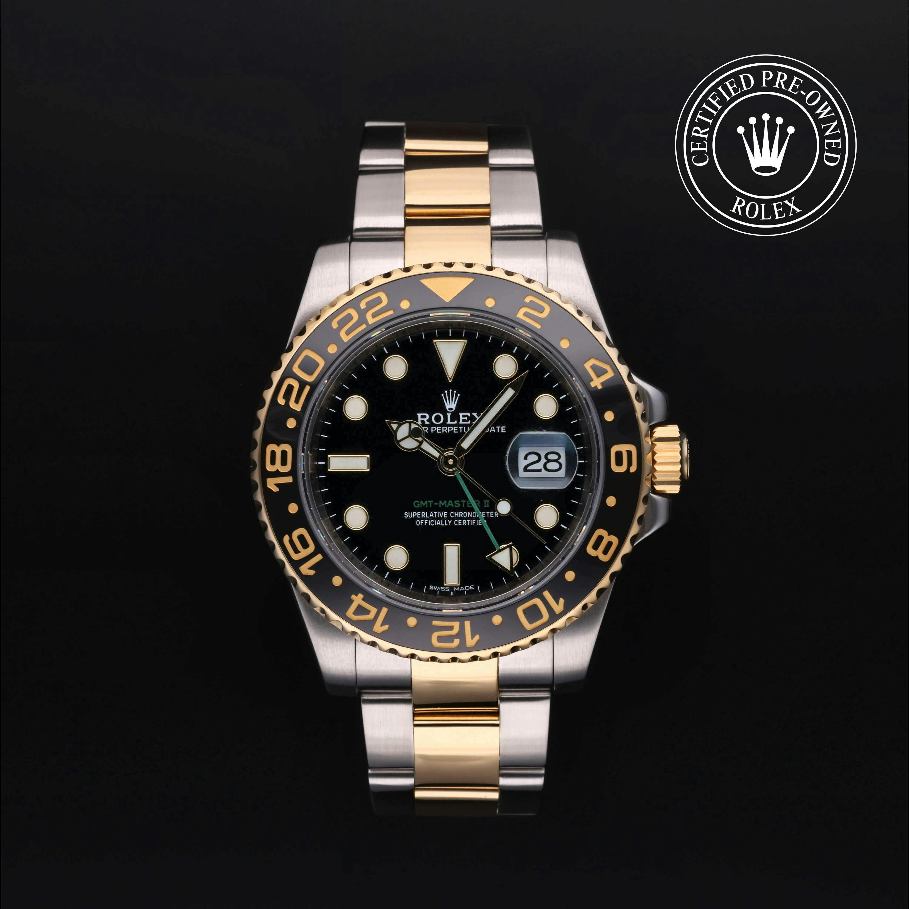 Rolex Certified Pre-Owned GMT-Master II (116713LN) self - winding automatic watch, features a 40mm stainless steel case with an 18k yellow gold bidirectional rotating bezel with a black cerachrom insert surrounding a black dial on a stainless steel and 18k yellow gold oyster bracelet. Functions include hours, minutes, seconds, date and gmt/world time. This watch has received Rolex-authorized service and certification. It does not come with the original box or papers, but includes a custom Rolex Certified Pre-Owned hang tag, travel pouch and RCPO international warranty card.