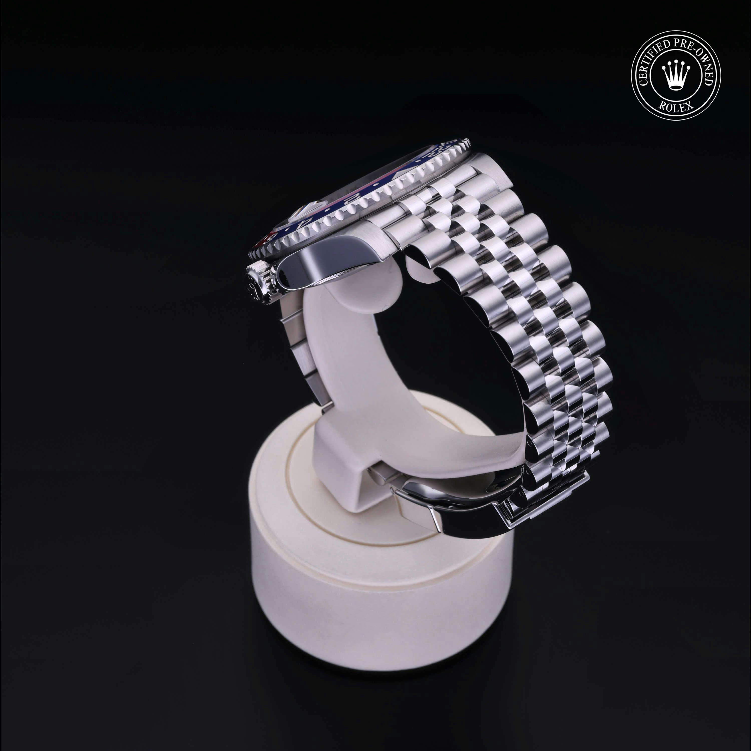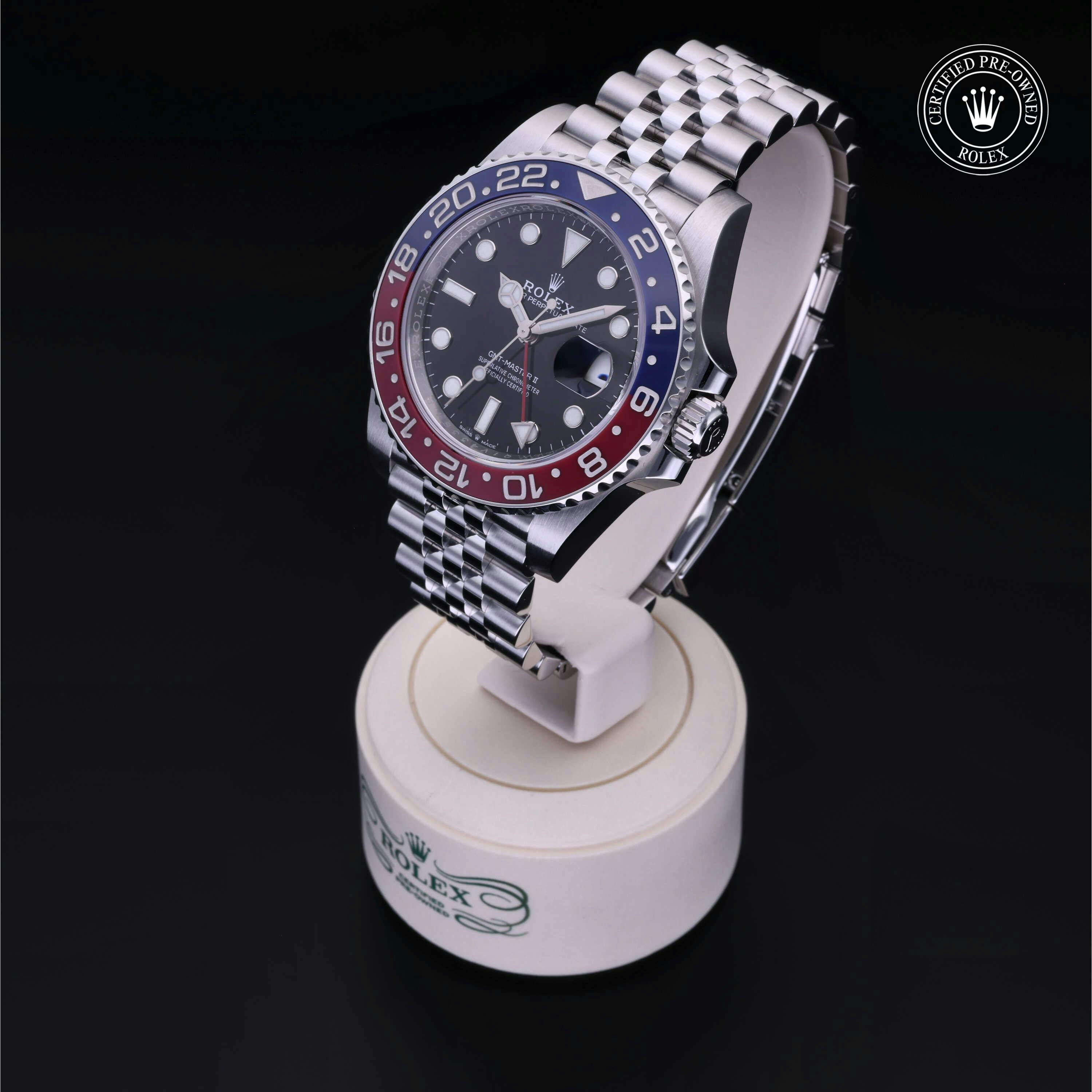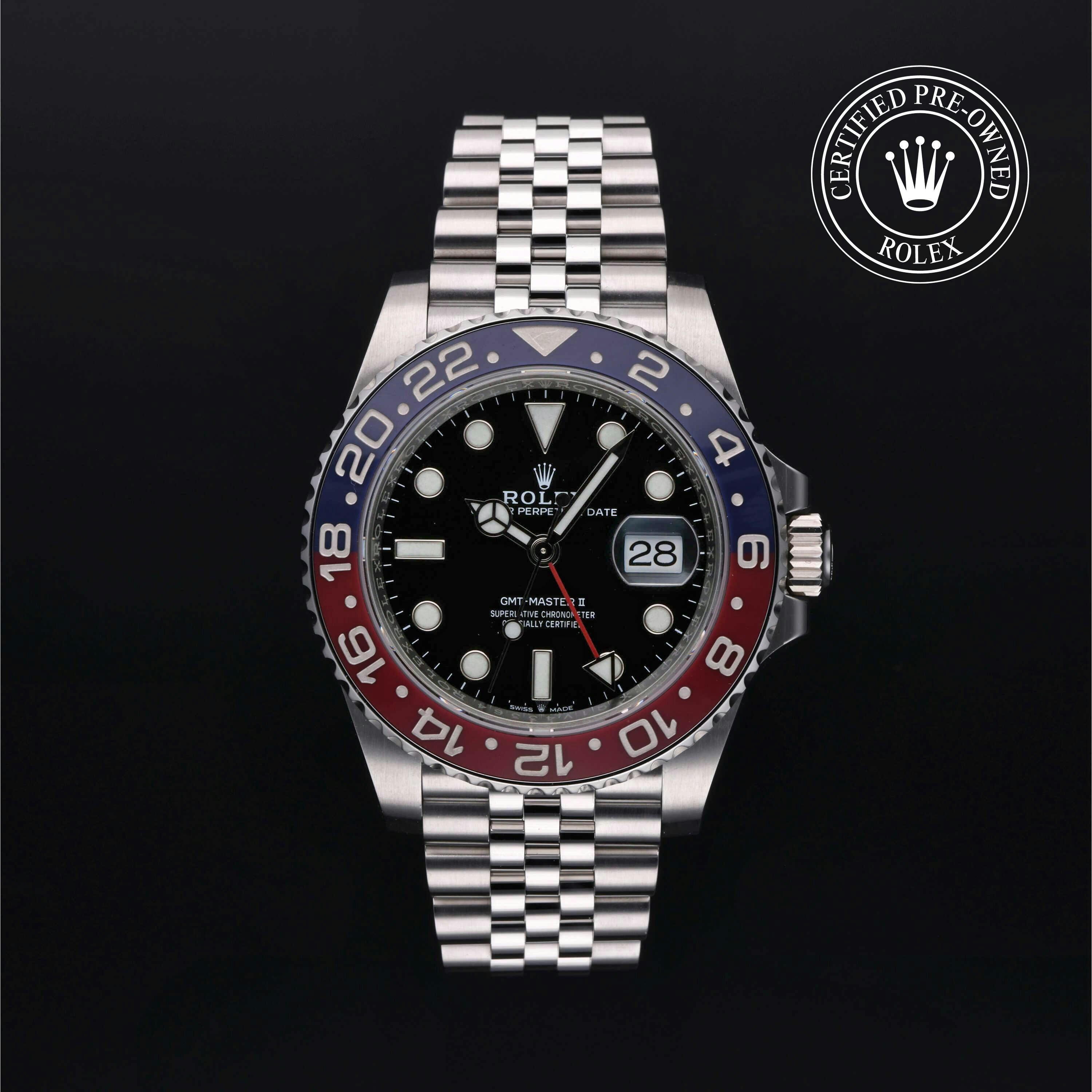 Rolex Certified Pre-Owned GMT-Master II (126710BLRO) self - winding automatic watch, features a 40mm stainless steel case with a blue and red cerachrom bezel insert surrounding a black dial on a stainless steel jubilee bracelet. Functions include hours, minutes, seconds, date and gmt/world time. This watch has received Rolex-authorized service and certification. It does not come with the original box or papers, but includes a custom Rolex Certified Pre-Owned hang tag, travel pouch and RCPO international warranty card.