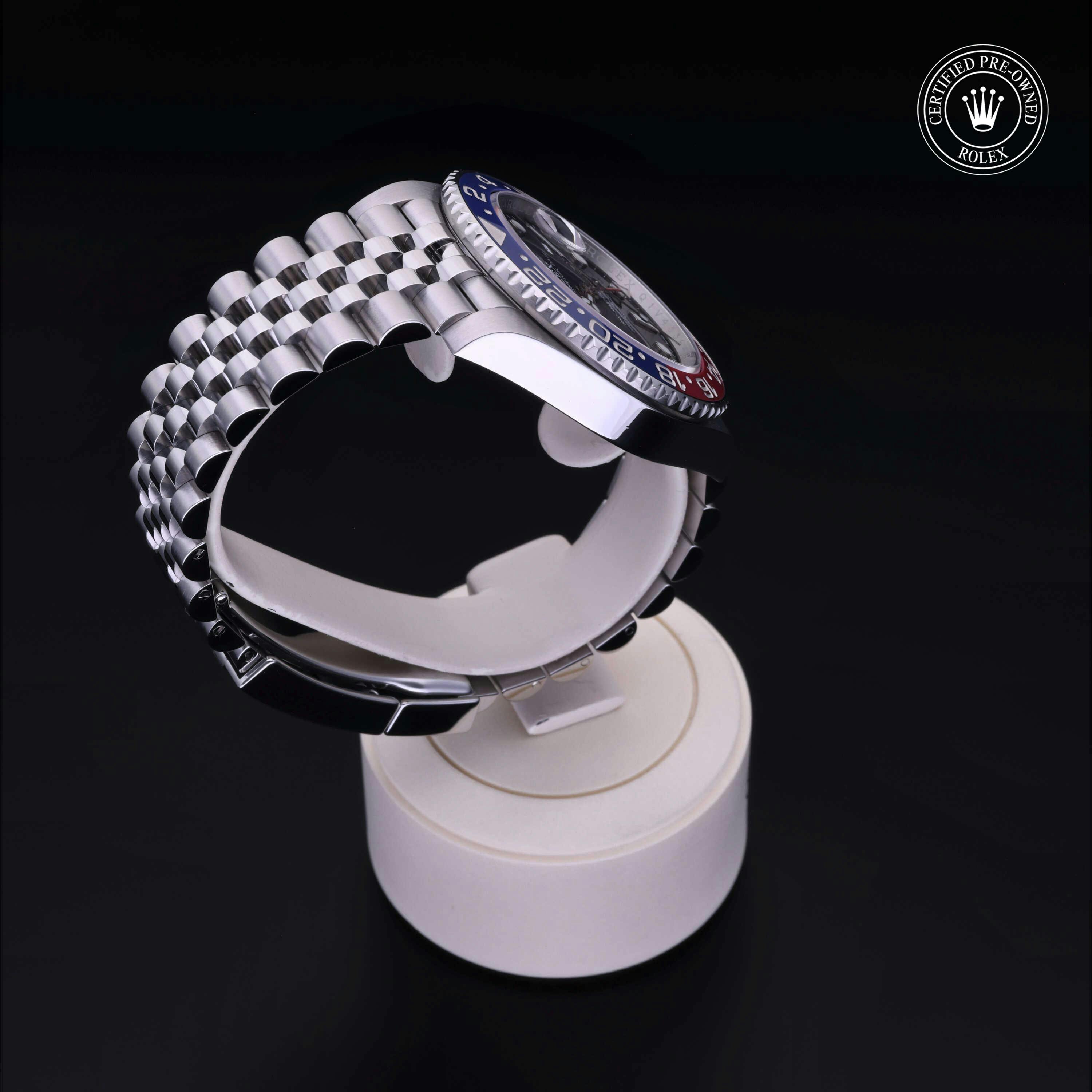 Rolex Certified Pre-Owned GMT-Master II (126710BLRO) self - winding automatic watch, features a 40mm stainless steel case with a blue and red cerachrom bezel insert surrounding a black dial on a stainless steel jubilee bracelet. Functions include hours, minutes, seconds, date and gmt/world time. This watch has received Rolex-authorized service and certification. It does not come with the original box or papers, but includes a custom Rolex Certified Pre-Owned hang tag, travel pouch and RCPO international warranty card.