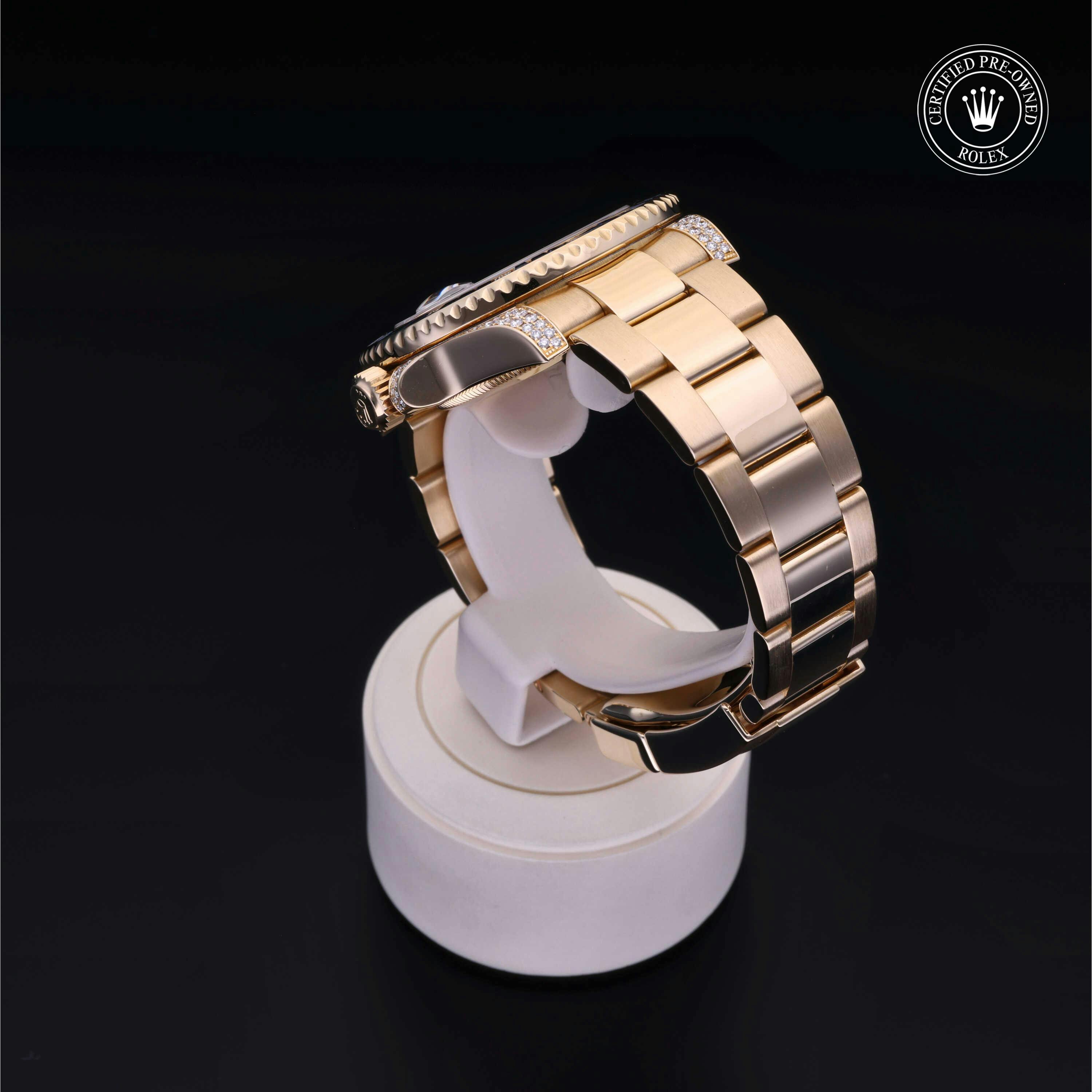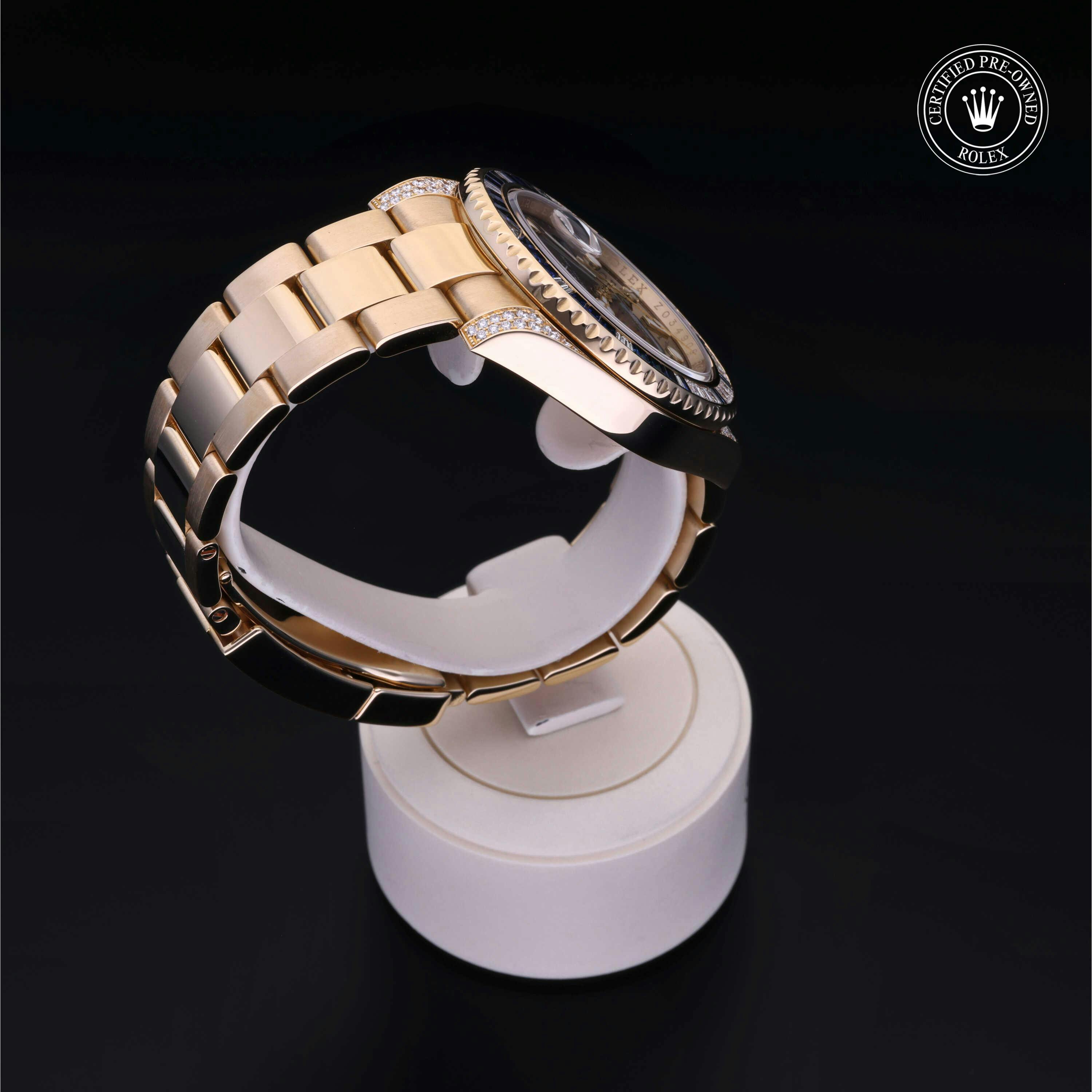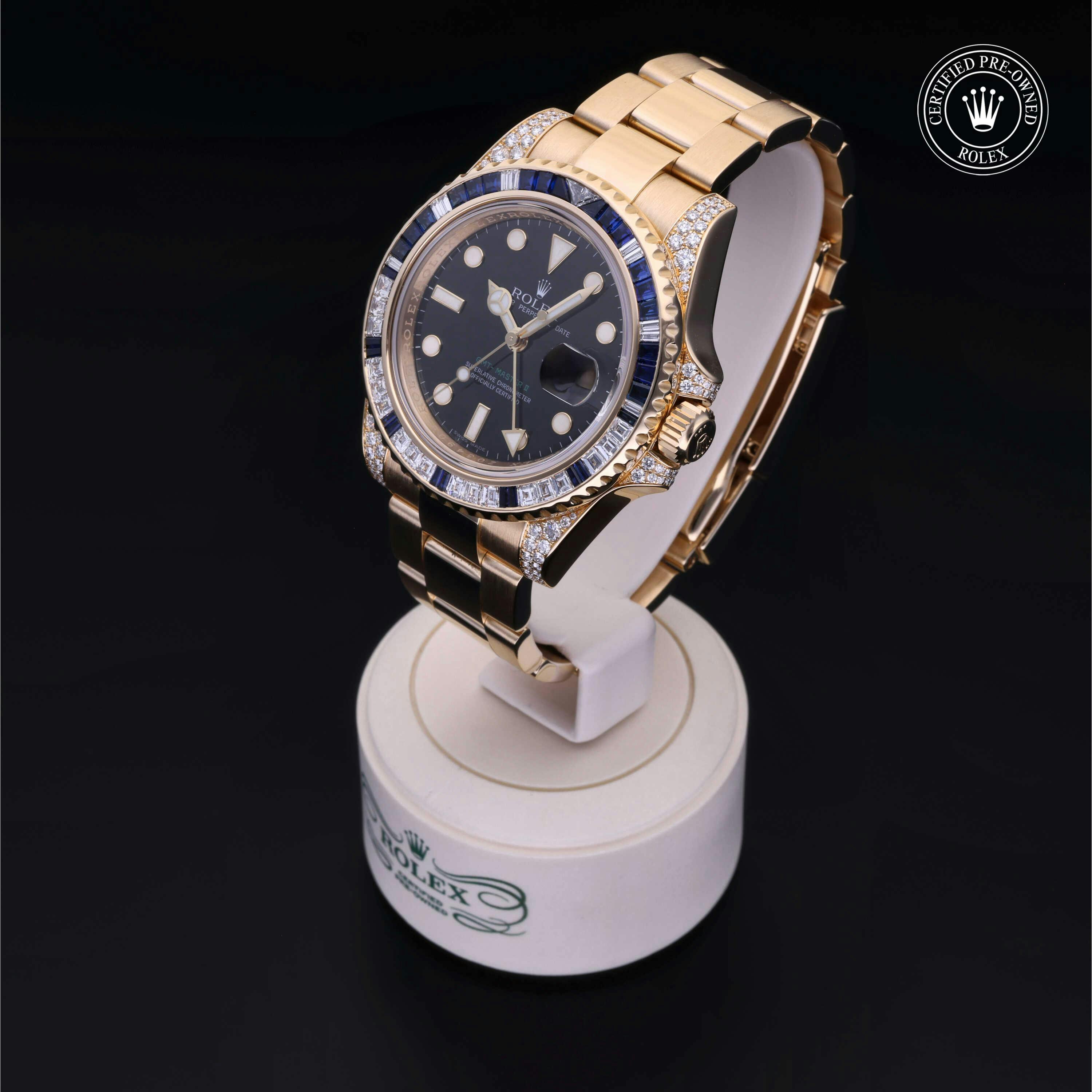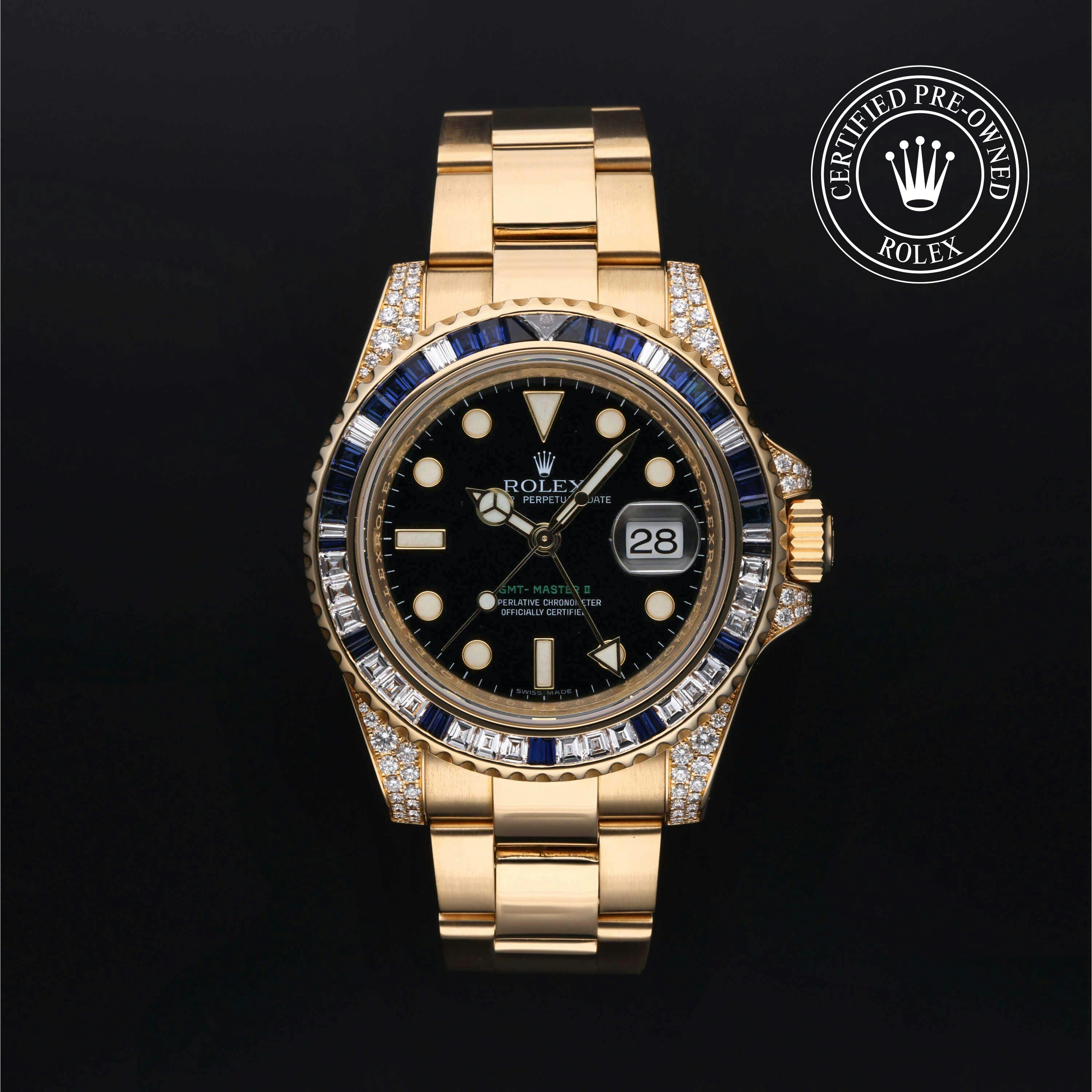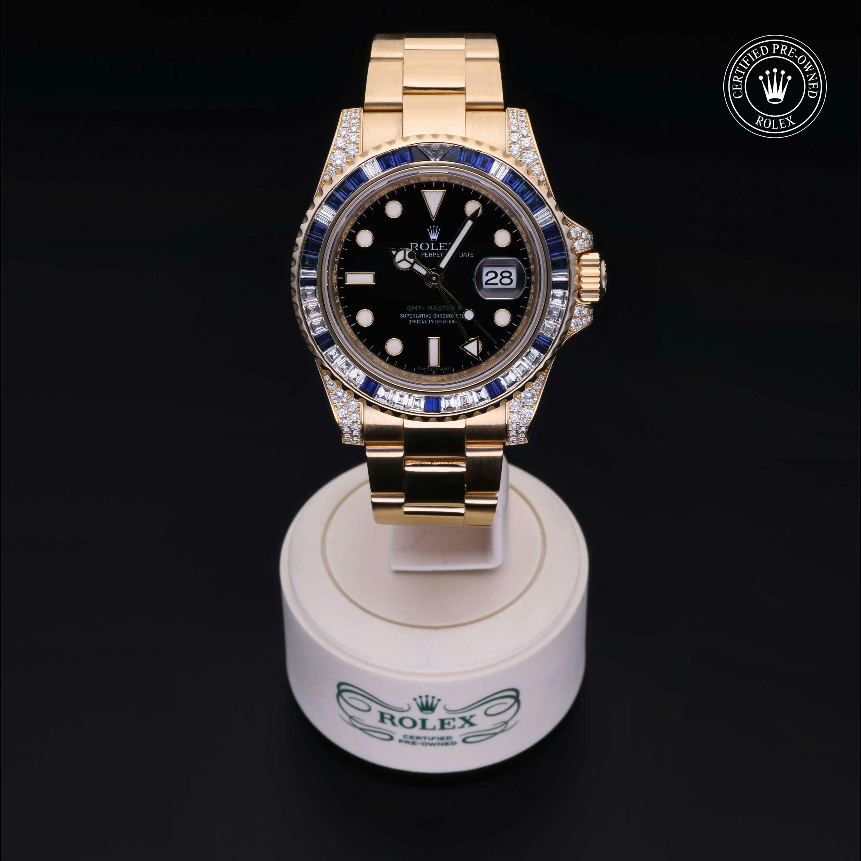 Rolex Certified Pre-Owned GMT-Master II (116758SA) self - winding automatic watch, features a 40mm 18k yellow gold diamond set case with a diamond and blue sapphire set bezel surrounding a black dial on an 18k yellow gold oyster bracelet. Functions include hours, minutes, seconds, date and gmt/world time. This watch has received Rolex-authorized service and certification. It does not come with the original box or papers, but includes a custom Rolex Certified Pre-Owned hang tag, travel pouch and RCPO international warranty card.