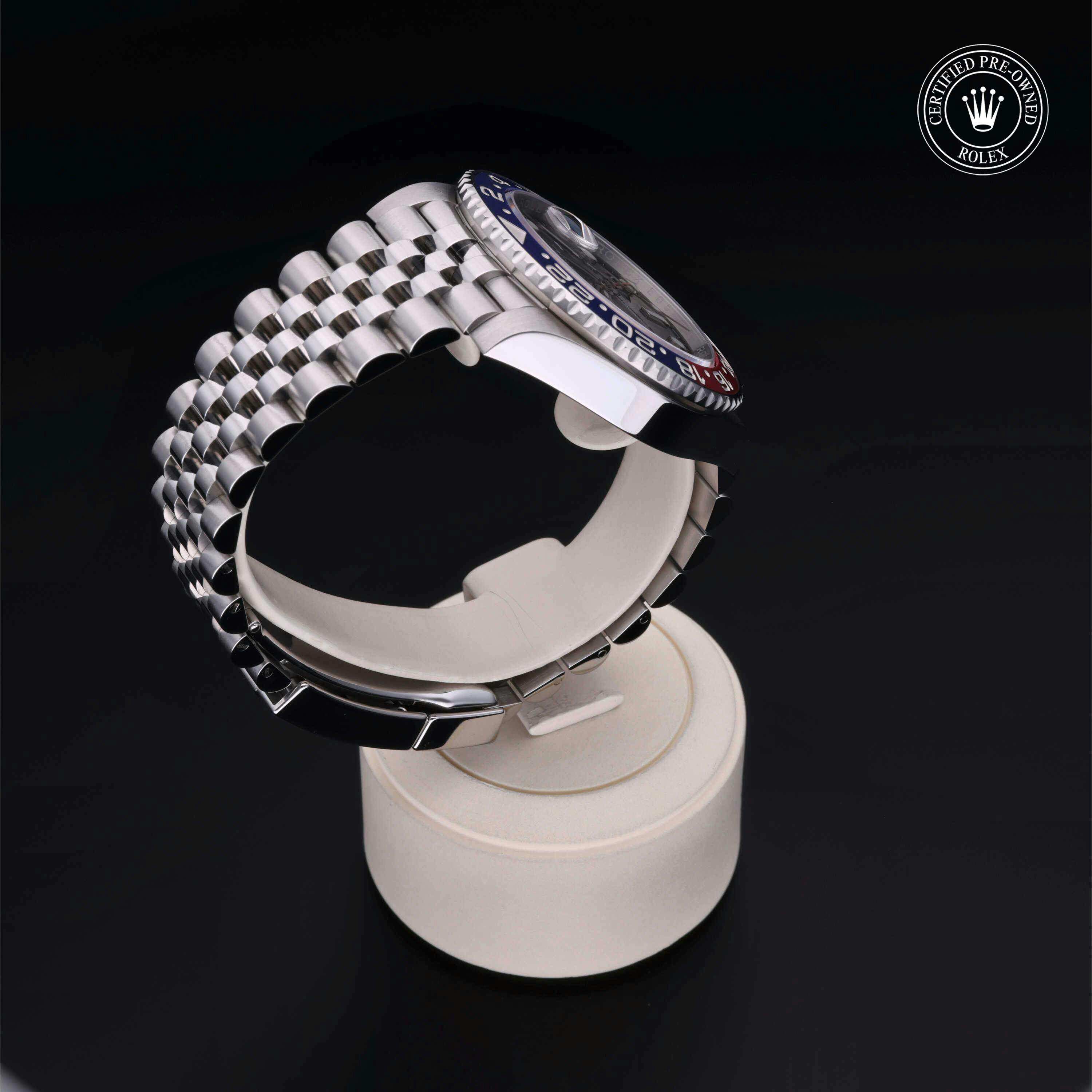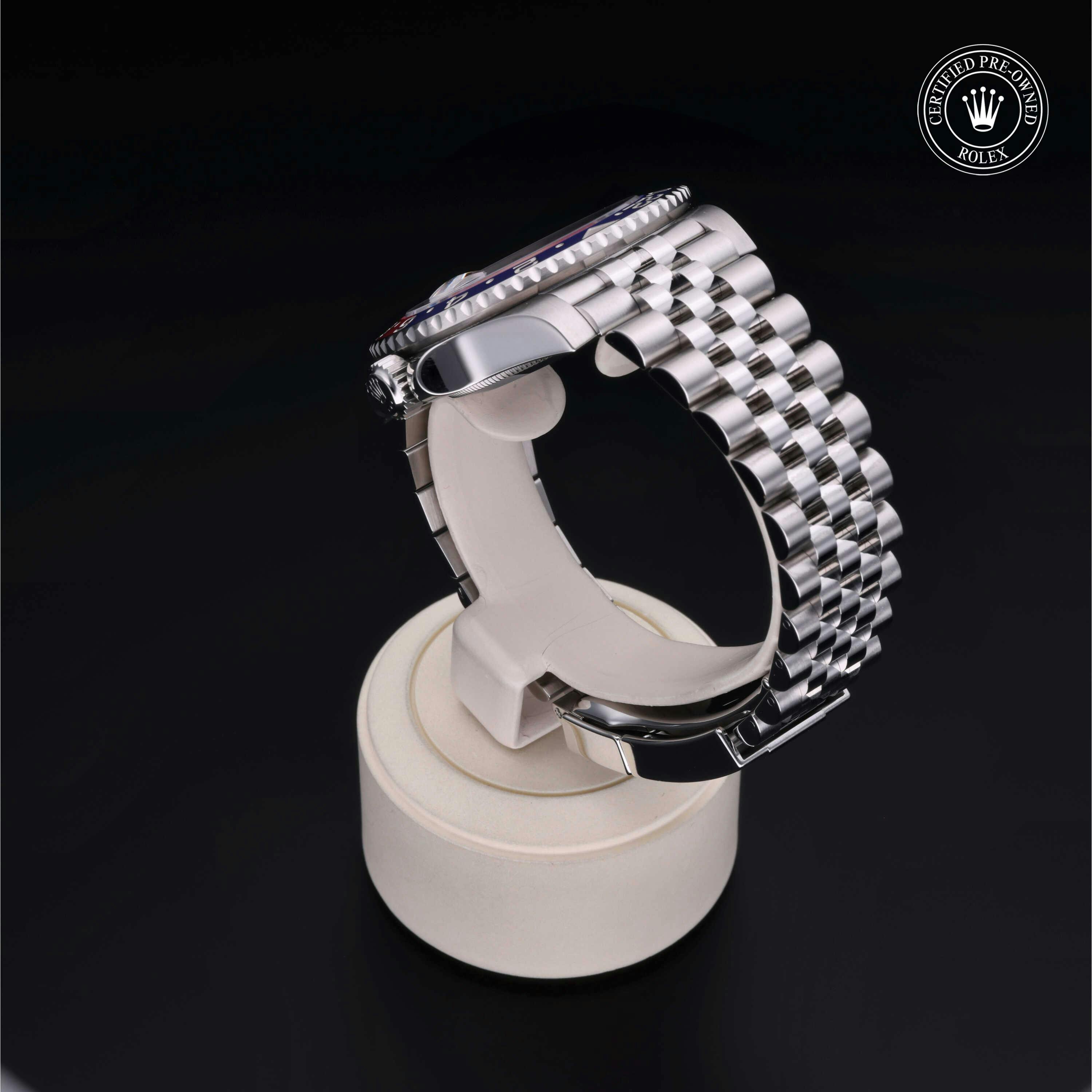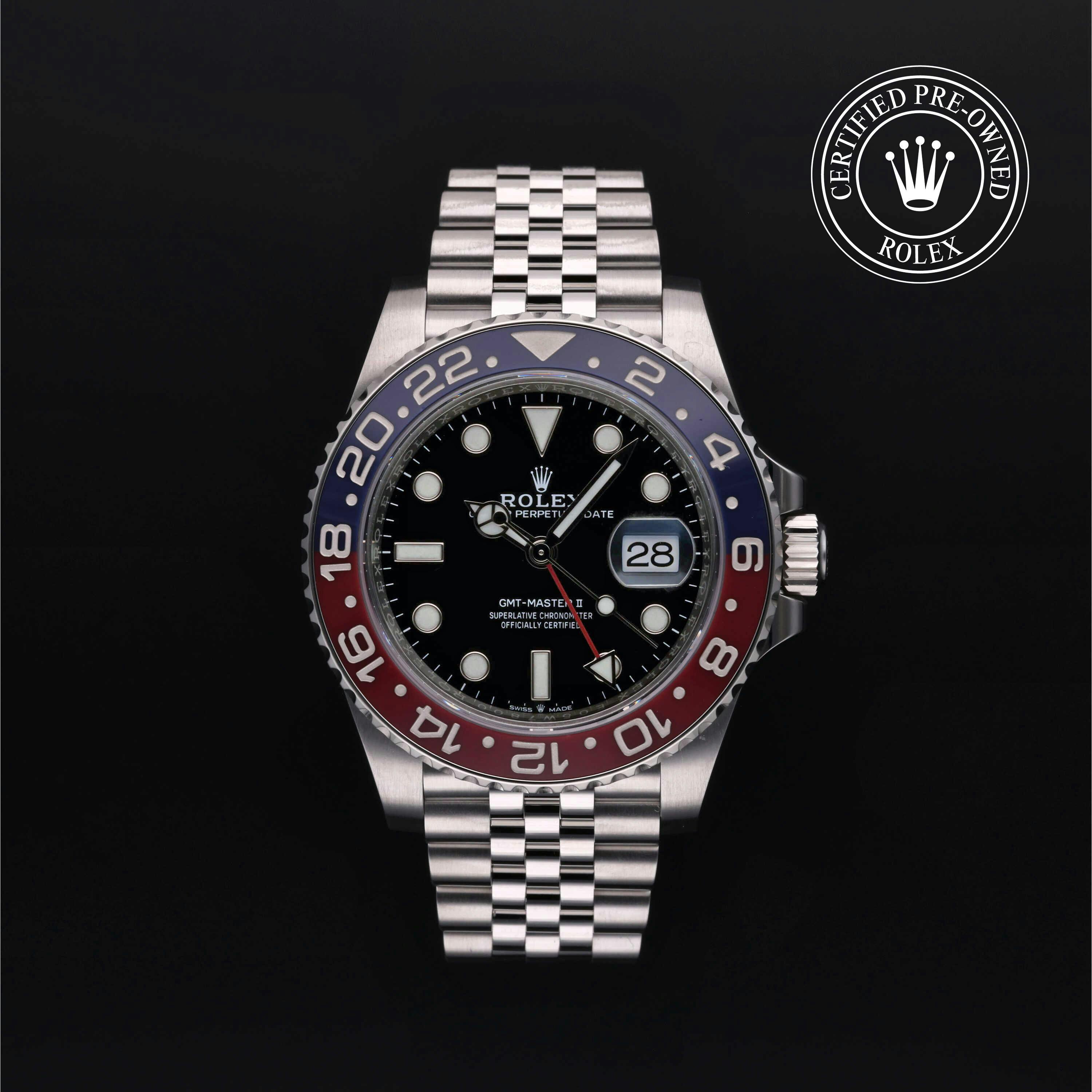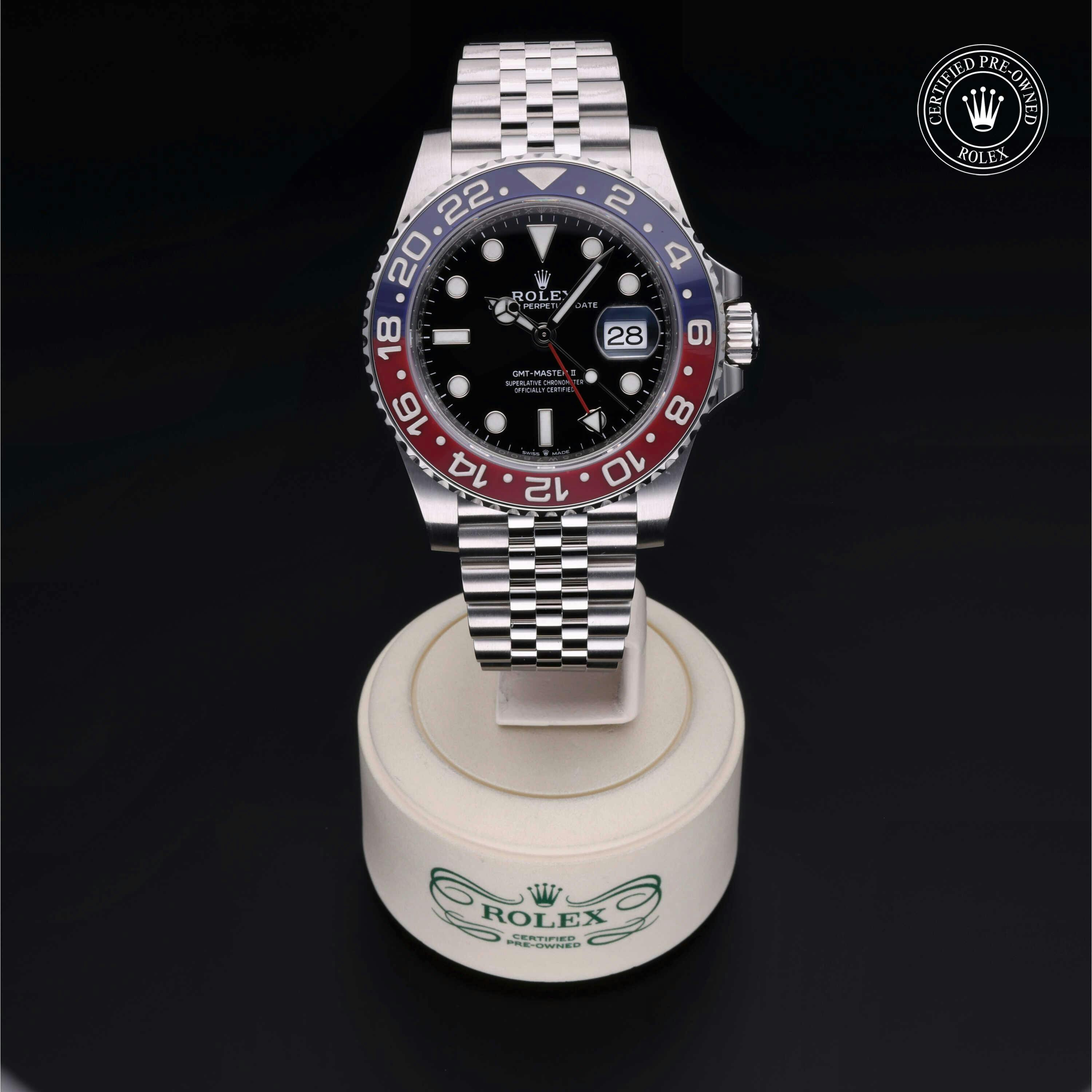 Rolex Certified Pre-Owned GMT-Master II (126710BLRO) self - winding automatic watch, features a 40mm stainless steel case with a blue and red cerachrom bezel insert surrounding a black dial on a stainless steel jubilee bracelet. Functions include hours, minutes, seconds, date and gmt/world time. This watch has received Rolex-authorized service and certification. It comes with the original box and papers, and includes a custom Rolex Certified Pre-Owned hang tag, travel pouch and RCPO international warranty card.