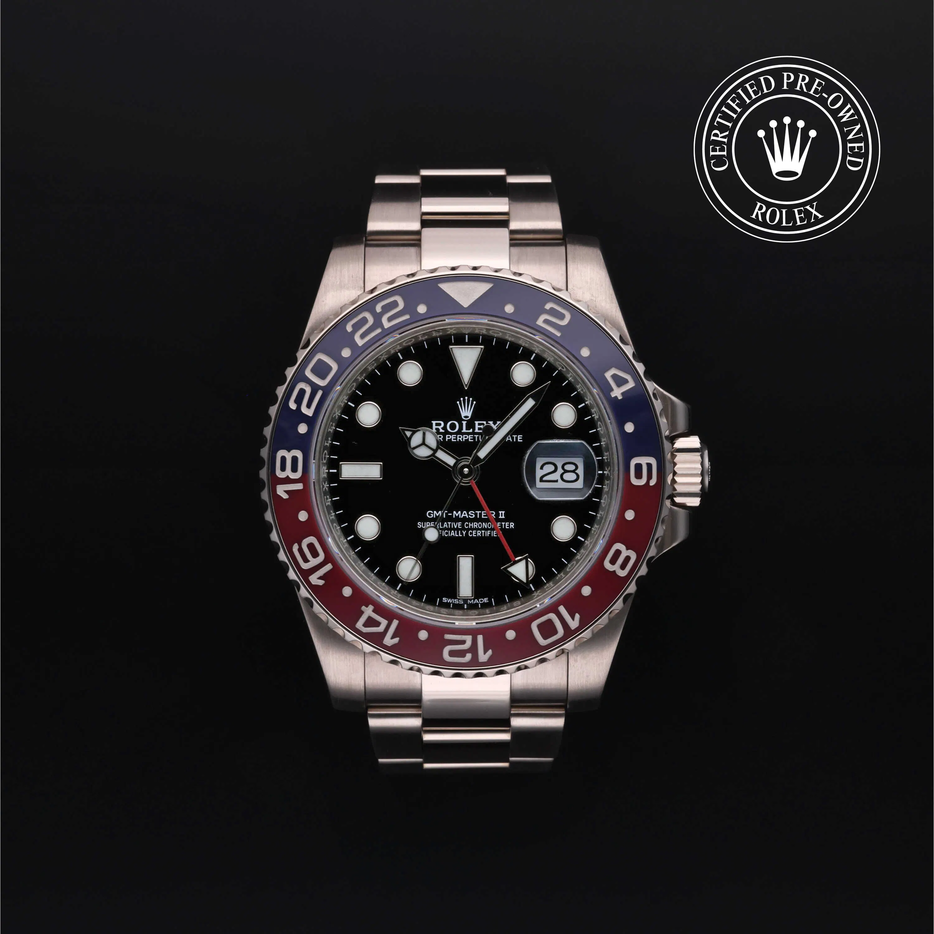 Rolex Certified Pre-Owned GMT-Master II (116719BLRO) self - winding automatic watch, features a 40mm 18k white gold case and bidirectional rotating bezel with a blue and red cerachrom insert surrounding a black dial on an 18k white gold Oyster bracelet. Functions include hours, minutes, seconds, date and gmt/world time. This watch has received Rolex-authorized service and certification. It comes with the original box and papers, and includes a custom Rolex Certified Pre-Owned hang tag, travel pouch and RCPO international warranty card.