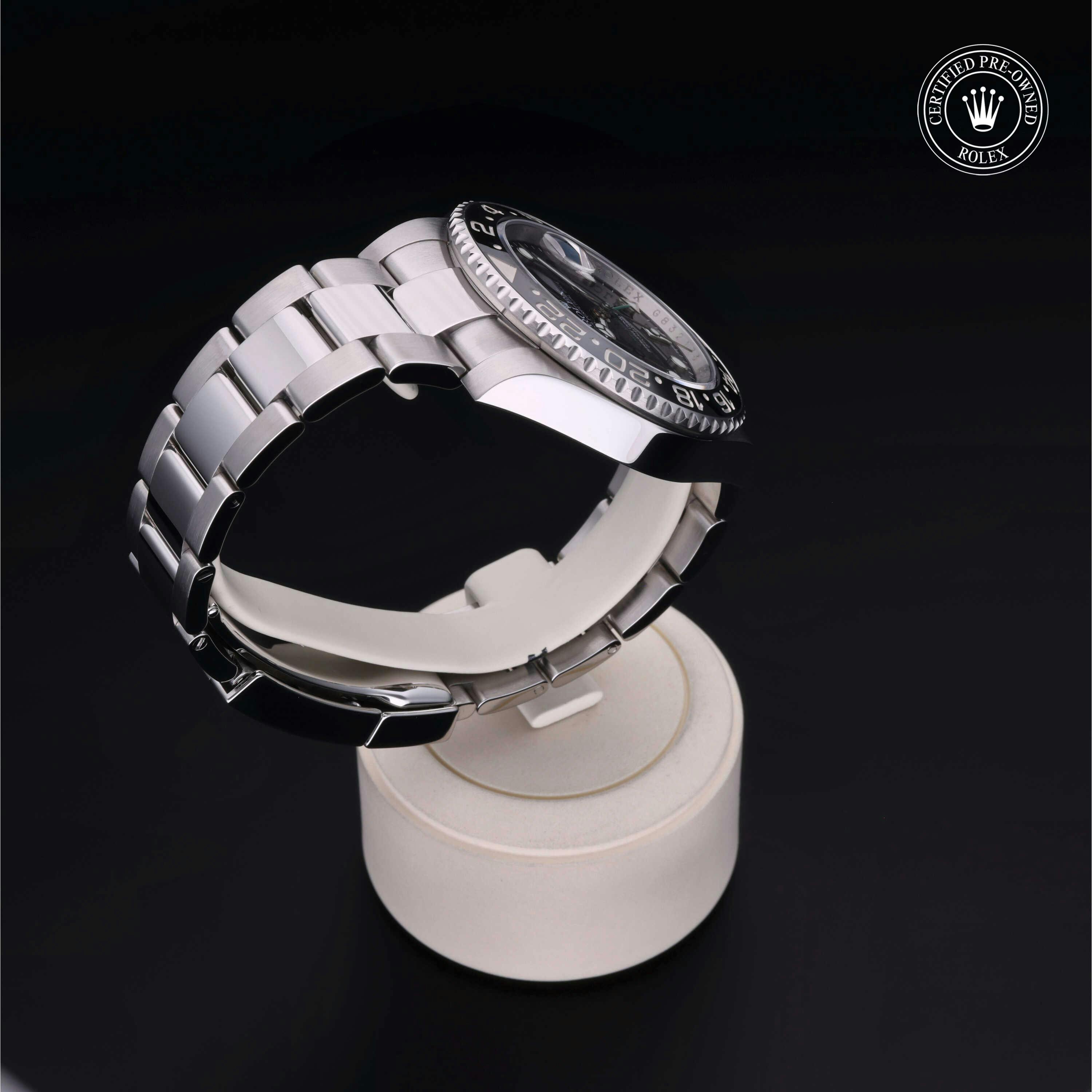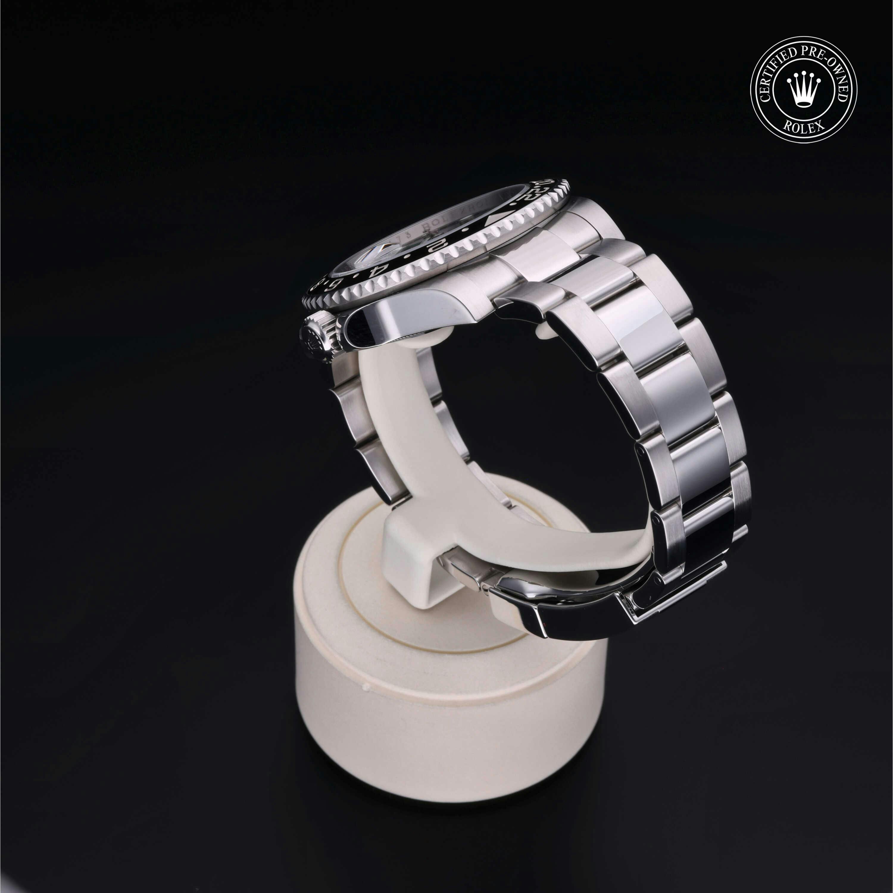 Rolex Certified Pre-Owned GMT-Master II (116710LN) self - winding automatic watch, features a 40mm stainless steel case and bidirectional rotating bezel with a black cerachrom insert surrounding a black dial on a stainless steel oyster bracelet. Functions include hours, minutes, seconds, date and gmt/world time. This watch has received Rolex-authorized service and certification. It does not come with the original box or papers, but includes a custom Rolex Certified Pre-Owned hang tag, travel pouch and RCPO international warranty card.