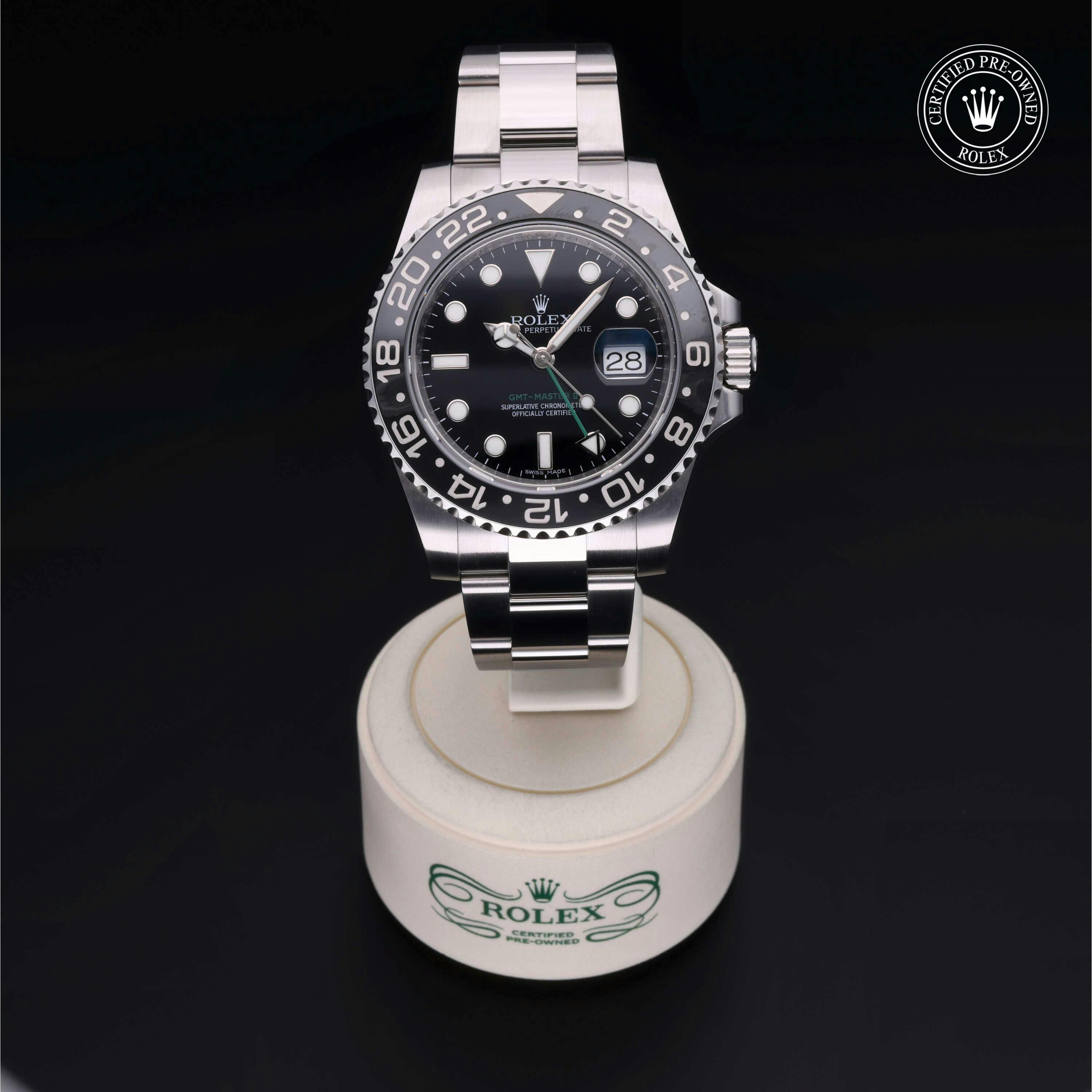Rolex Certified Pre-Owned GMT-Master II (116710LN) self - winding automatic watch, features a 40mm stainless steel case and bidirectional rotating bezel with a black cerachrom insert surrounding a black dial on a stainless steel oyster bracelet. Functions include hours, minutes, seconds, date and gmt/world time. This watch has received Rolex-authorized service and certification. It does not come with the original box or papers, but includes a custom Rolex Certified Pre-Owned hang tag, travel pouch and RCPO international warranty card.
