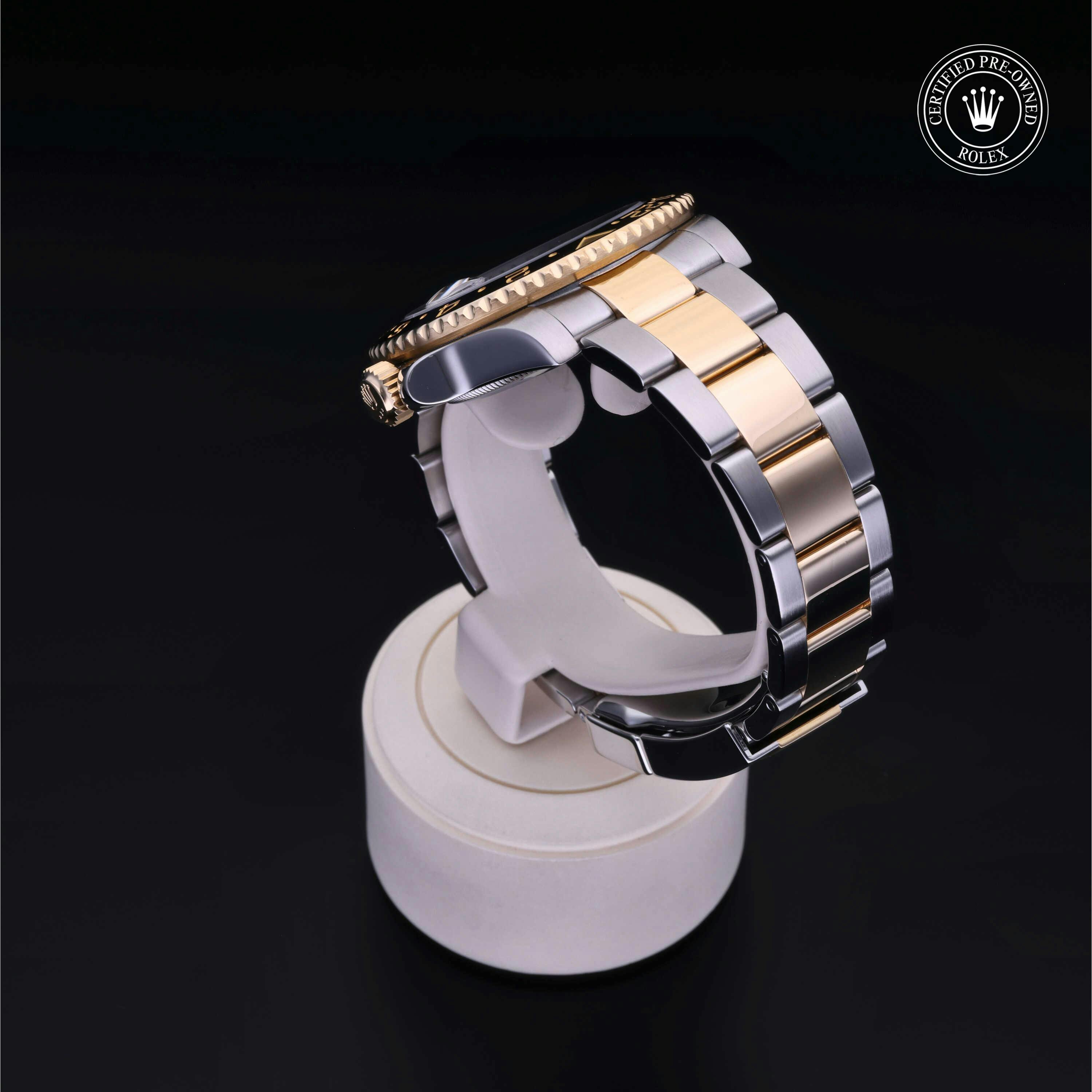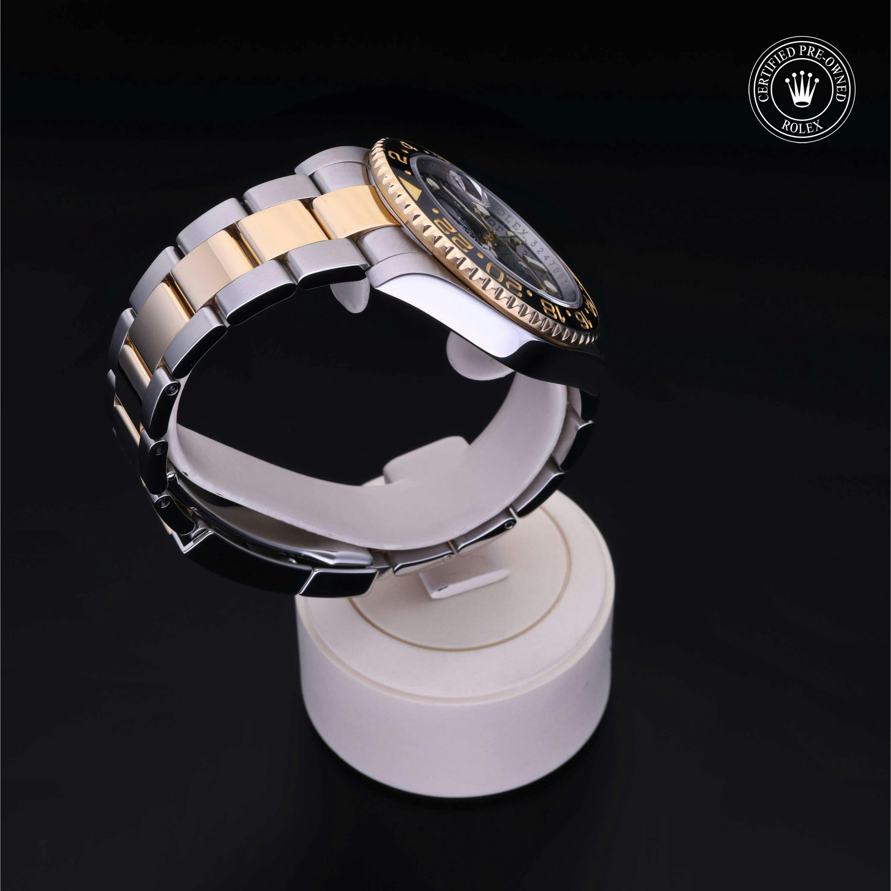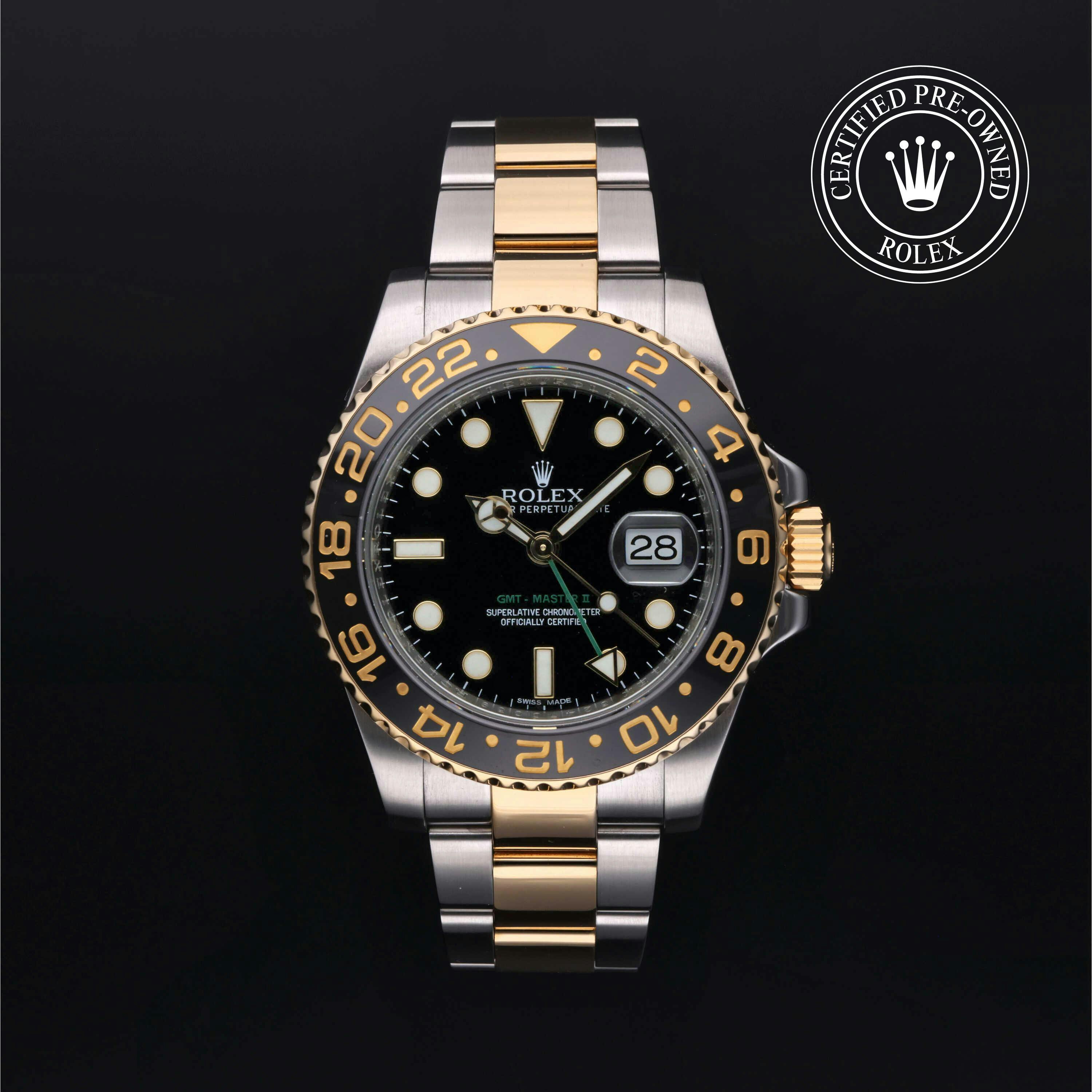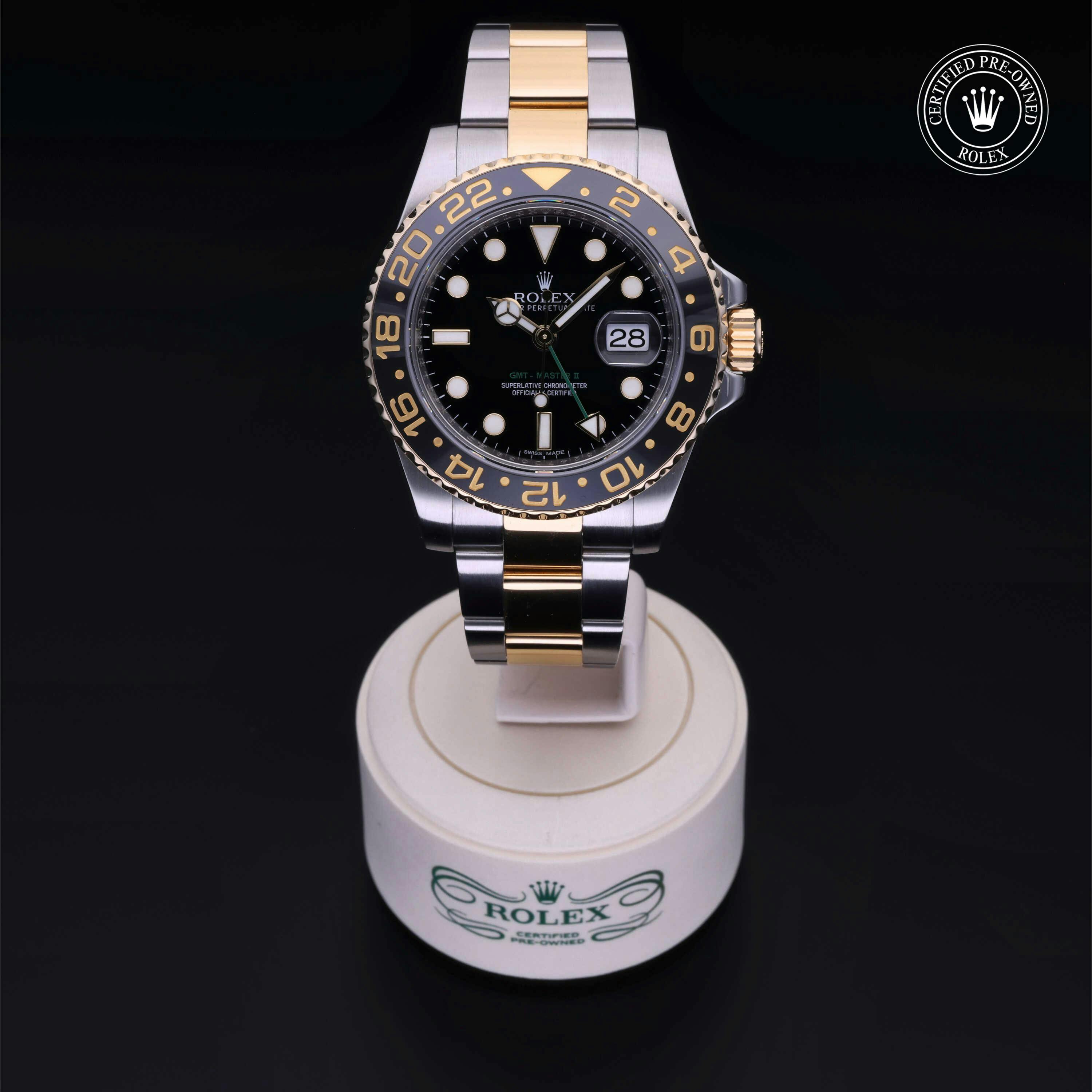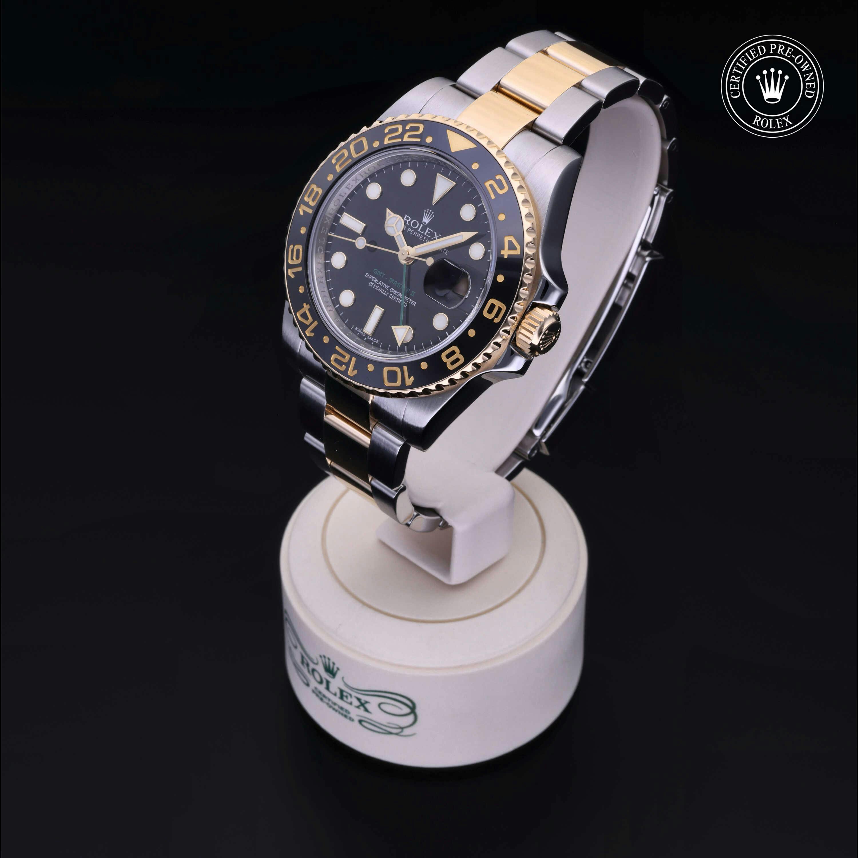 Rolex Certified Pre-Owned GMT-Master II (116713LN) self - winding automatic watch, features a 40mm stainless steel case with an 18k yellow gold and black cerachrom bezel surrounding a black dial on a stainless steel and 18k yellow gold oyster bracelet. Functions include hours, minutes, seconds, date and gmt/world time. This watch has received Rolex-authorized service and certification. It does not come with the original box or papers, but includes a custom Rolex Certified Pre-Owned hang tag, travel pouch and RCPO international warranty card.