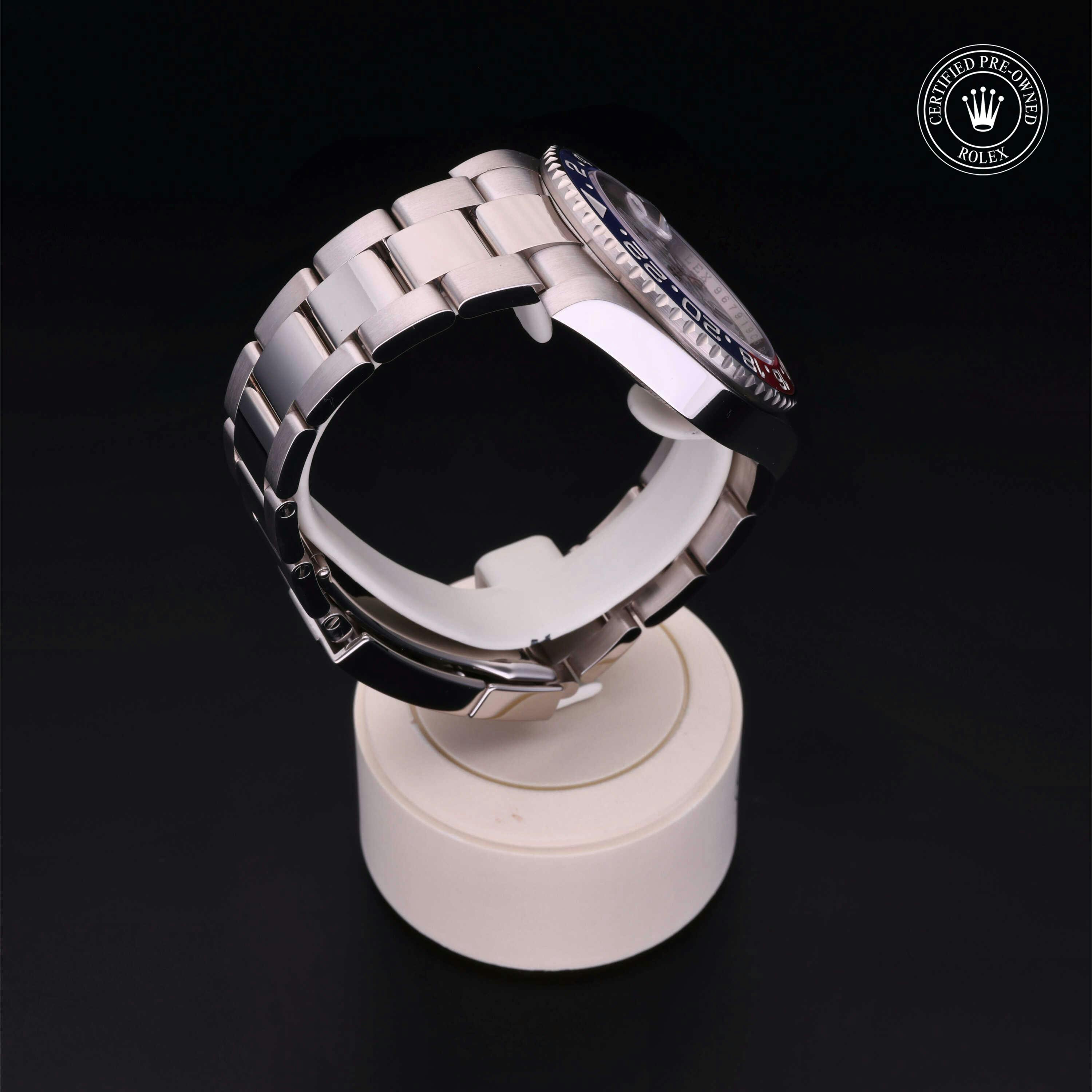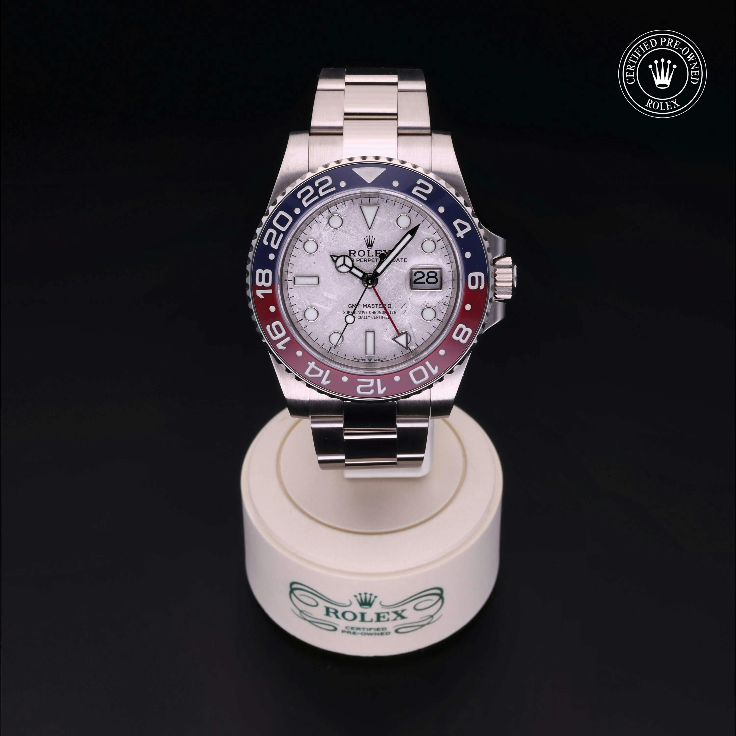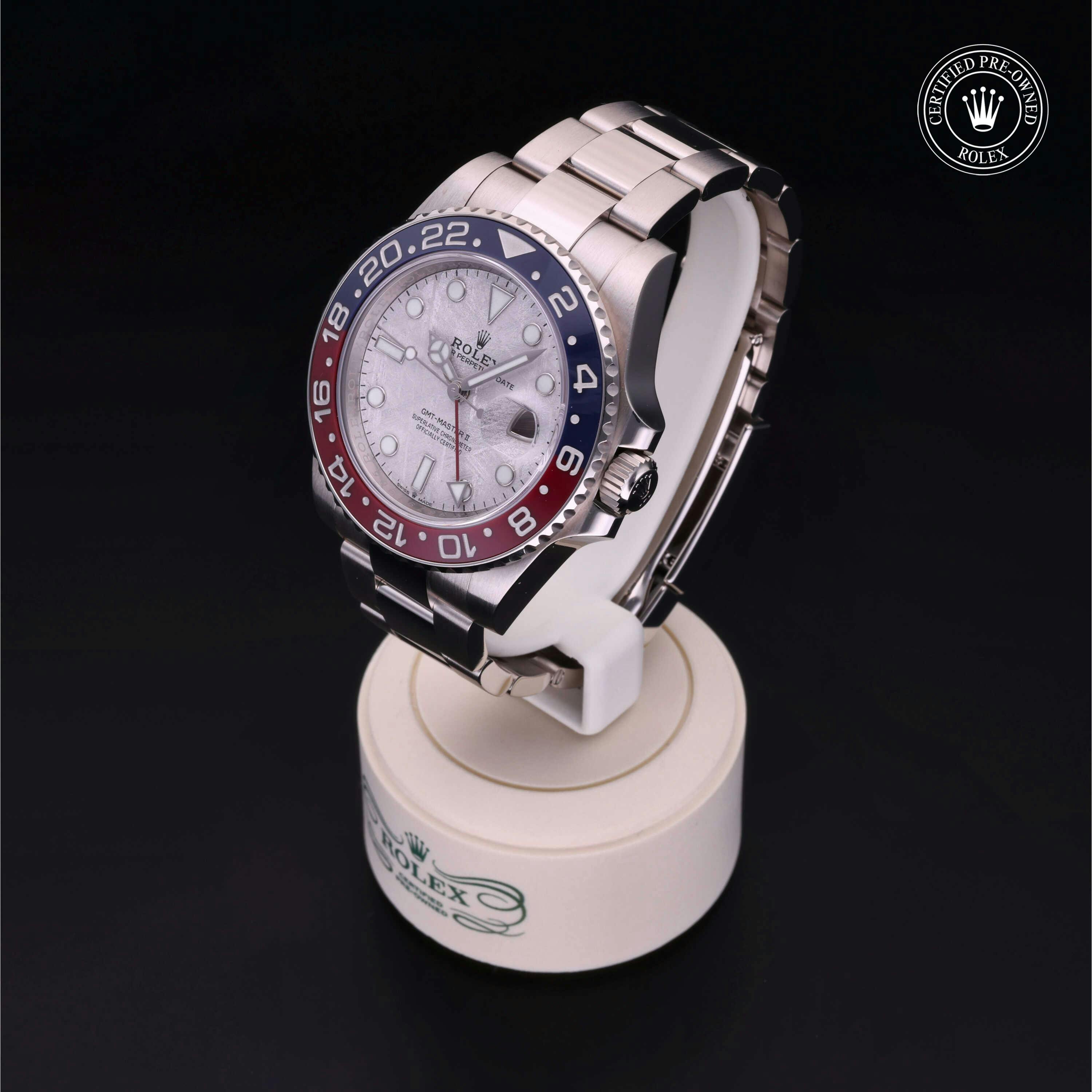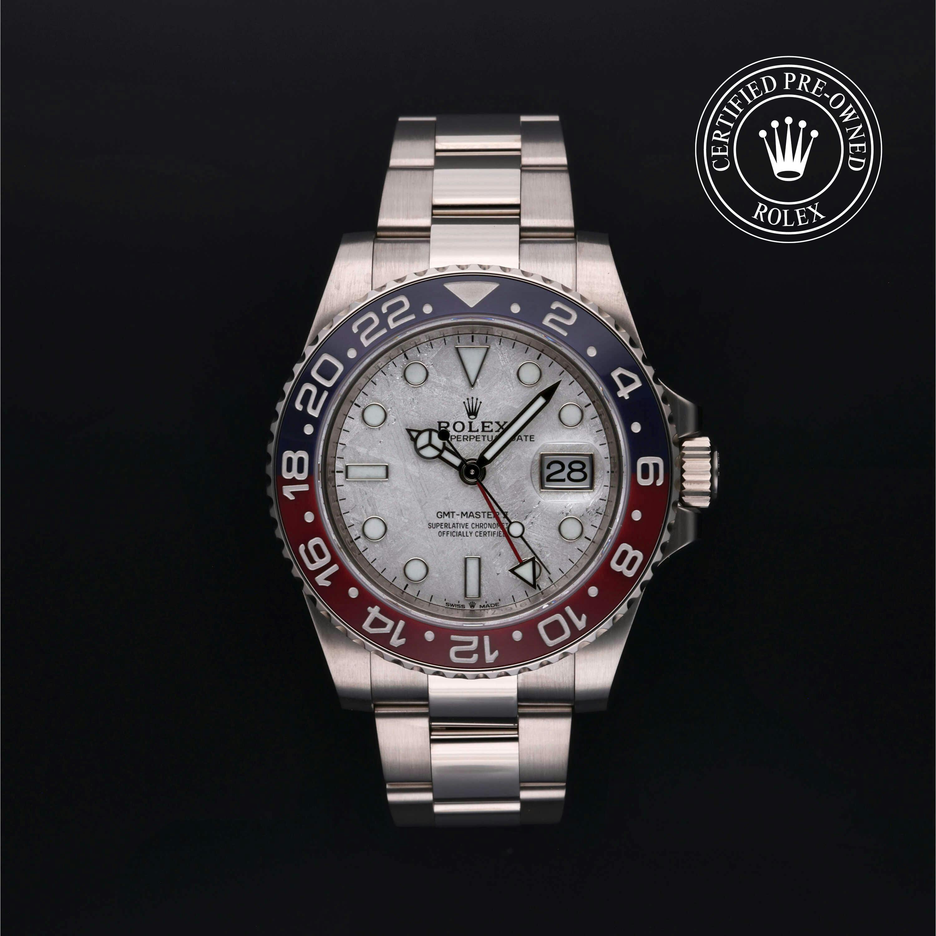 Rolex Certified Pre-Owned GMT-Master II (126719BLRO) self - winding automatic watch, features a 40mm 18k white gold case and bidirectional rotating bezel with a blue and red cerachrom bezel insert surrounding a meteorite dial on an 18k white gold oyster bracelet. Functions include hours, minutes, seconds, date and gmt/world time. This watch has received Rolex-authorized service and certification. It comes with the original box and papers, and includes a custom Rolex Certified Pre-Owned hang tag, travel pouch and RCPO international warranty card.