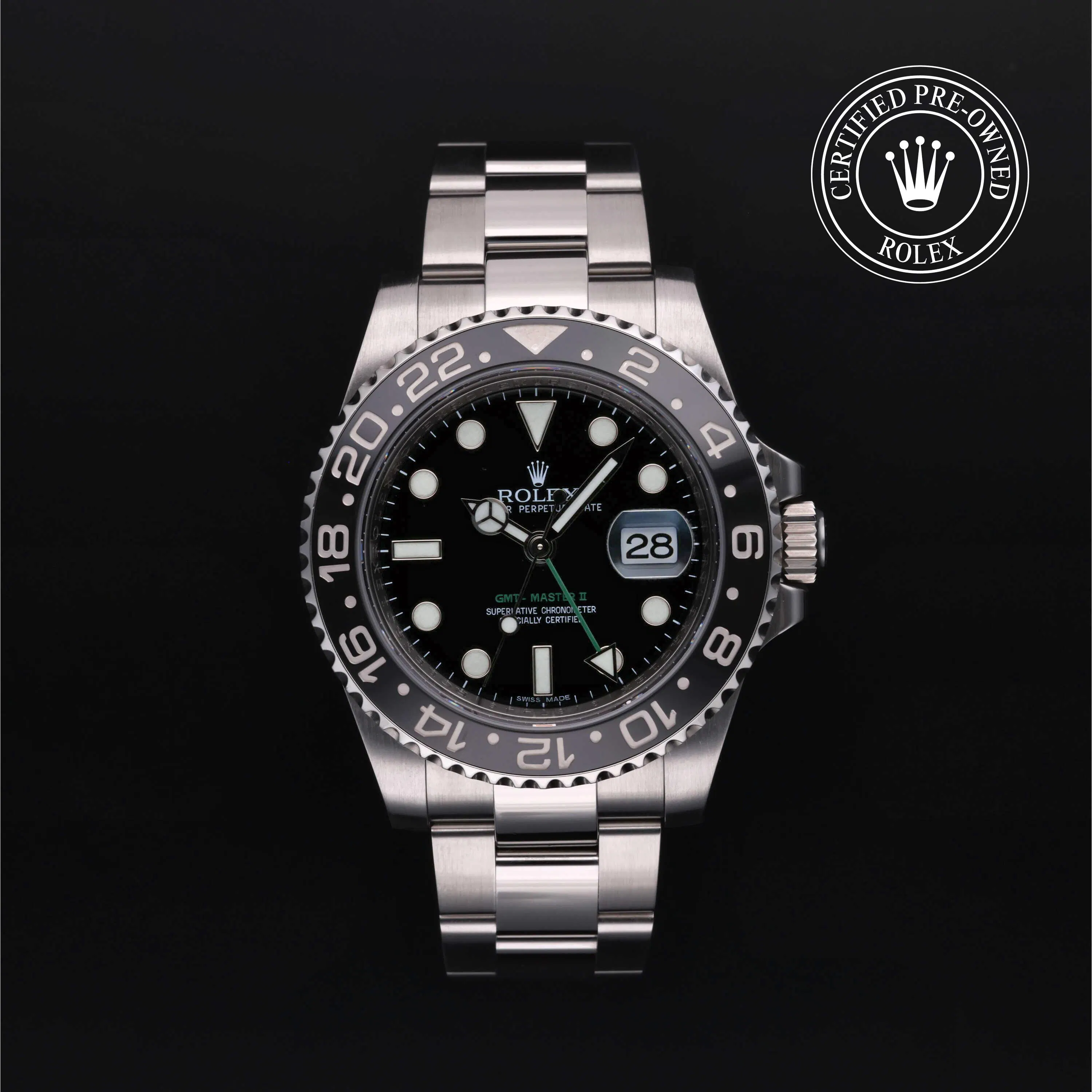Rolex Certified Pre-Owned GMT-Master II (116710LN) self - winding automatic watch, features a 40mm stainless steel case and bidirectional rotating bezel with a black cerachrom insert surrounding a black dial on a stainless steel oyster bracelet. Functions include hours, minutes, seconds, date and gmt/world time. This watch has received Rolex-authorized service and certification. It comes with the original box, and includes a custom Rolex Certified Pre-Owned hang tag, travel pouch and RCPO international warranty card.