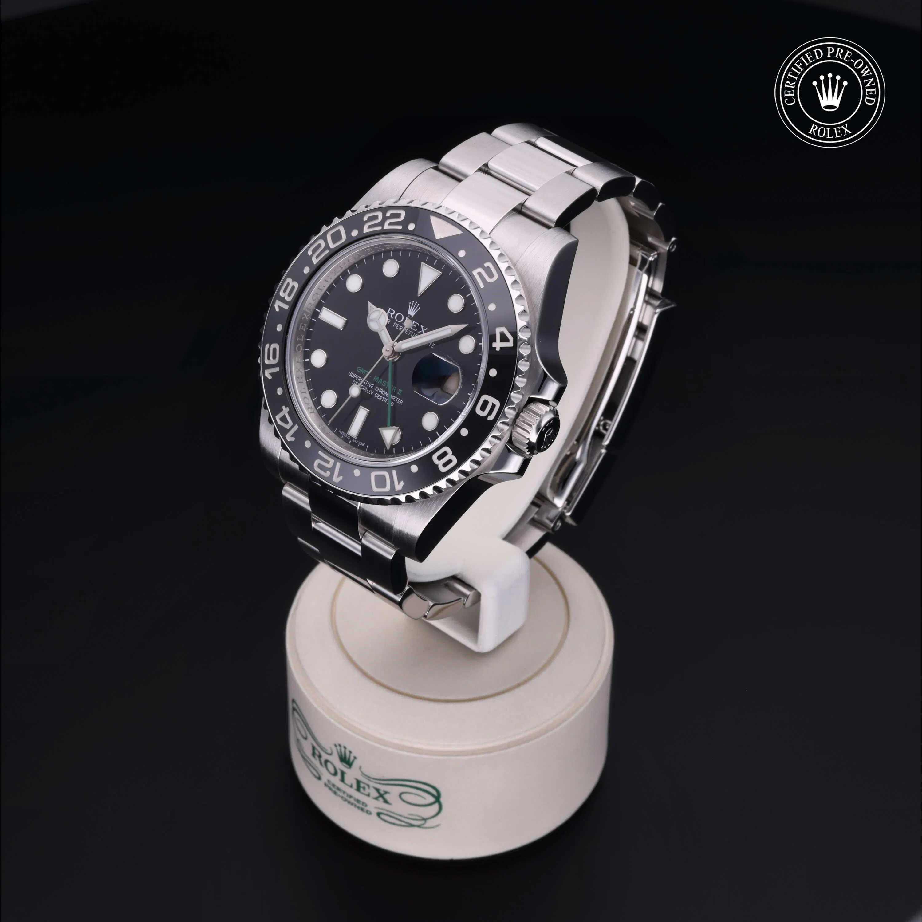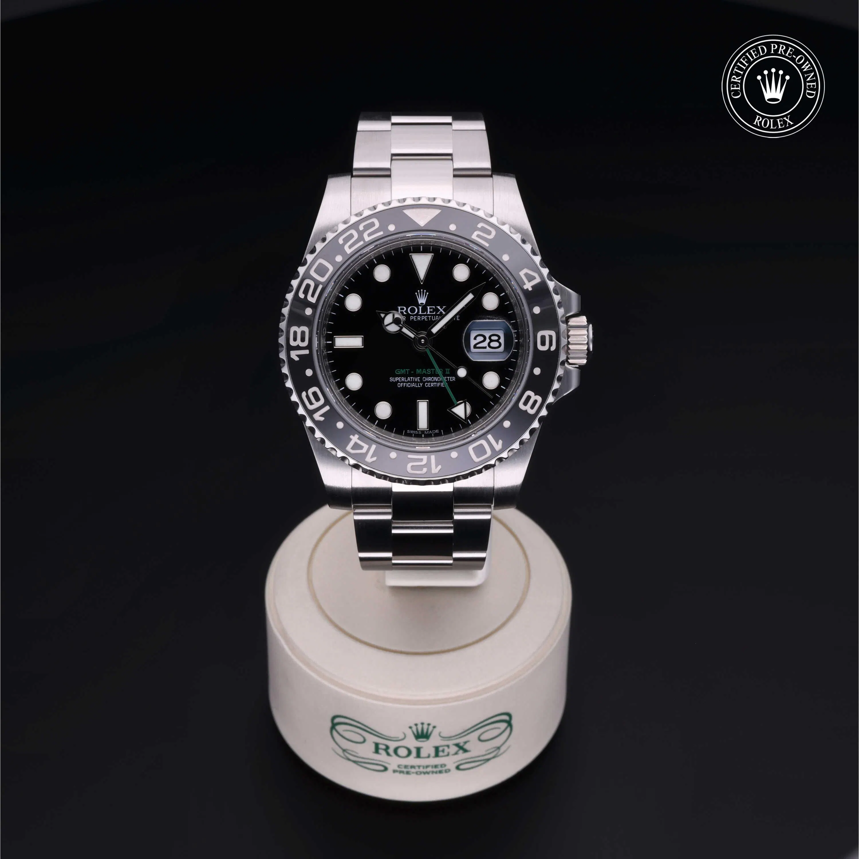 Rolex Certified Pre-Owned GMT-Master II (116710LN) self - winding automatic watch, features a 40mm stainless steel case and bidirectional rotating bezel with a black cerachrom insert surrounding a black dial on a stainless steel oyster bracelet. Functions include hours, minutes, seconds, date and gmt/world time. This watch has received Rolex-authorized service and certification. It comes with the original box, and includes a custom Rolex Certified Pre-Owned hang tag, travel pouch and RCPO international warranty card.
