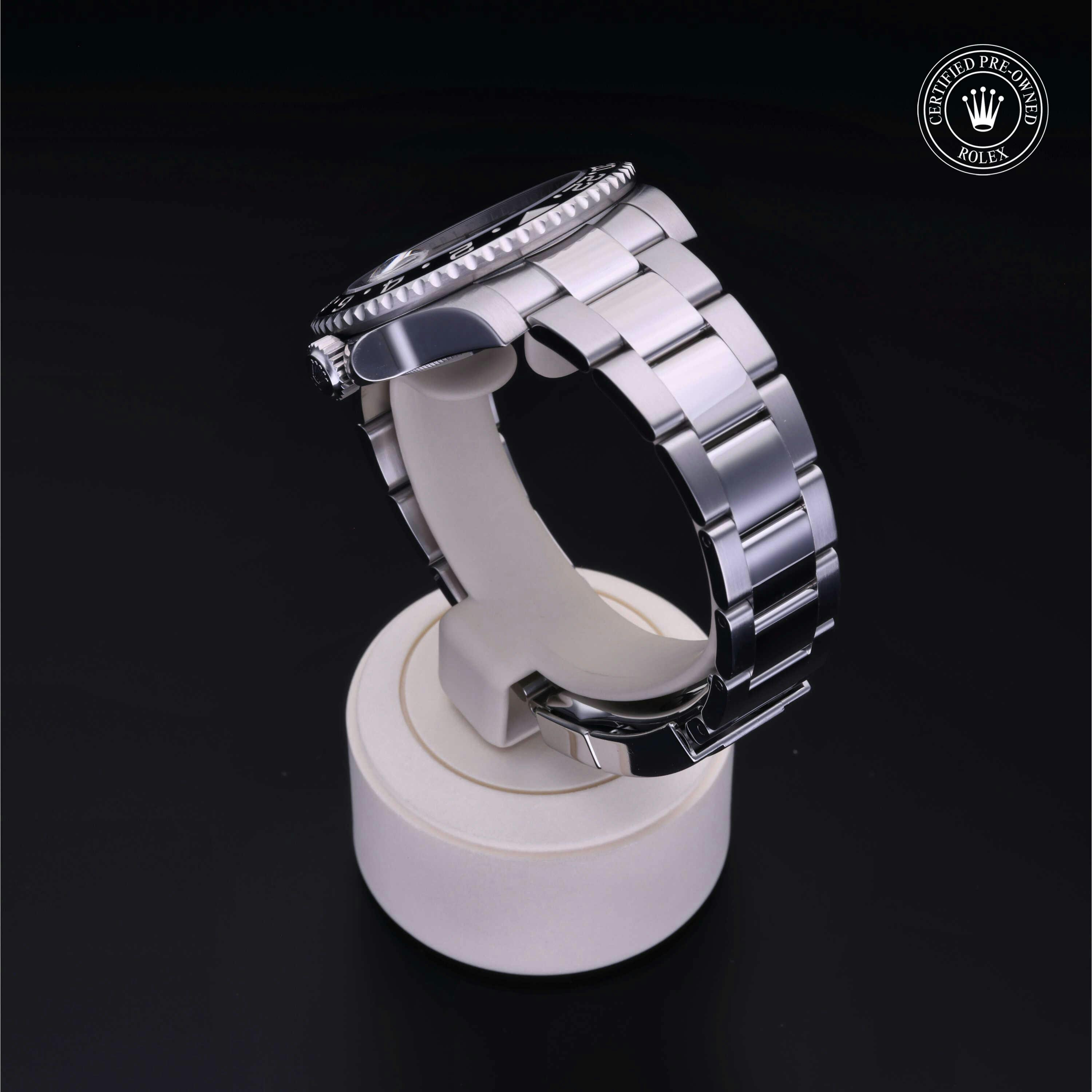 Rolex Certified Pre-Owned GMT-Master II (116710LN) self - winding automatic watch, features a 40mm stainless steel case and bidirectional rotating bezel surrounding a black dial on a stainless steel oyster bracelet. Functions include hours, minutes, seconds, date and gmt/world time. This watch has received, Rolex-authorized service and certification. It comes with the original box and papers, and includes a custom Rolex Certified Pre-Owned hang tag, travel pouch and RCPO international warranty card.