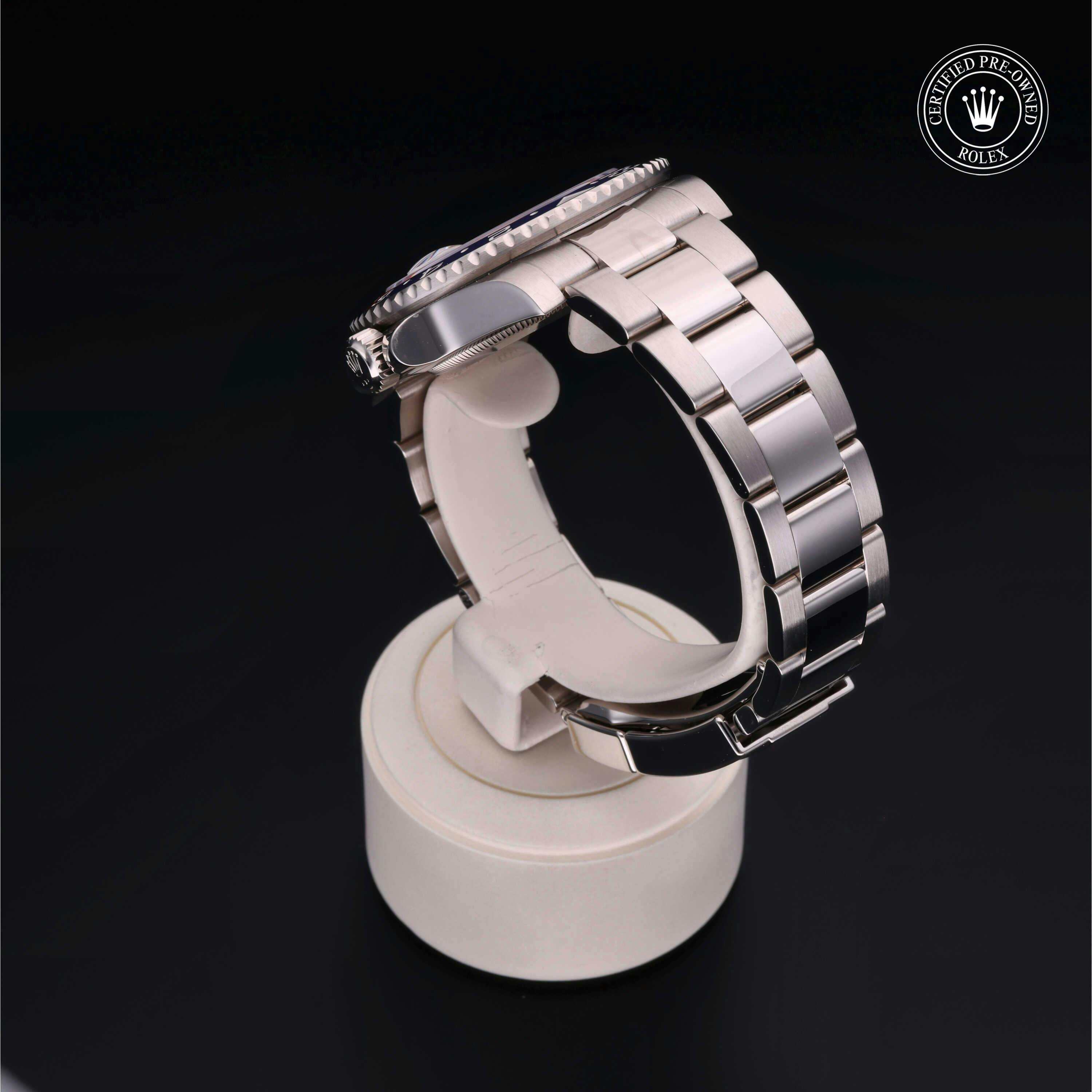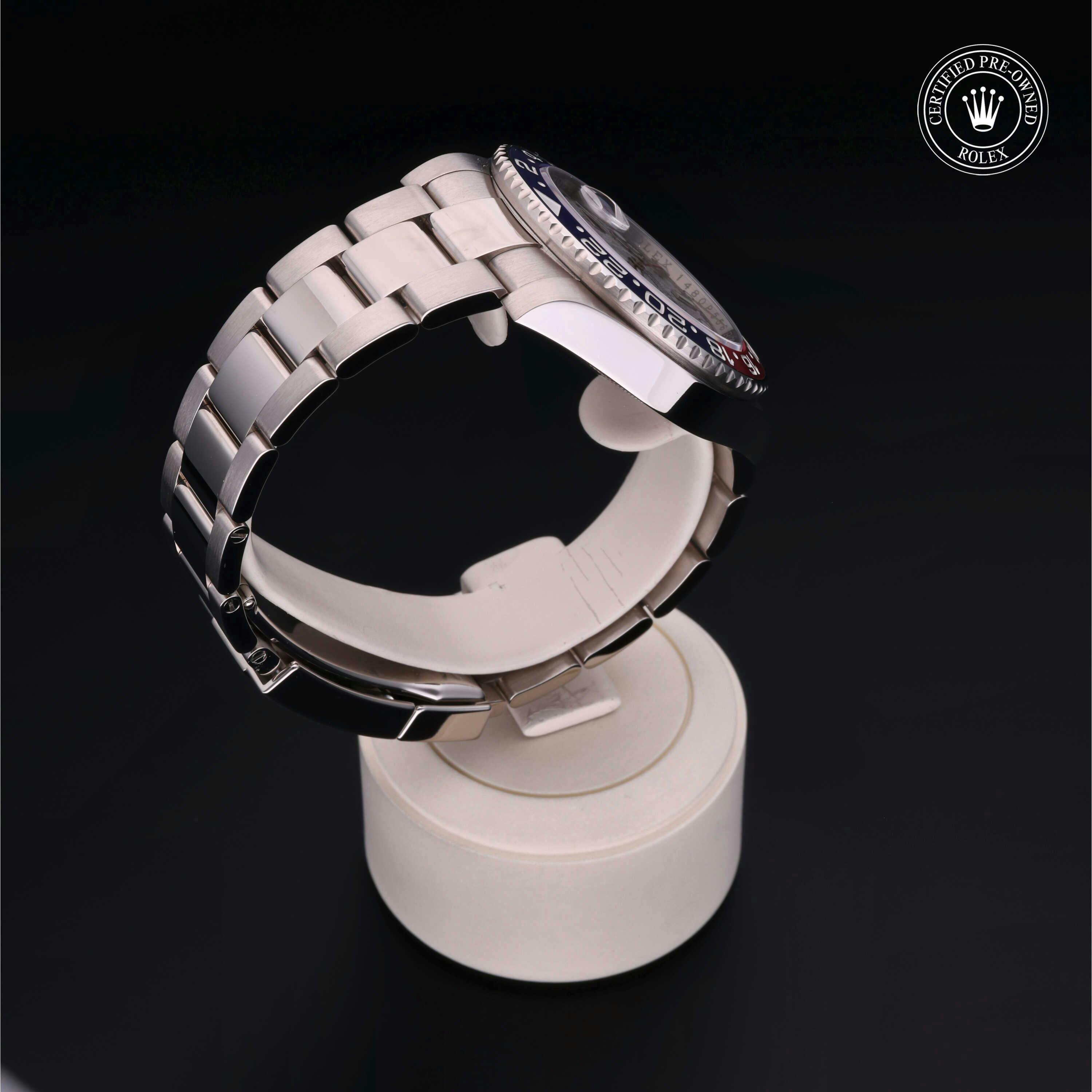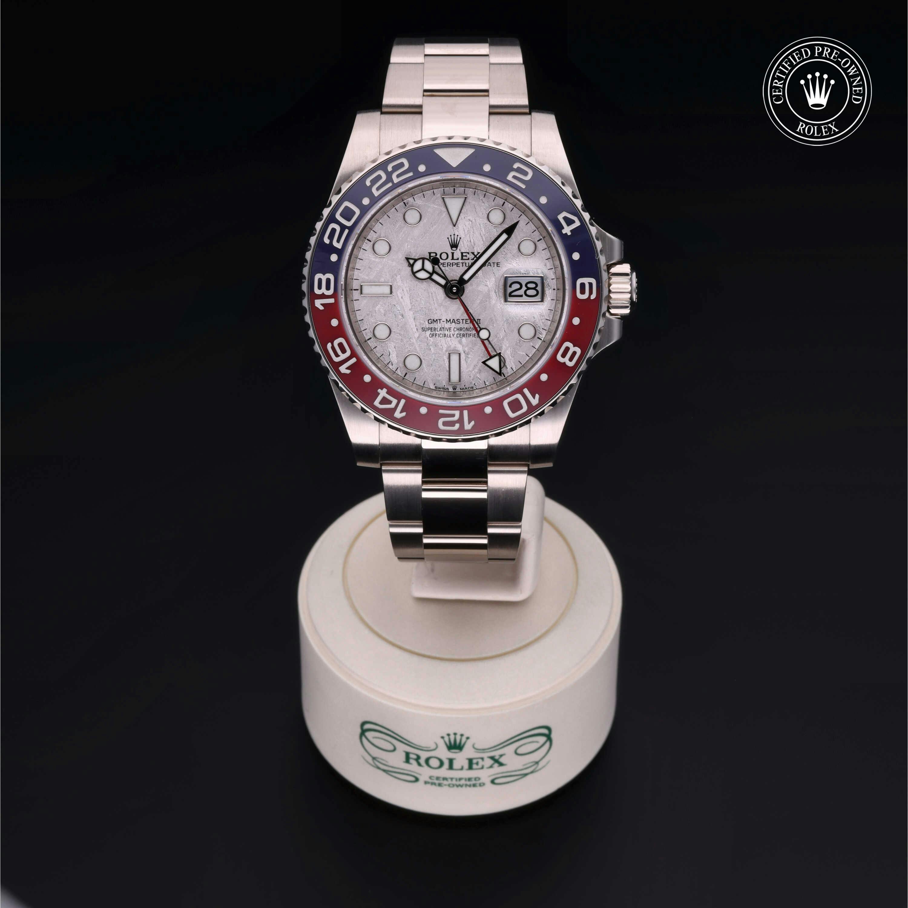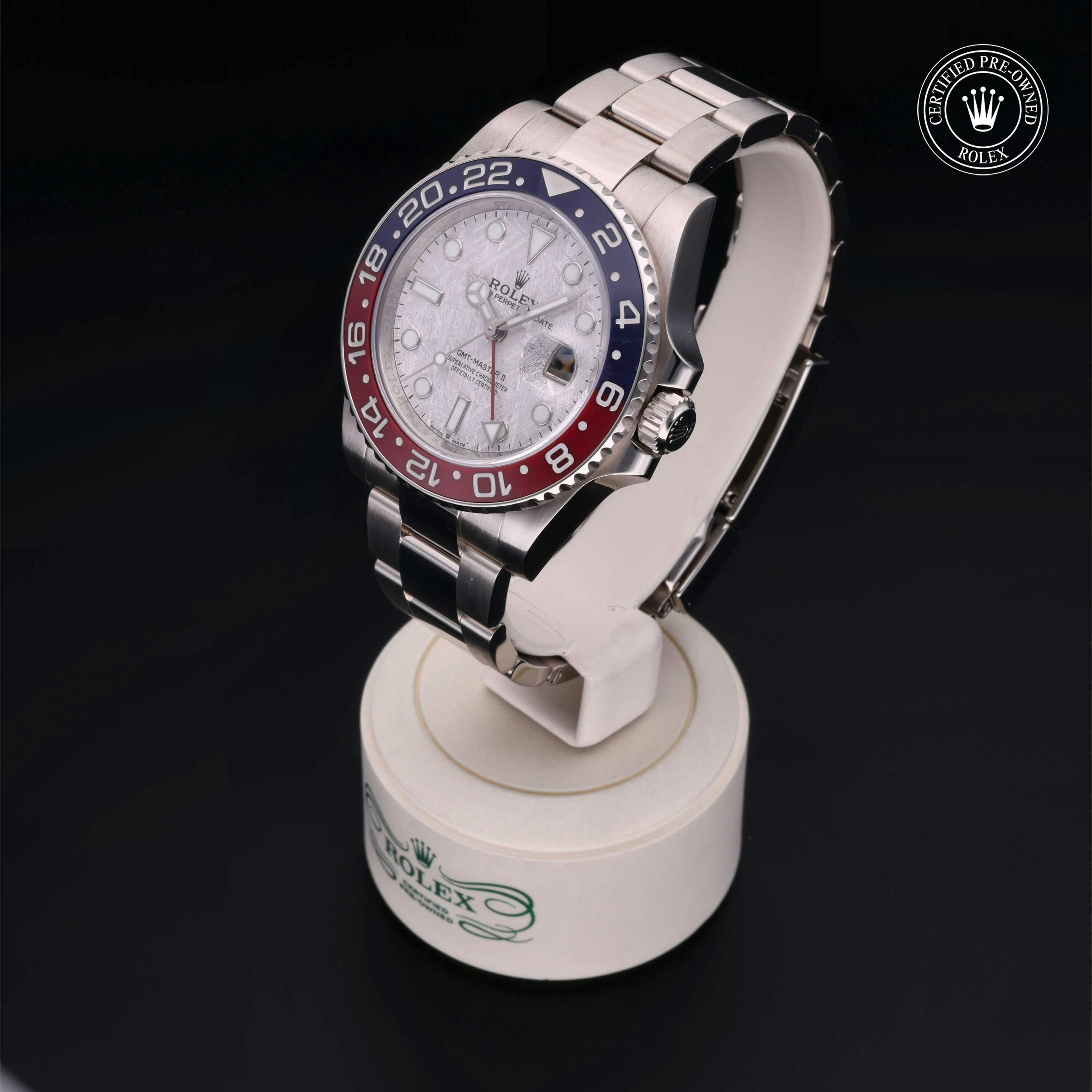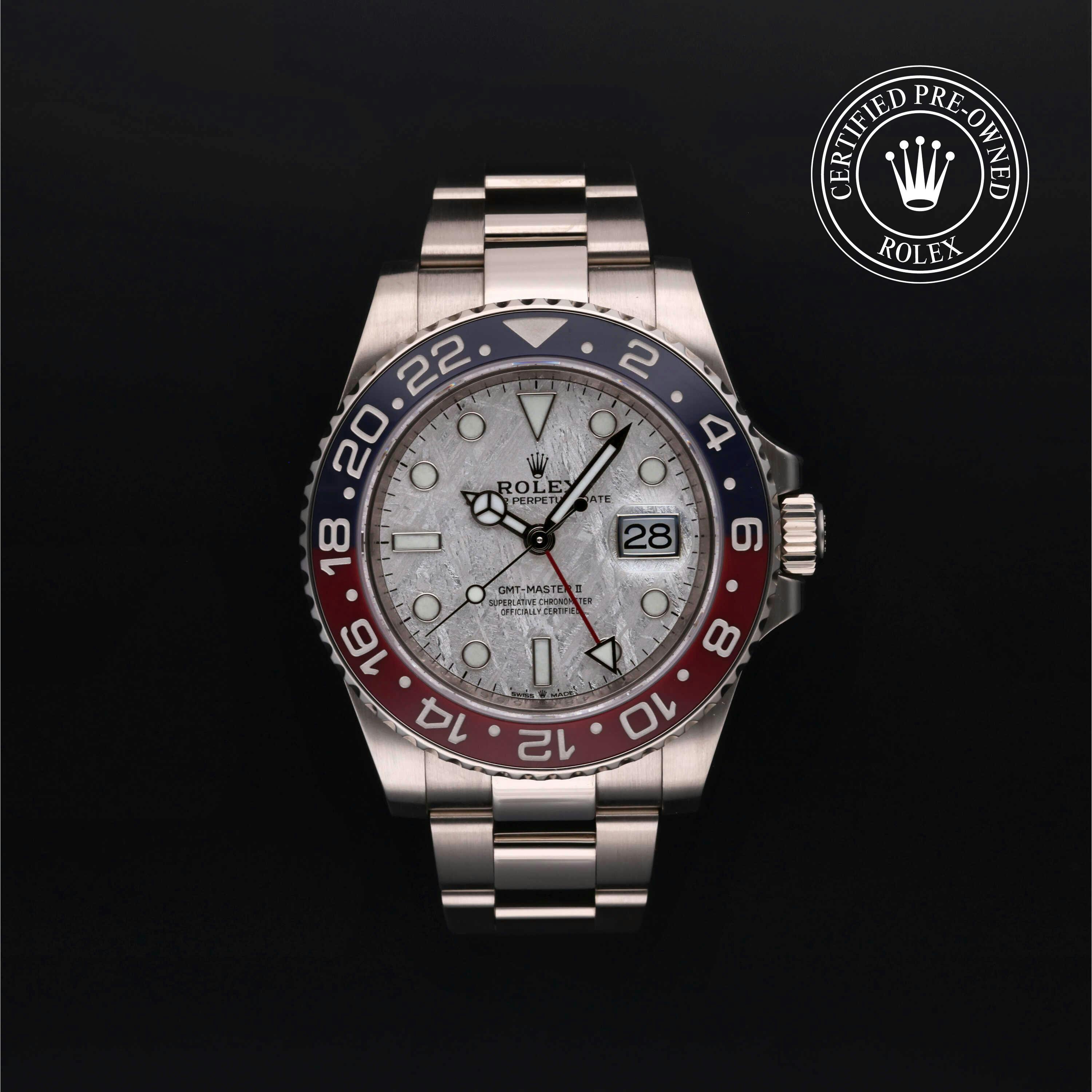 Rolex Certified Pre-Owned GMT-Master II (126719BLRO) self - winding automatic watch, features a 40mm 18k white gold case and bidirectional rotating bezel with a blue and red cerachrom bezel surrounding a meteorite dial on an 18k white gold oyster bracelet. Functions include hours, minutes, seconds, date and gmt/world time. This watch has received Rolex-authorized service and certification. It comes with the original box and papers, and includes a custom Rolex Certified Pre-Owned hang tag, travel pouch and RCPO international warranty card.