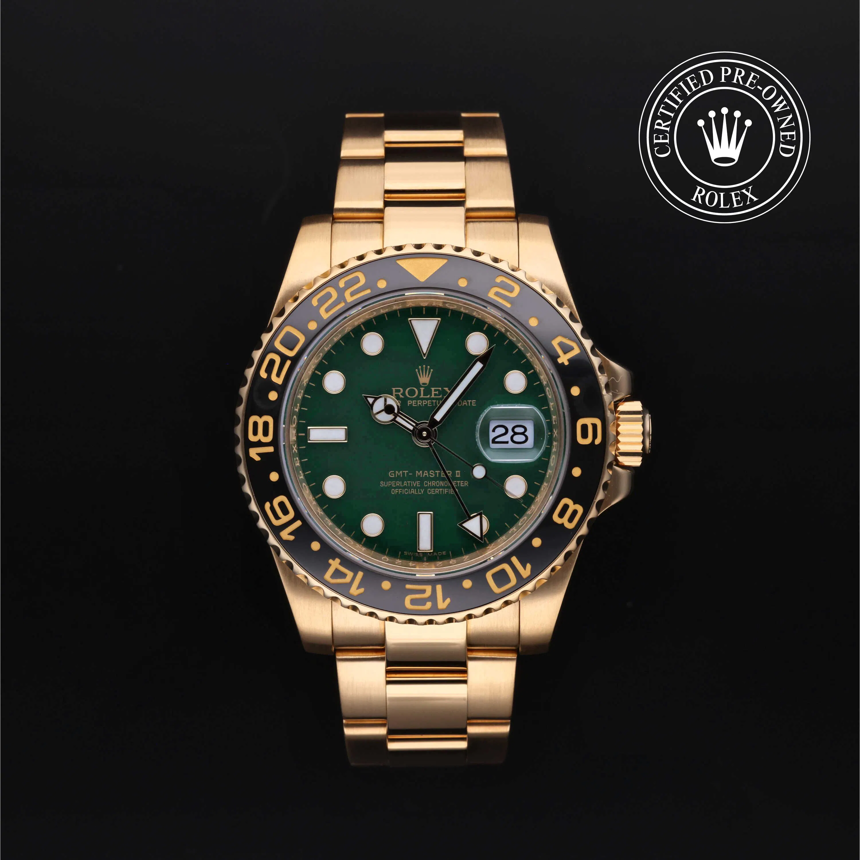 Rolex Certified Pre-Owned GMT-Master II (116718LN) self - winding automatic watch, features a 40mm 18k yellow gold case and bidirectional rotating bezel fitted with a black cerachrom 24-hour insert surrounding a green dial. The watch is secured on an 18k yellow gold Oyster bracelet complete with a folding buckle. Functions include hours, minutes, seconds, date and gmt/world time. This watch has received Rolex-authorized service and certification. It comes with the original box and papers, and includes a custom Rolex Certified Pre-Owned hang tag, travel pouch and RCPO international warranty card.