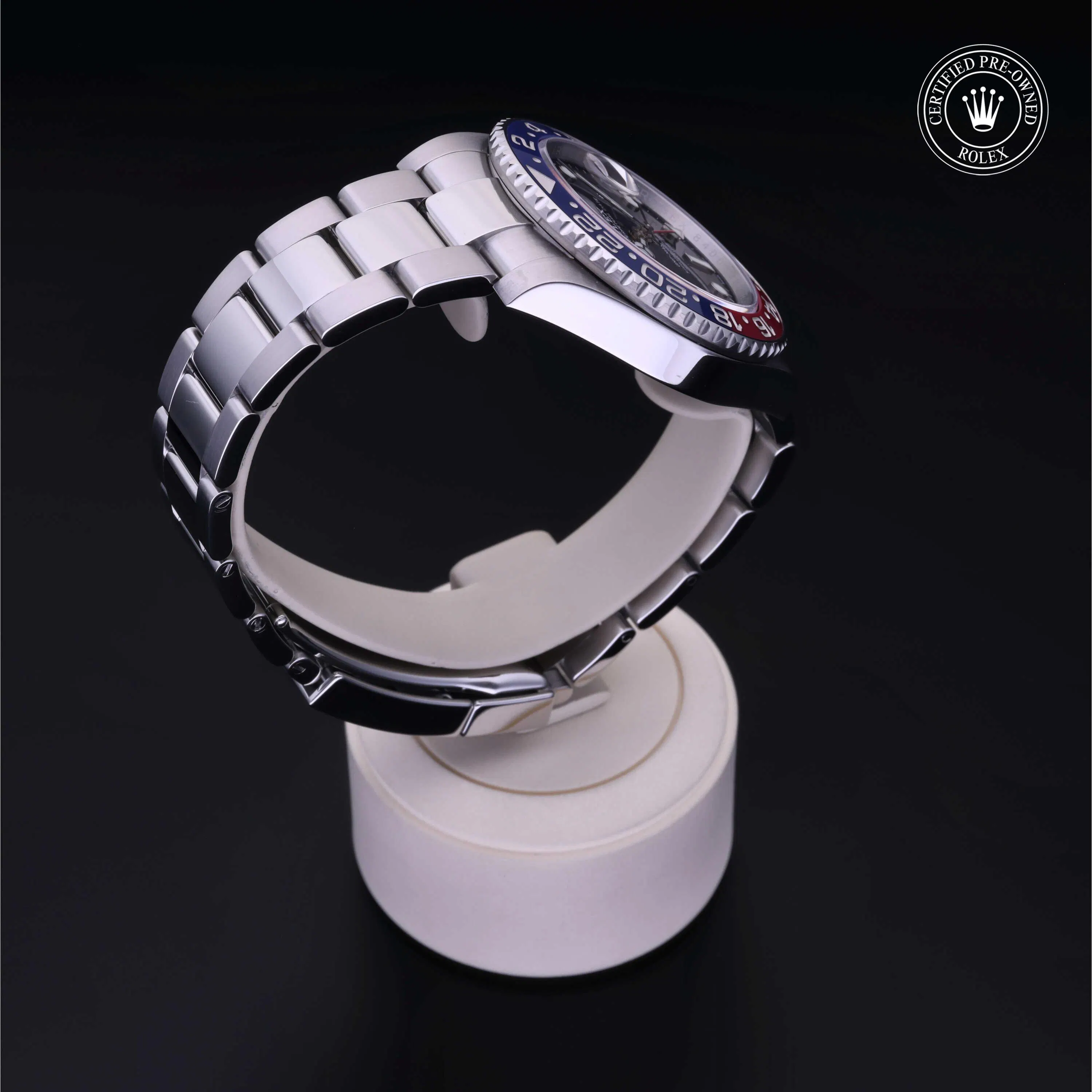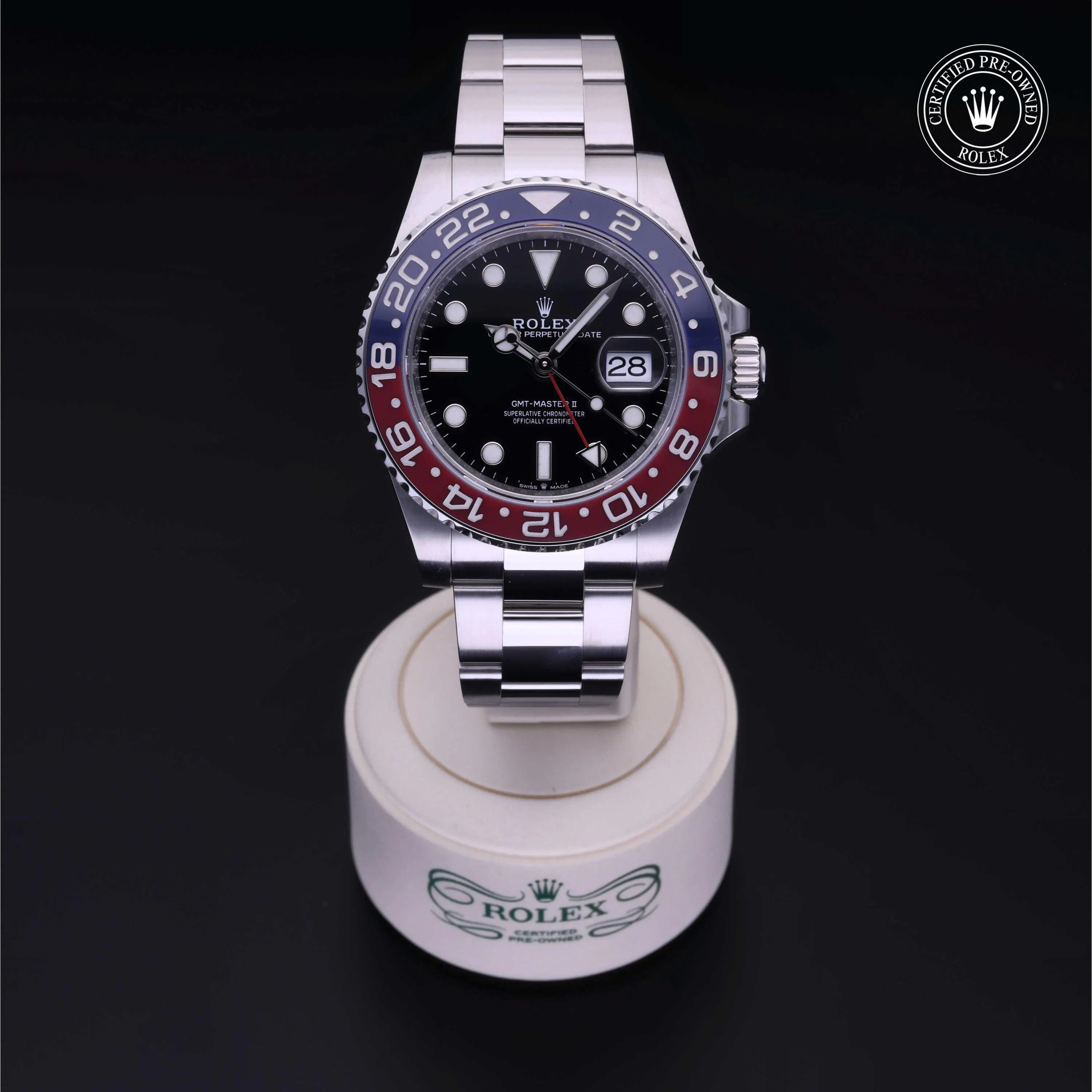 Rolex Certified Pre-Owned GMT-Master II (126710BLRO) self - winding automatic watch, features a 40mm stainless steel case and unidirectional rotating bezel with a blue and red cerachrom insert surrounding a black dial on a stainless steel oyster bracelet. Functions include hours, minutes, seconds, date and gmt/world time. This watch has received Rolex-authorized service and certification. It comes with the original box and papers, and includes a custom Rolex Certified Pre-Owned hang tag, travel pouch and RCPO international warranty card.