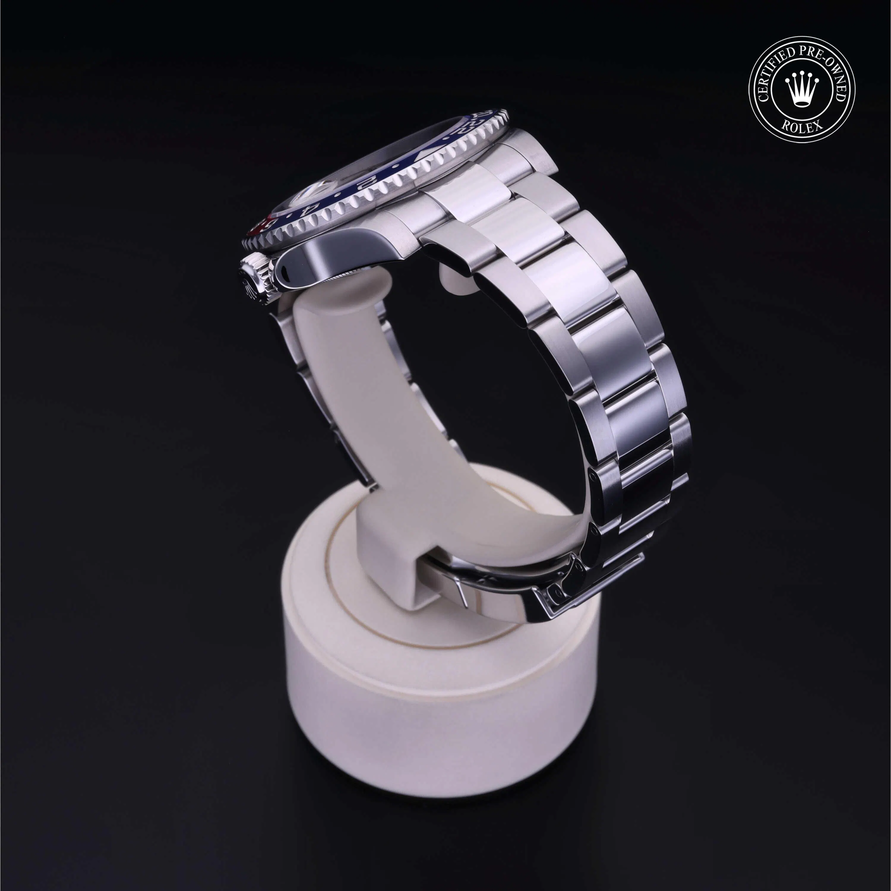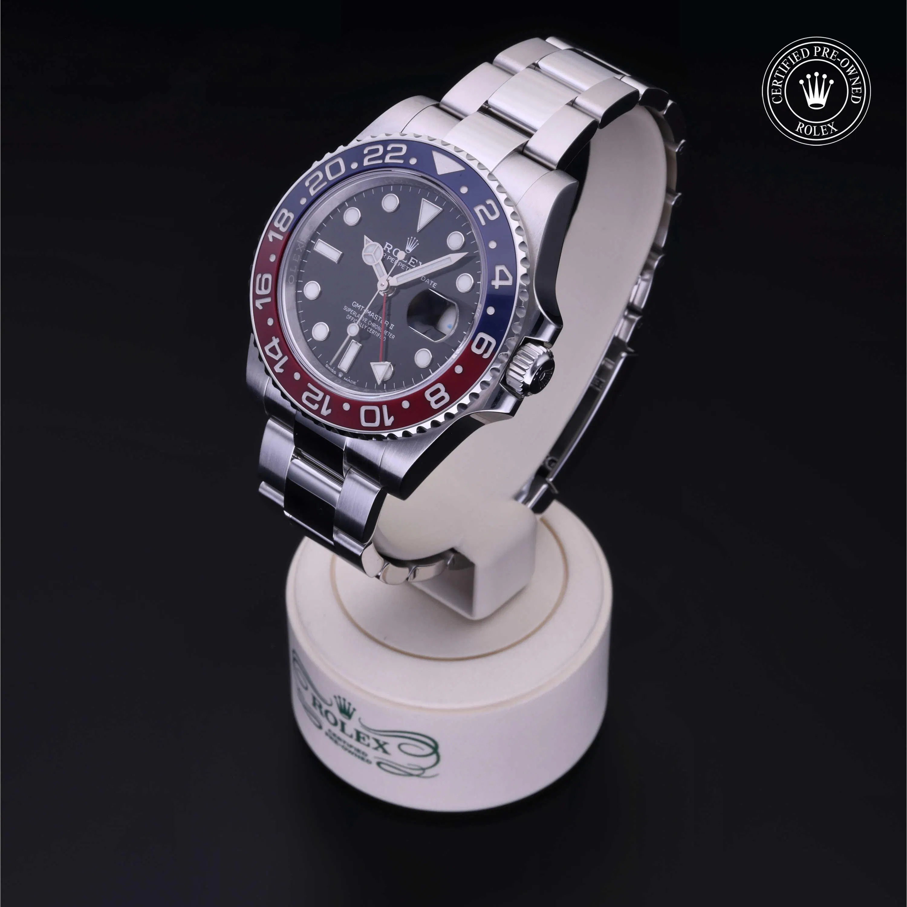 Rolex Certified Pre-Owned GMT-Master II (126710BLRO) self - winding automatic watch, features a 40mm stainless steel case and unidirectional rotating bezel with a blue and red cerachrom insert surrounding a black dial on a stainless steel oyster bracelet. Functions include hours, minutes, seconds, date and gmt/world time. This watch has received Rolex-authorized service and certification. It comes with the original box and papers, and includes a custom Rolex Certified Pre-Owned hang tag, travel pouch and RCPO international warranty card.