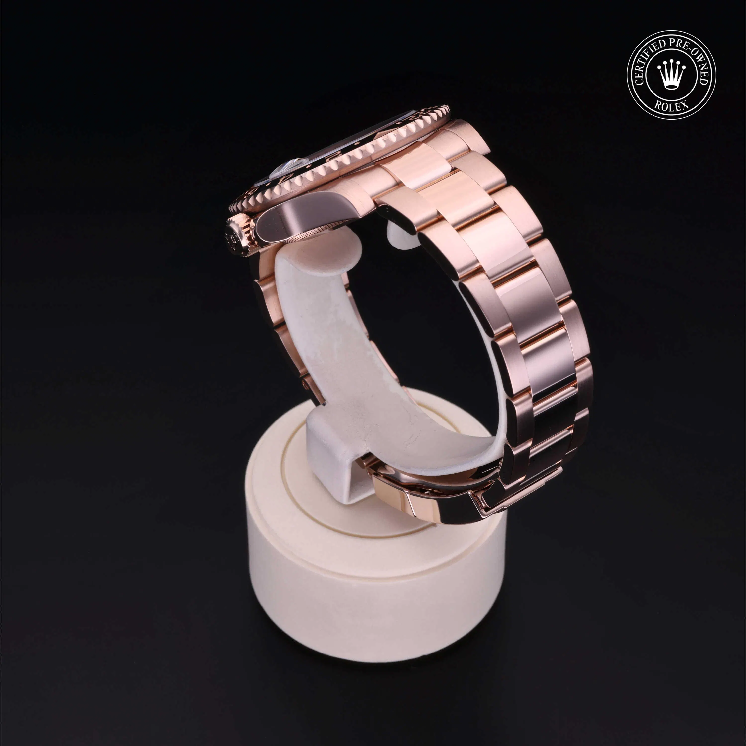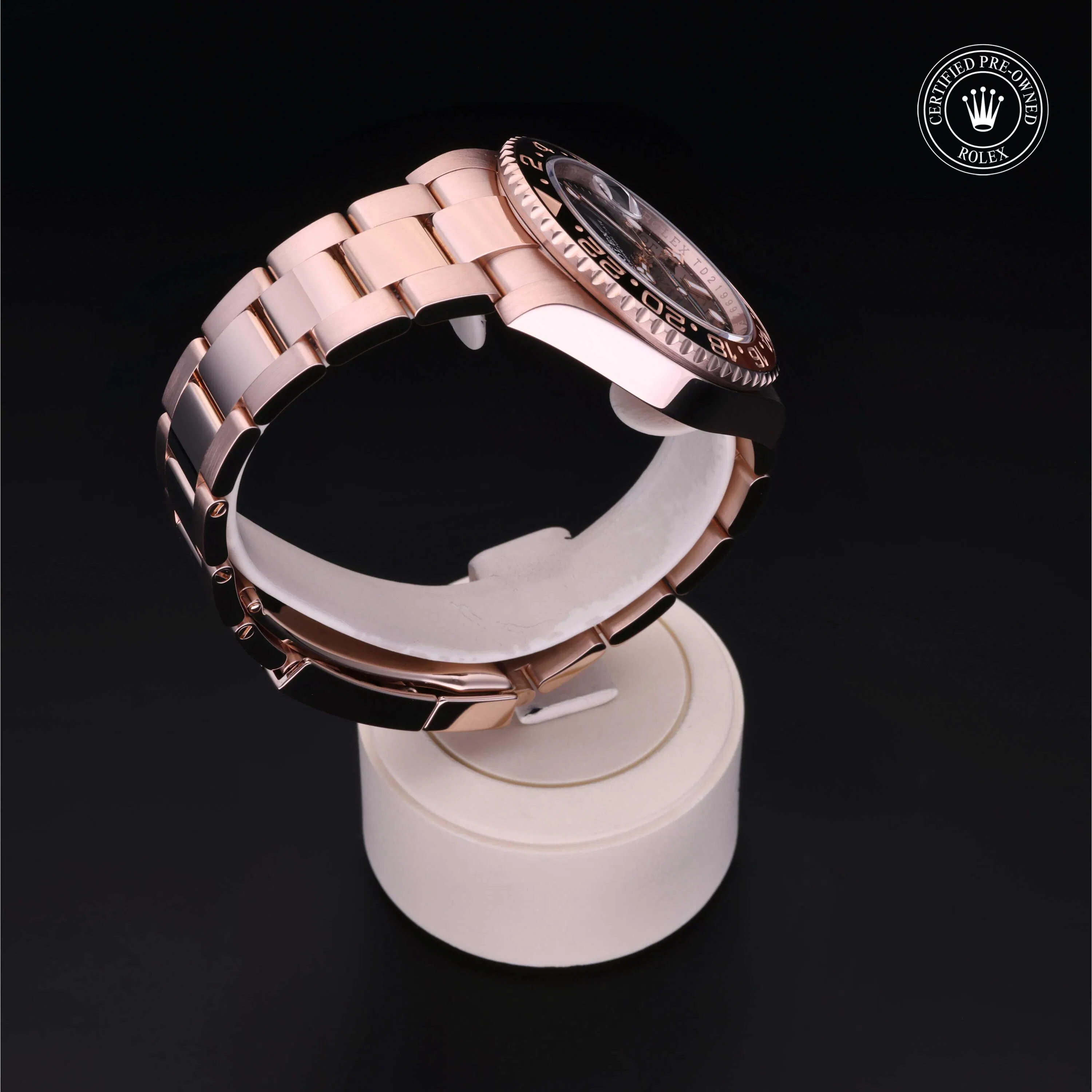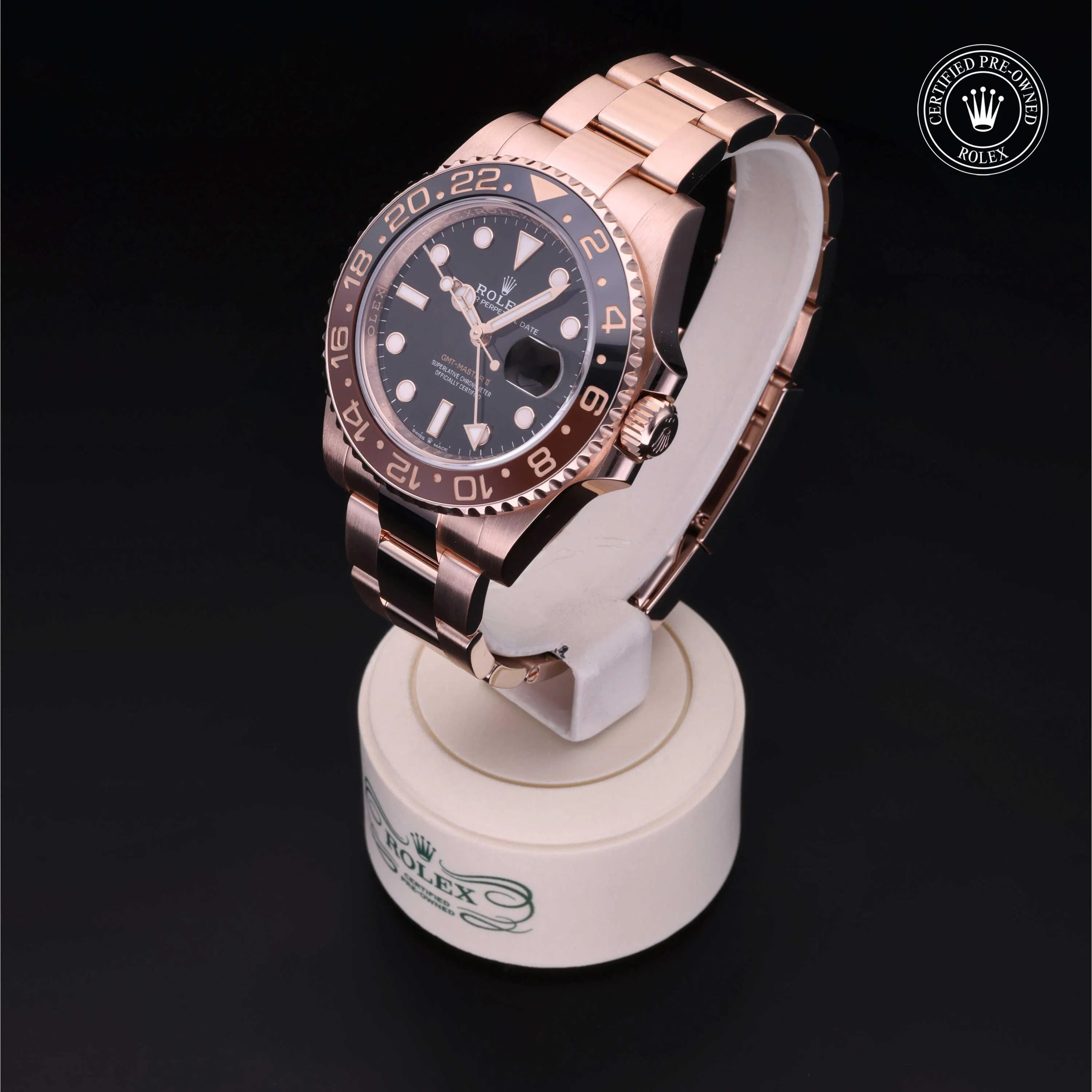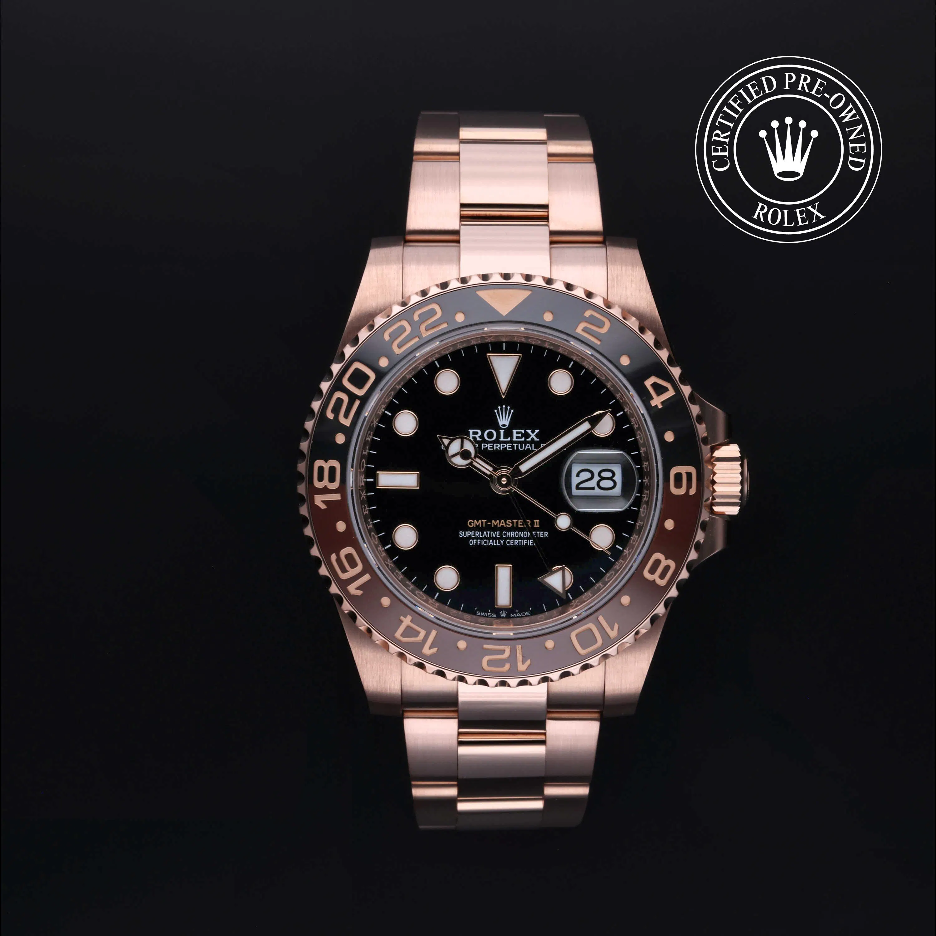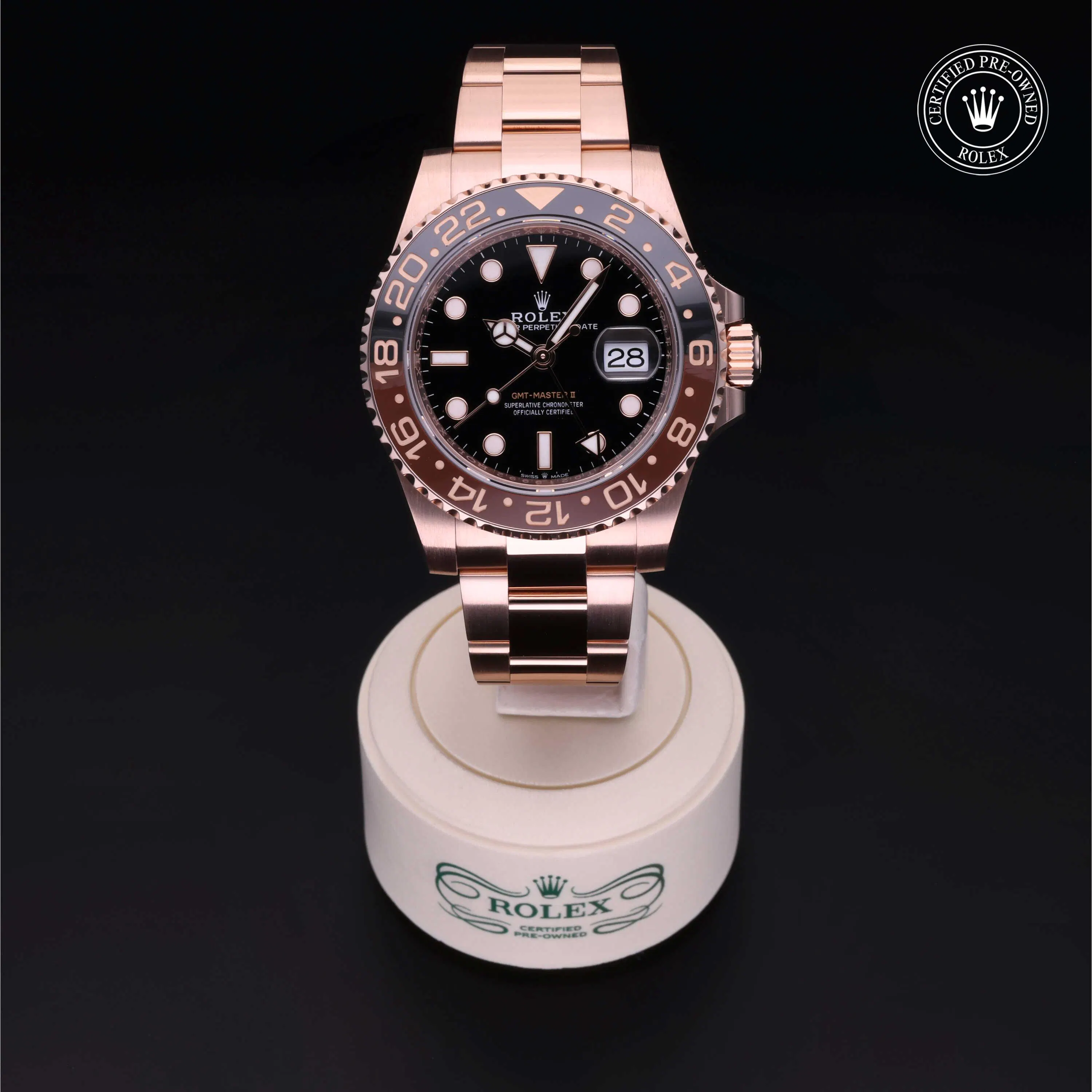 Rolex Certified Pre-Owned GMT-Master II (126715CHNR) self - winding automatic watch, features a 40mm 18k rose gold case and bidirectional rotating bezel with a black and brown cerachrom insert surrounding a black dial on an 18k rose gold oyster bracelet. Functions include hours, minutes, seconds, date and gmt/world time. This watch has received Rolex-authorized service and certification. It comes with the original box and papers, and includes a custom Rolex Certified Pre-Owned hang tag, travel pouch and RCPO international warranty card.